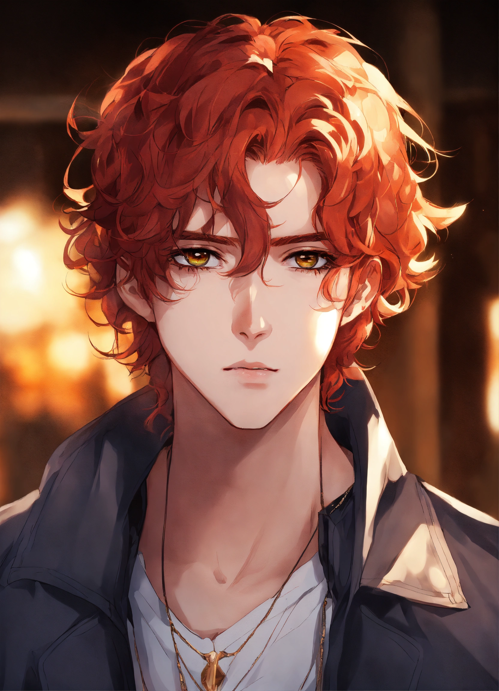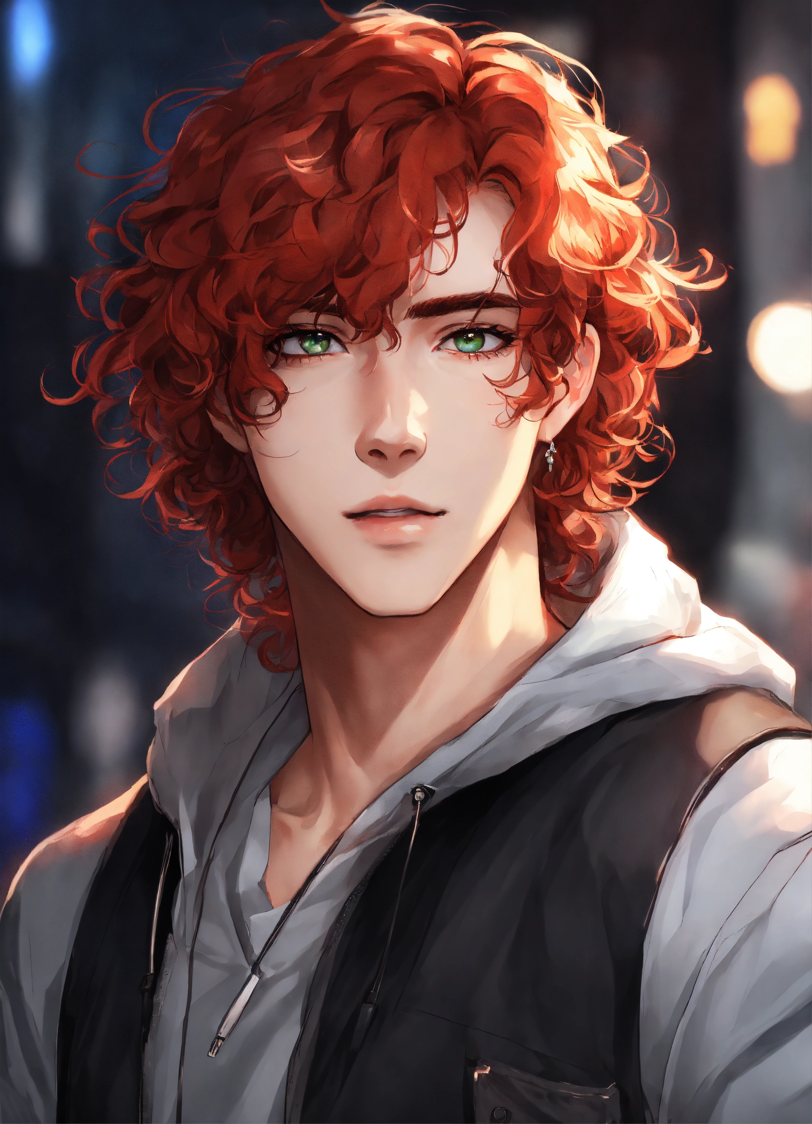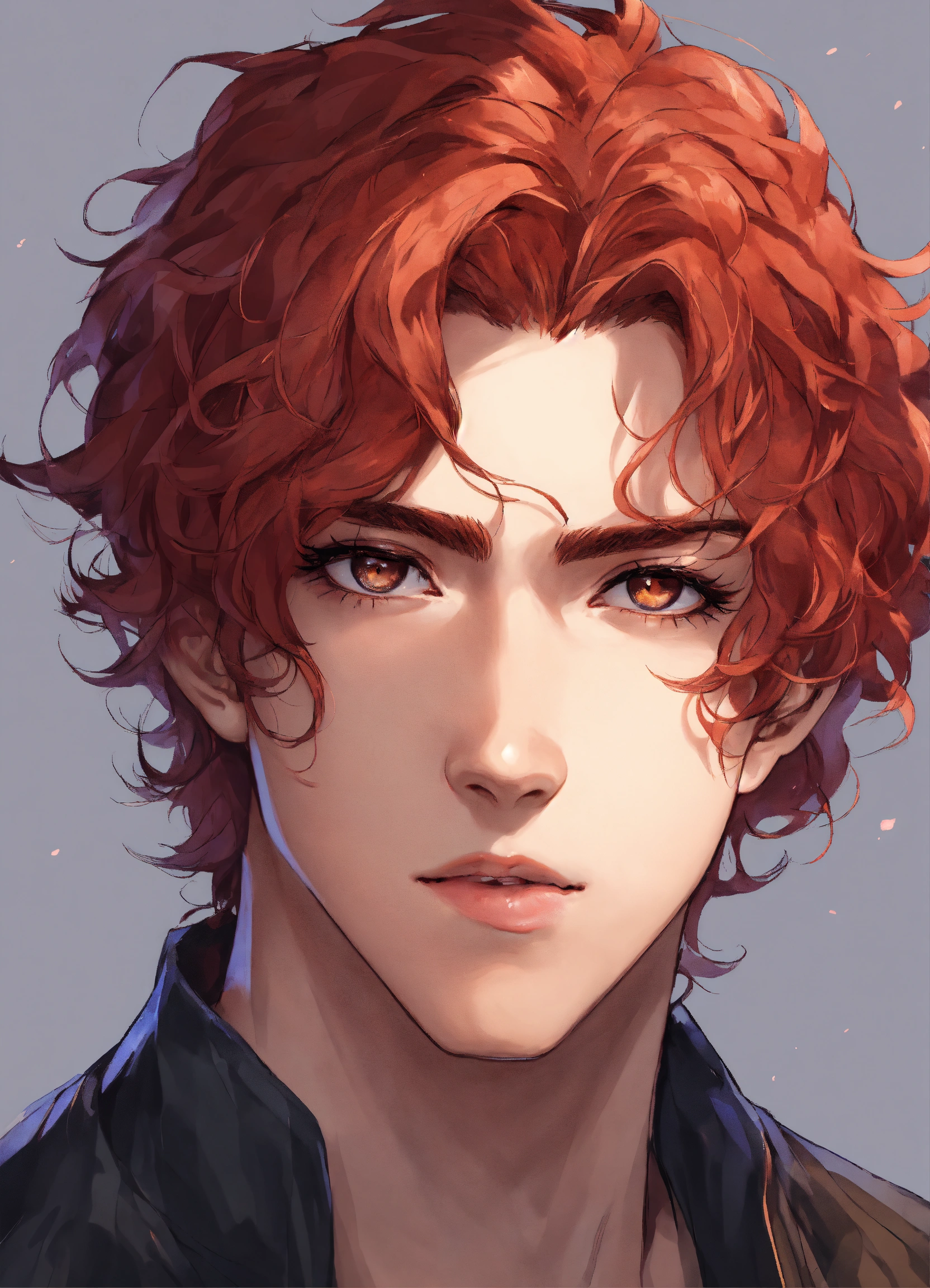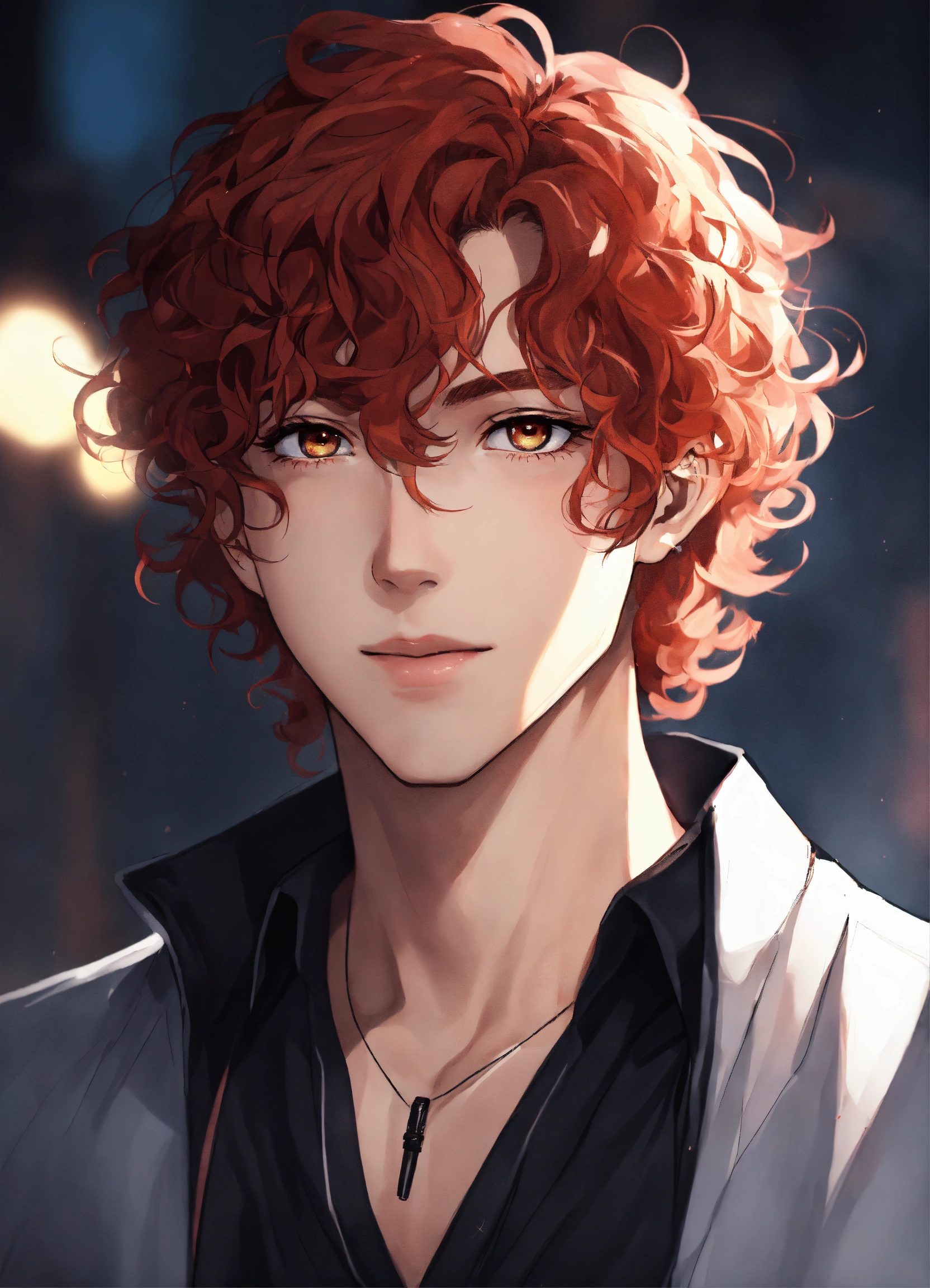 Guy 25 years old. red curly hair to shoulder length. black iris of the eyes. the face is beautiful, but not flashy. anime reskin style