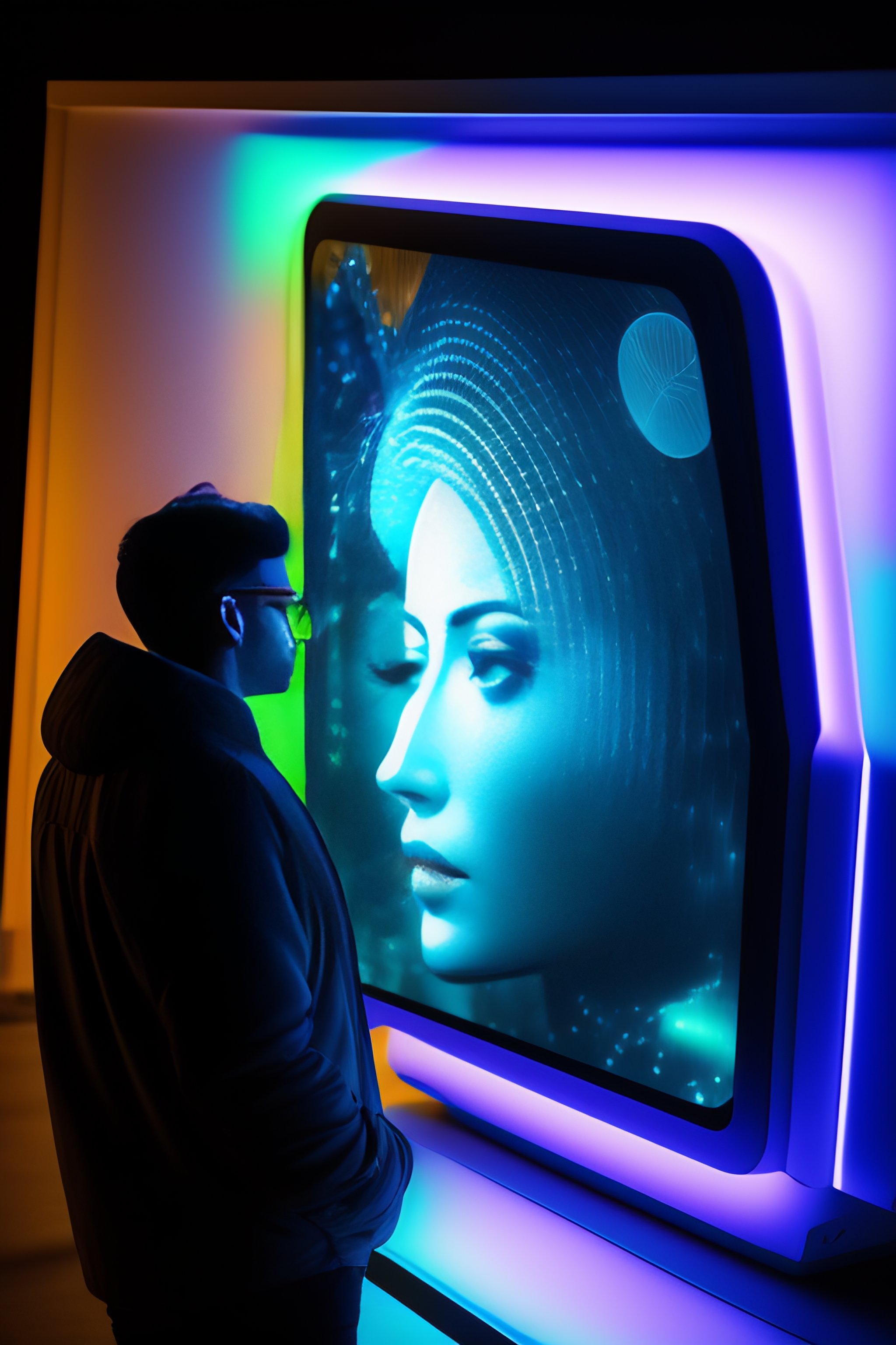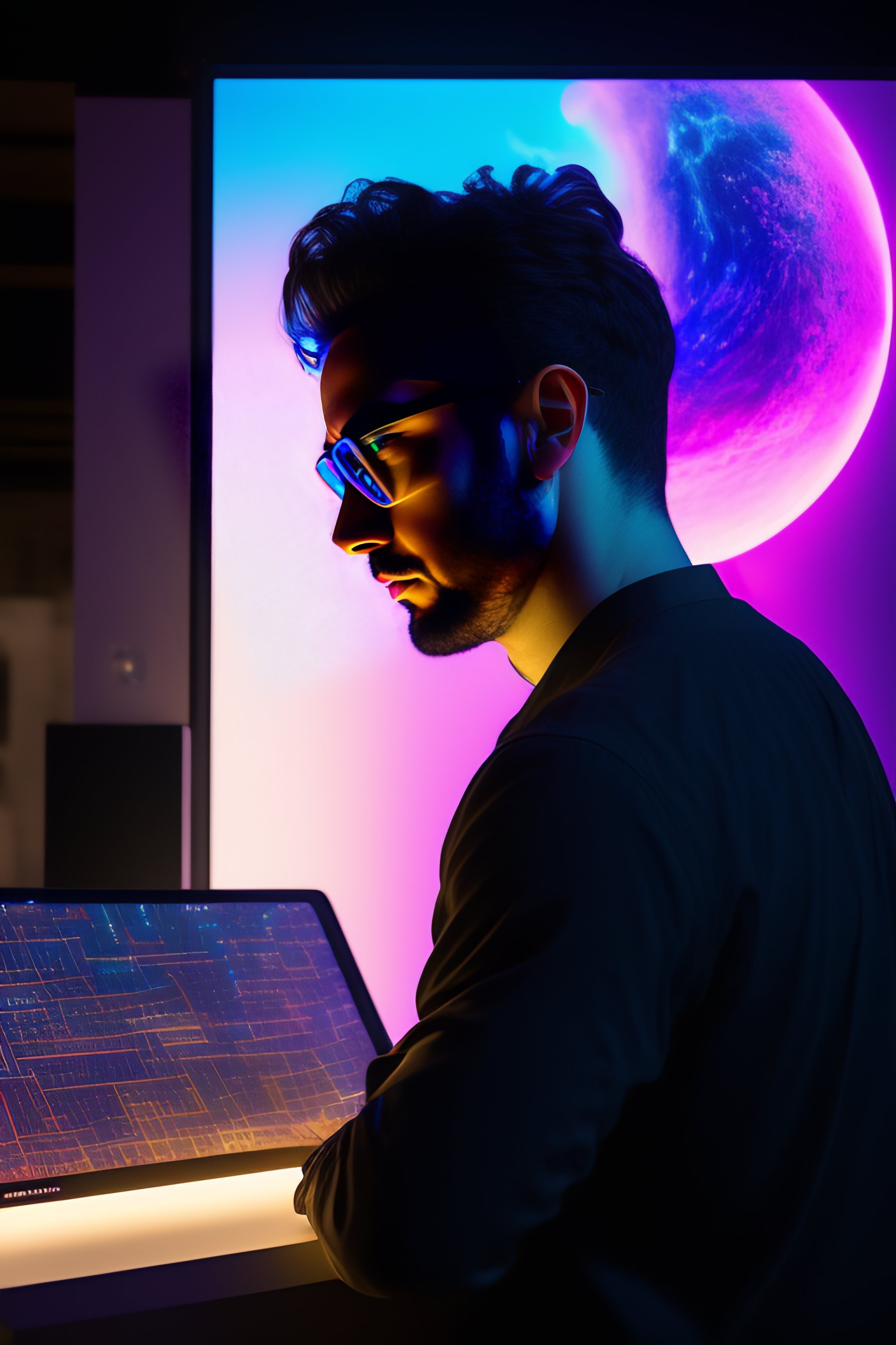 Piero lora, digital artist, vj mapper, working in a futuristic computer a projection mapping in a facade, portrait, big futuristic hologram, corporative presentation