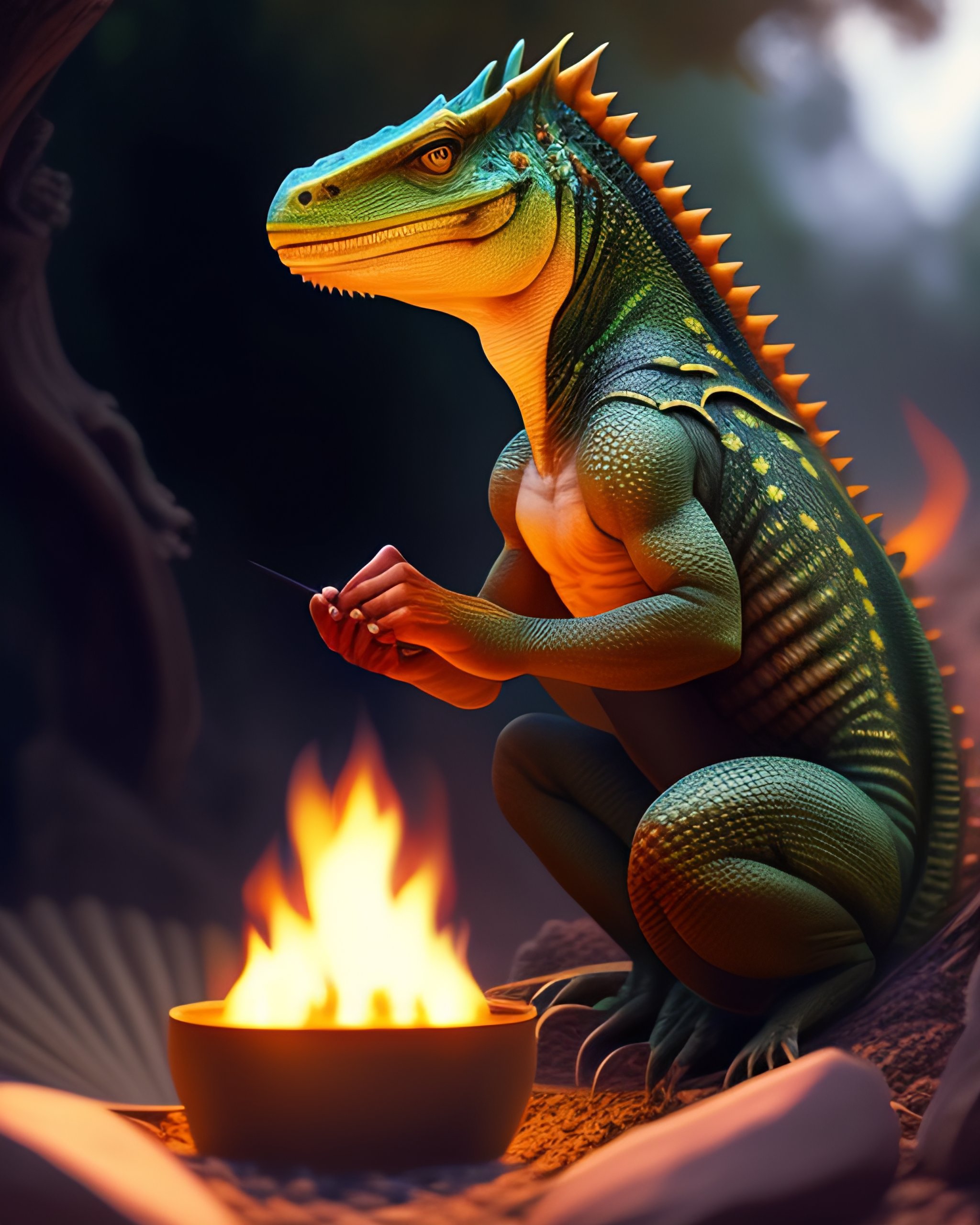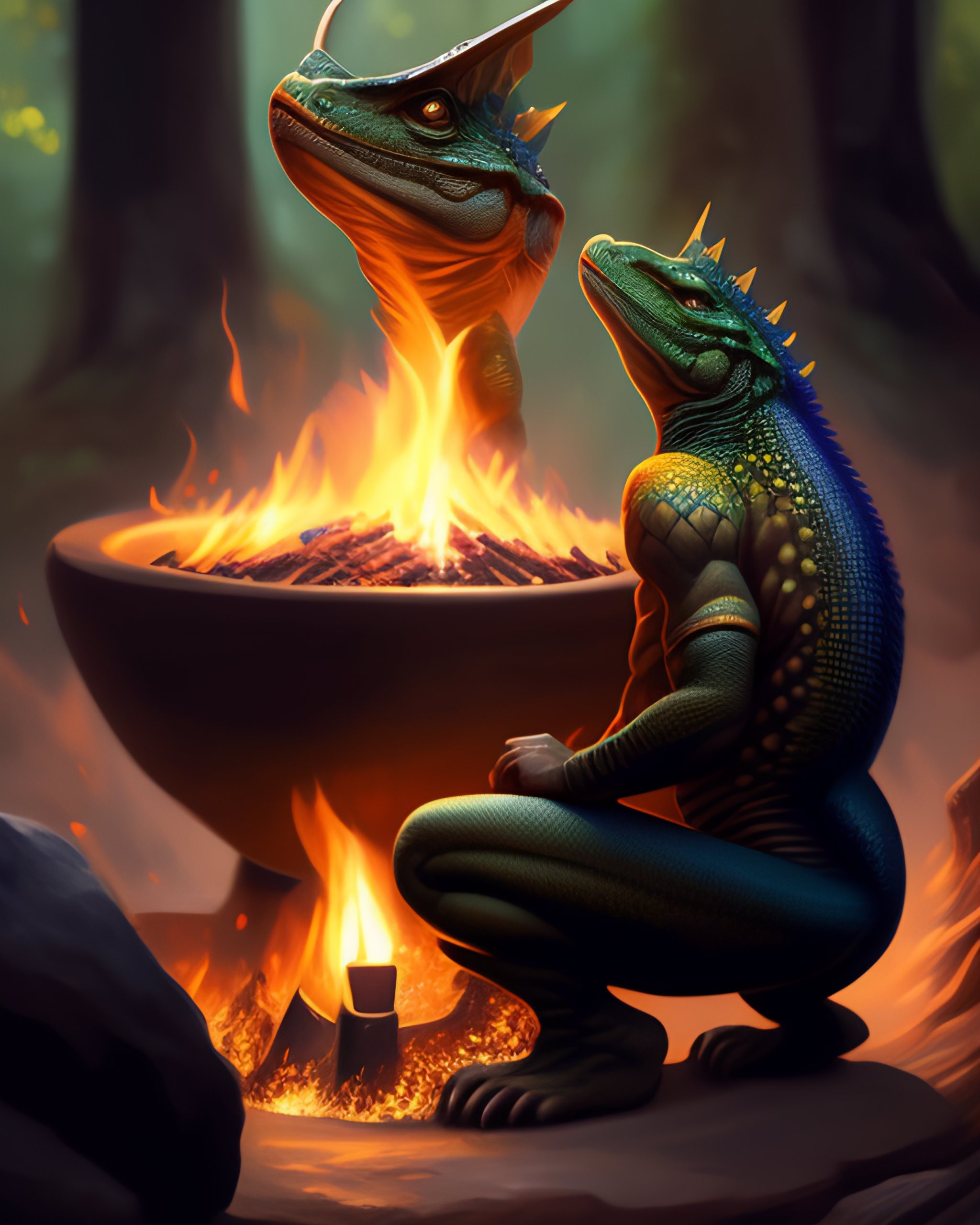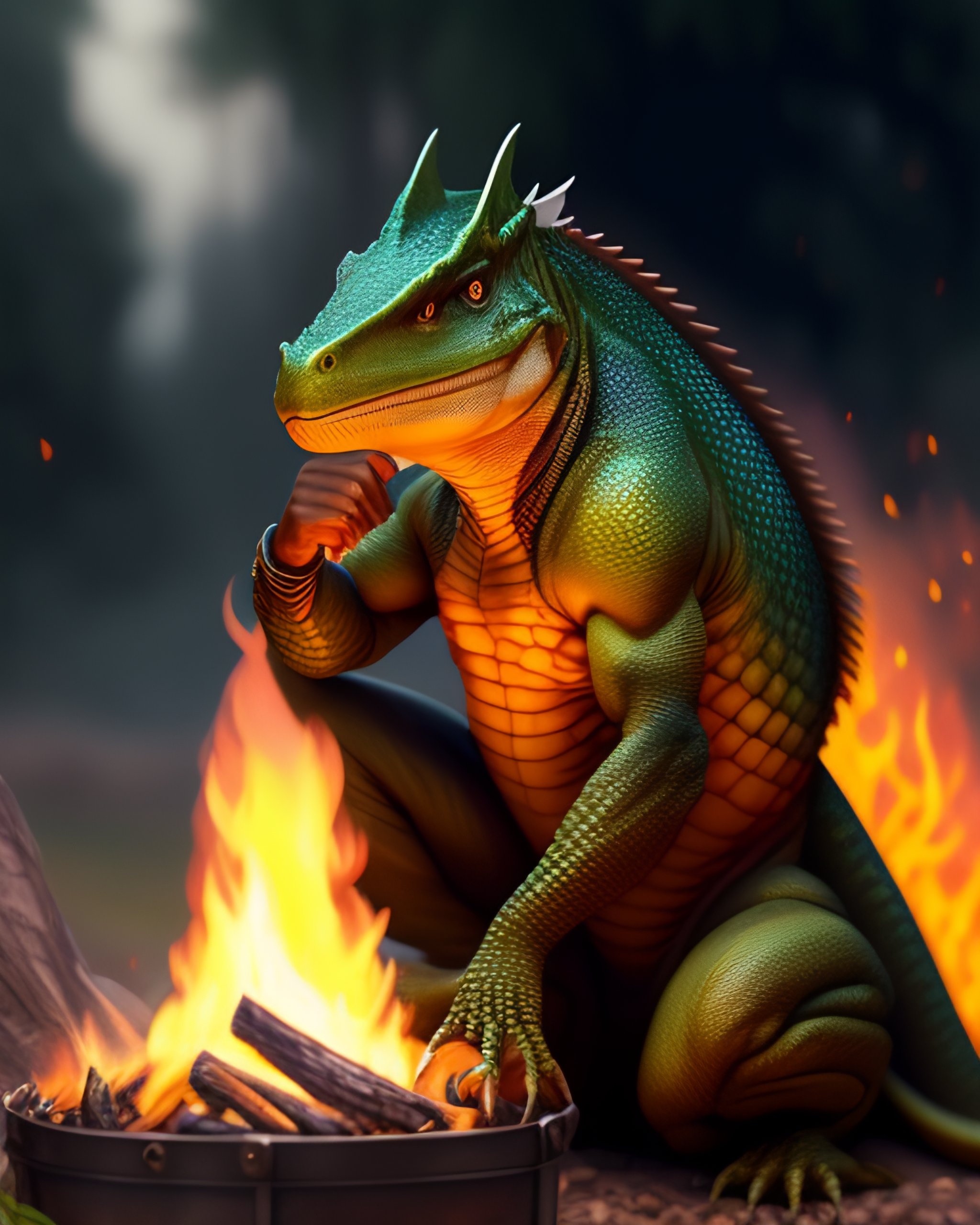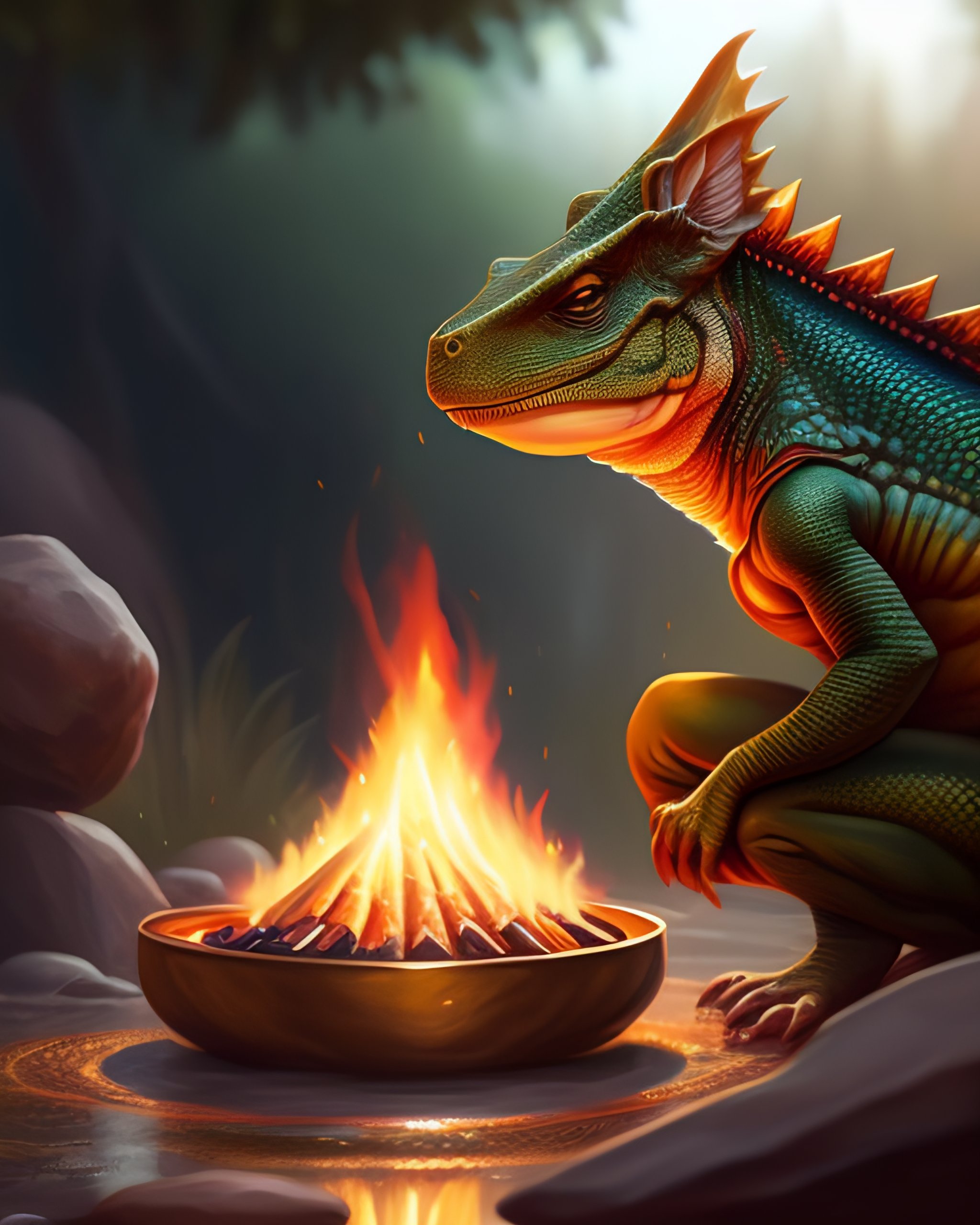 Lizardman praying in a fire pit, highly detailed, digital painting, artstation, concept art, smooth, sharp focus, illustration, art by artgerm and greg rutkowski and alphonse mucha