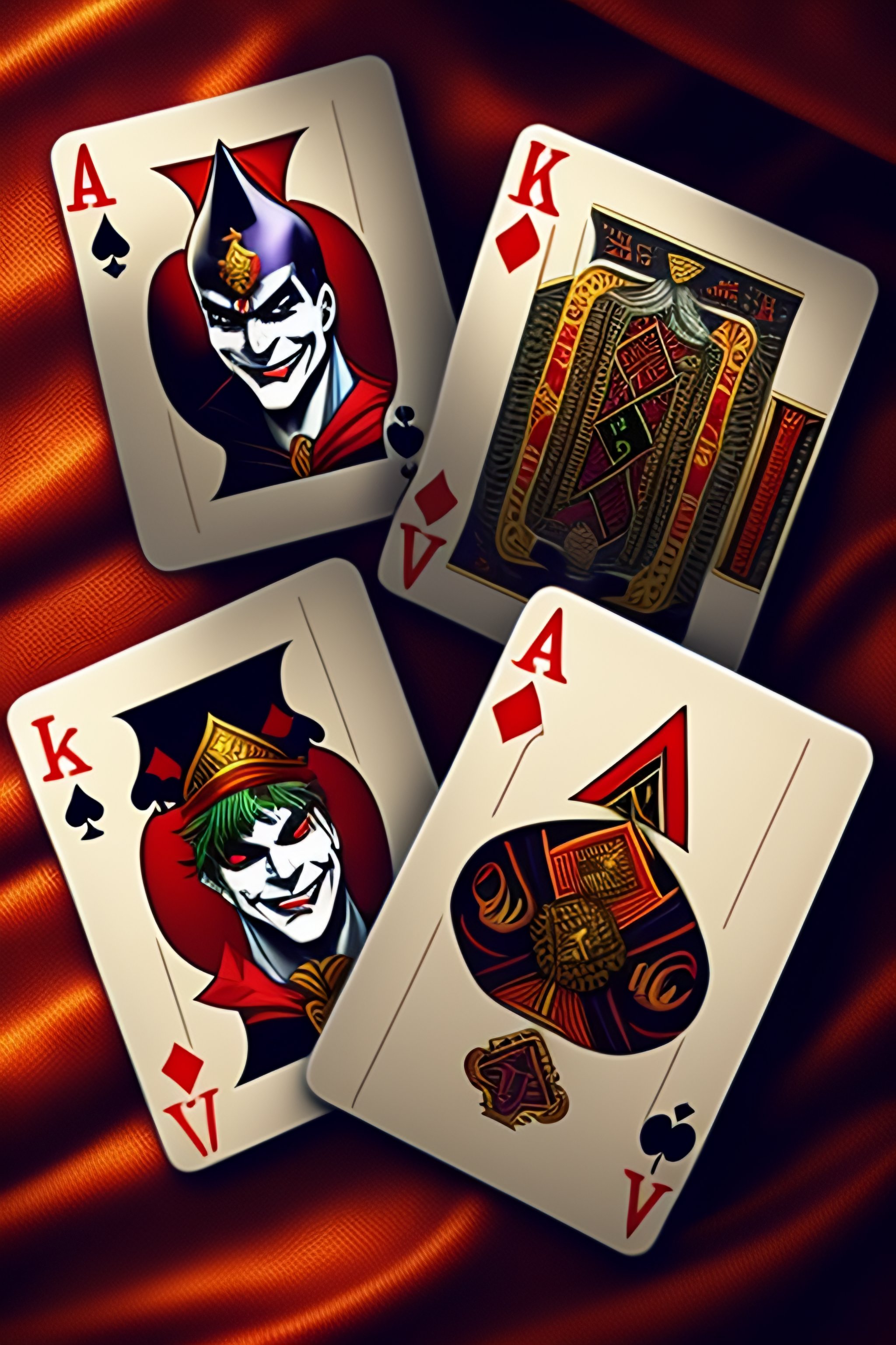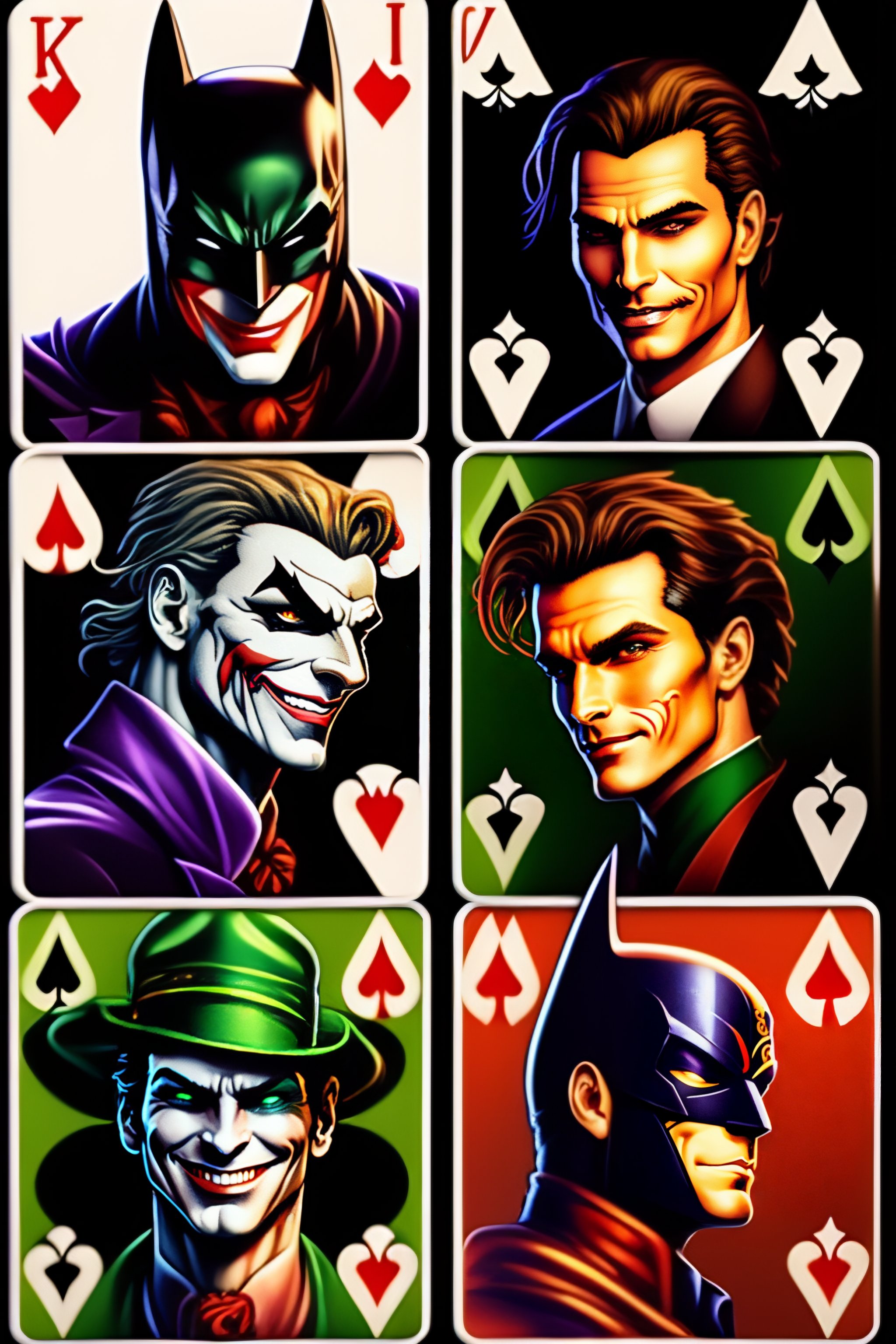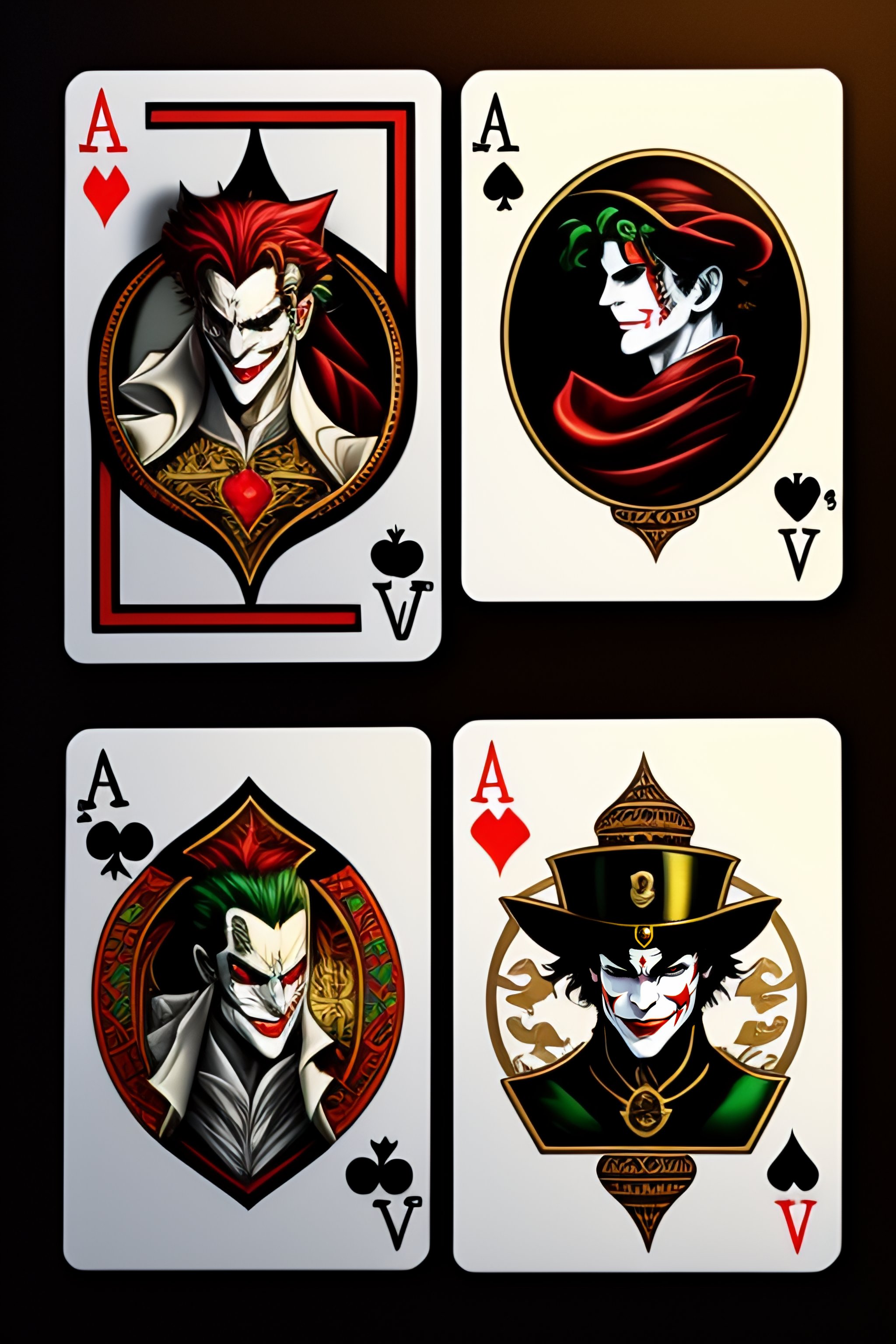 5 playing cards each one representing one of the folowing character :joker, smoker, gambit, hisoka, batman who laugh
