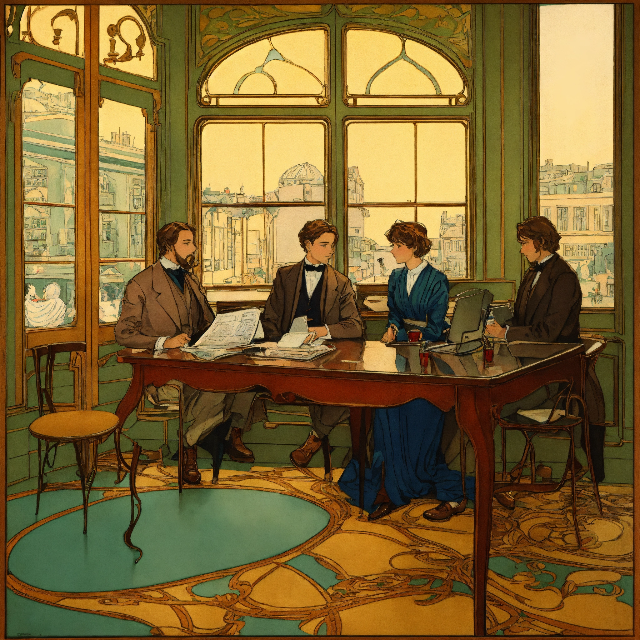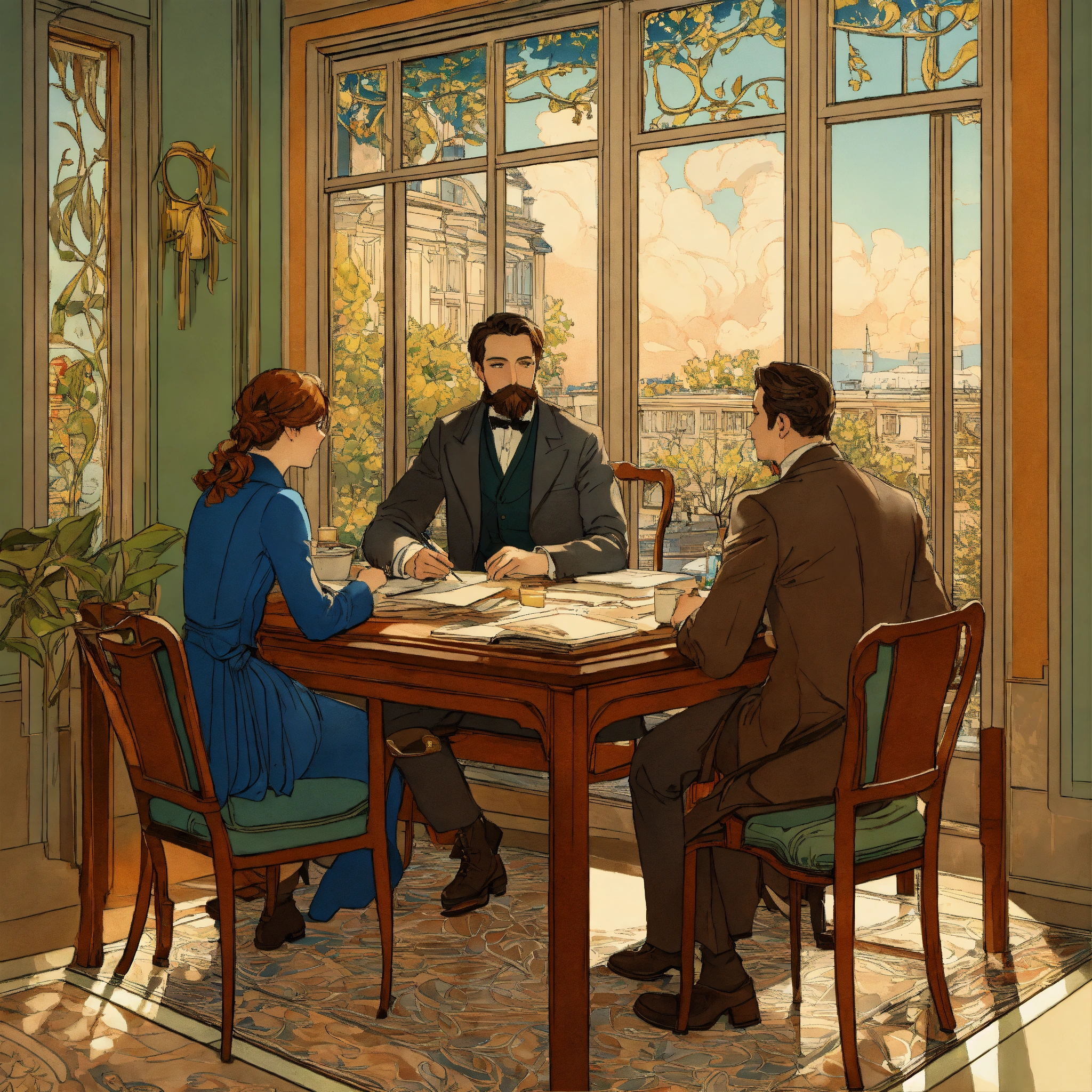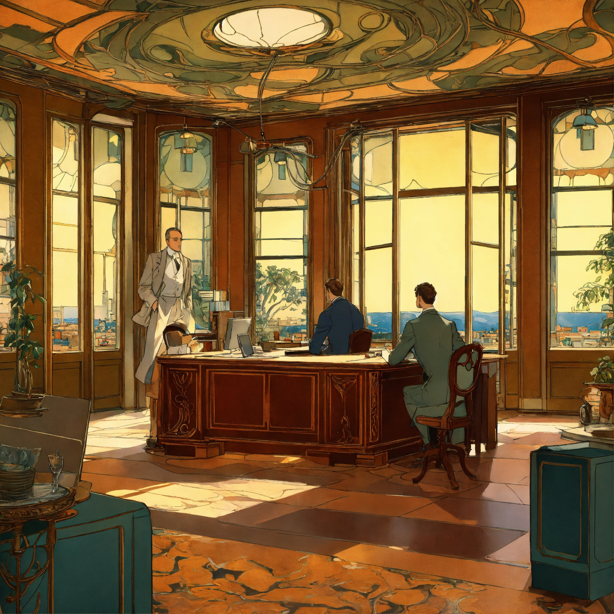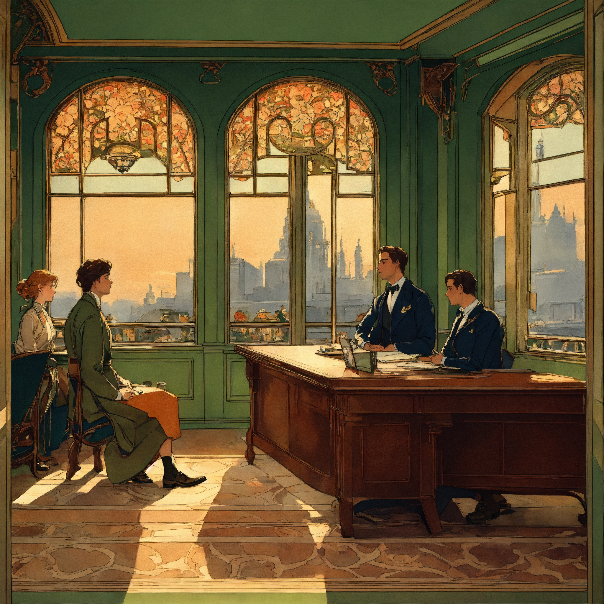 Art nouveau, illustration, office with a table, people sitting behind the table, a window in the background.
