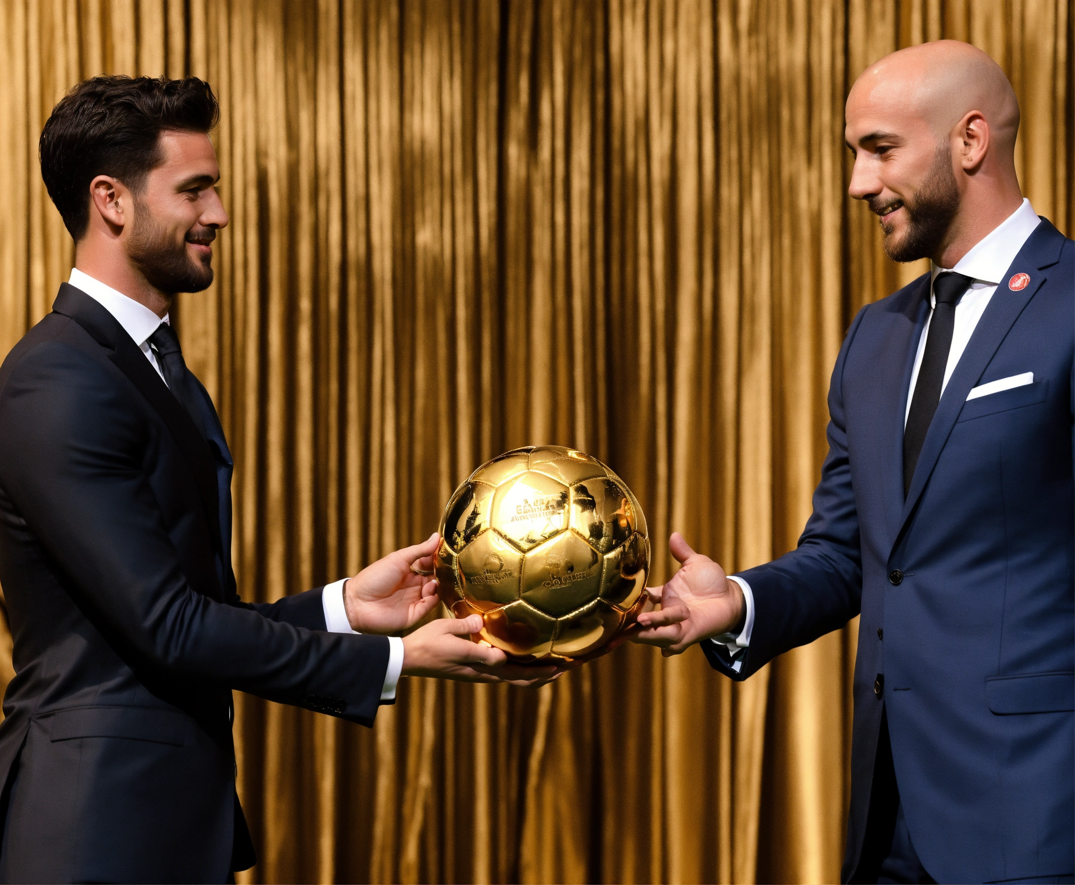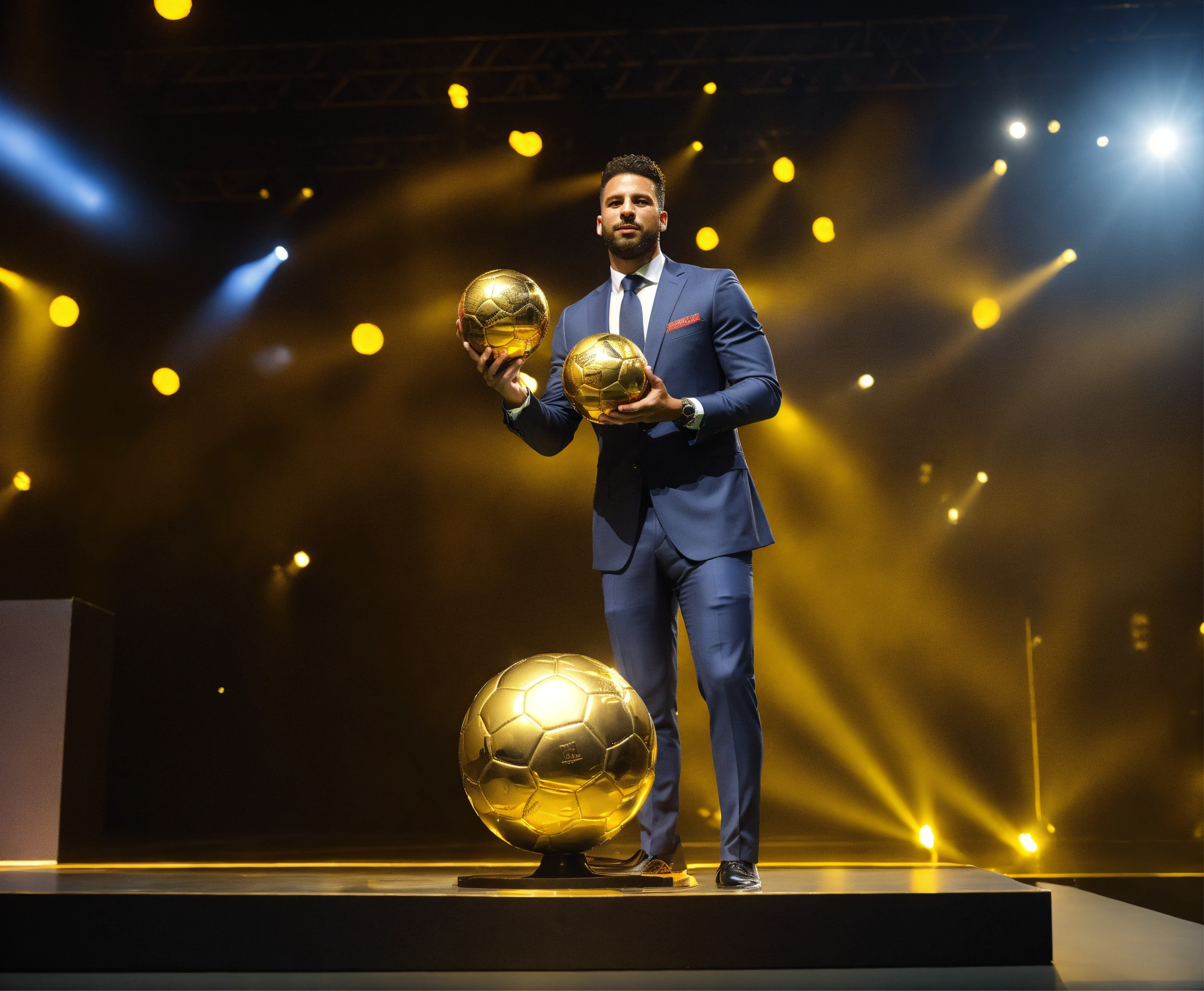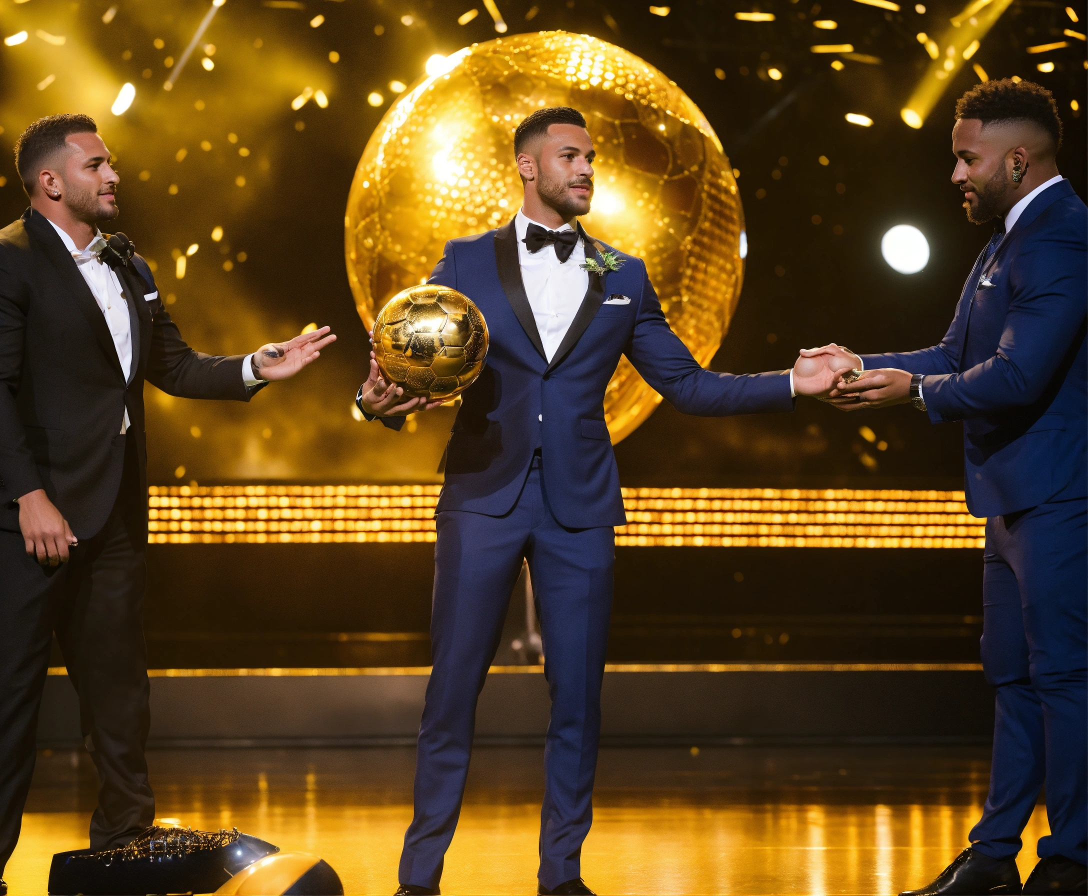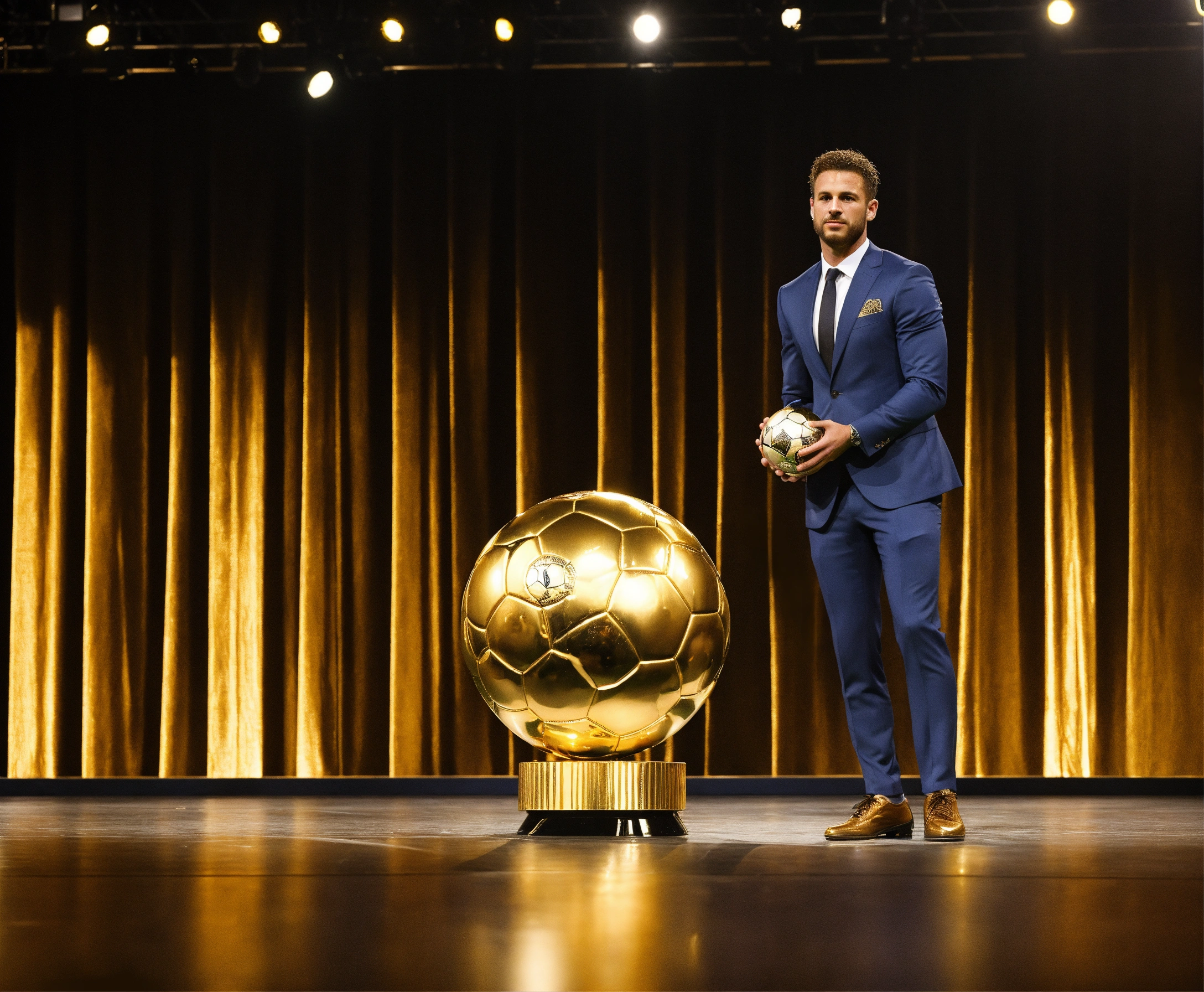 Awarding the golden ball to the best football player, on stage, half of the body is visible, a man in a suit
