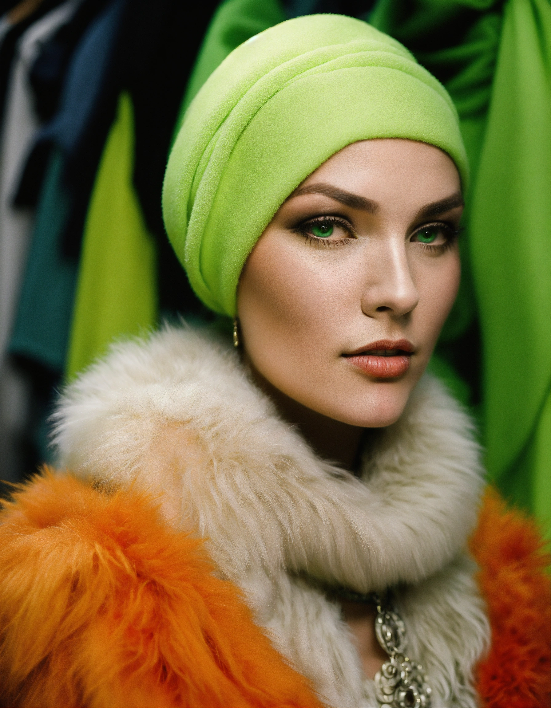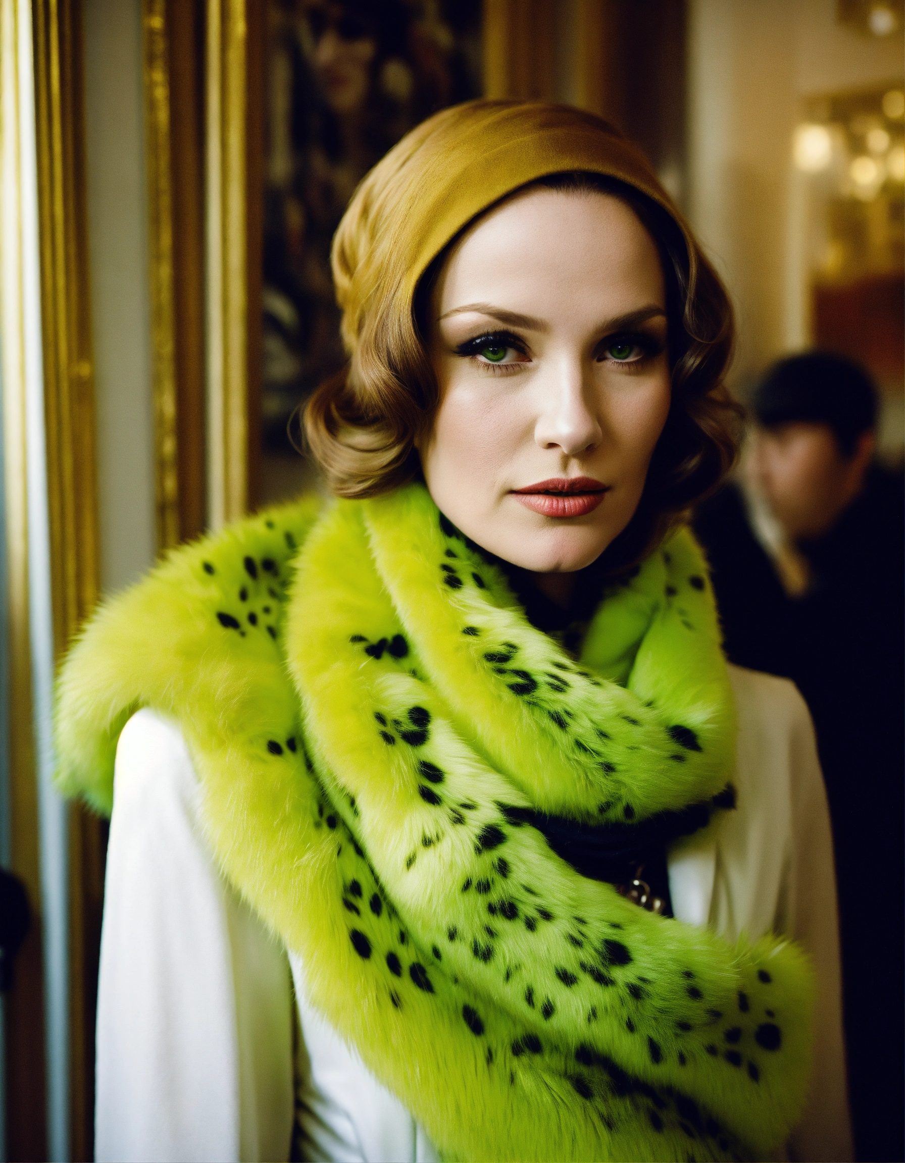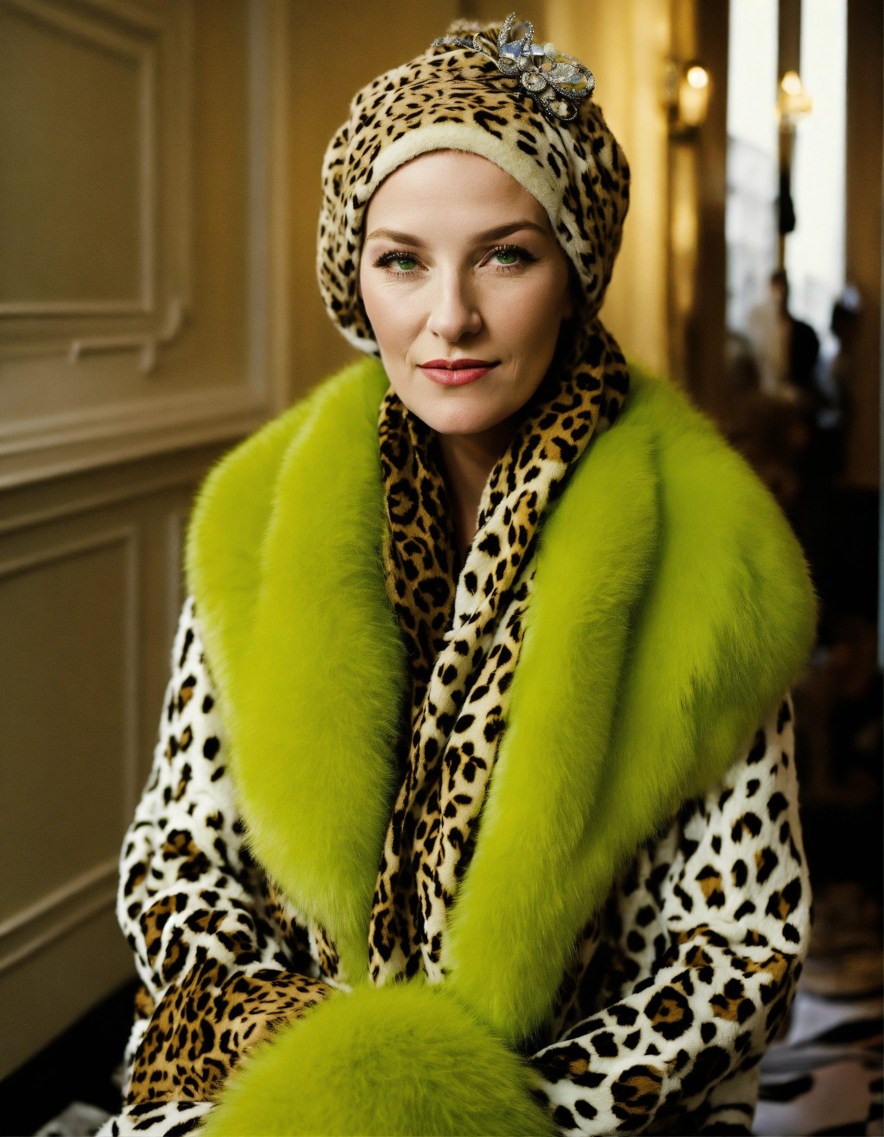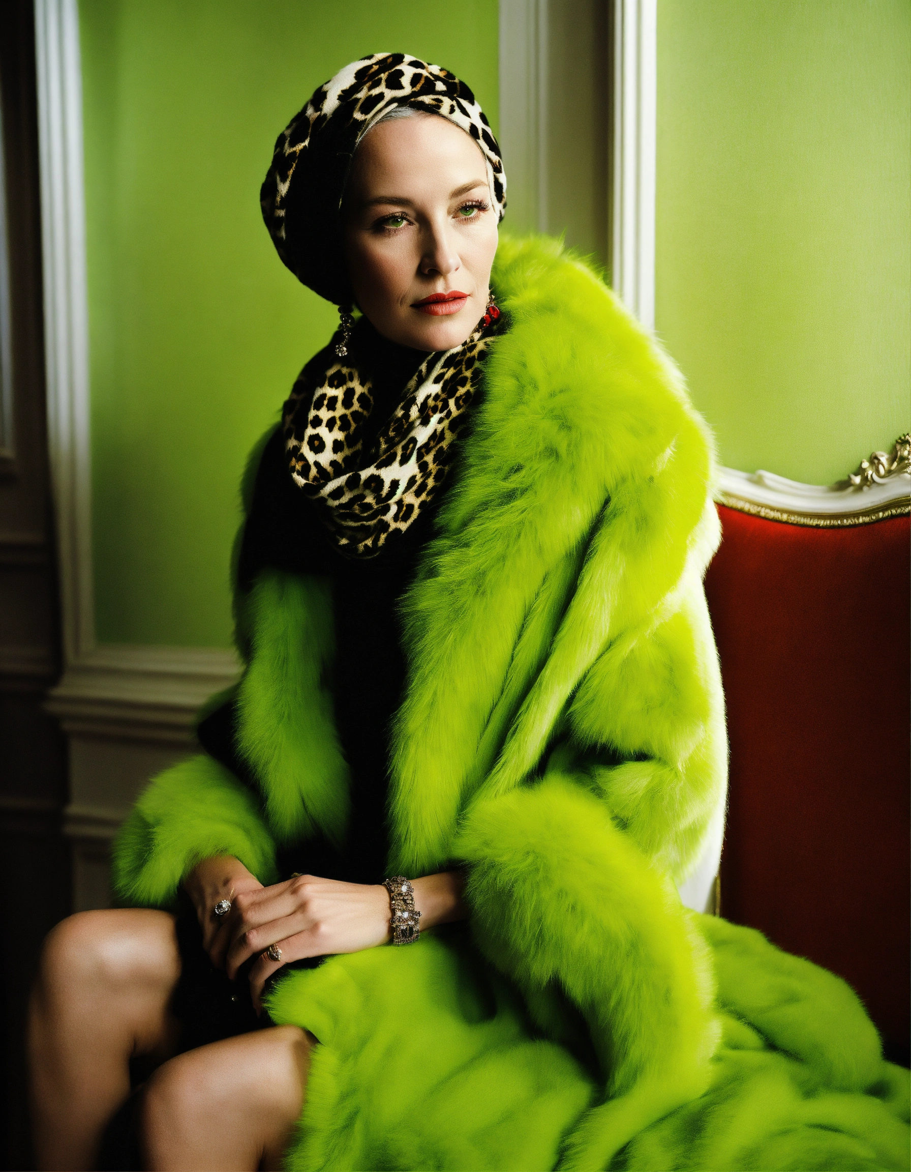 Photo of edie beale of grey gardens wearing her scarf, christian dior, galliano john, haute couture fall 2009, parisian salon, boutique, montaigne avenue, bright space well, white walls, fluorescent green fur, leopard