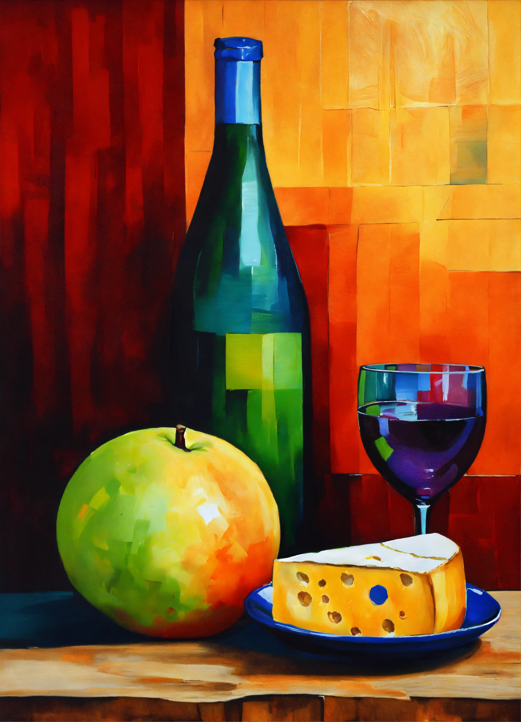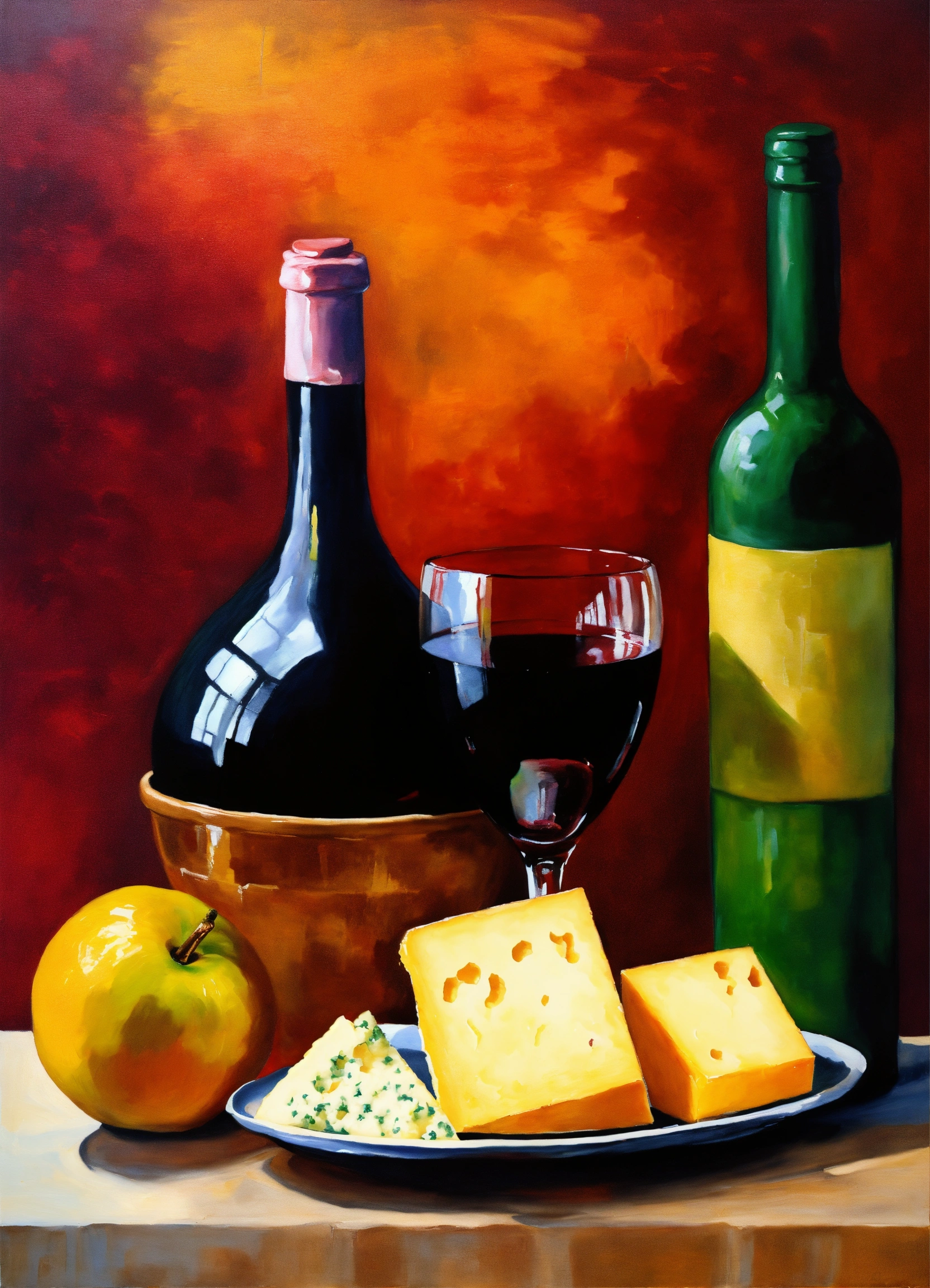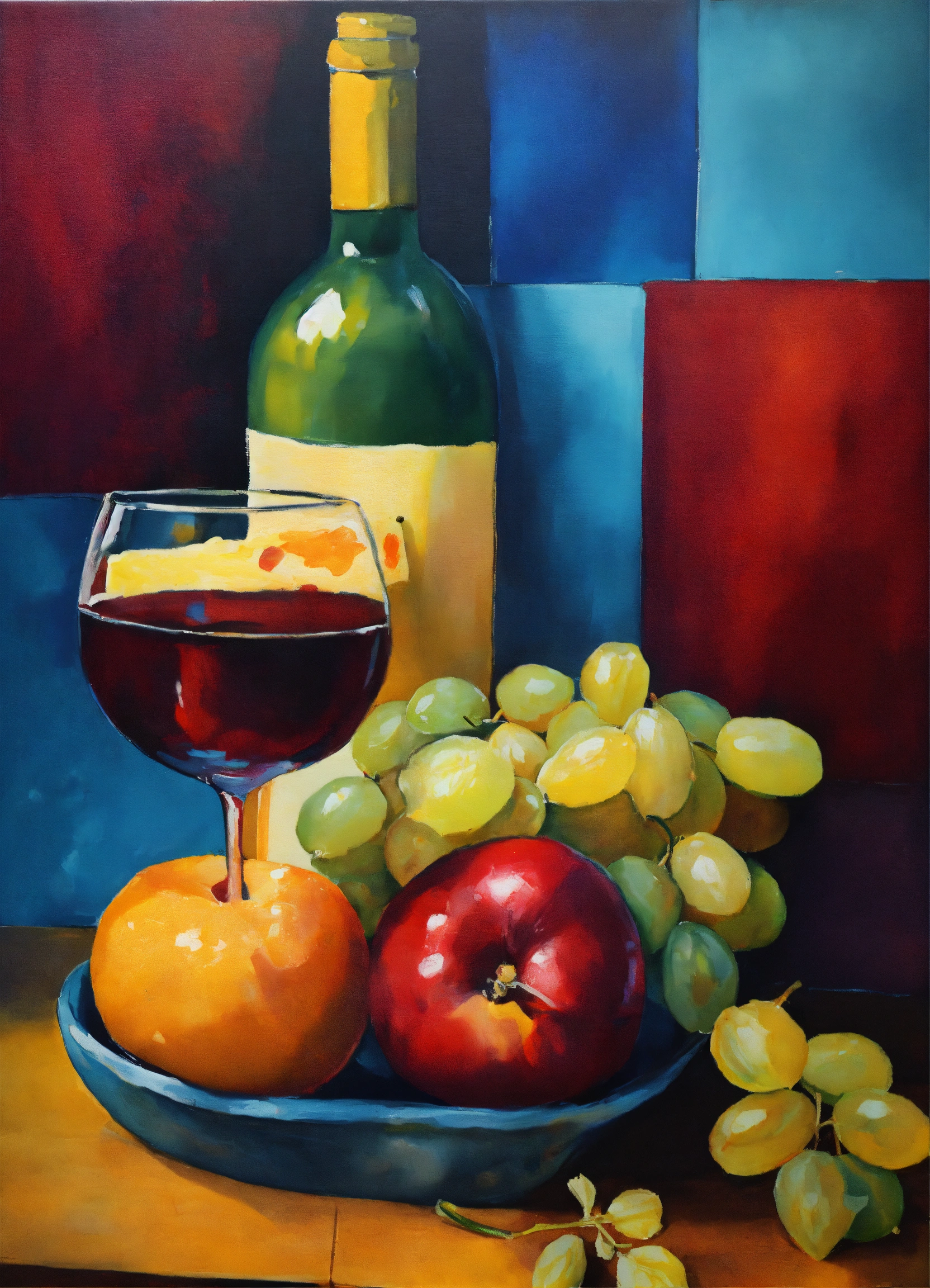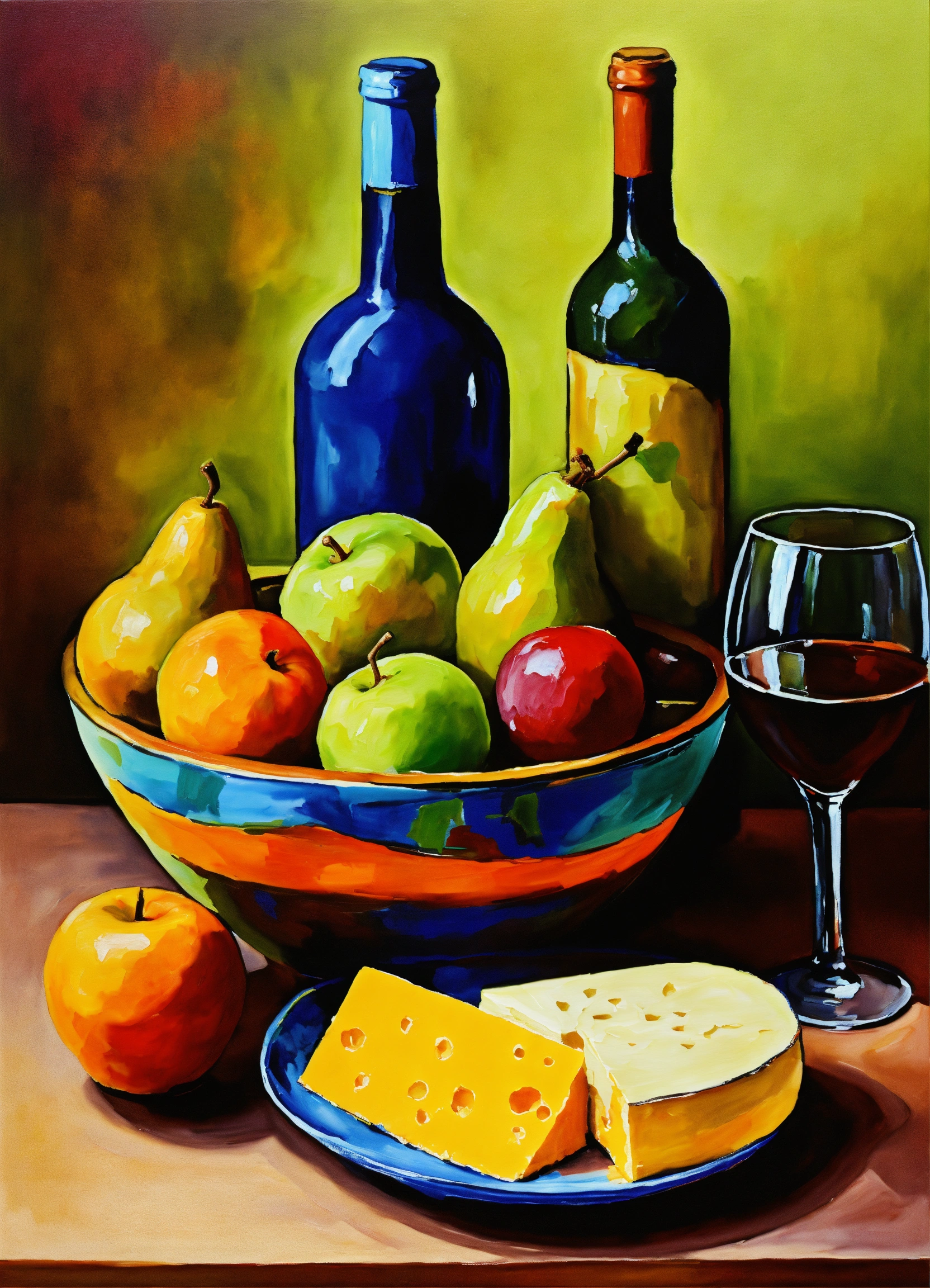 --a fruit painting of a fruit bowl wine bottle and cheese