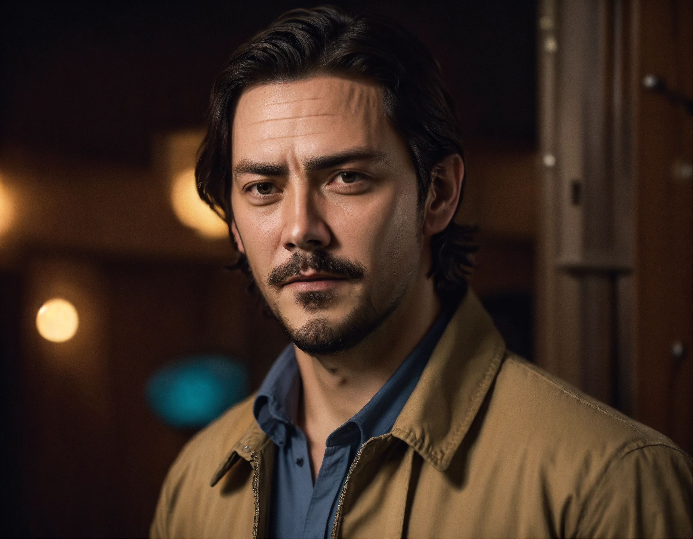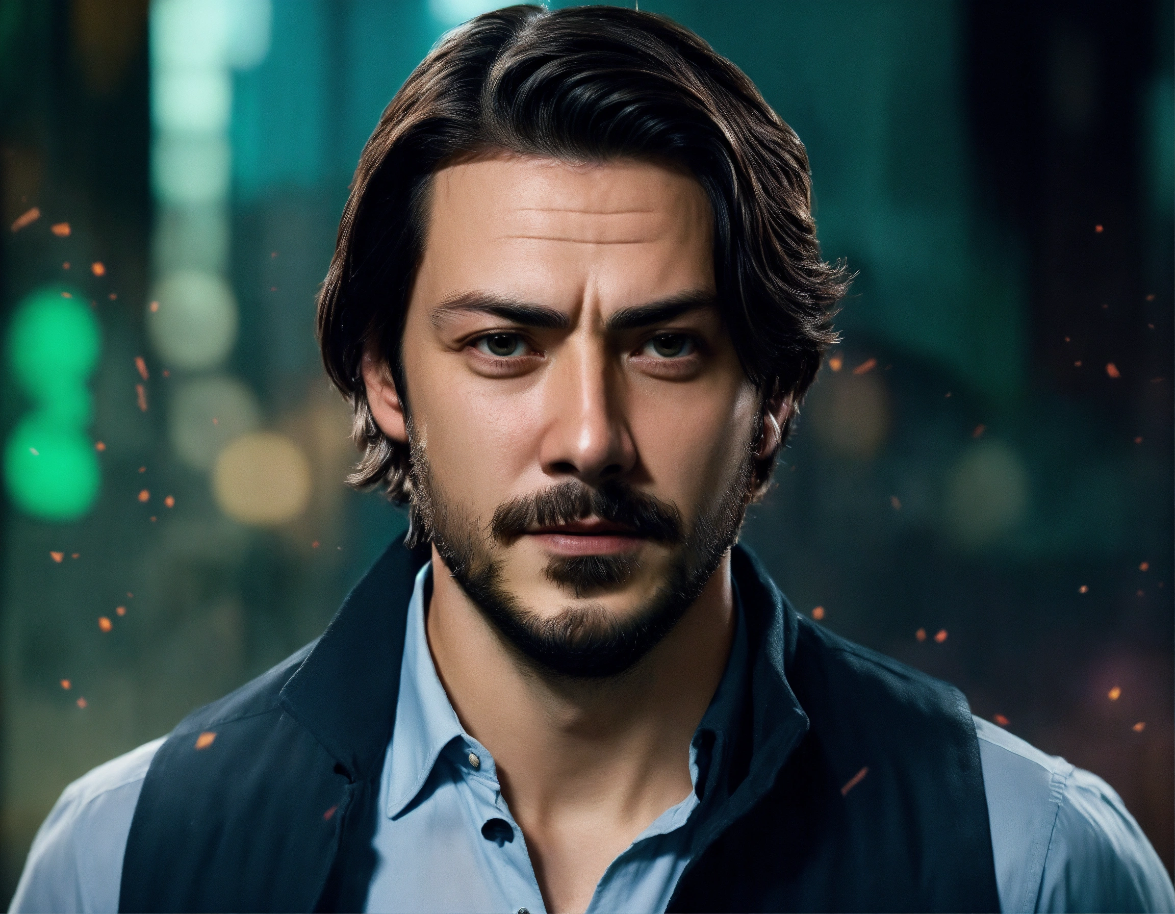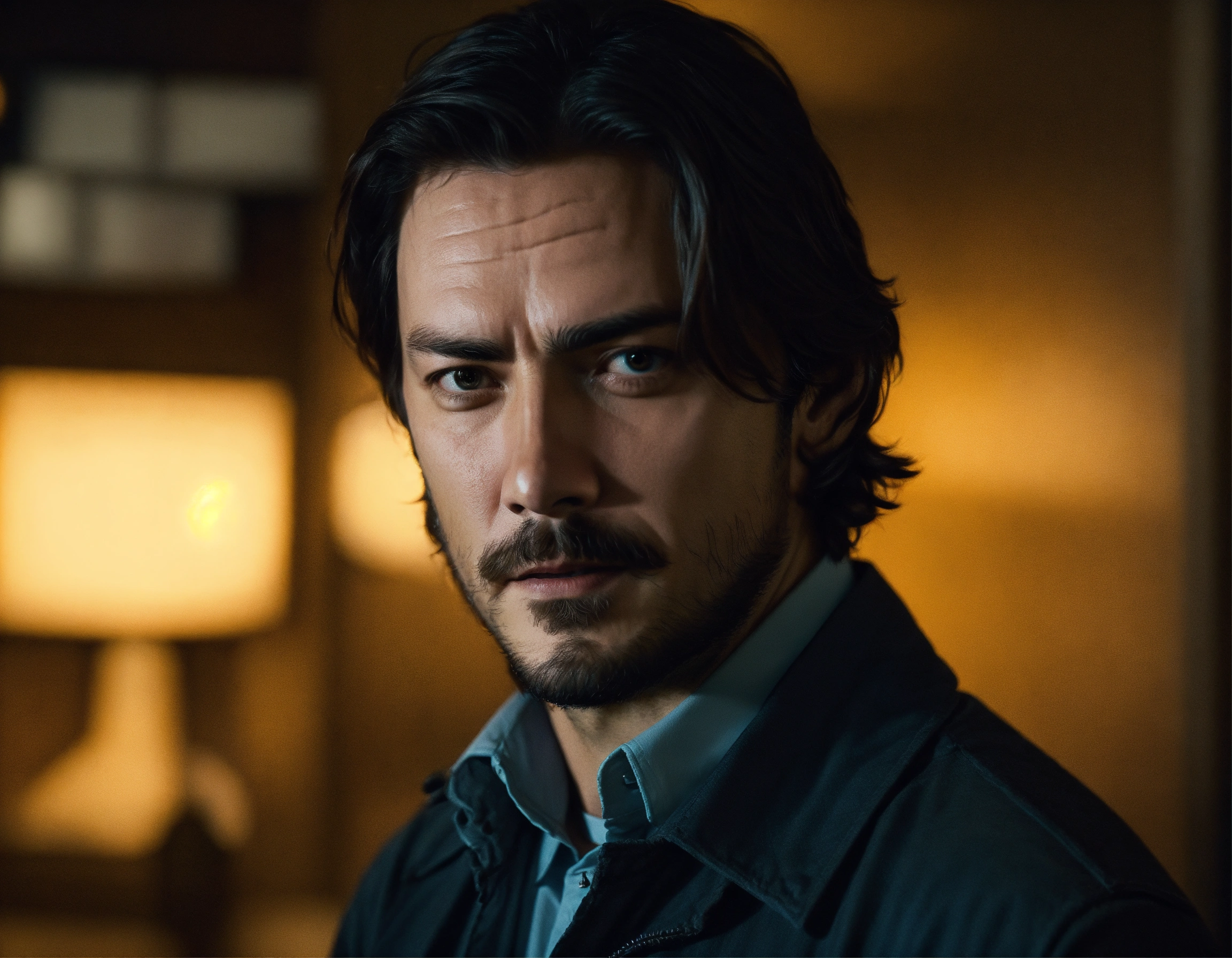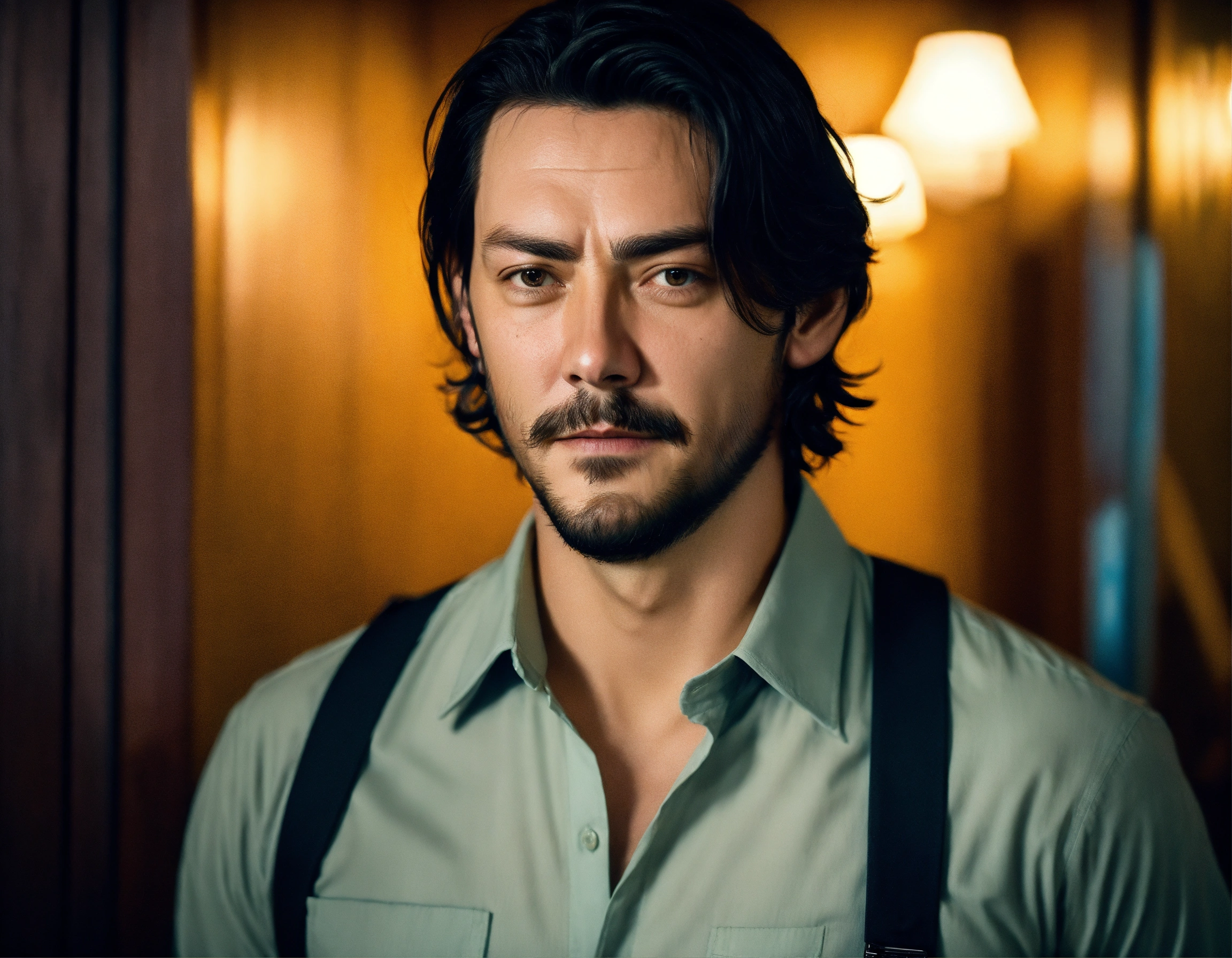 Handsome man, diego luna, shirt, dark hair, detective, very realistic, altered carbon 33 years old, serial killer hunt, soft smile, short hair
