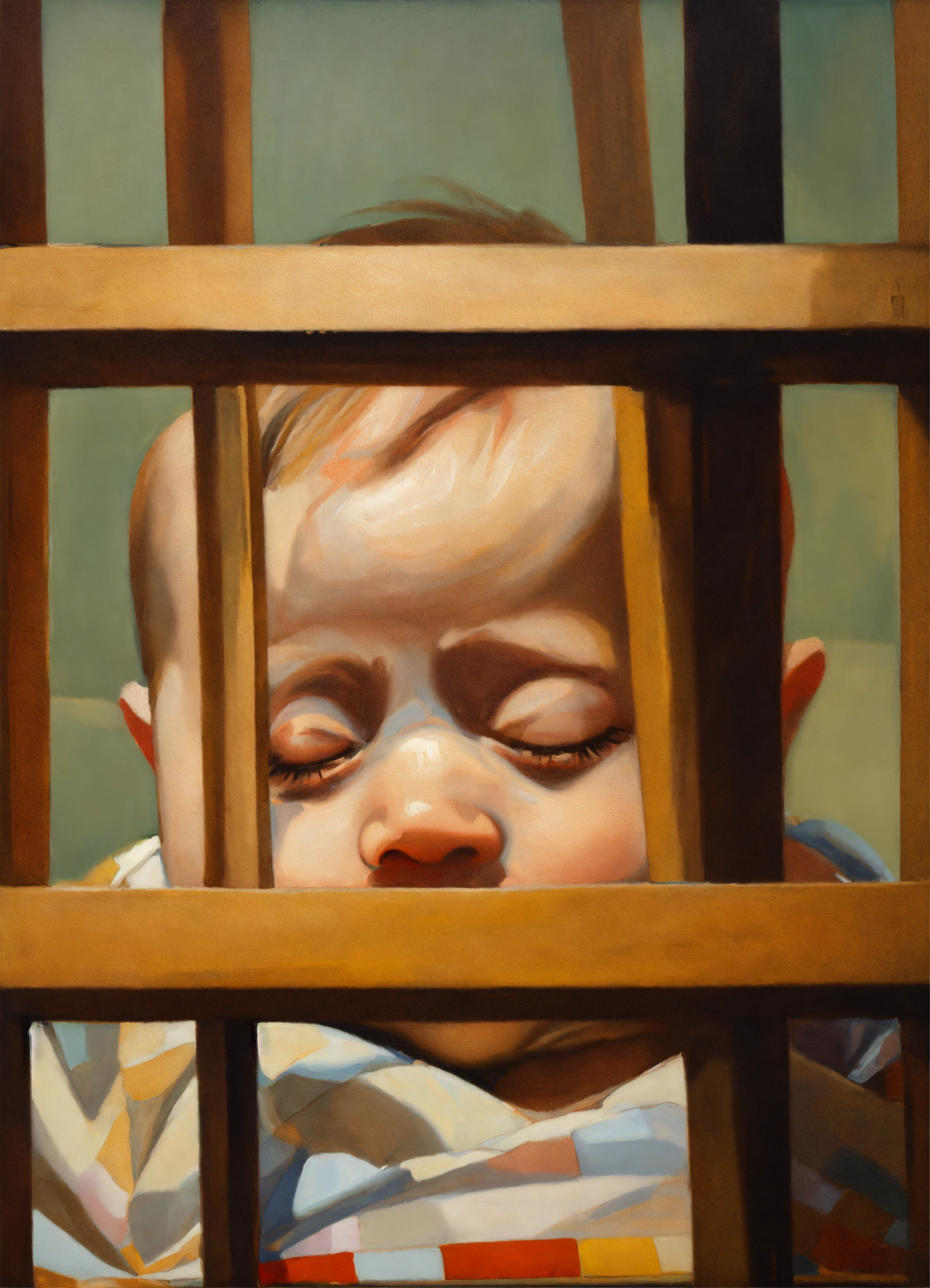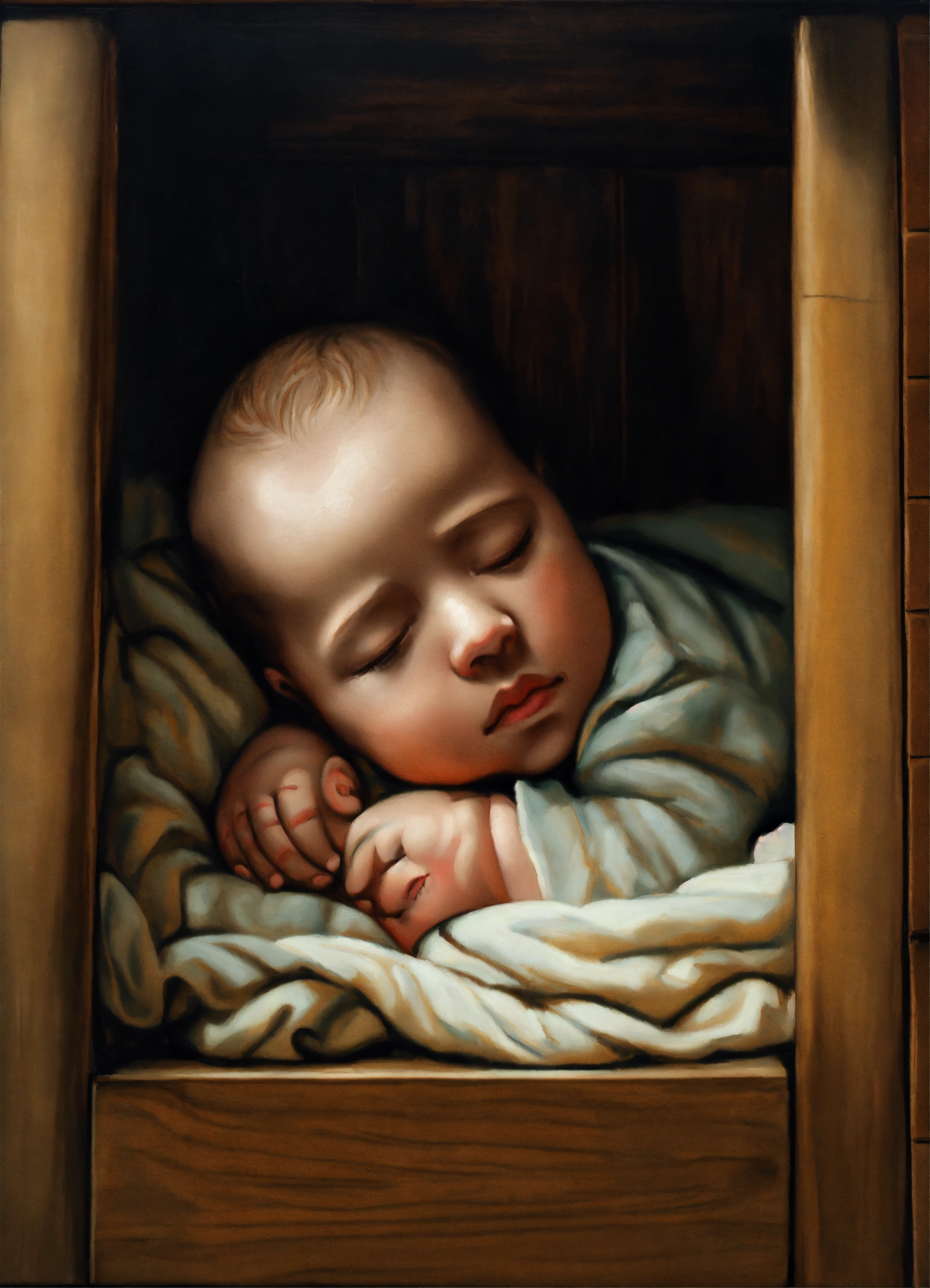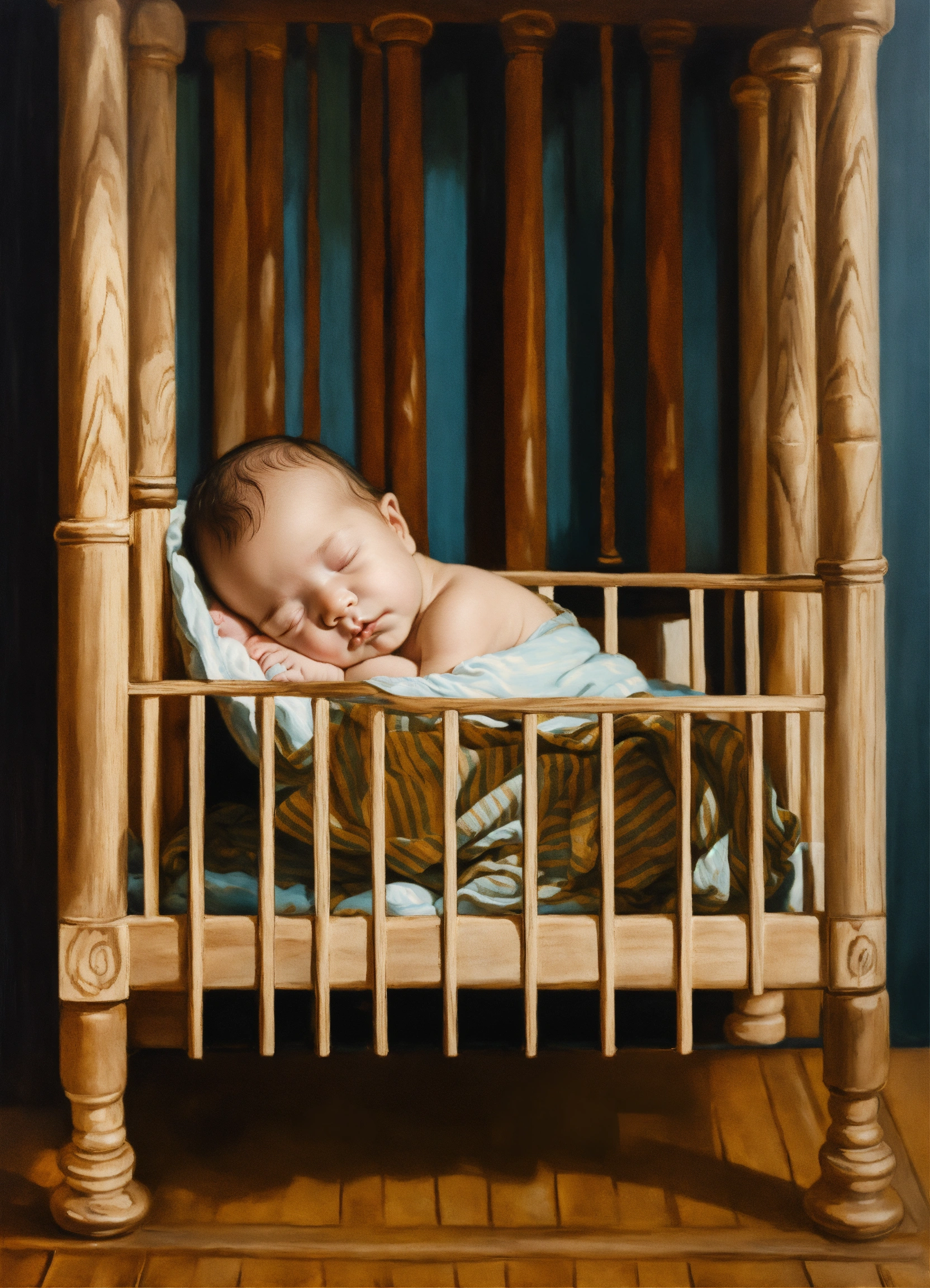An oil portrait of a sleeping baby in a wooden crib with vertical bars