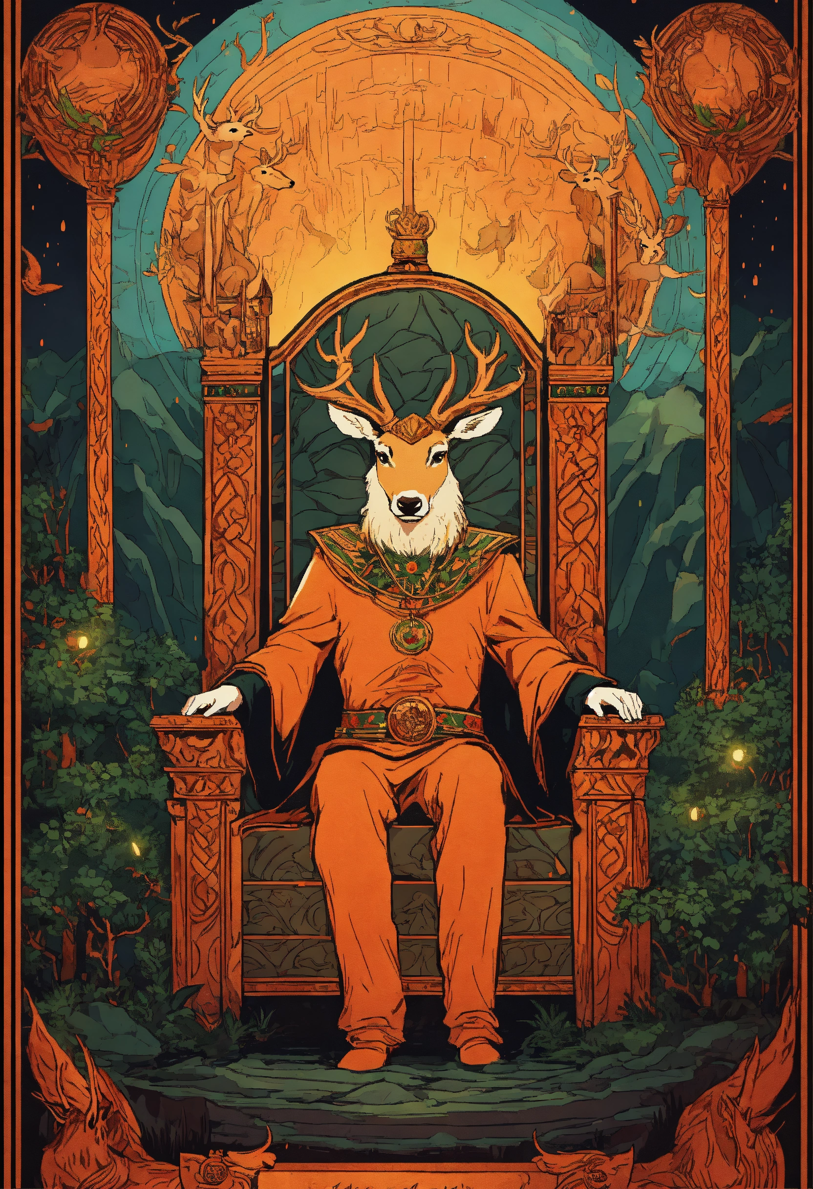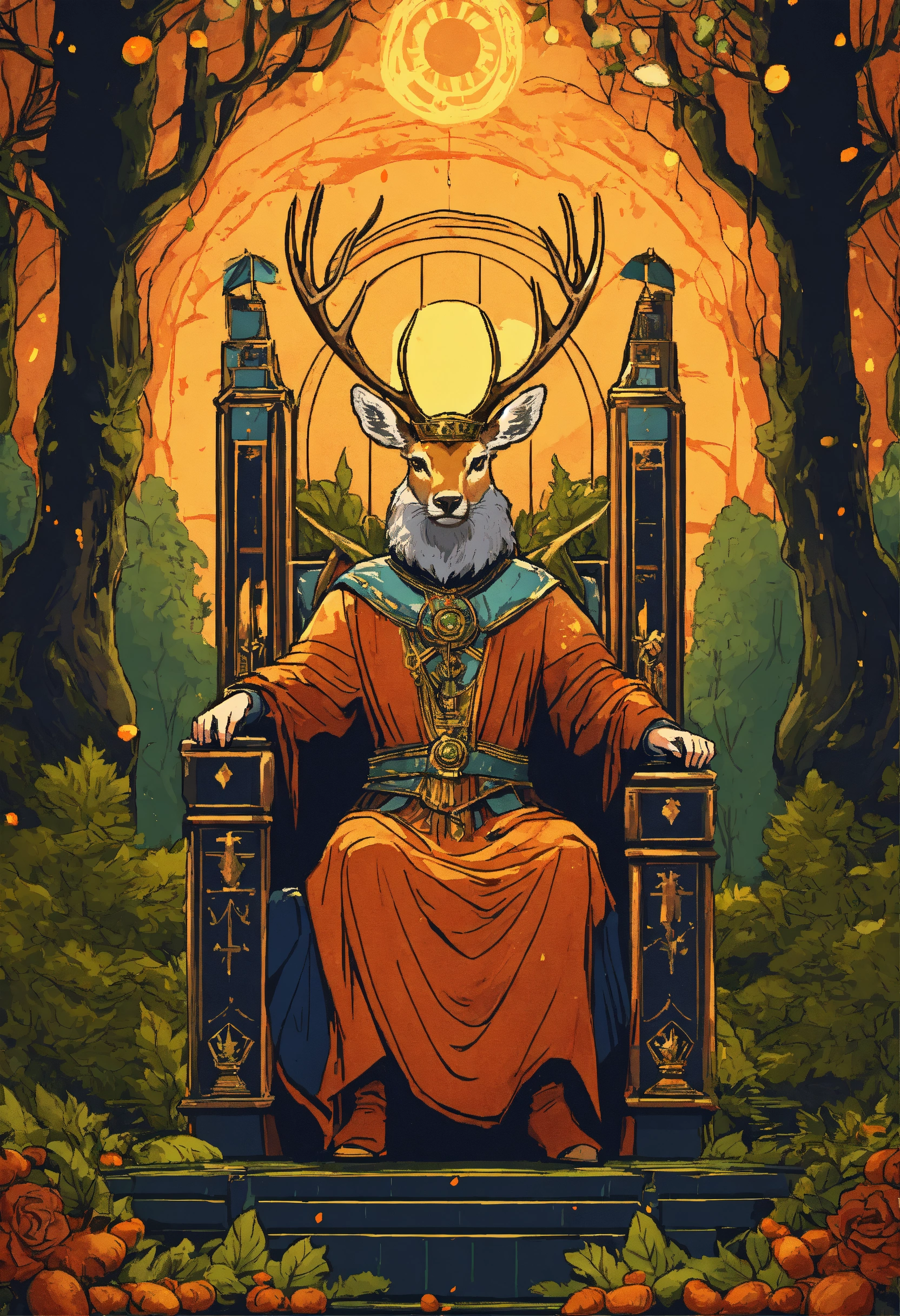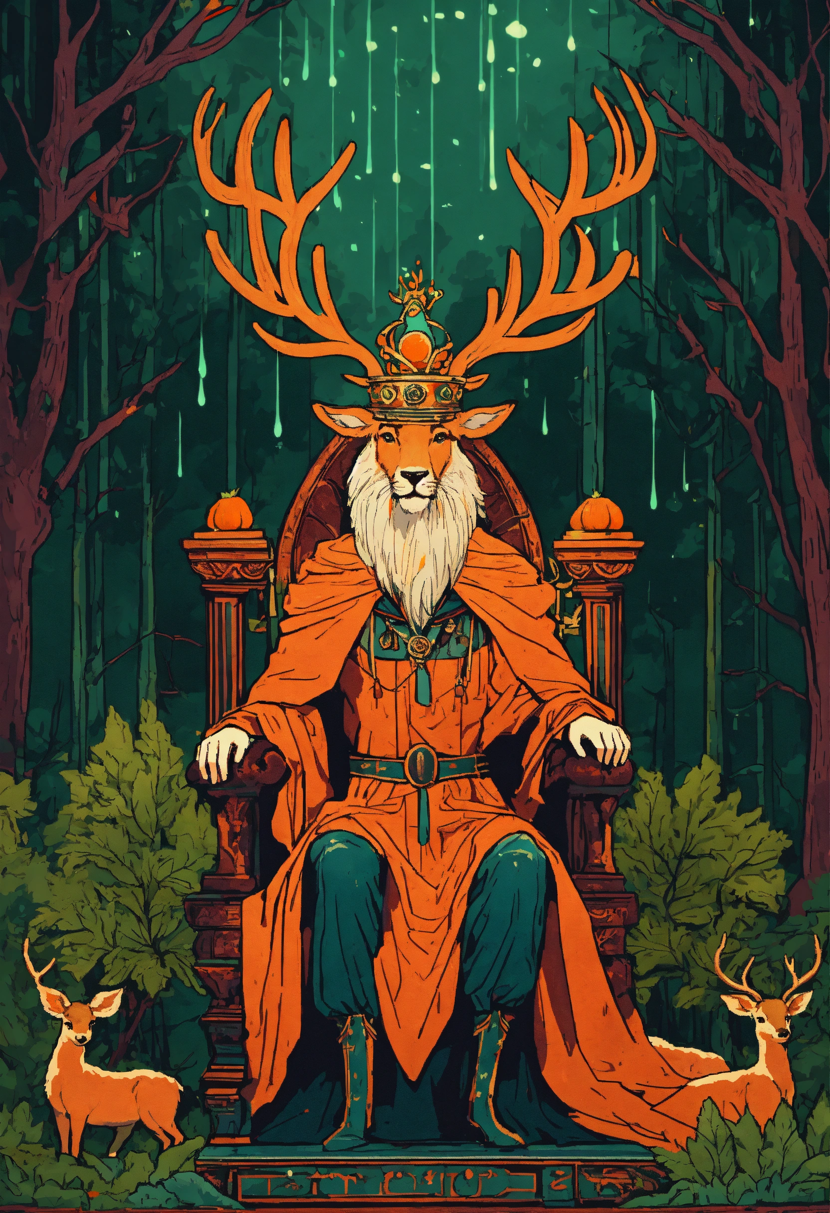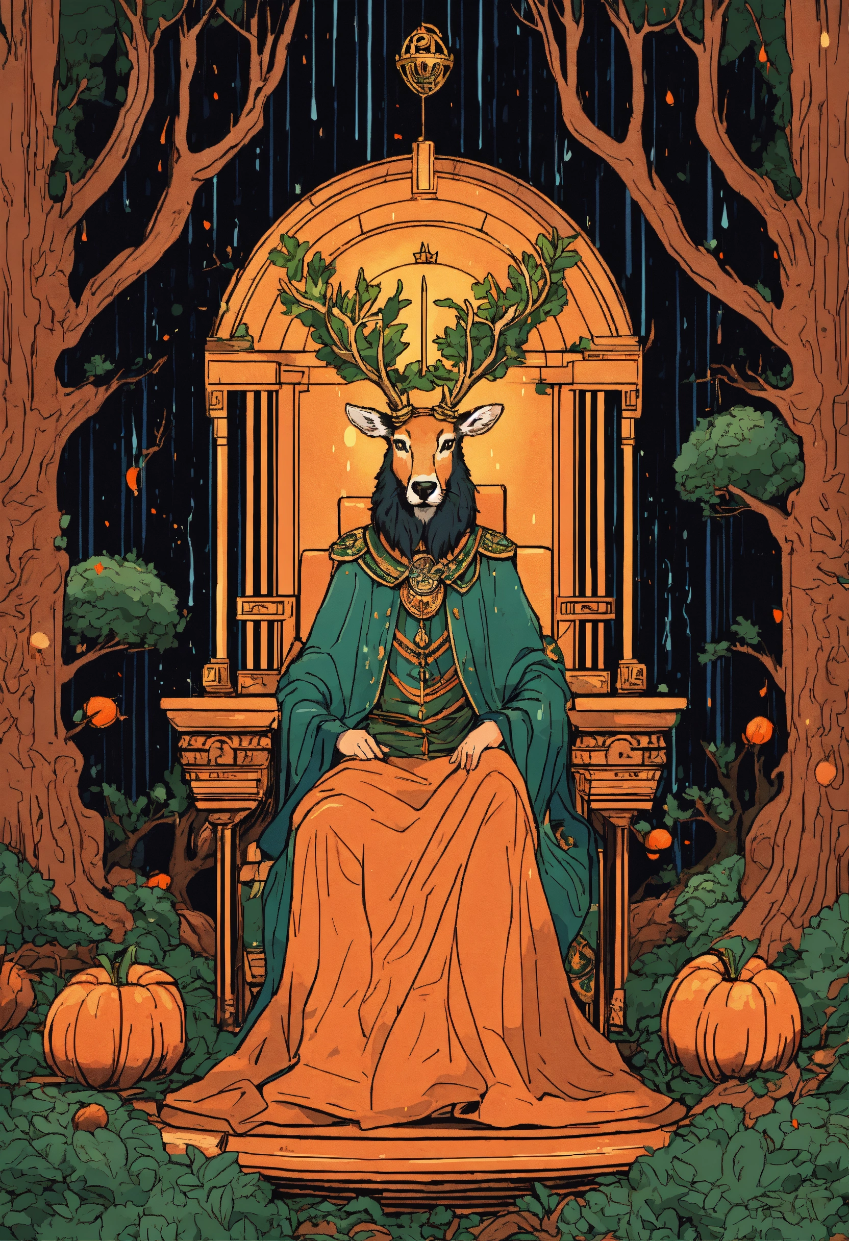 A vector illustration of the emperor of carrots with a deer crown sitting on his throne in the middle of a rainy forest in gaelic ambience, in the style of the led zeppelin's mothership album.