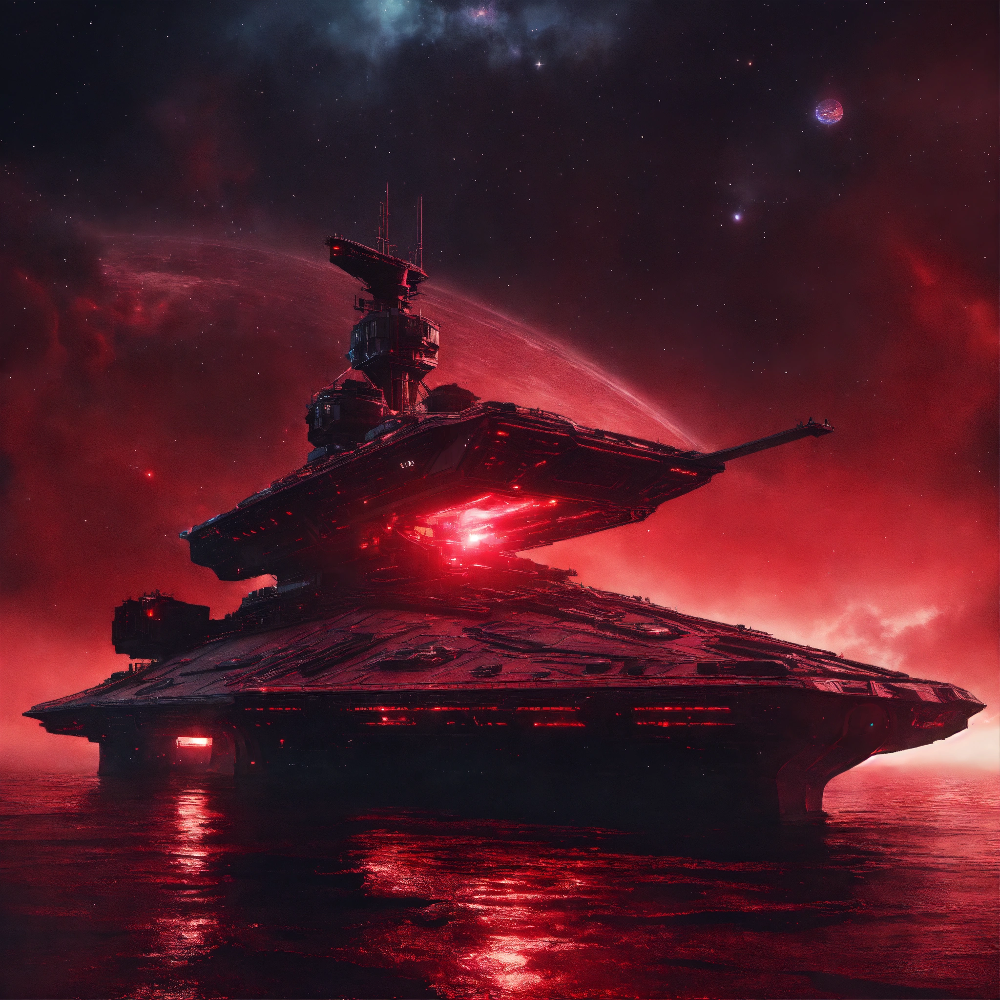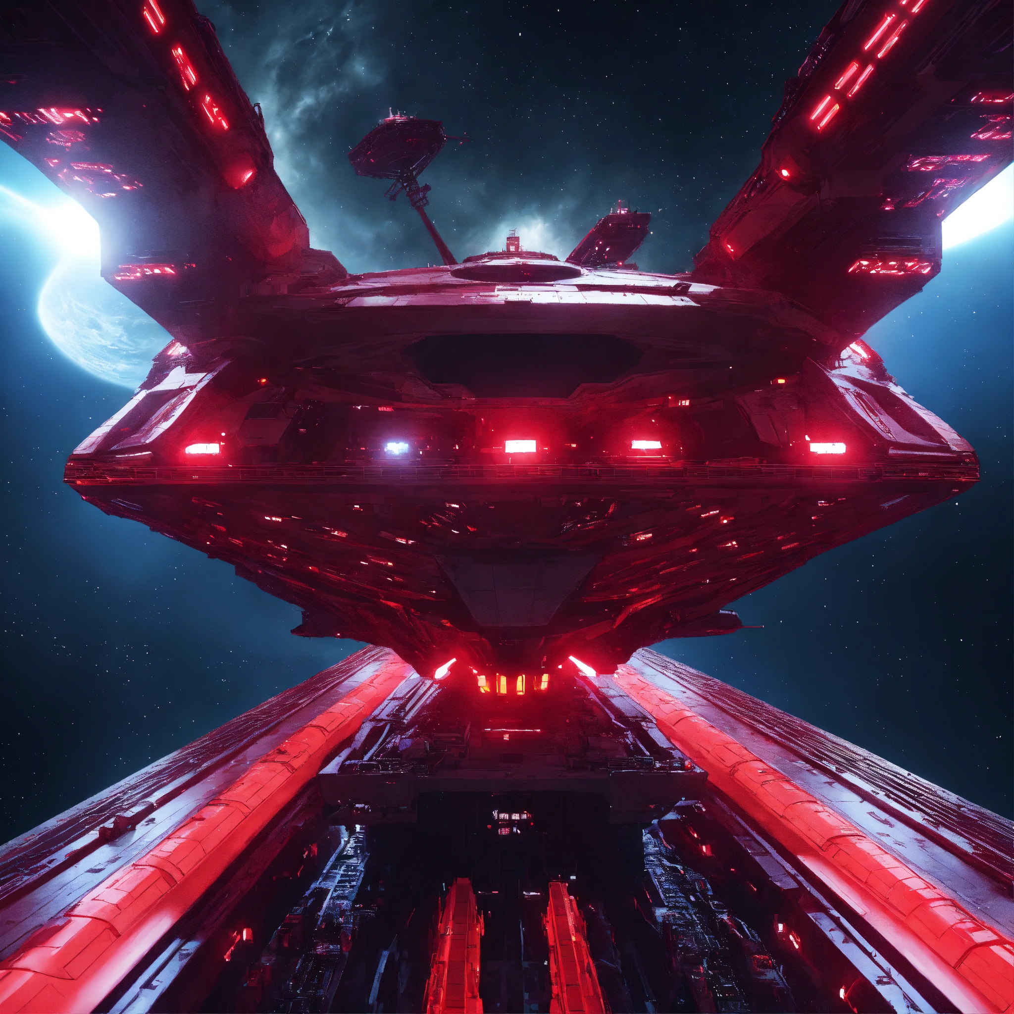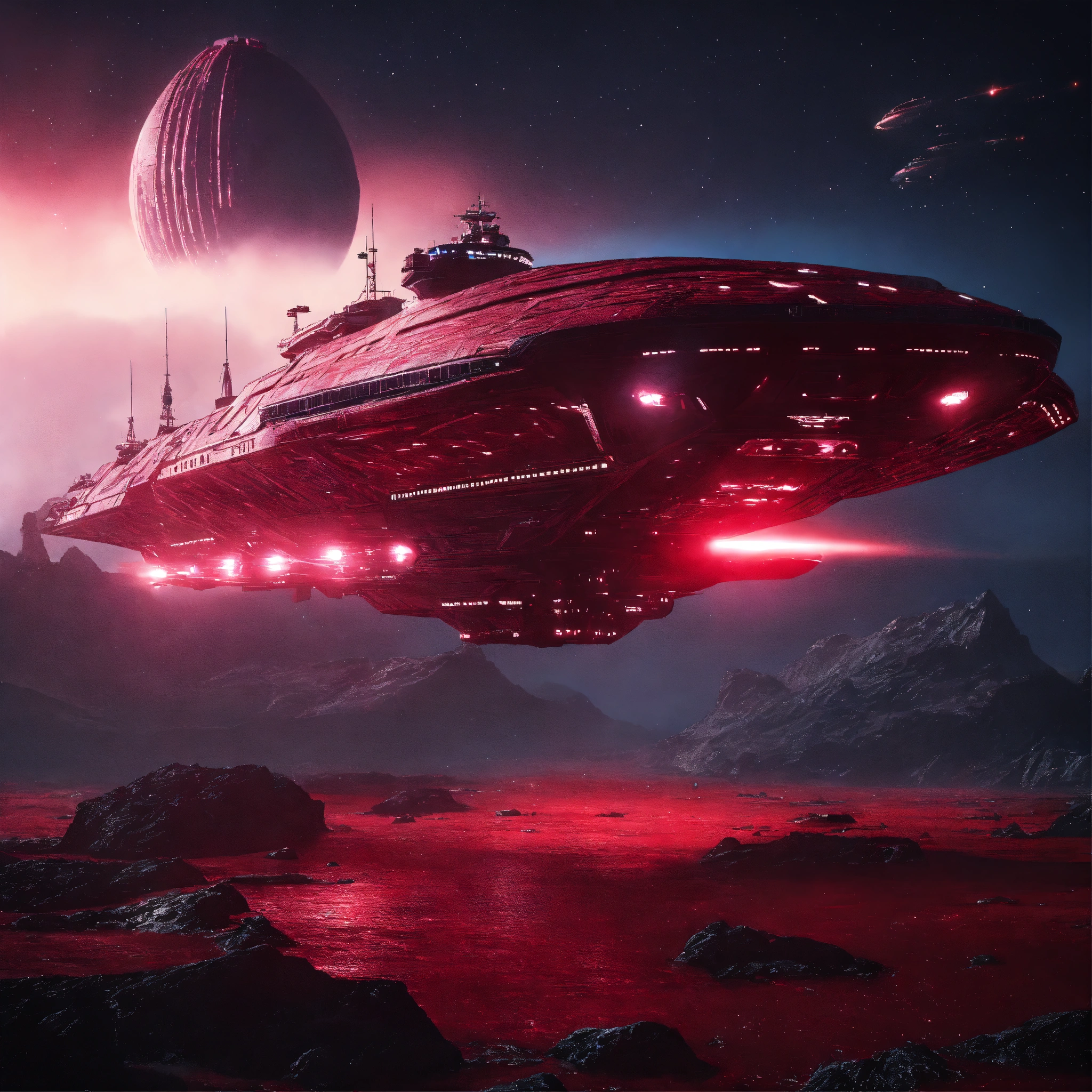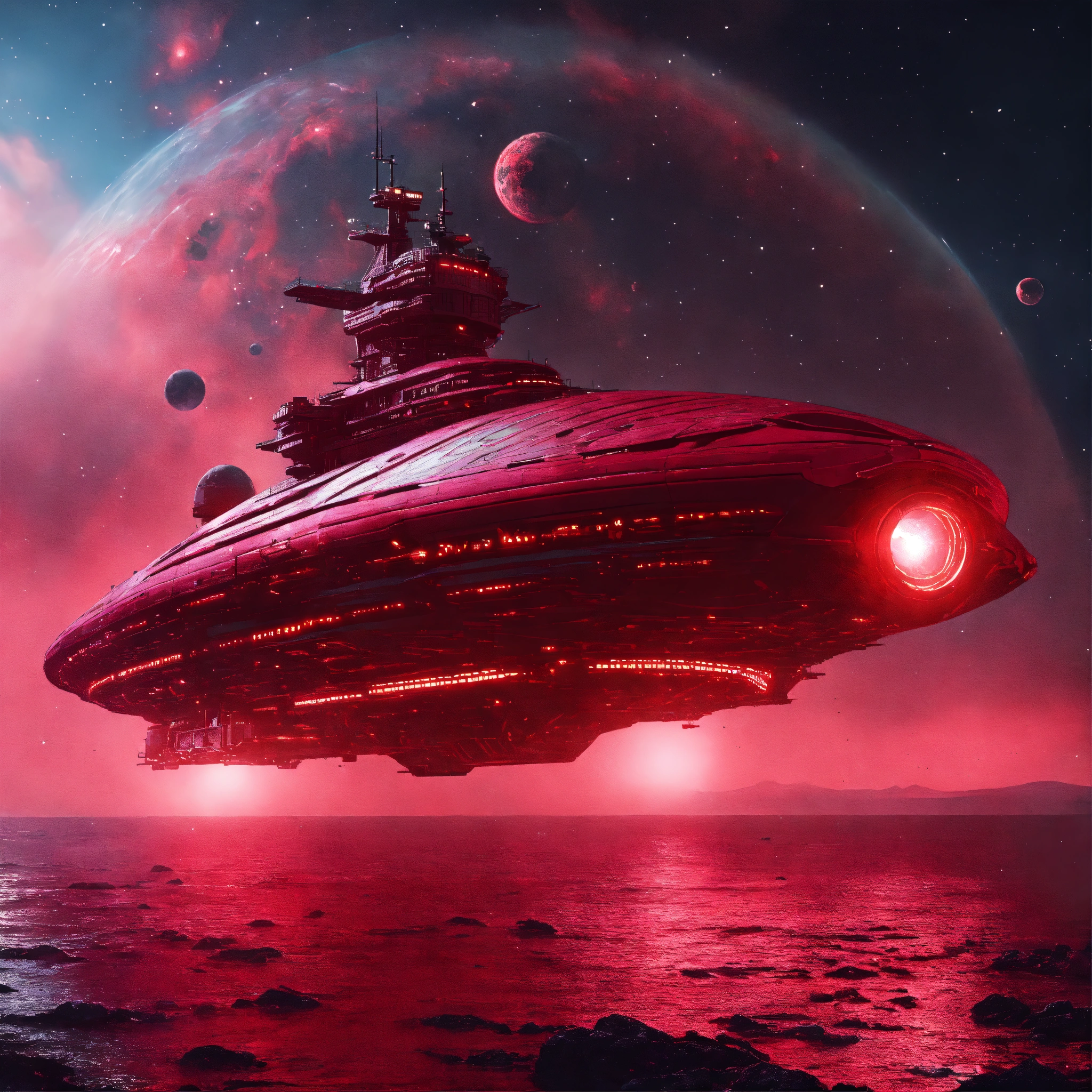 Hostile alien battleship shipping to warp drive with dark ruby red colors
