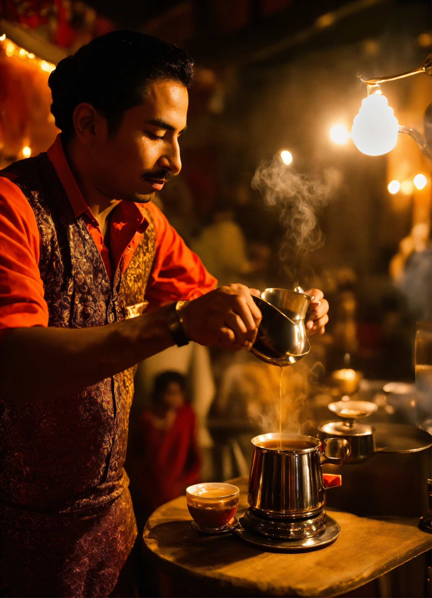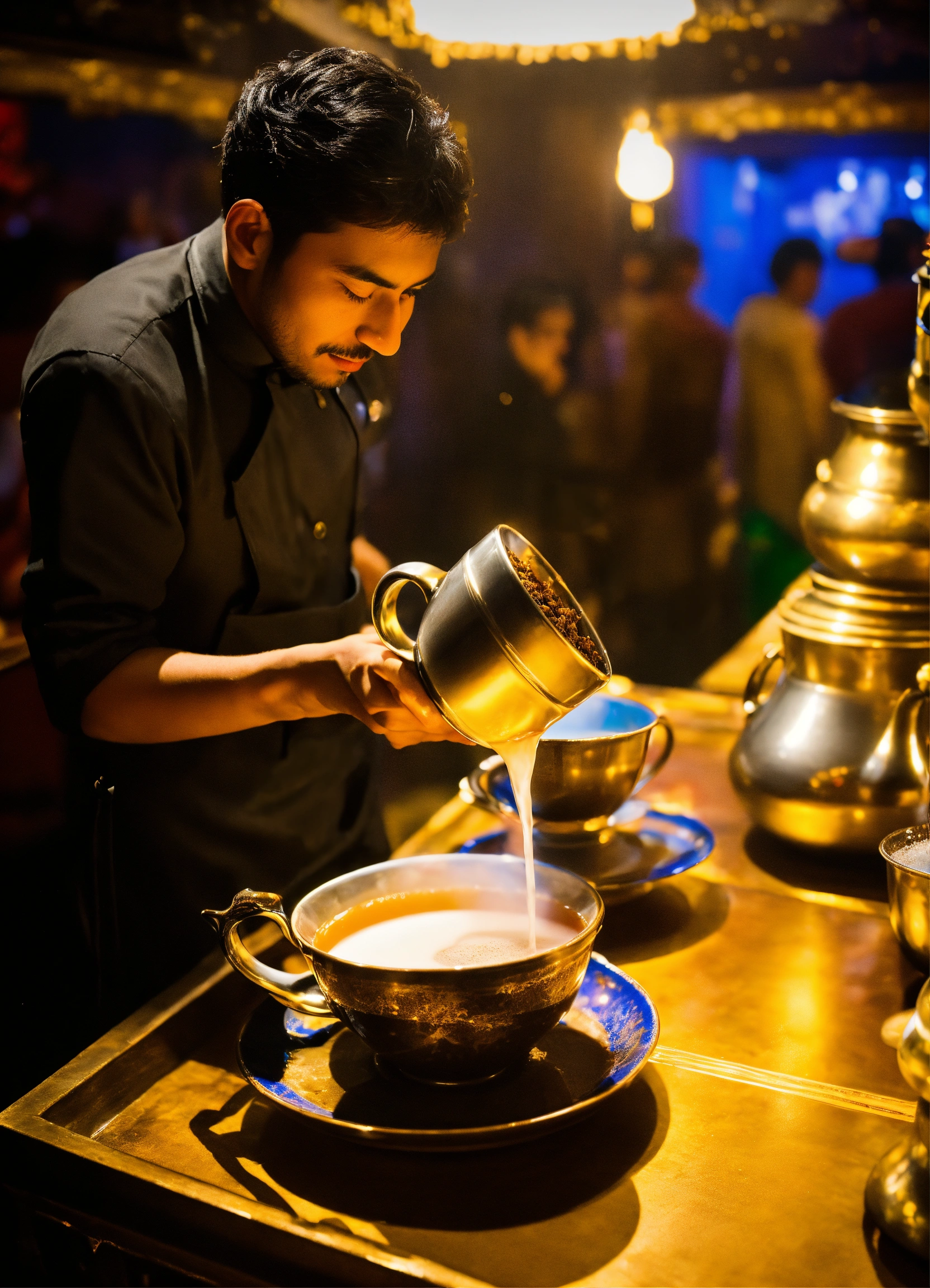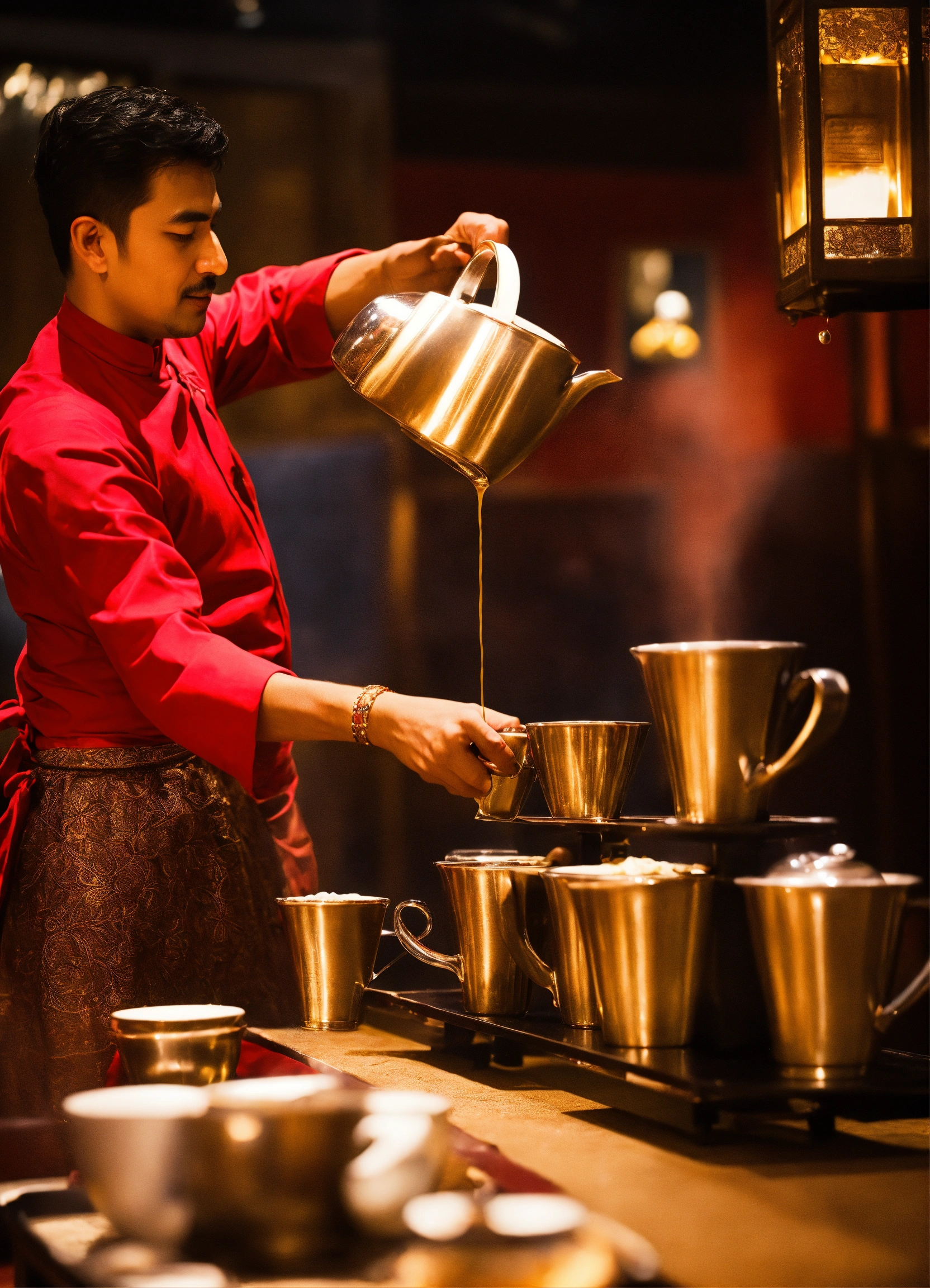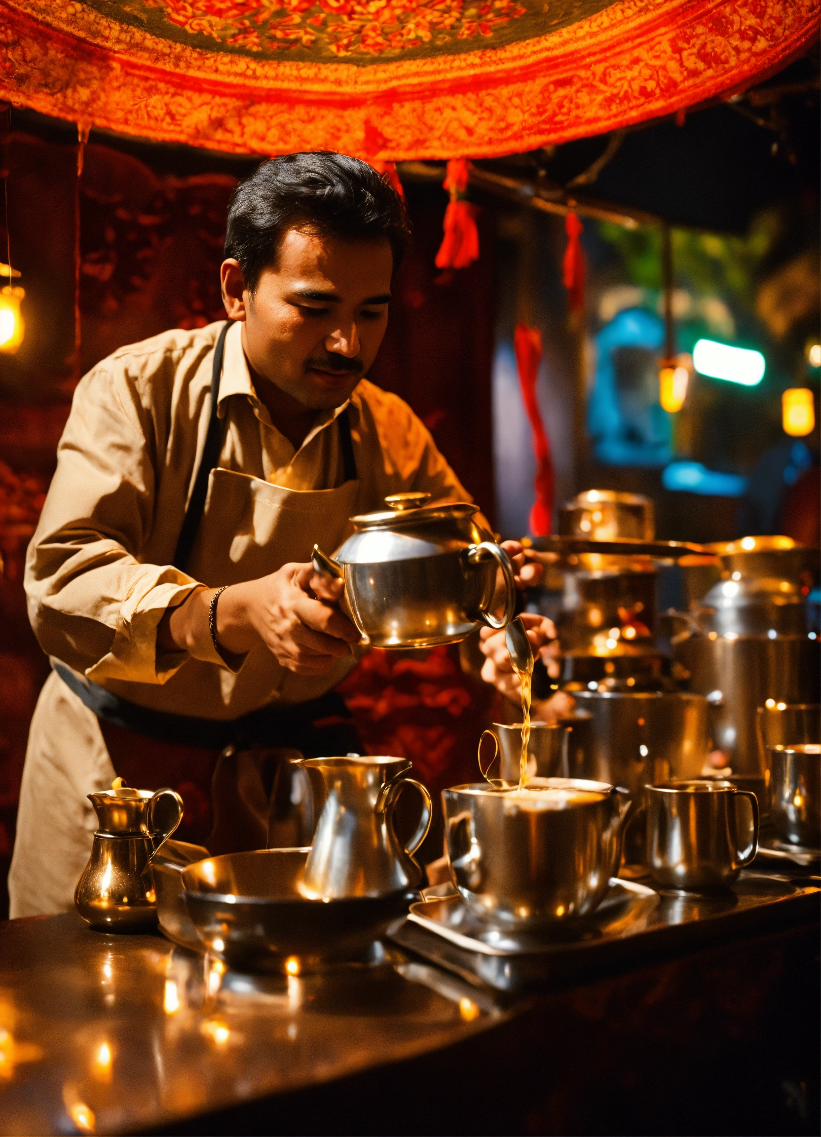 Chai master pouring chai tea from one cup to another cup that is 1 meter away in a theatrical manner, offering a mesmerizing show for diners.