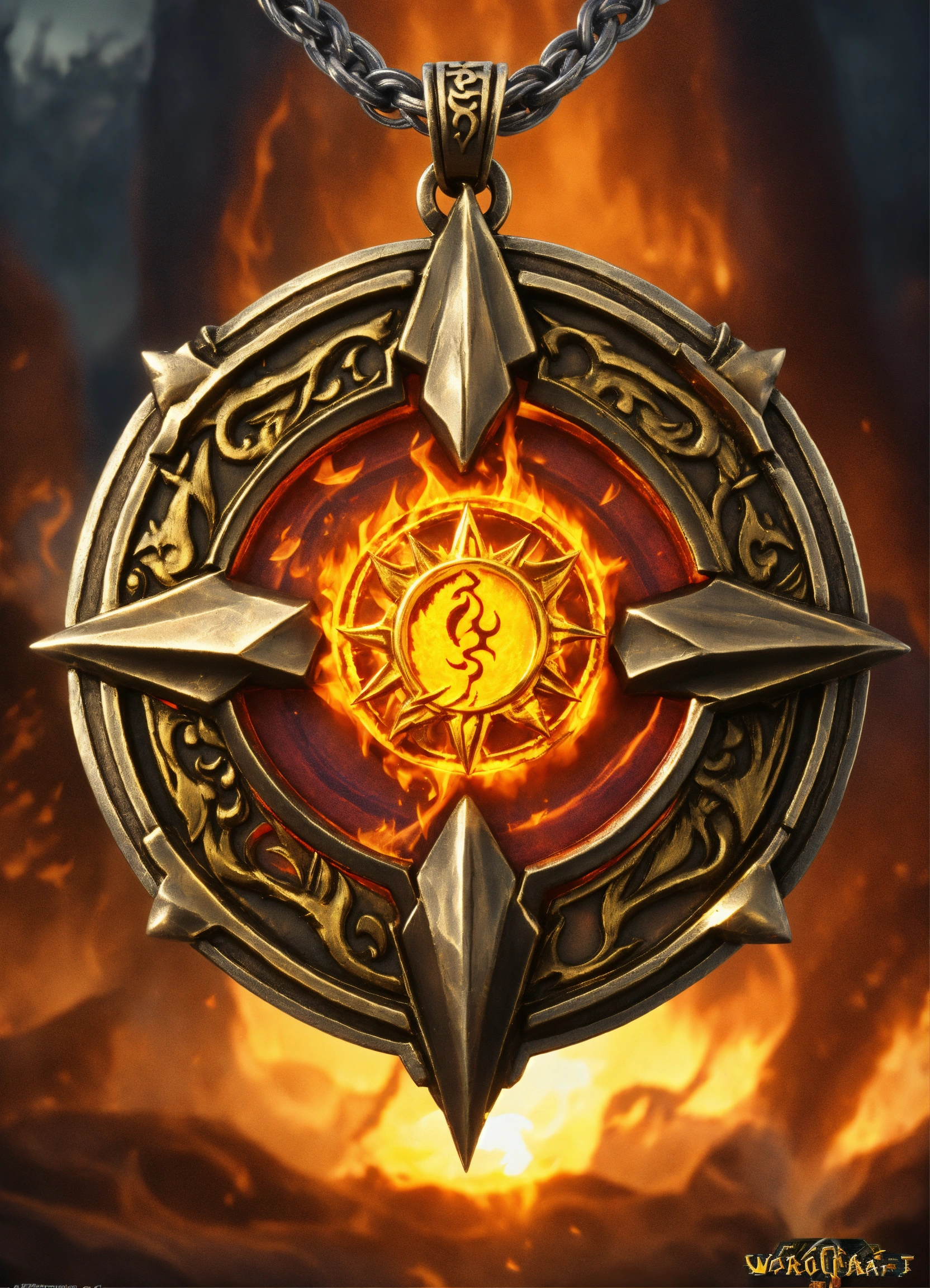 World of warcraft deathwing dragon face on an amulet with a sun on it, medallion, high quality, runic, fire, sun, medallion