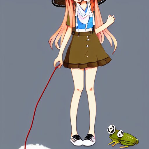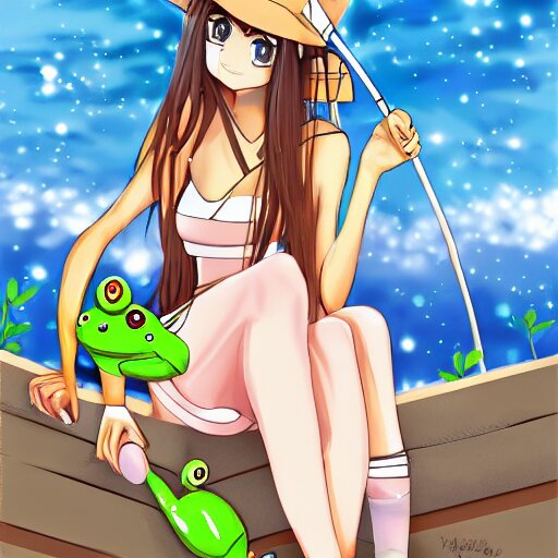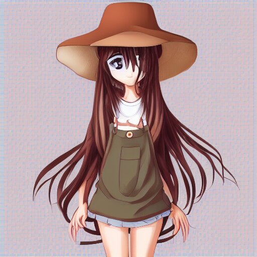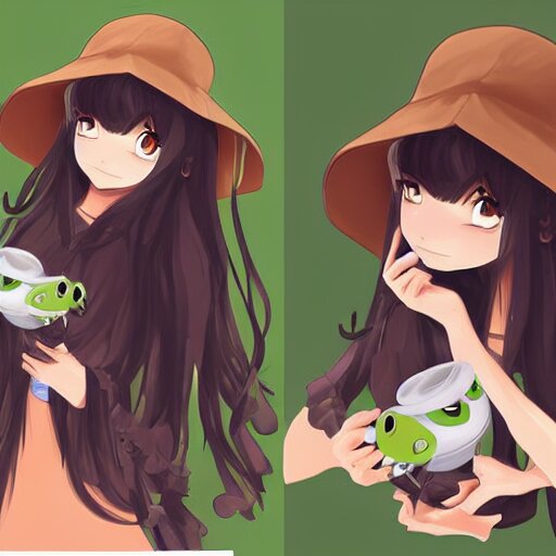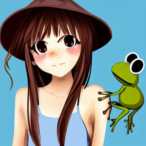 Cute anime girl with long brown hair with a frog bucket hat