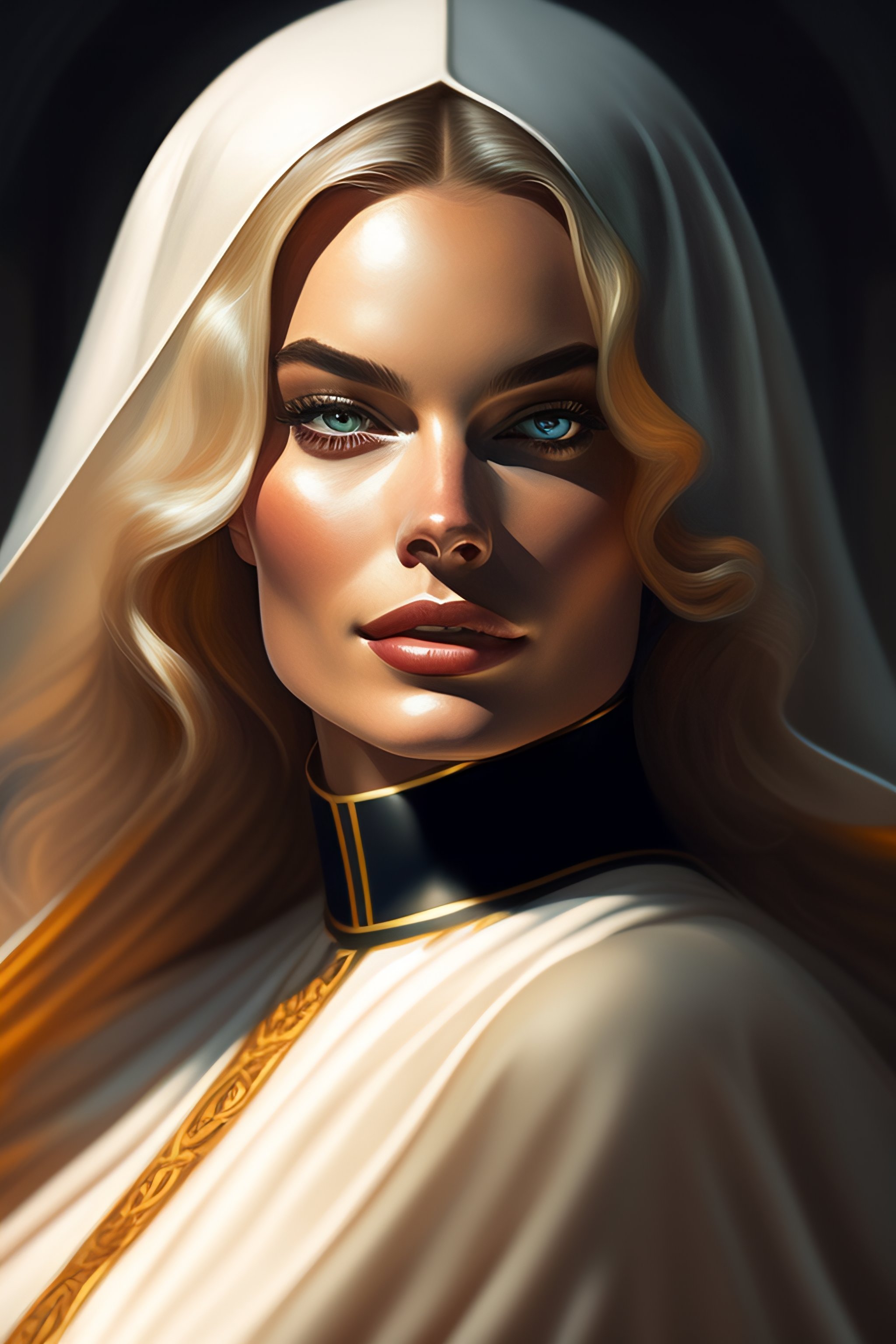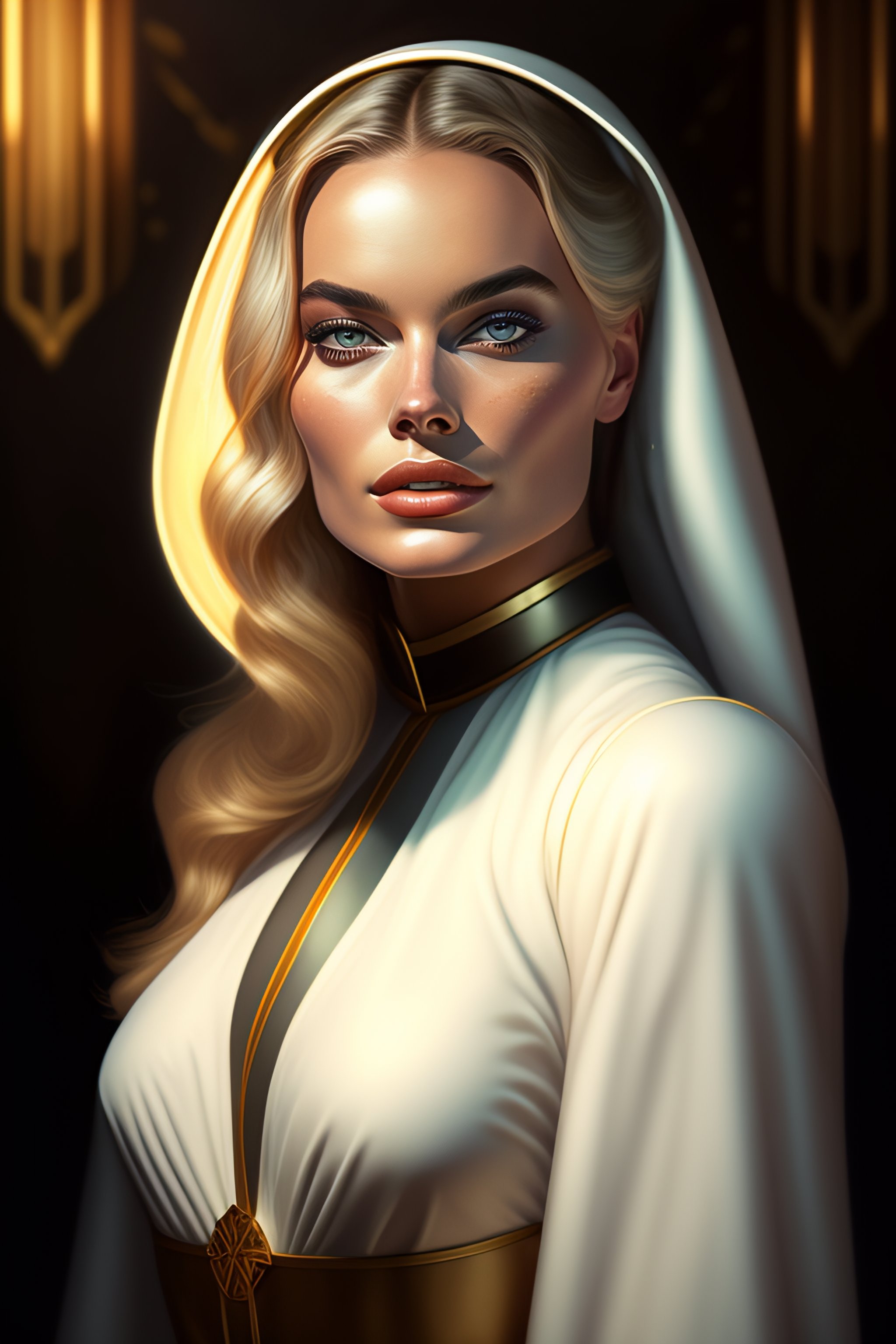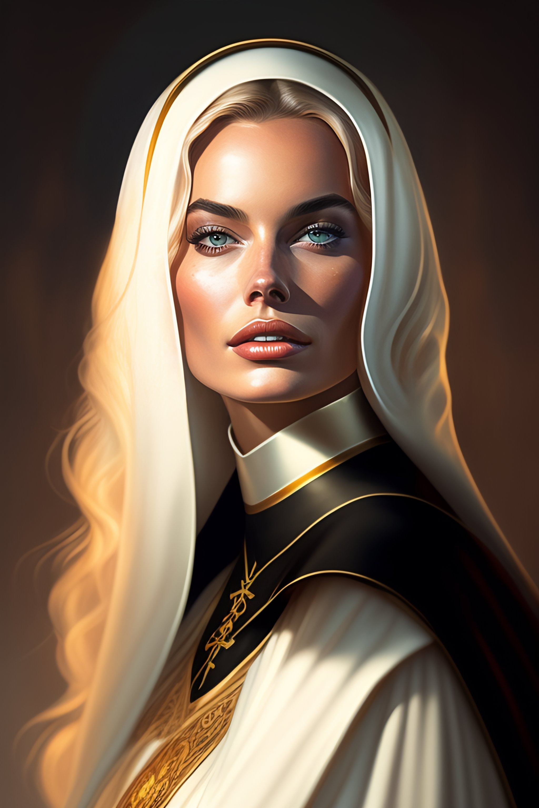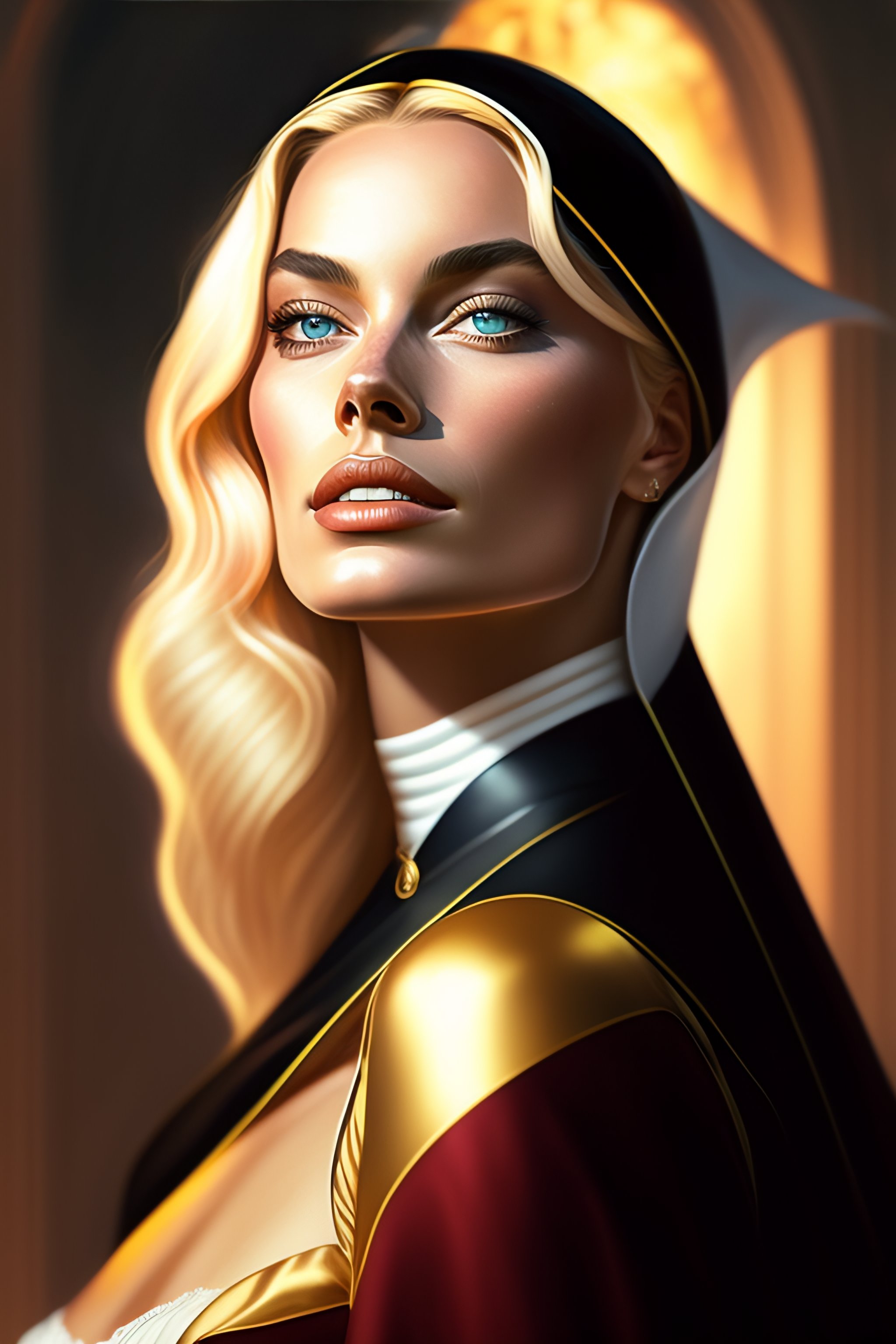 Portrait of margot robbie as a sexy nun, catholic, church, bible, christian, intrigante, headshot, highly detailed, digital painting, artstation, concept art, sharp focus, cinematic lighting, illustration, art by artgerm and greg rutkowski, alphonse mucha, cgsociety