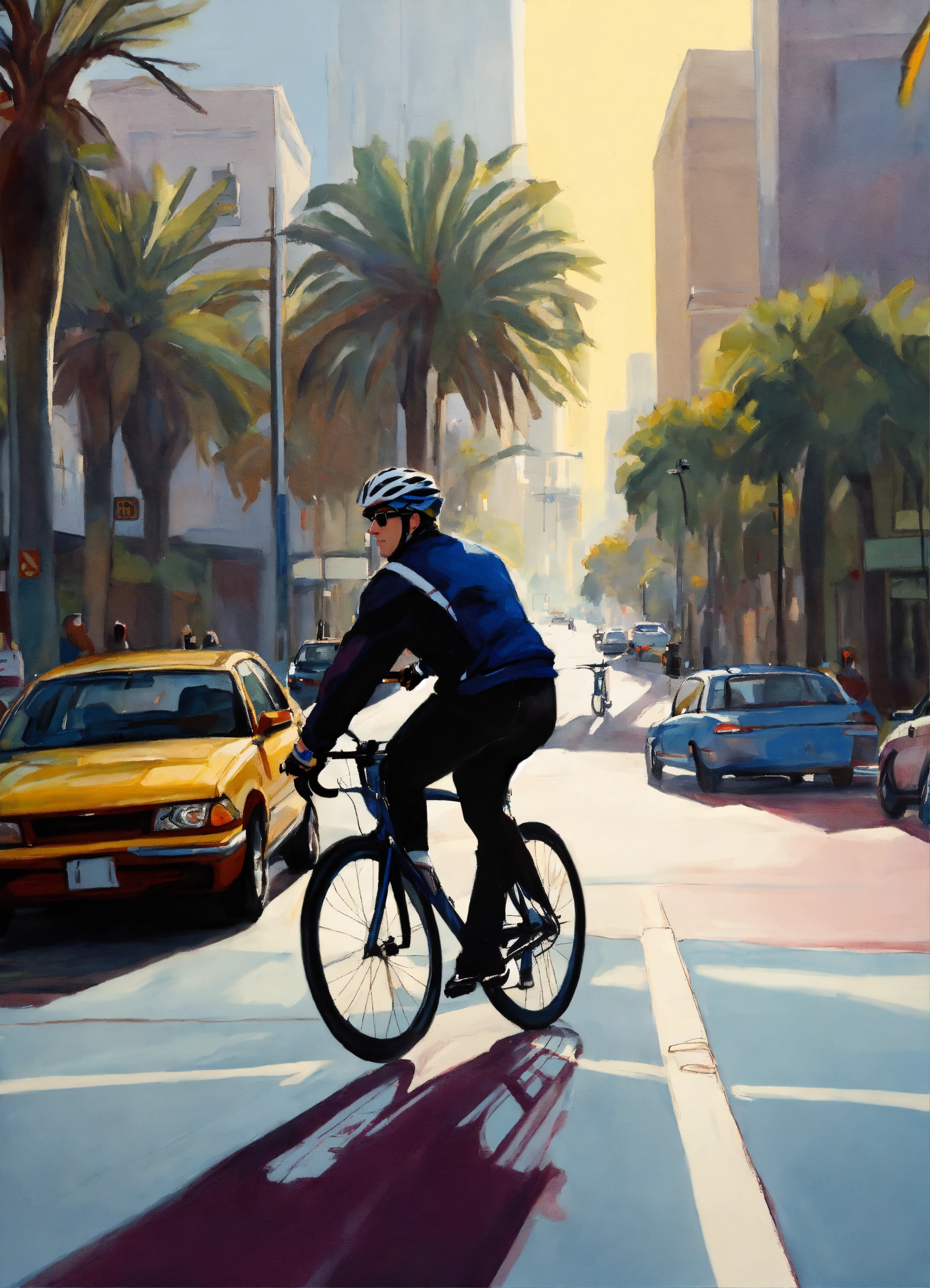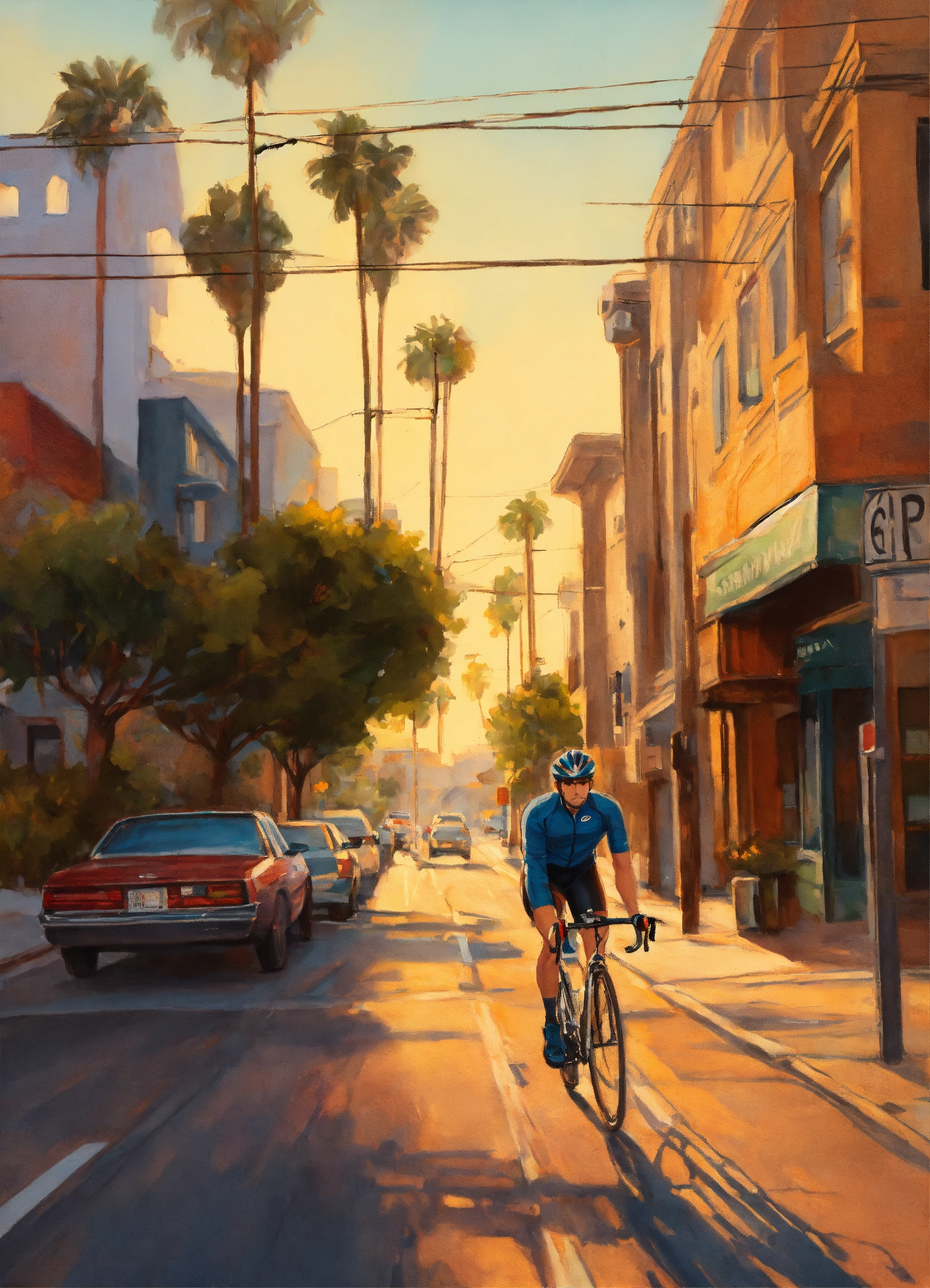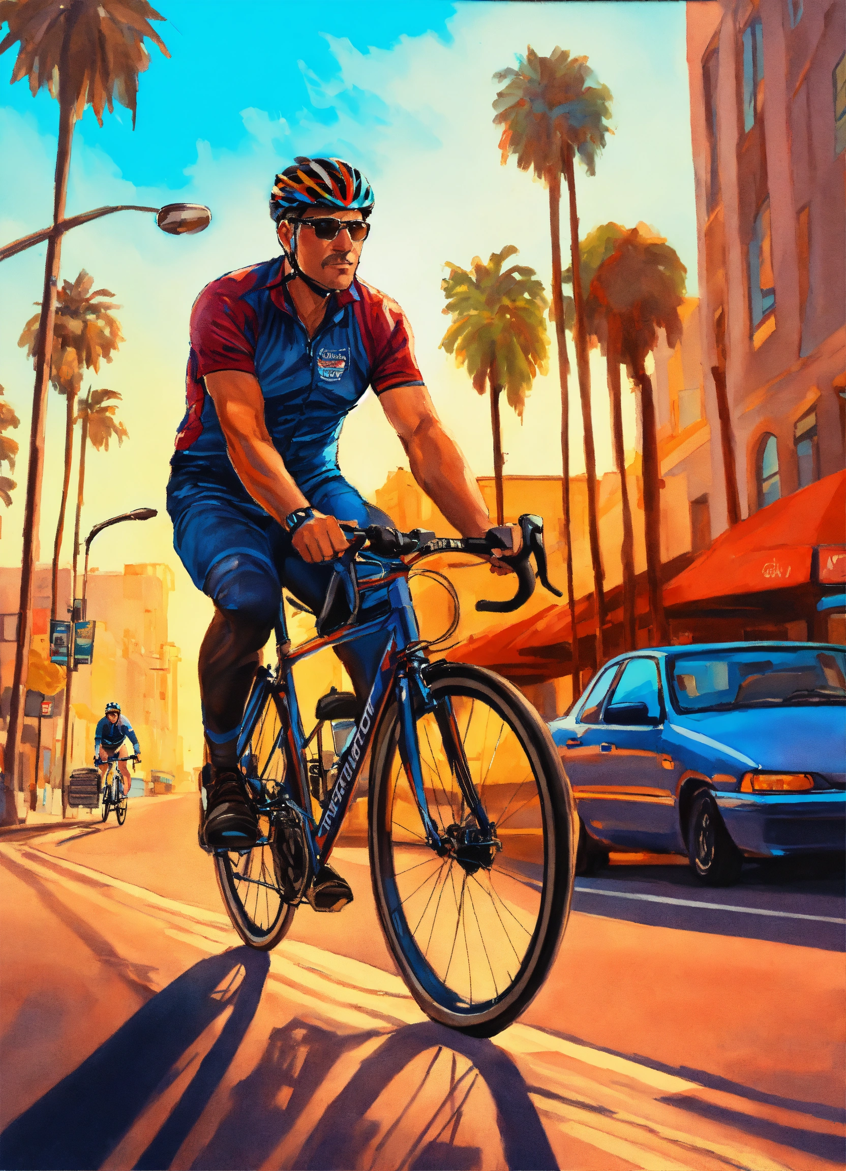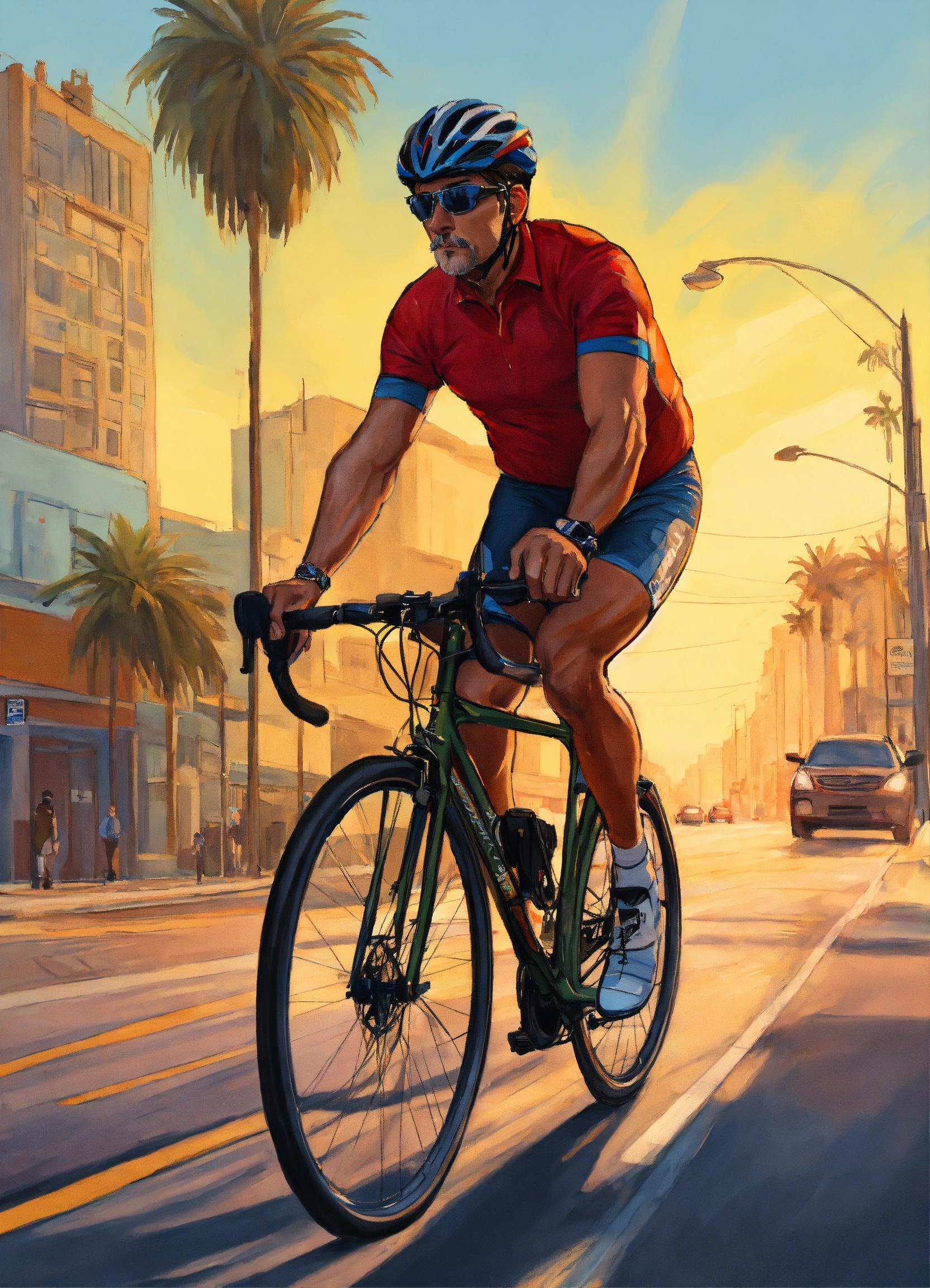 A hand drawn painting of a fit looking american gentleman in his late fifties cycling through the streets of san diego, california in the morning, there are only a few vehicles on the road and the morning is making the scene beautiful. 8k, wide-angle, sharp, highly detailed, vibrant, vivid.