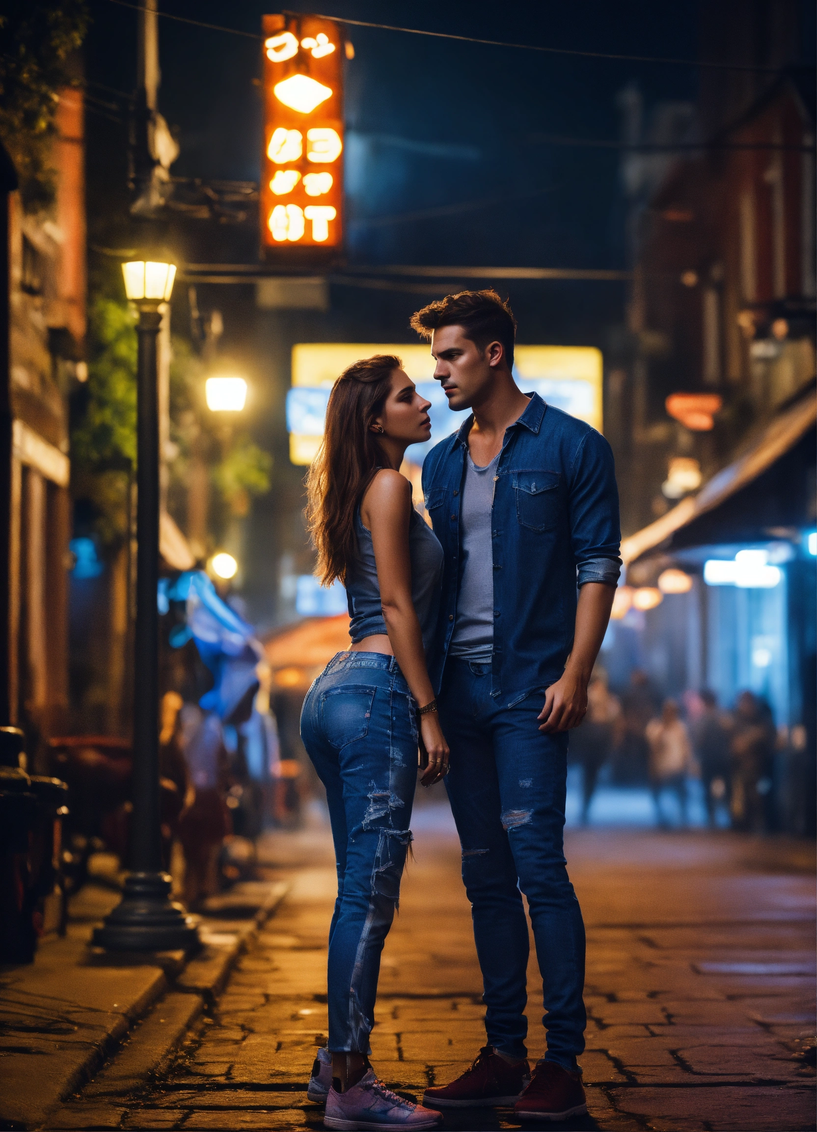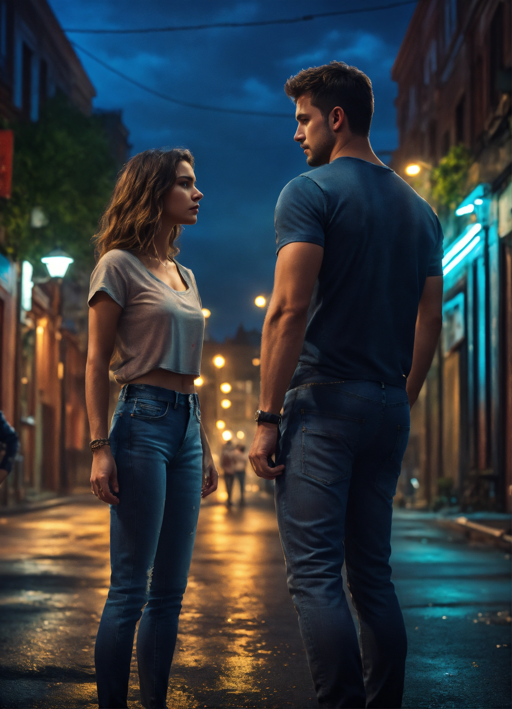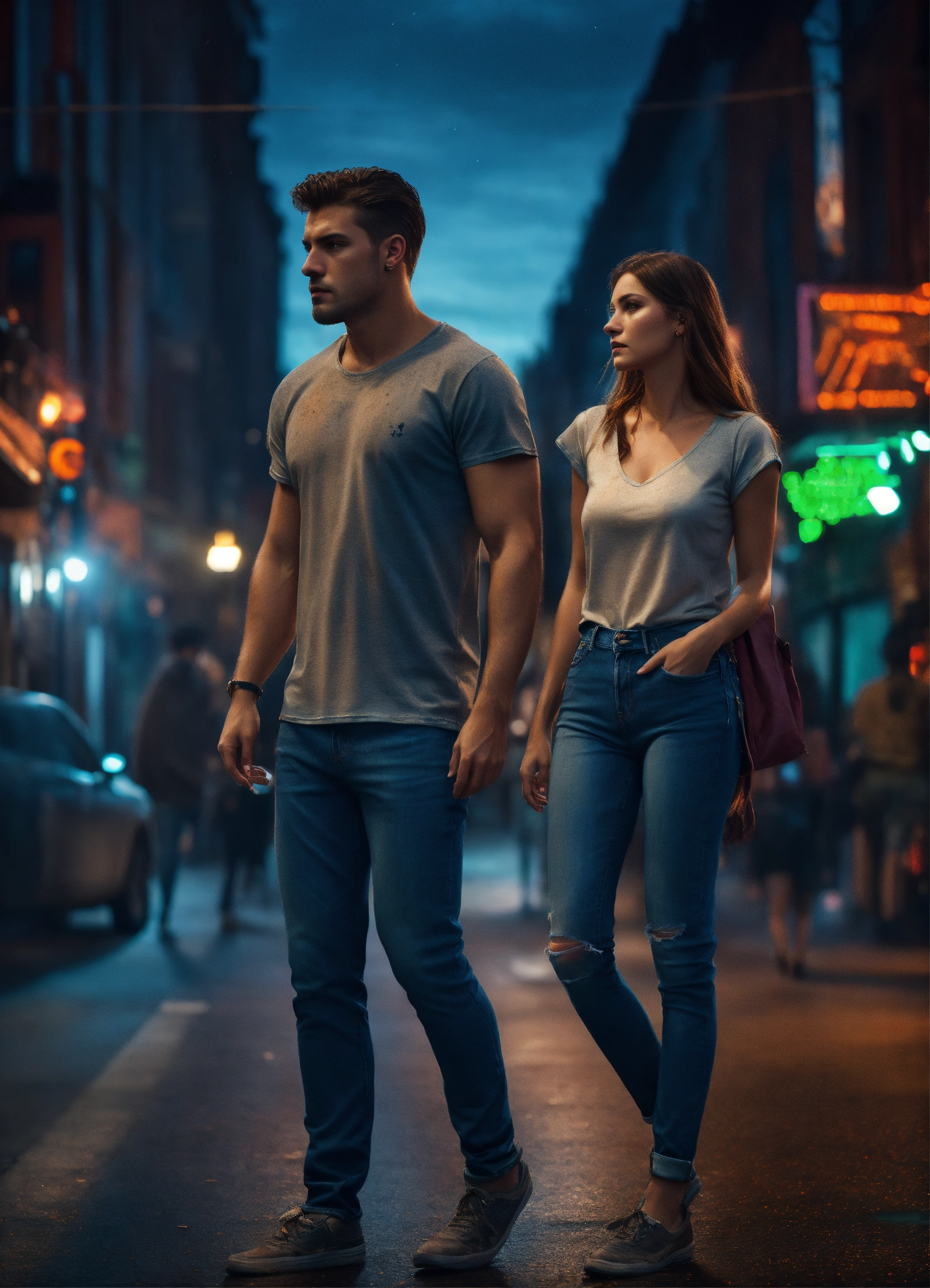 A beautiful girl in a t-shirt and jeans and a beautiful man stare angrily at each other on a night city street, mystic, dark fantasy, realistic photo, high detail, digital painting, cinematic, stunning, hyper-realistic, sharp focus, high resolution 8k, insanely detailed