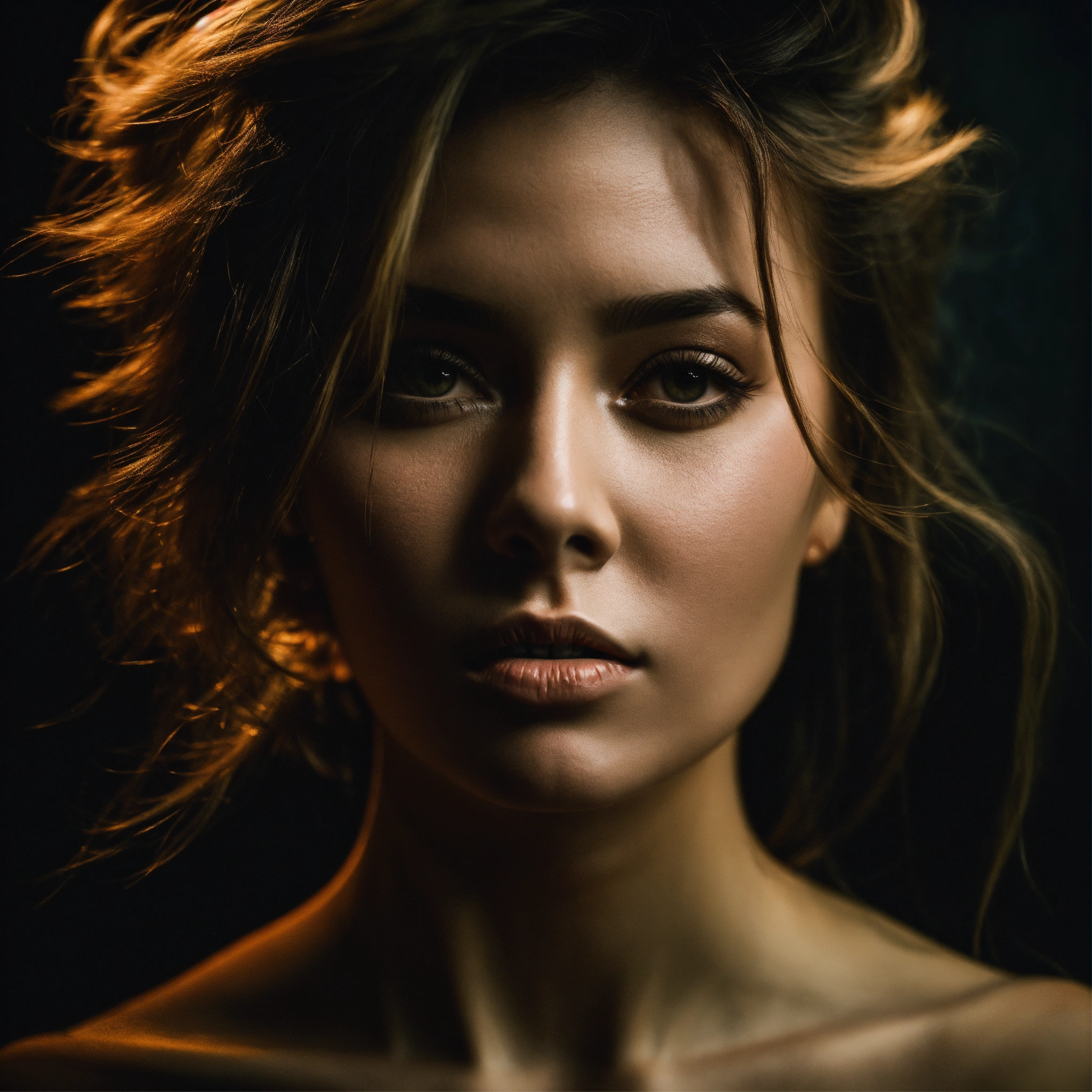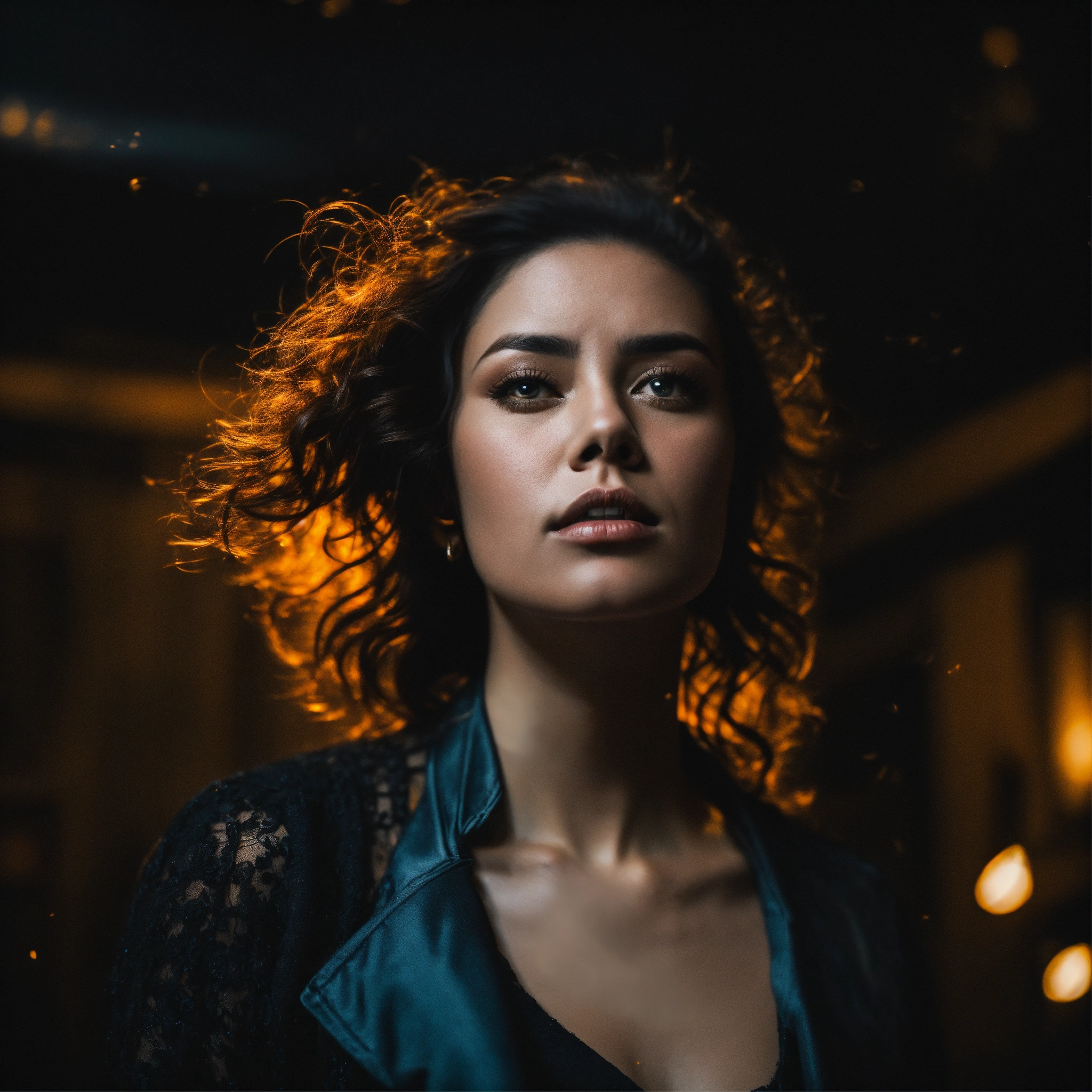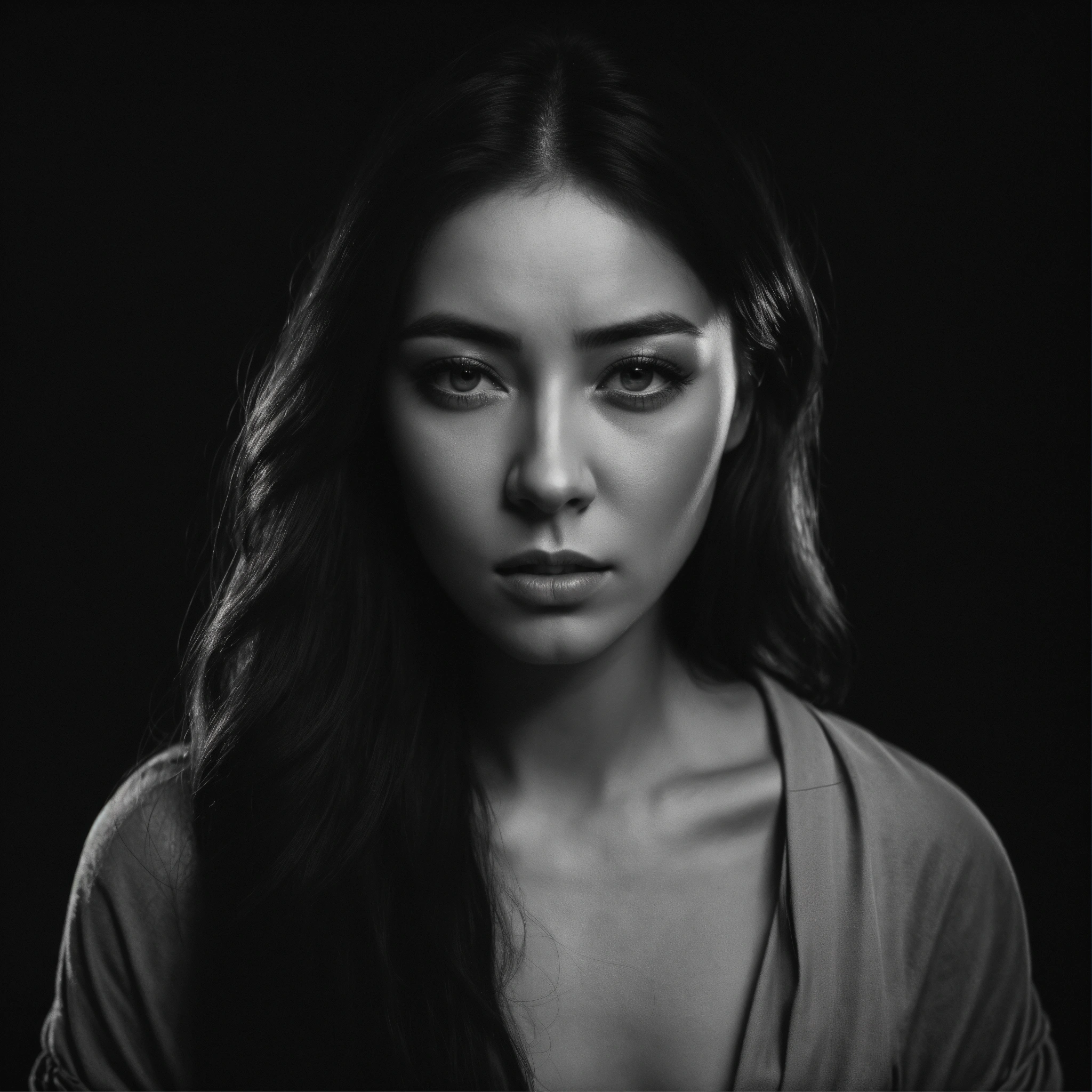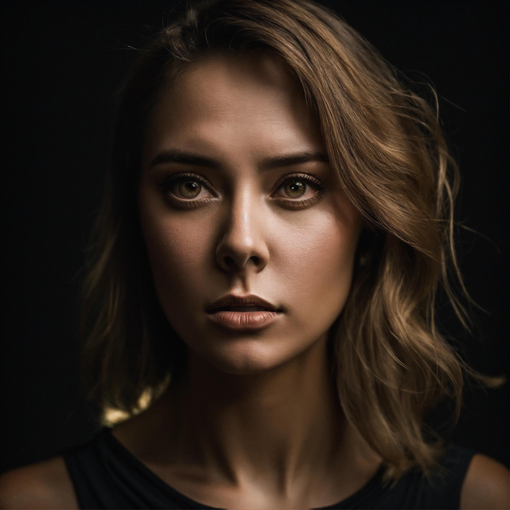We see a woman from the waist up, this woman raised her eyes up, there is an emotion of confusion on the woman’s face, there is a lot of black space around, black background