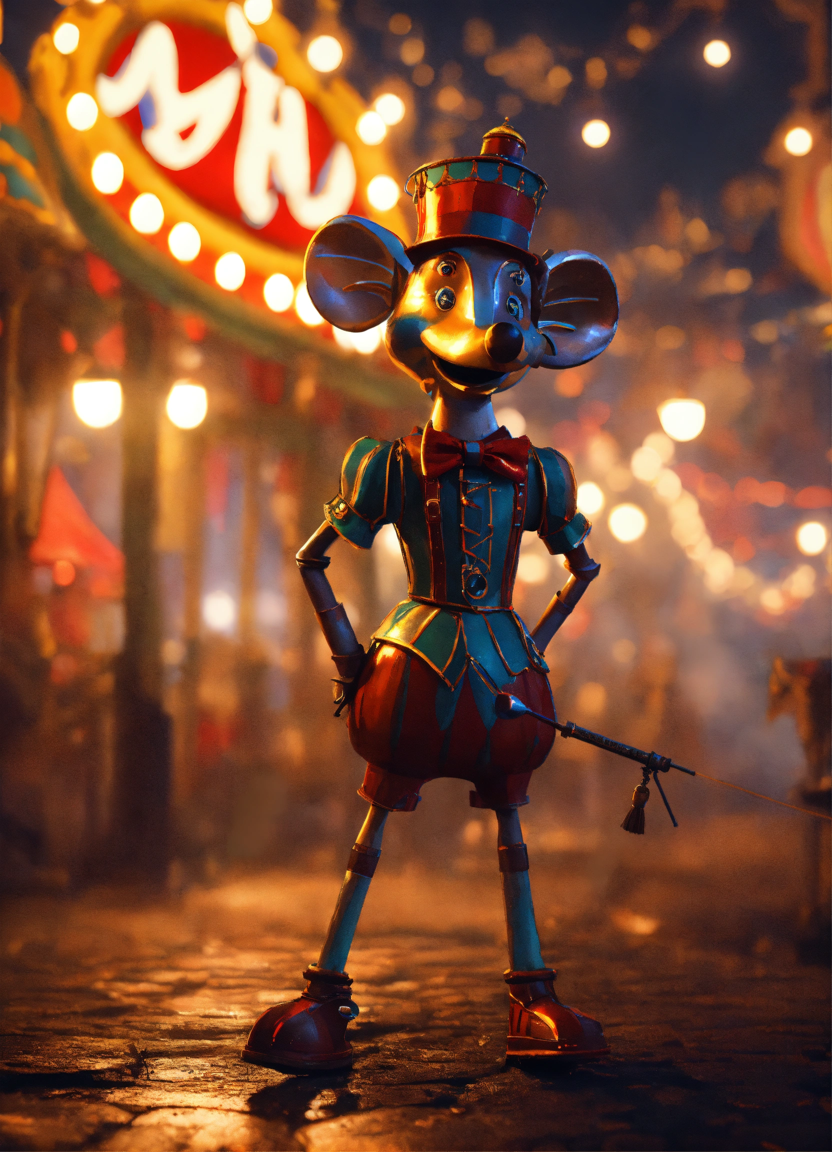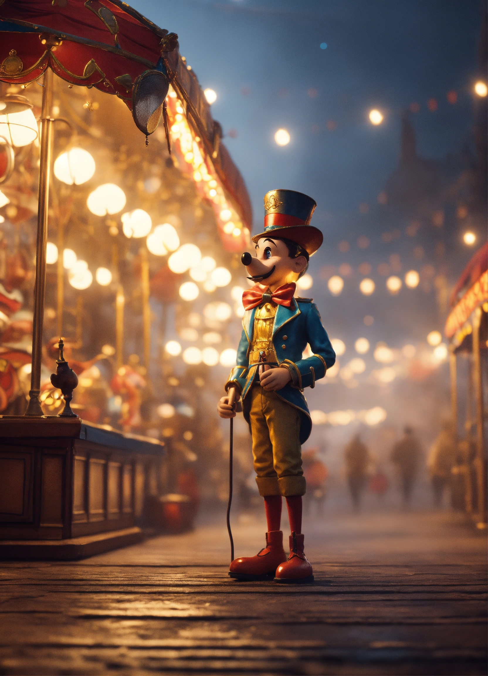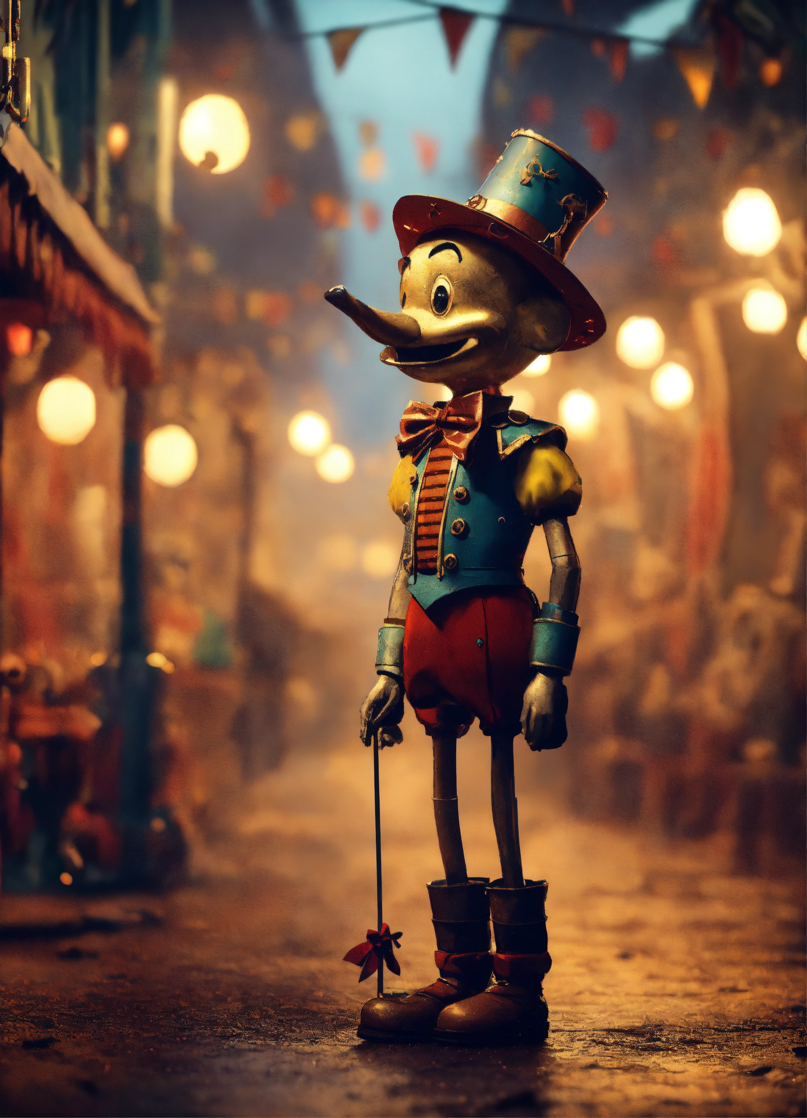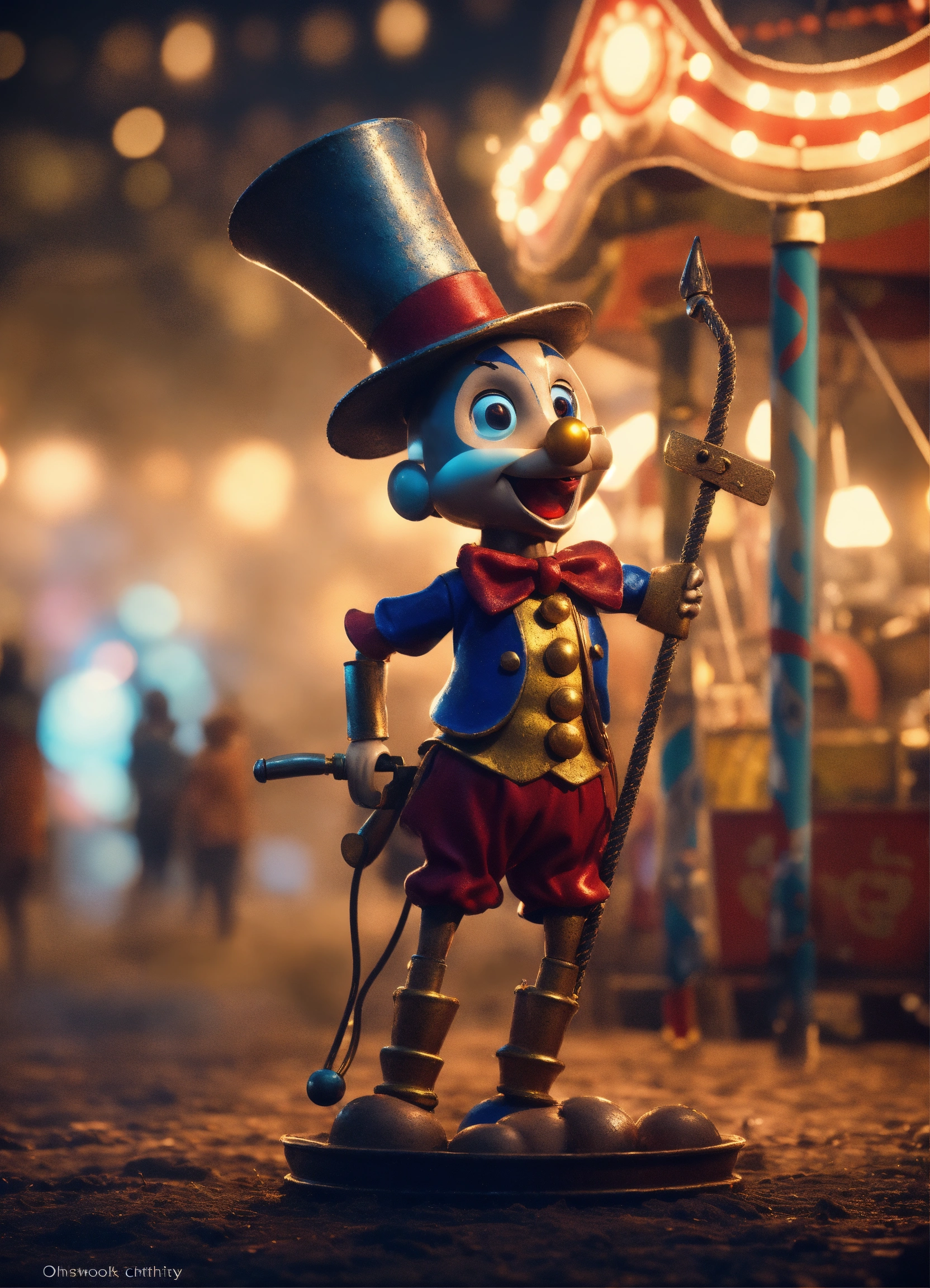 Pinocchio made of metal, vintage circus carnival, foggy weather, night light, intricate, sharf focus, concept art, artstation, fantasy, octane render, cinematic lighting, otherworldy