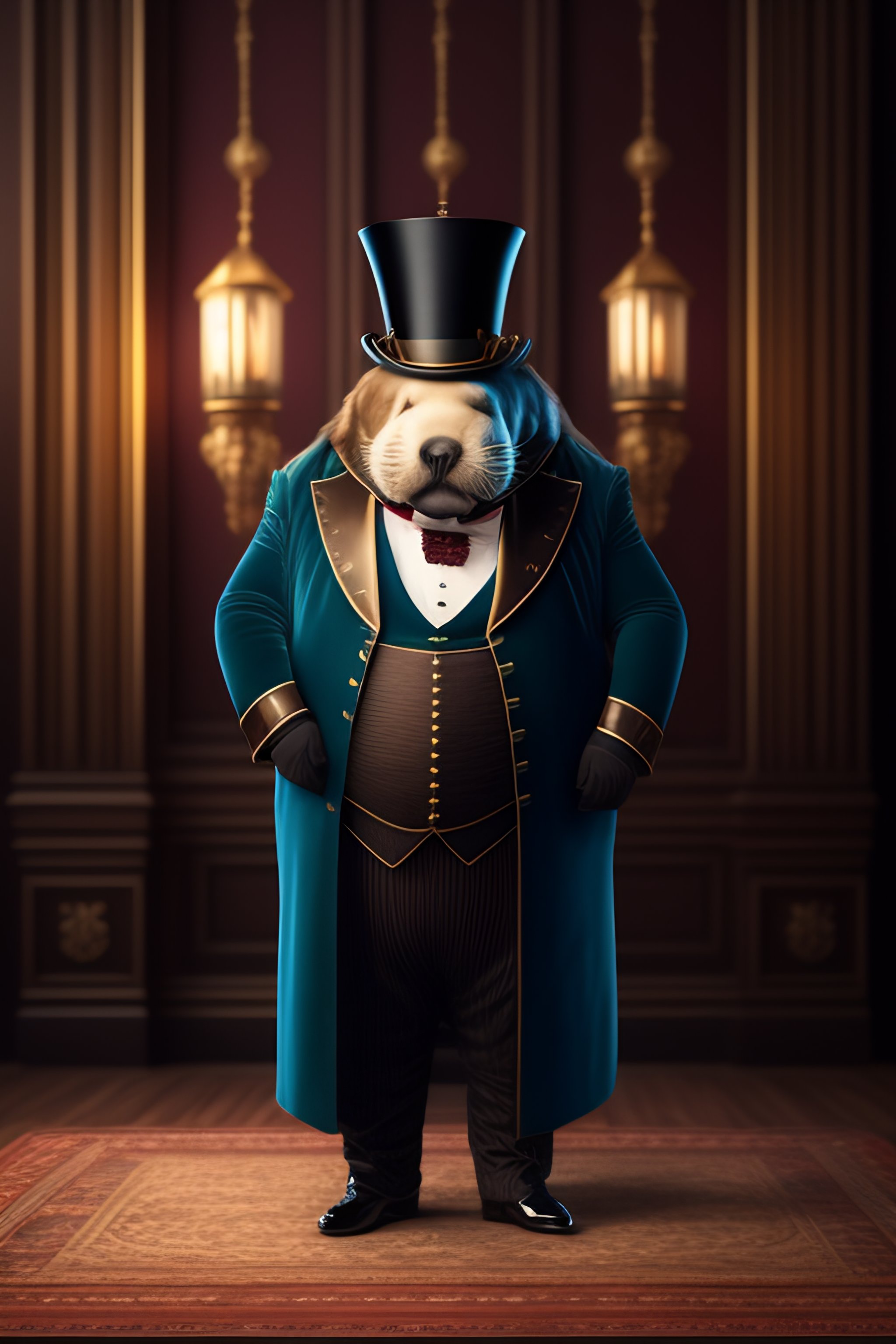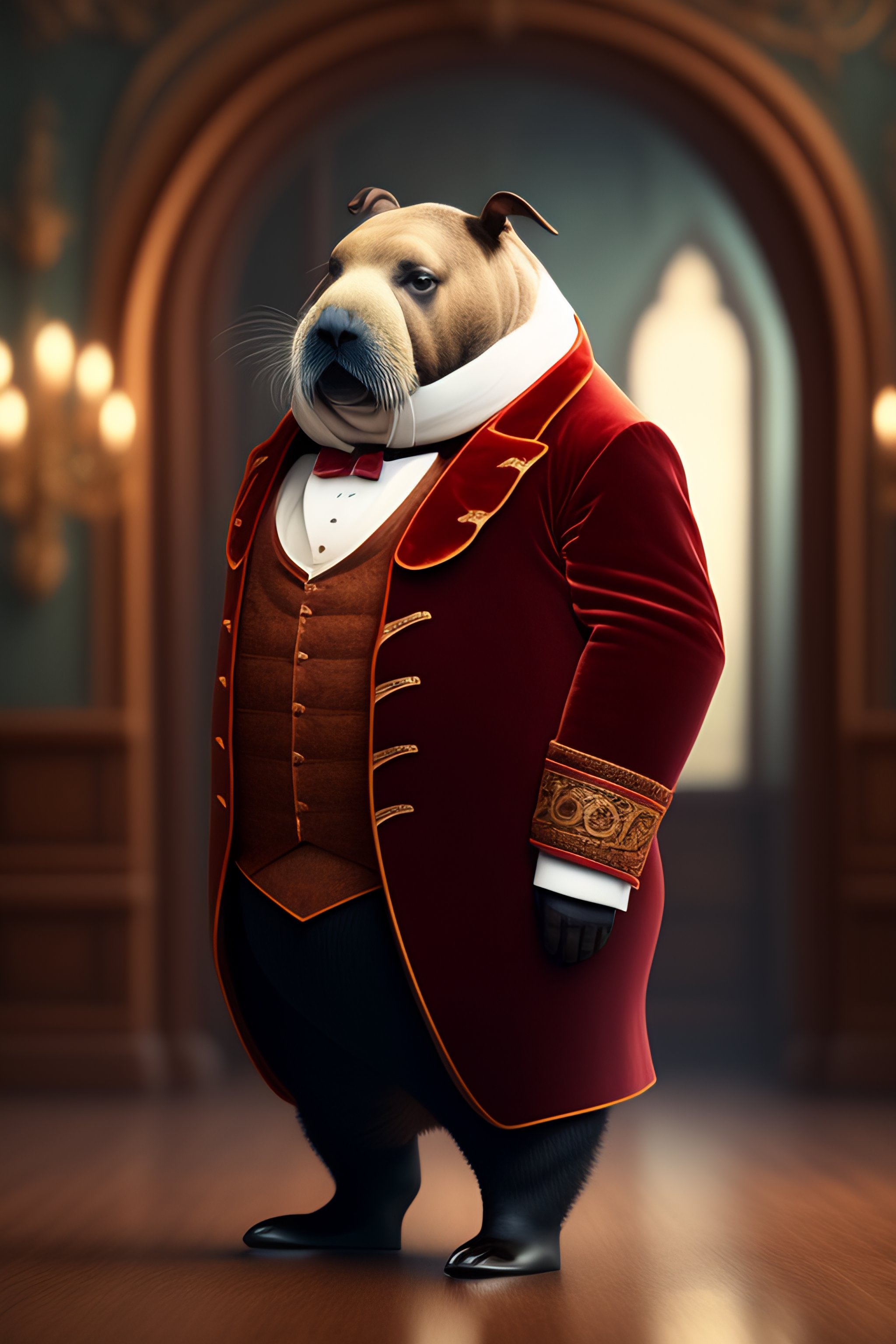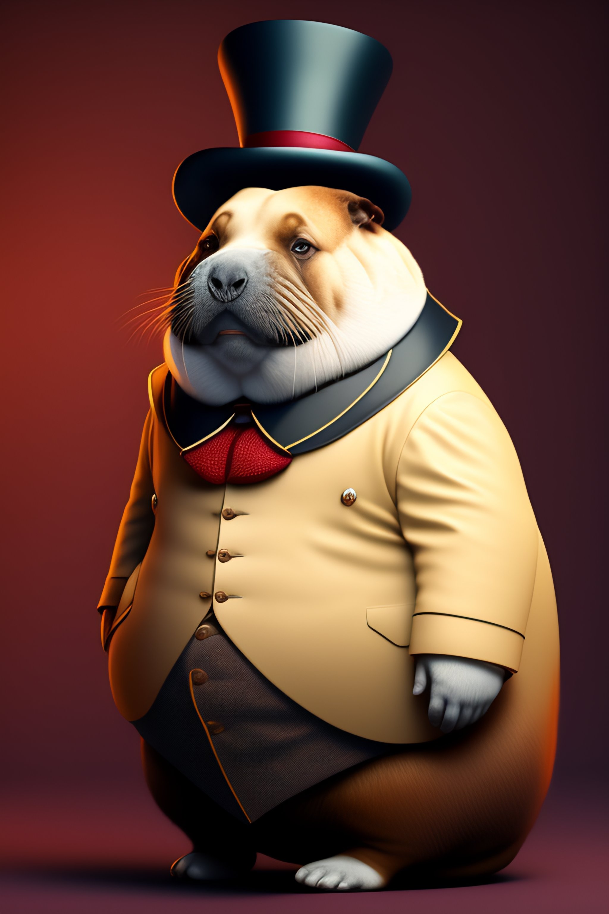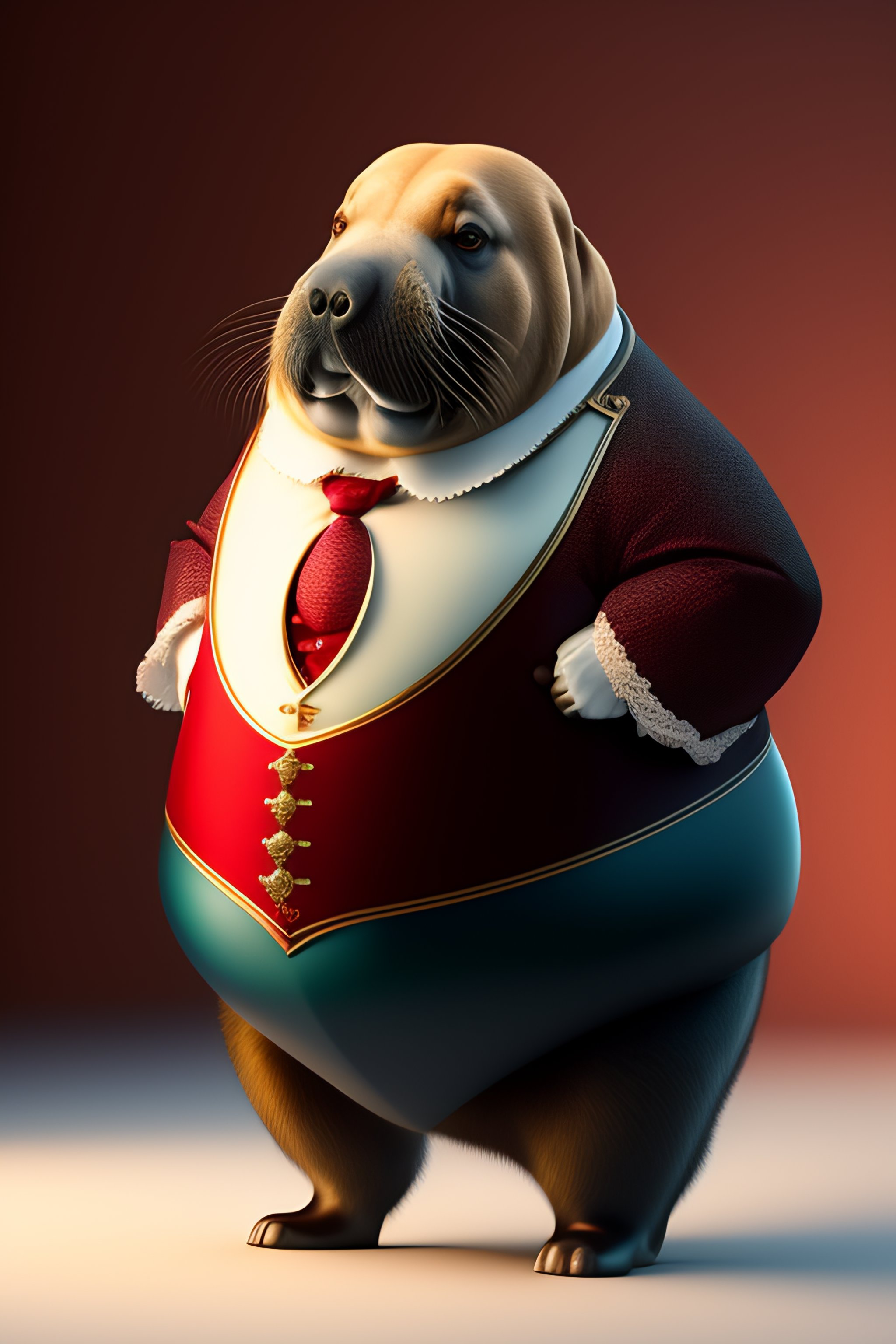 Anthropomorphic figure of the walrus from allice in wonderland, wearing victorian gentleman clothes, noble bearing, full body, in the style of john tenniel, clear light background, cinematic lighting, centerred view, computer generated 3d character, realistic render, 4k, high detail