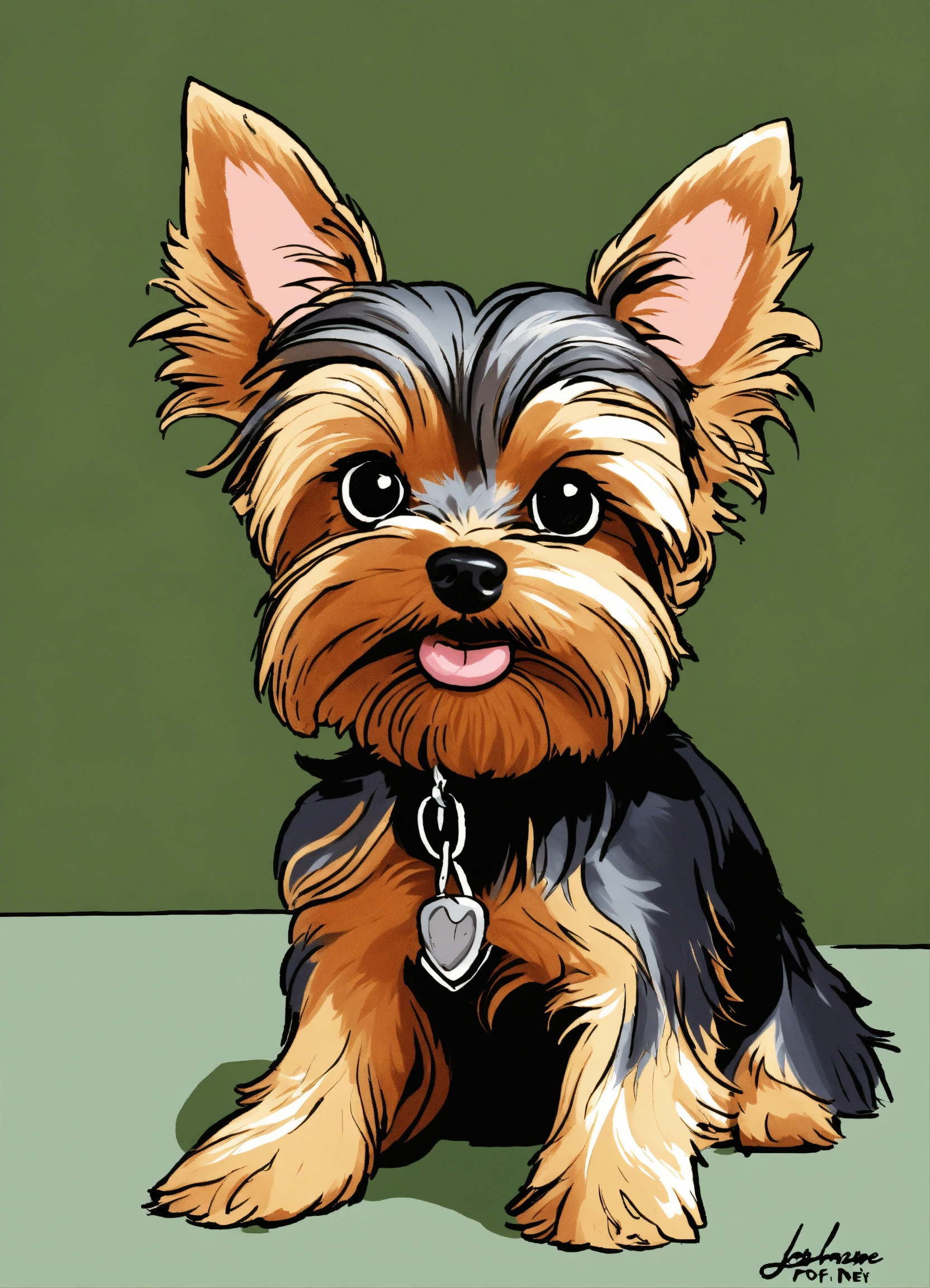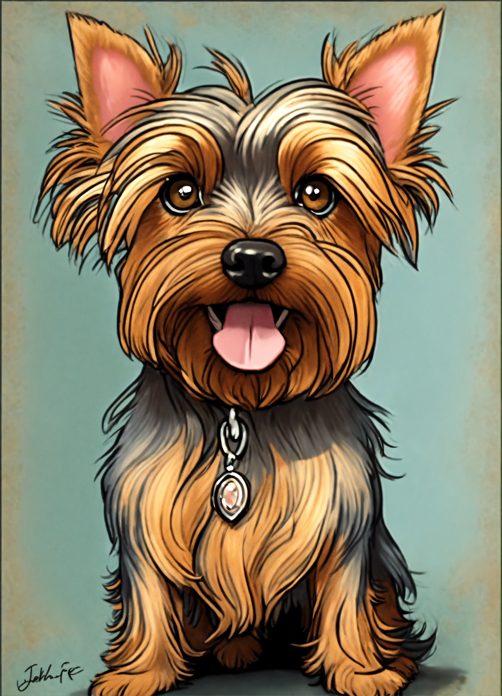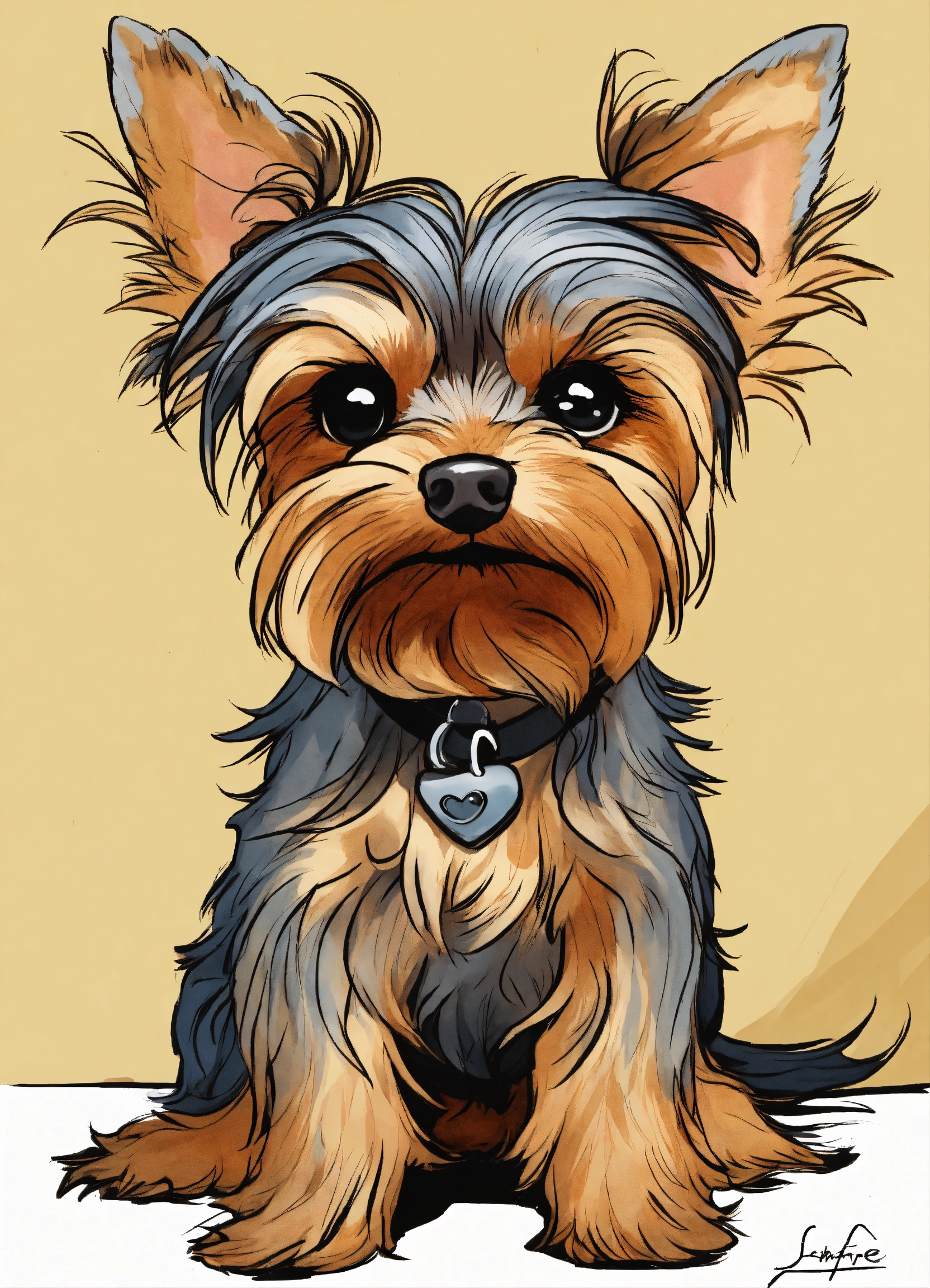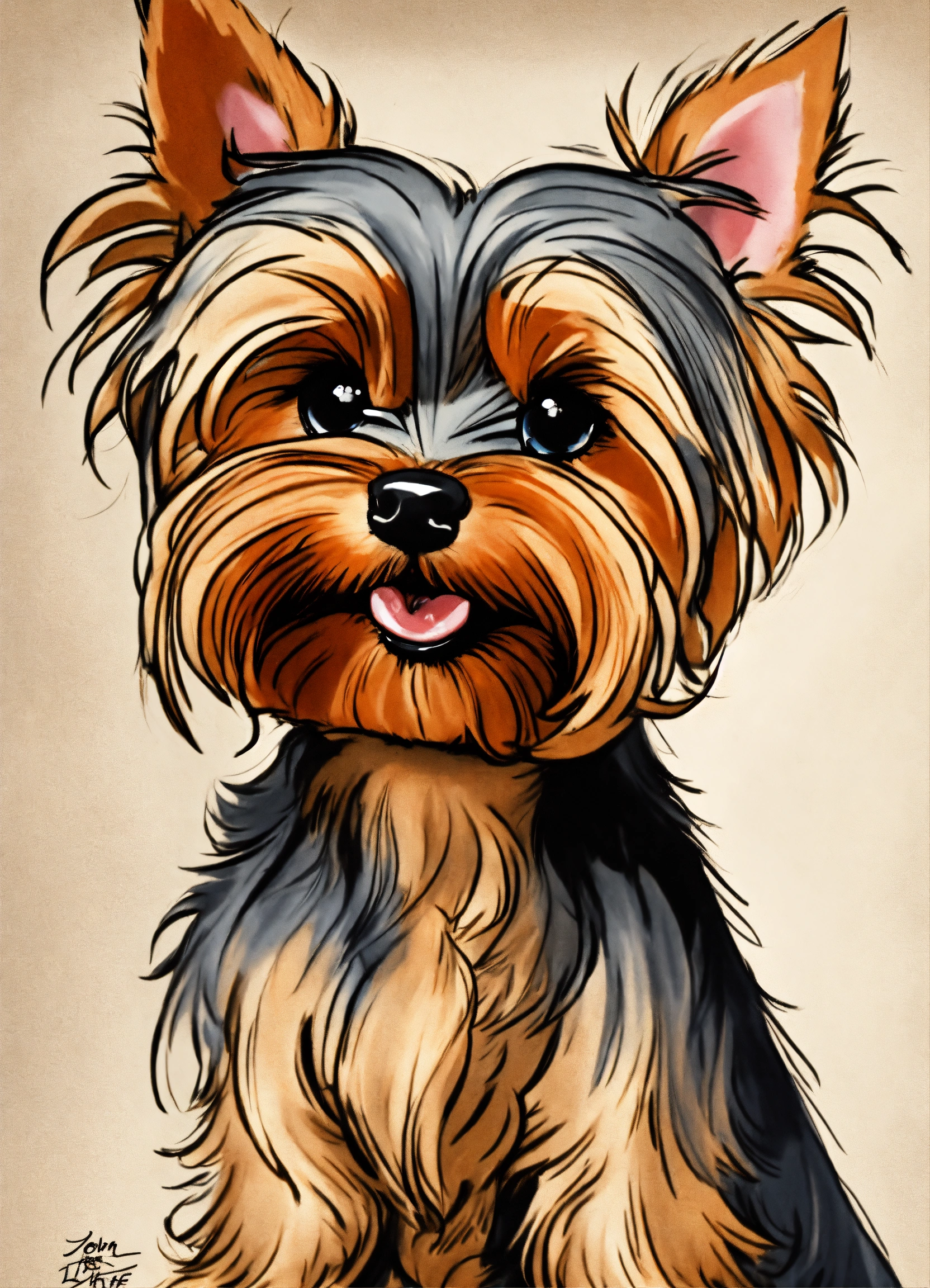A cartoon caricature drawing, of a life like yorkshire terrier, full body large nose, large eyes, thin neck, cacciapuoti, john lafree