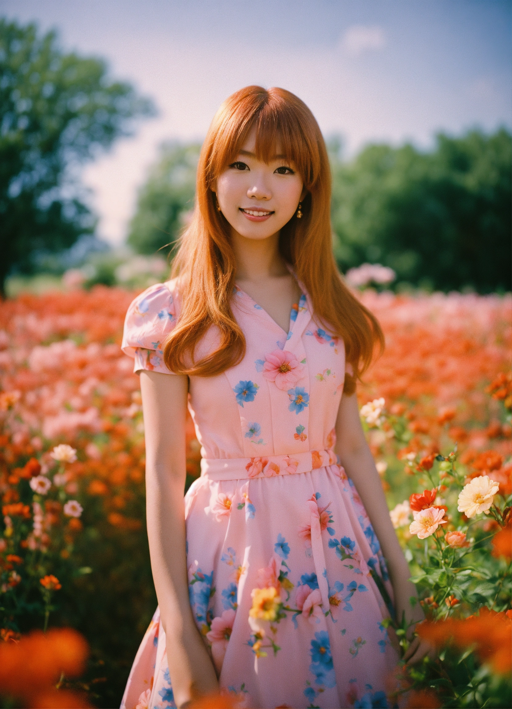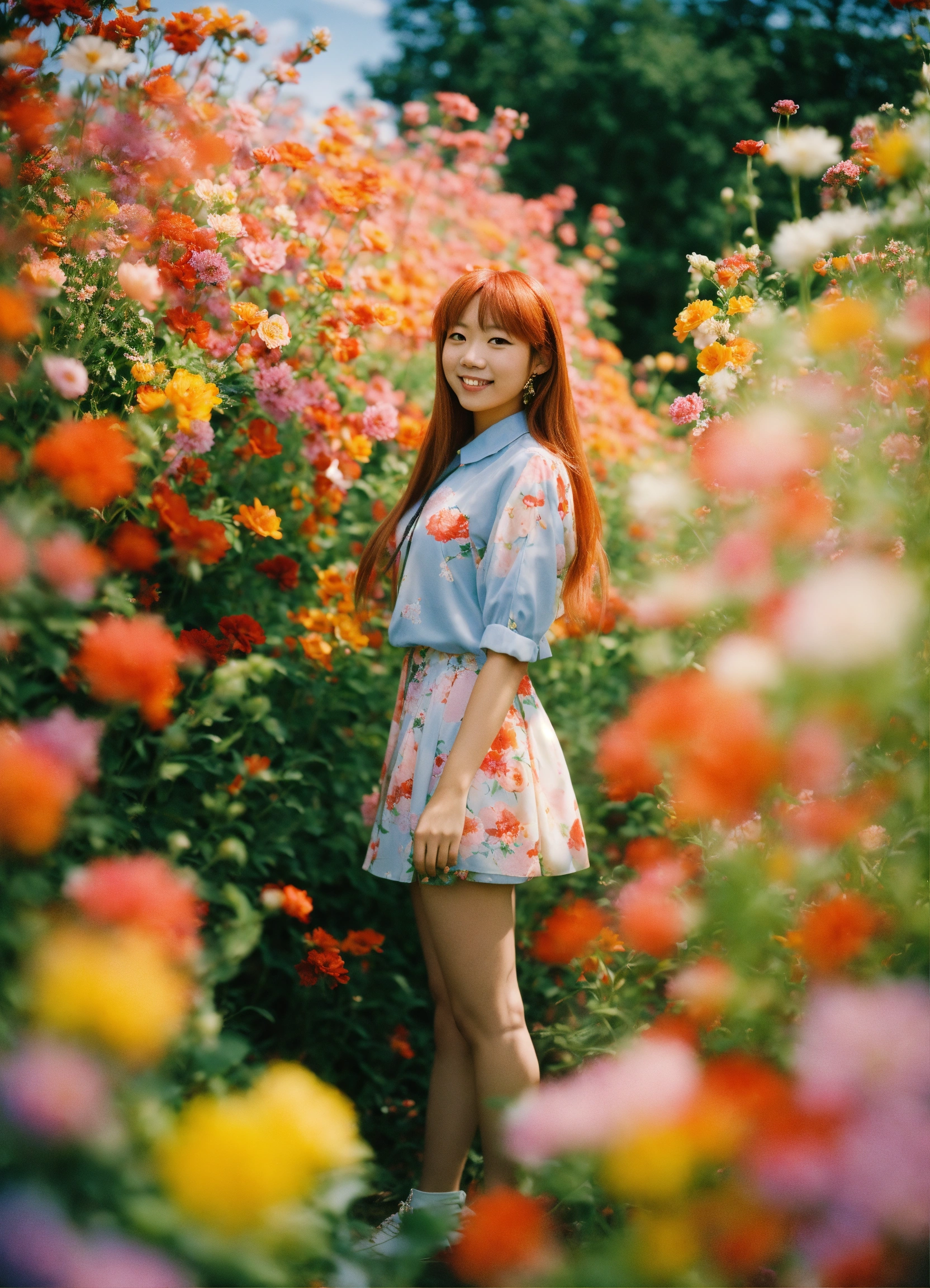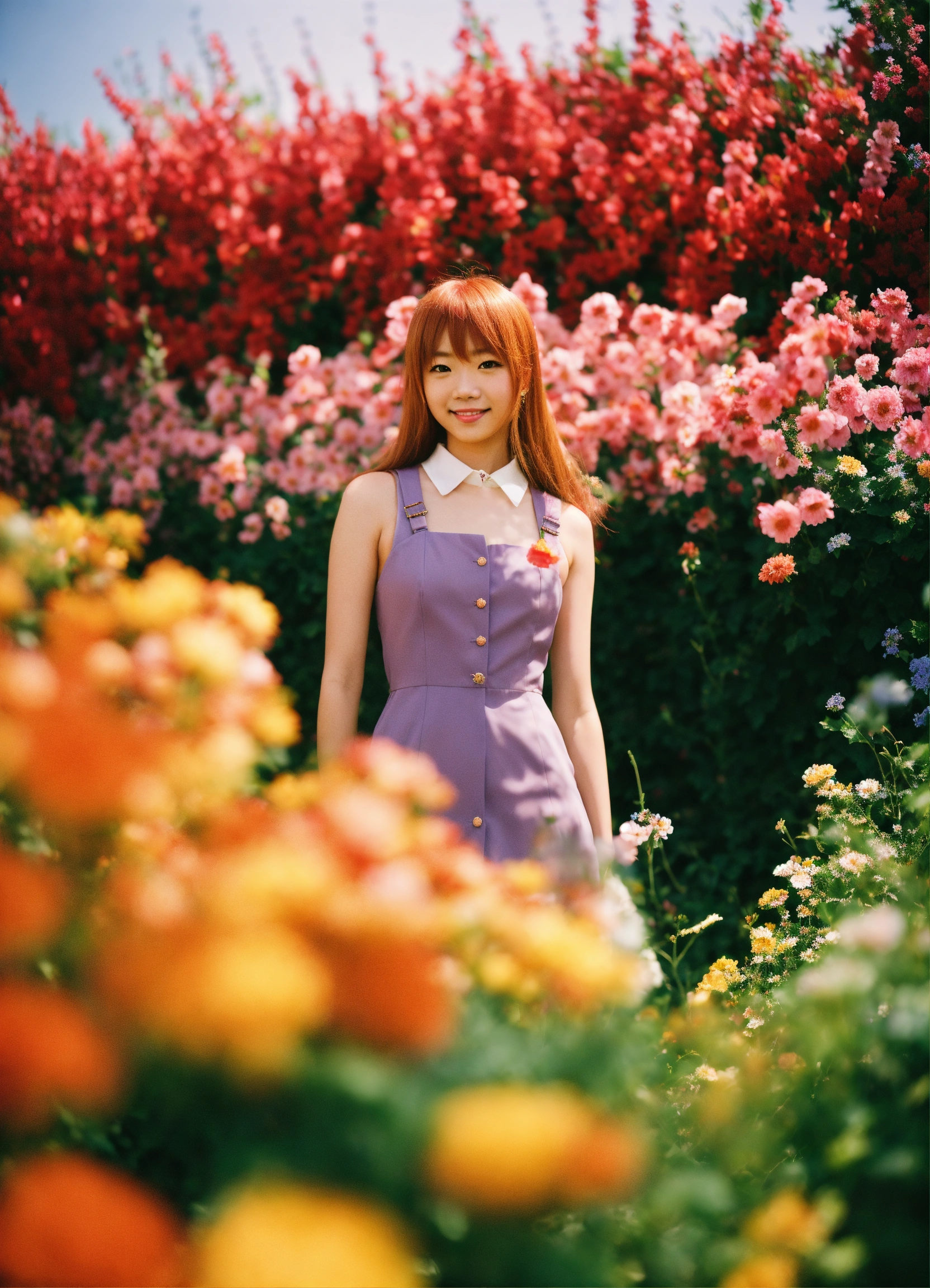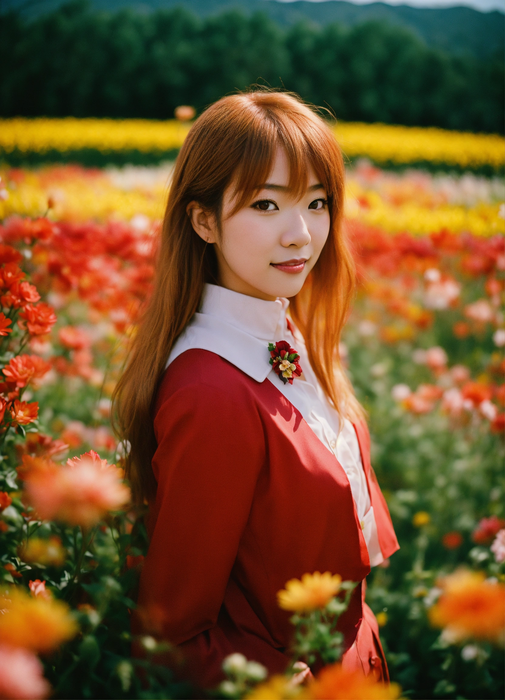 Happy asuka langley soryu standing in a beautiful field of flowers, colorful flowers everywhere, perfect lighting, leica summicron 35mm f2.0, kodak portra 400, film grain