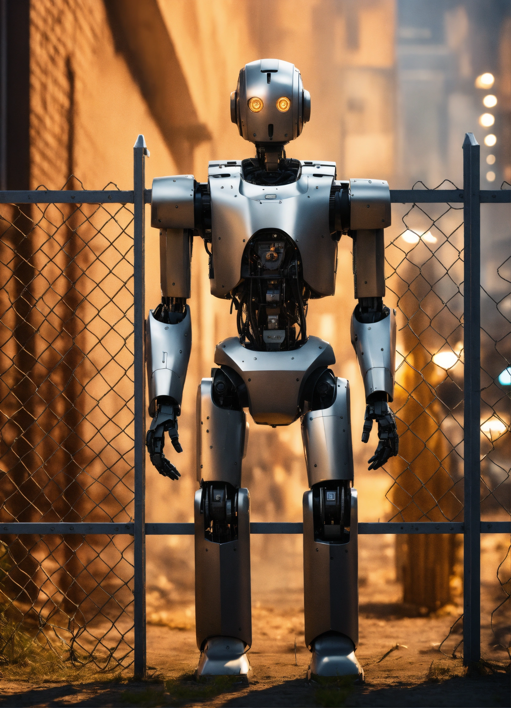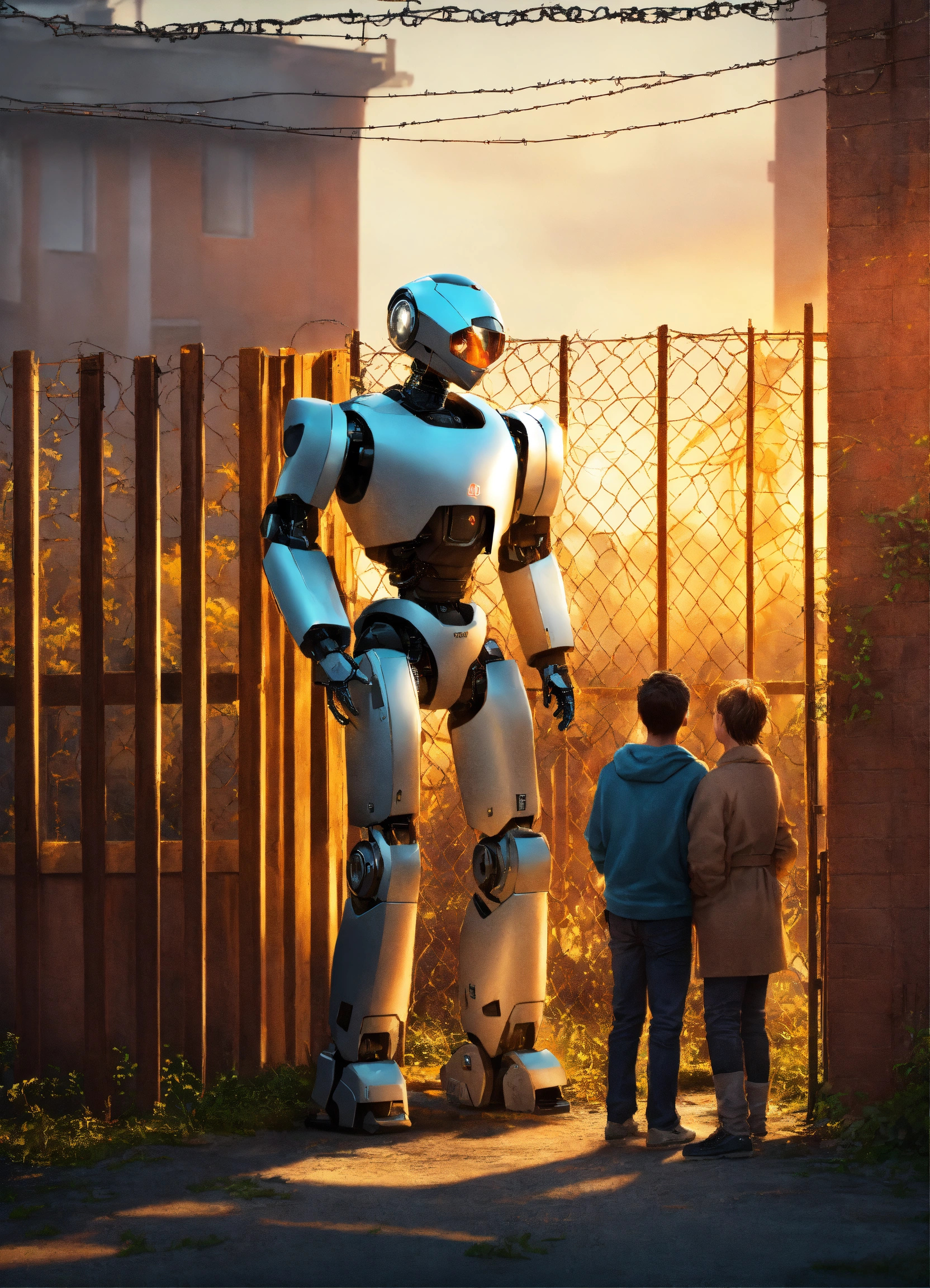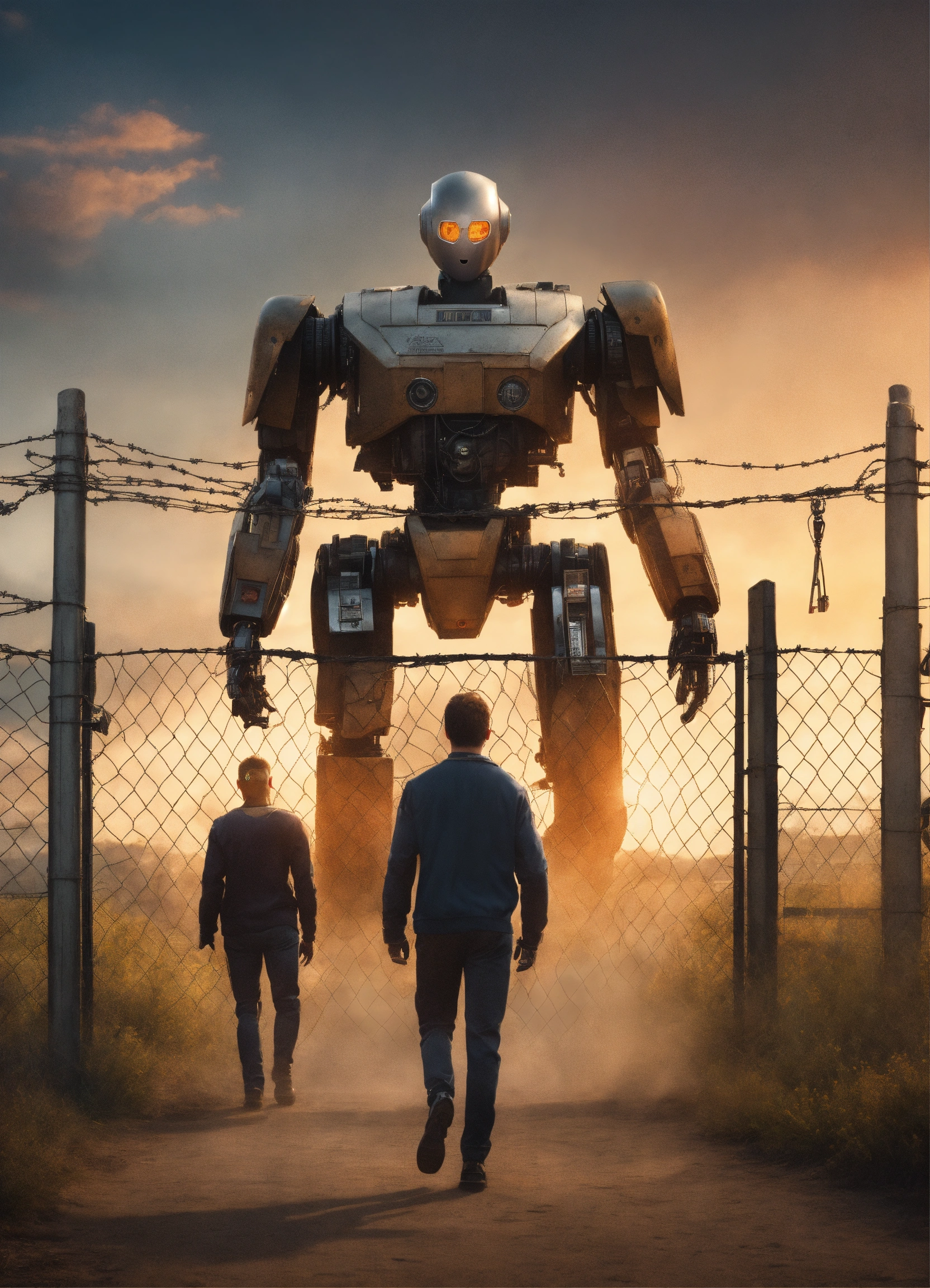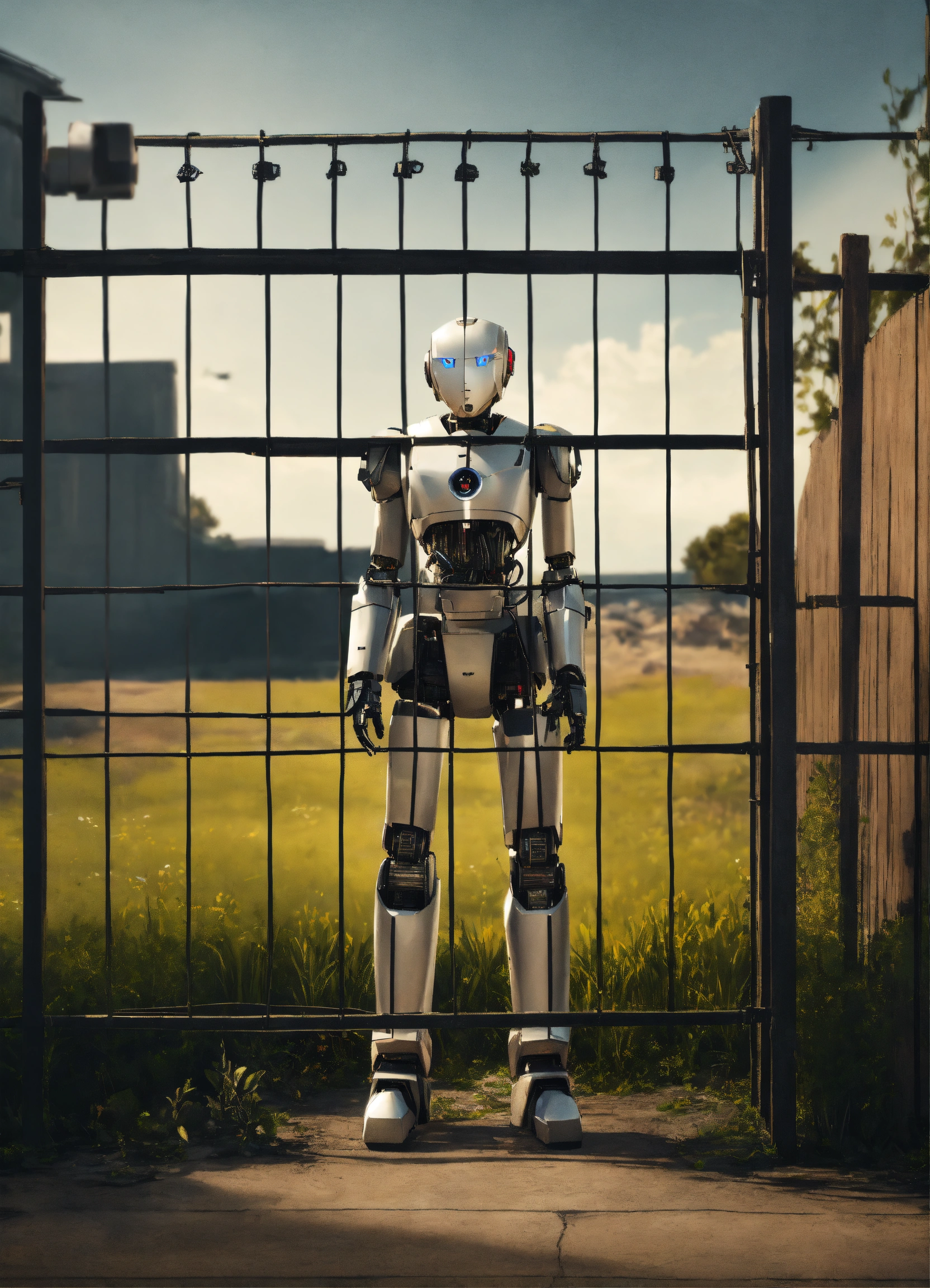 Generate a hyper-realistic image in 4k resolution that portrays fiction movie poster showing several humans locked inside a fence and a humanoid robot as vigilant