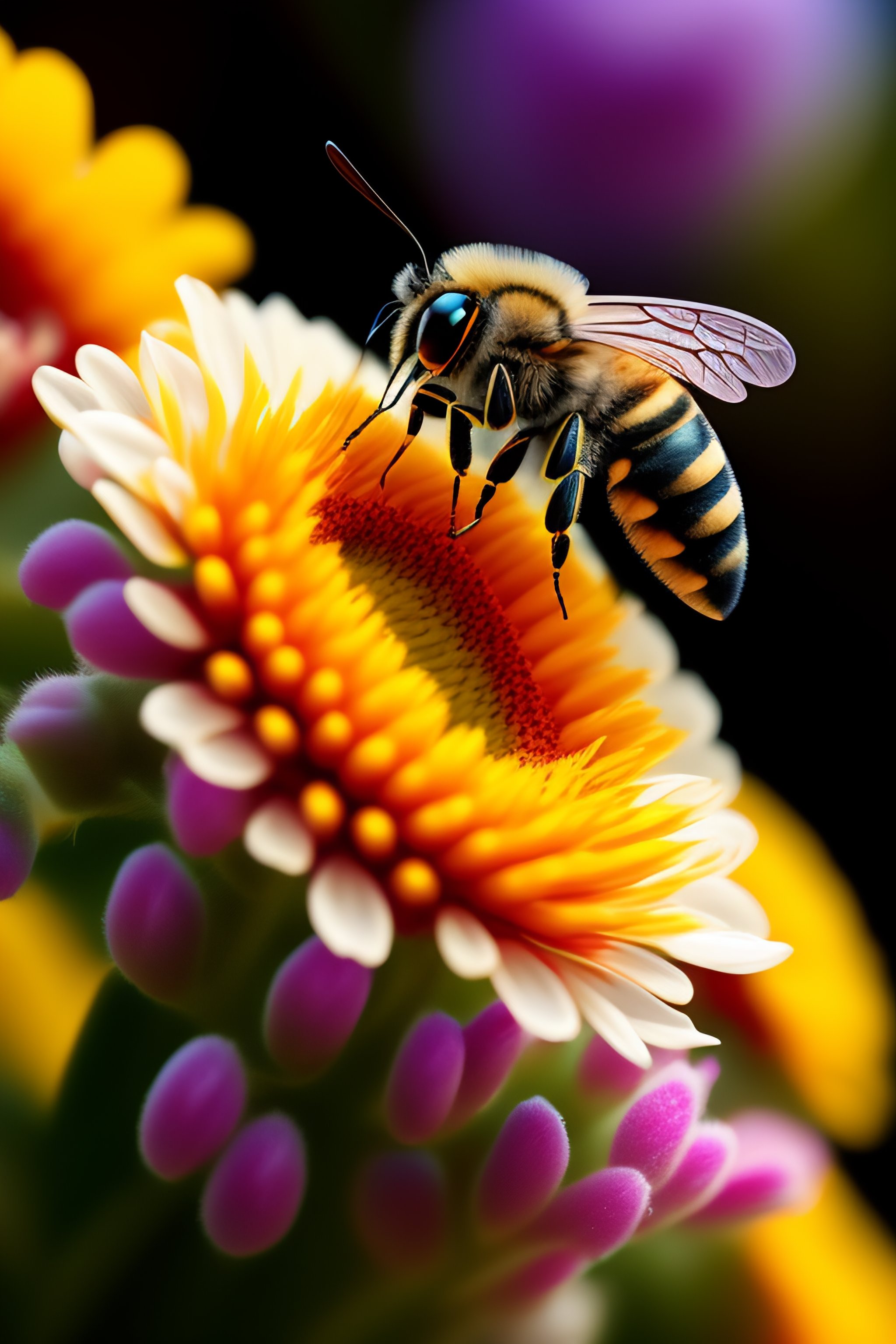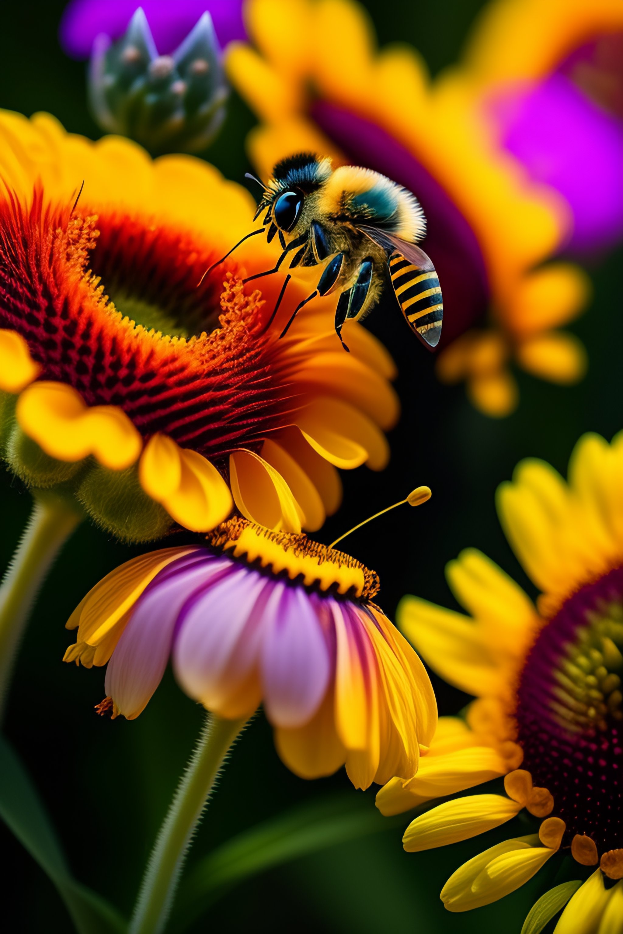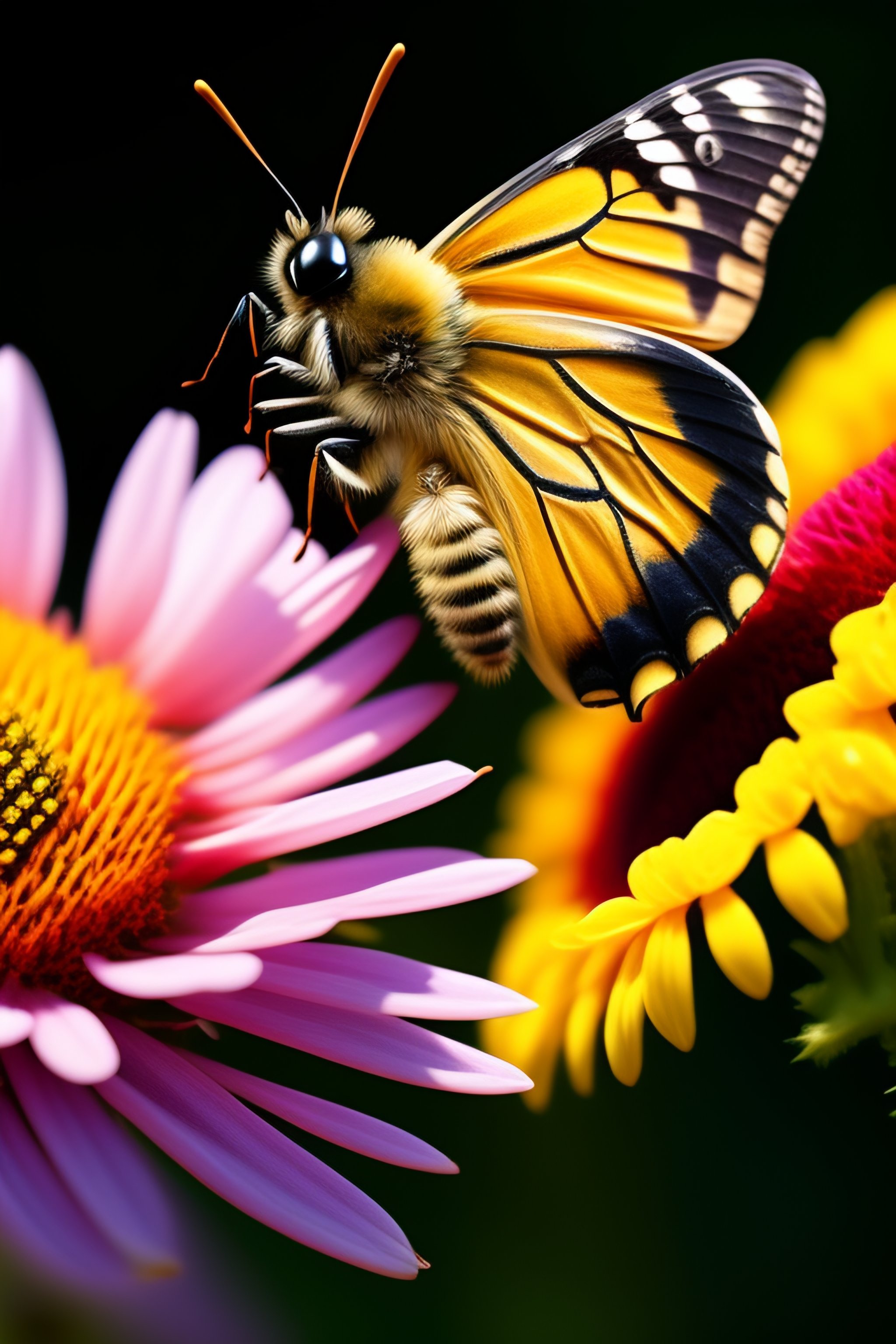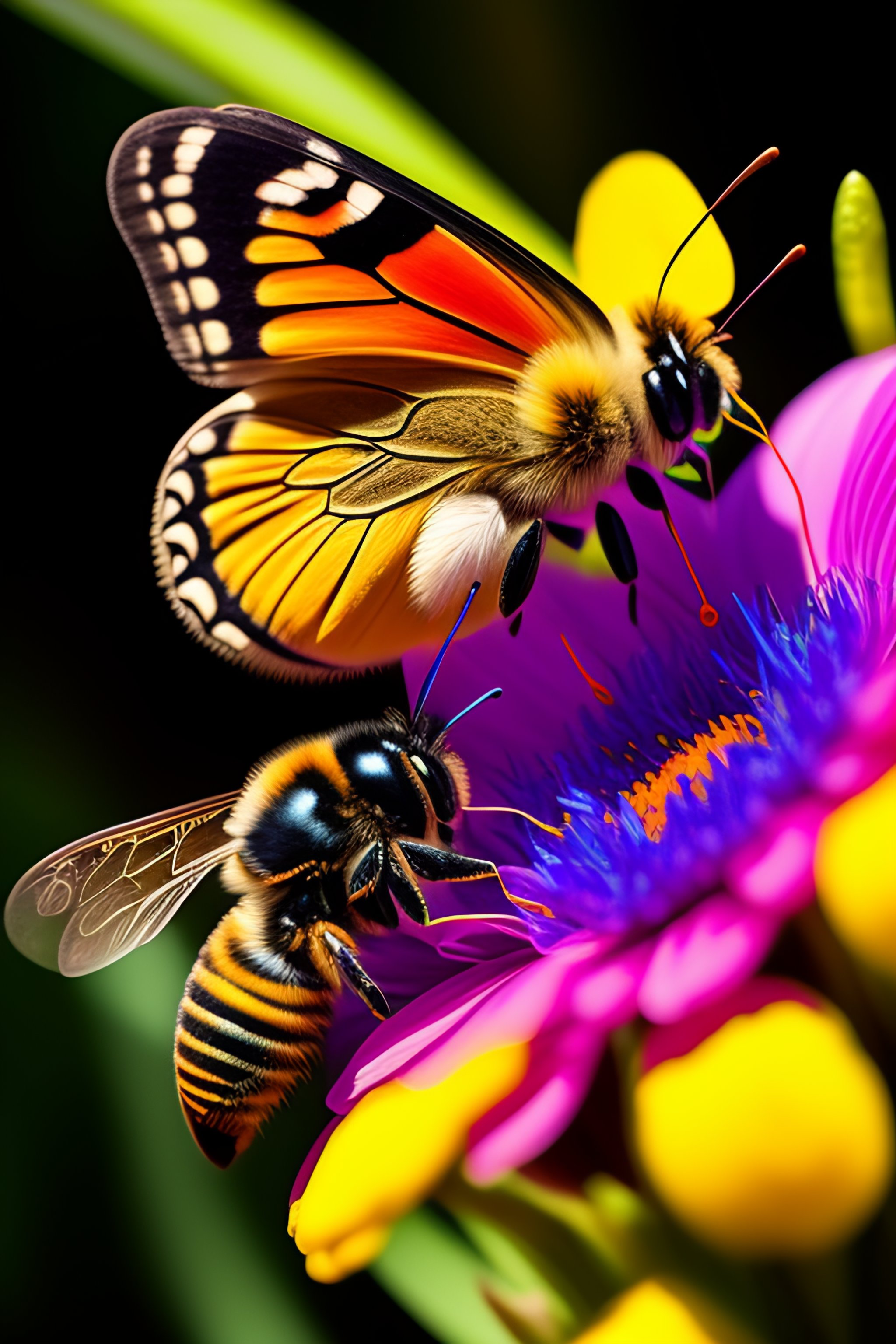A butterfly and a bee are kissing each other on a flower