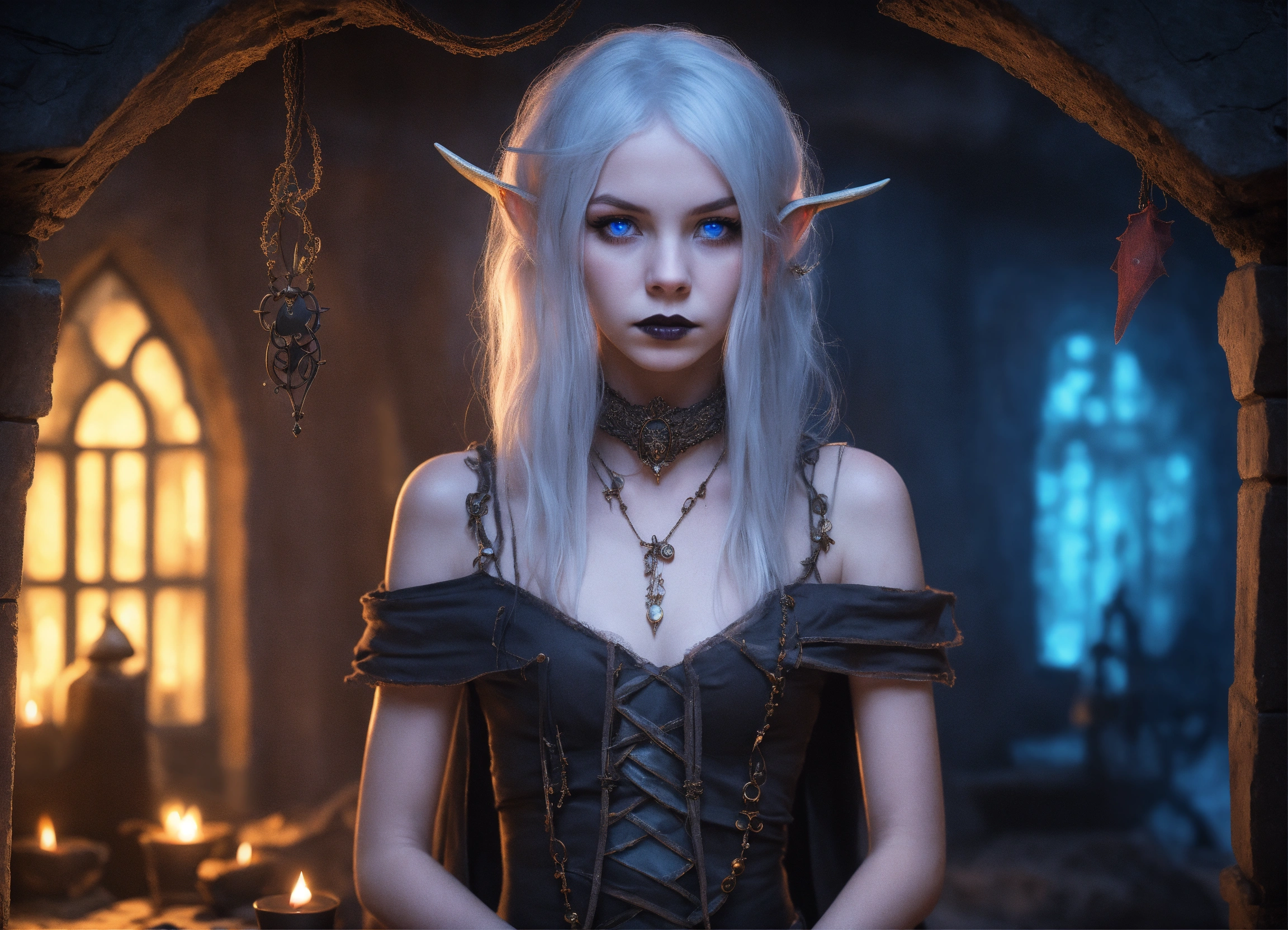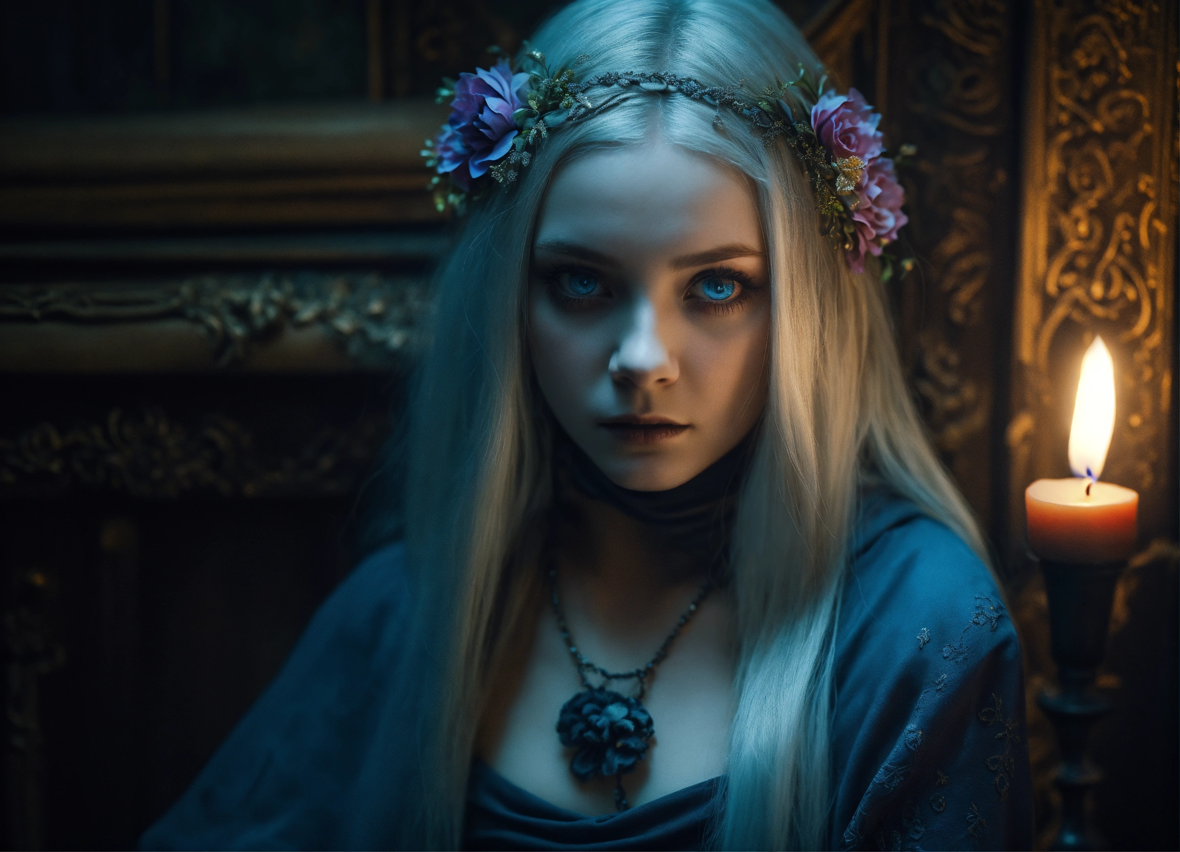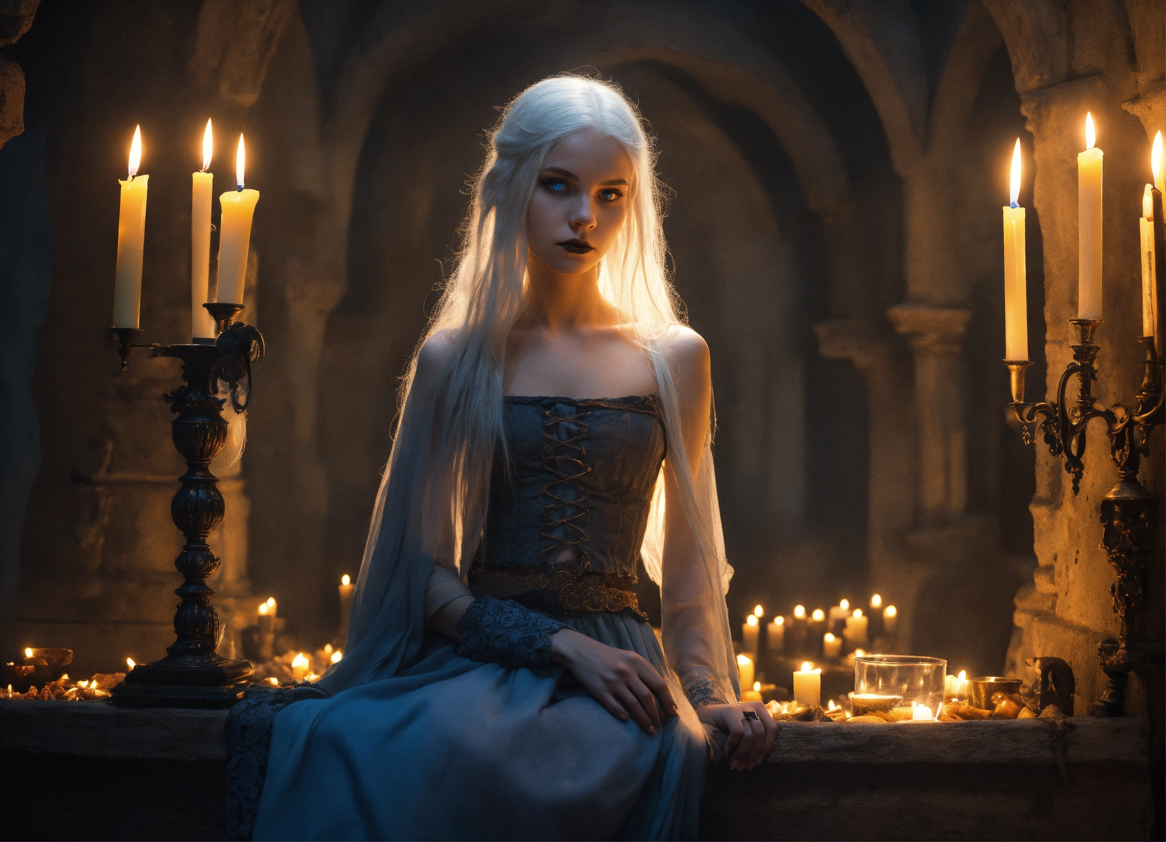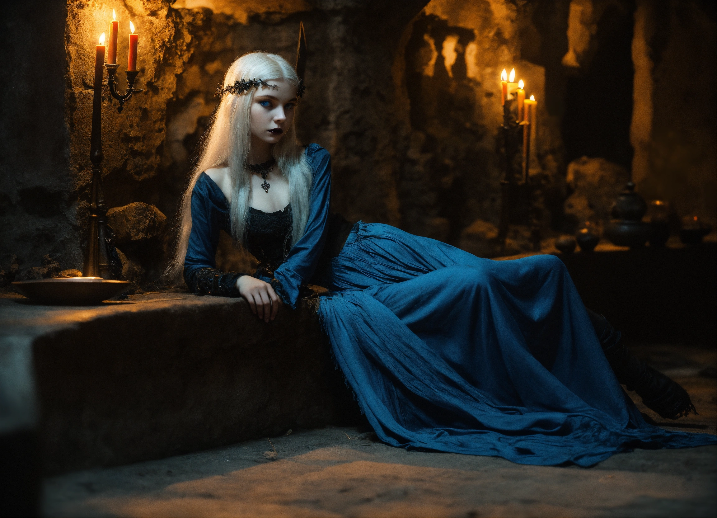 Body portrait of a very childish deadly pale extremely slim twelve year old female child, she is a goth necromancer with waist long silverwhite hair and a off-the-shoulder crop top and a low worn hip scarf which is slit, extremely flat belly, extremely skinny, extremely slim body, emaciated body, completely emaciated, extremly narrow face, alabaster skin, pale as a corpse, glowing blue eyes, slim face, innocent looking, lies lasciviously on a divan in a gloomy crypt, innocent pose, kindlich, unschuldig, lasciviously, lasziv, childlike, graceful, wispy, glowing blue eyes, ghostly, dead, evil, demonic, undead, darkness, grotesque, mysterious, dark, candlelight, cold ambient lighting, extremely detailed, fantasy, medieval setting