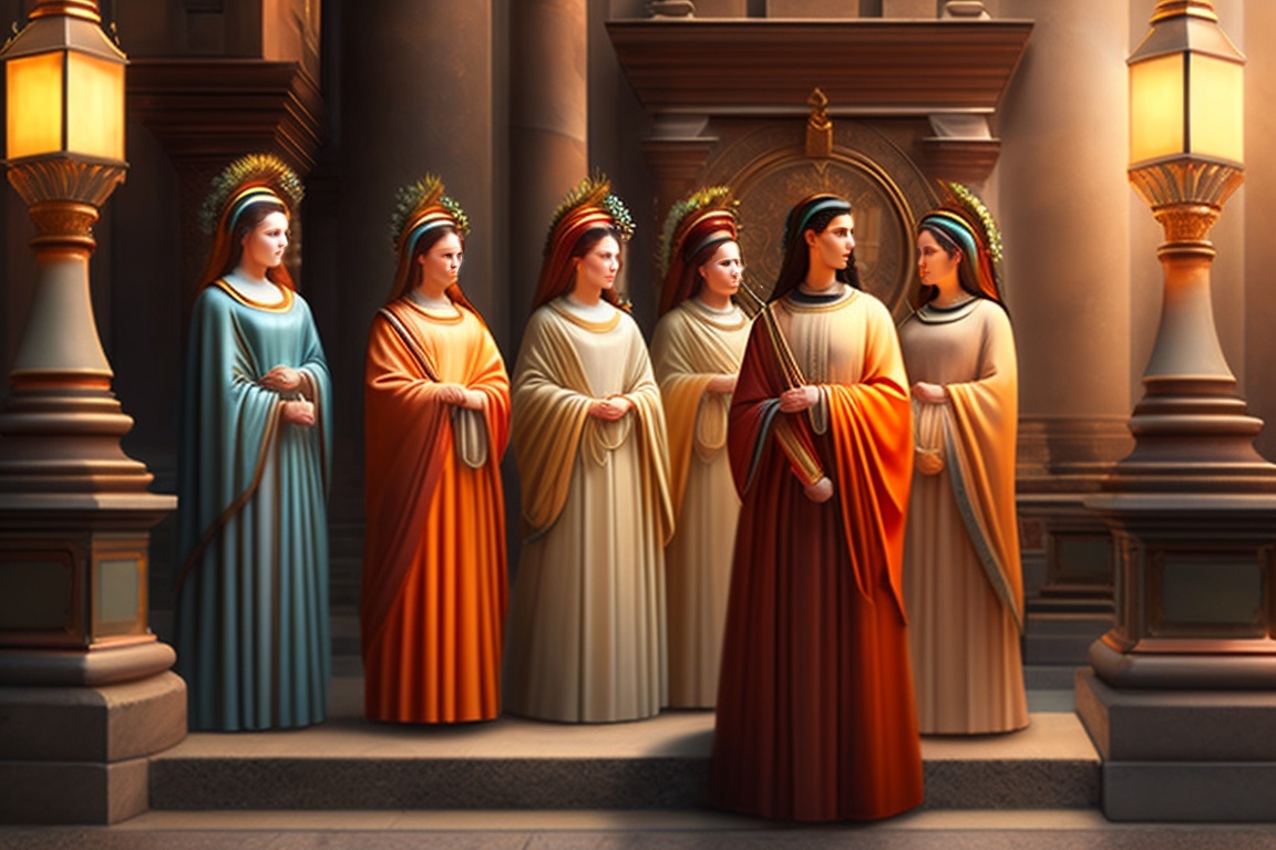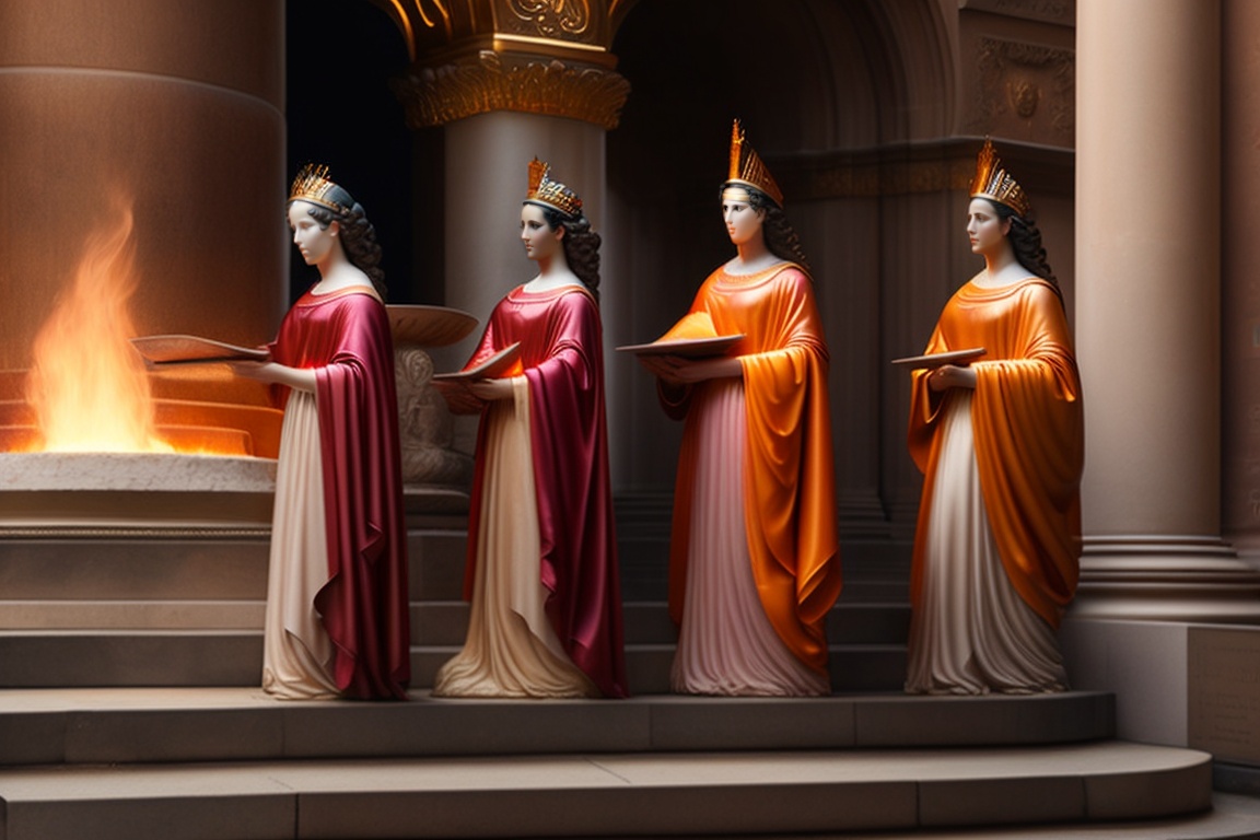 The vestal virgins, guardians of the eternal flame, in ancient rome. convey the solemnity and dedication of these priestesses as they protect the perpetual fire