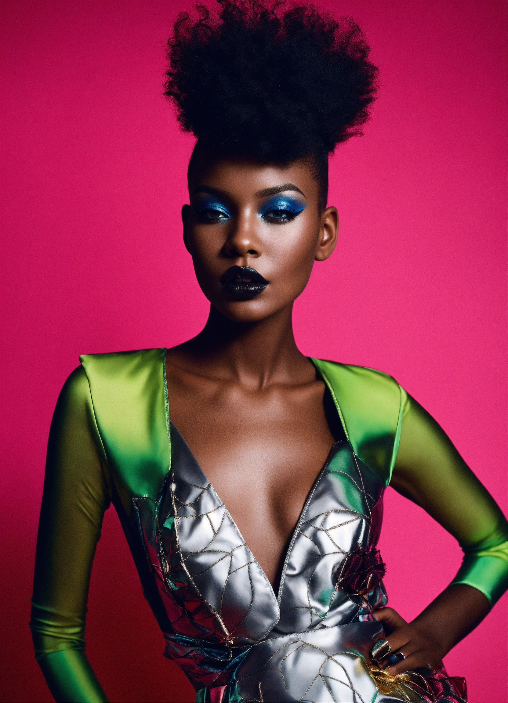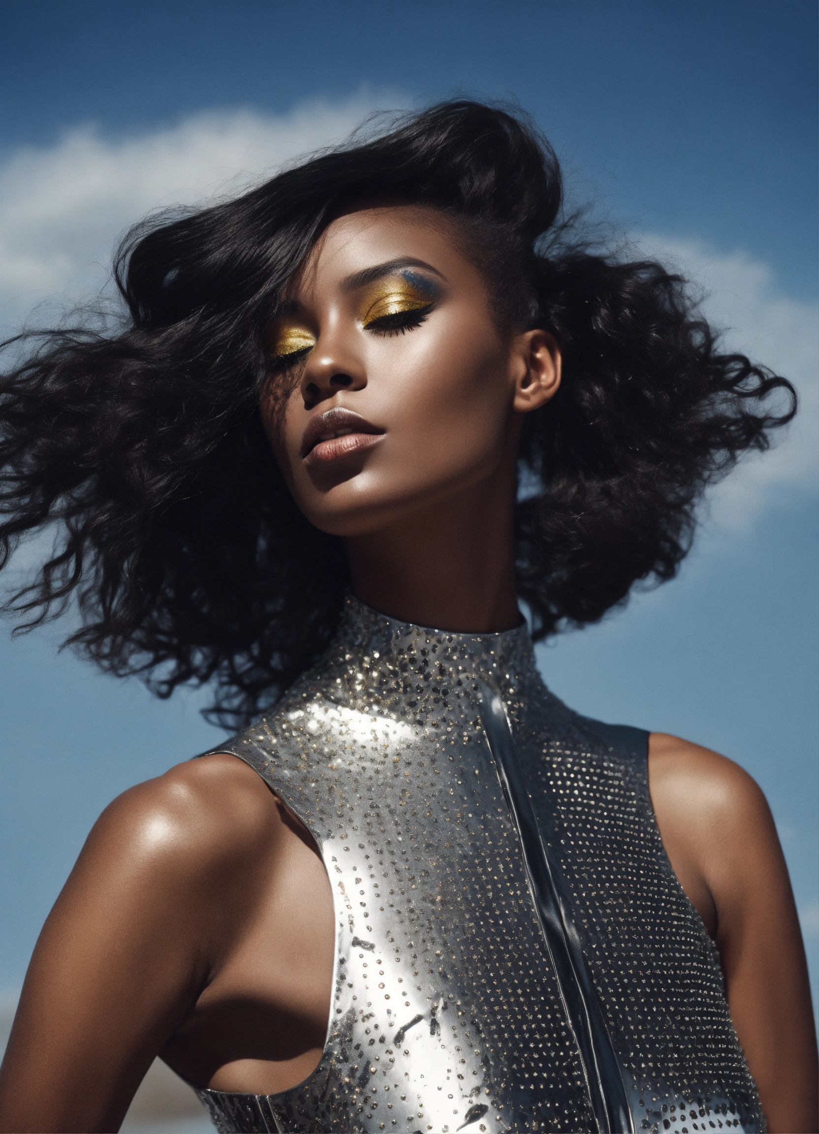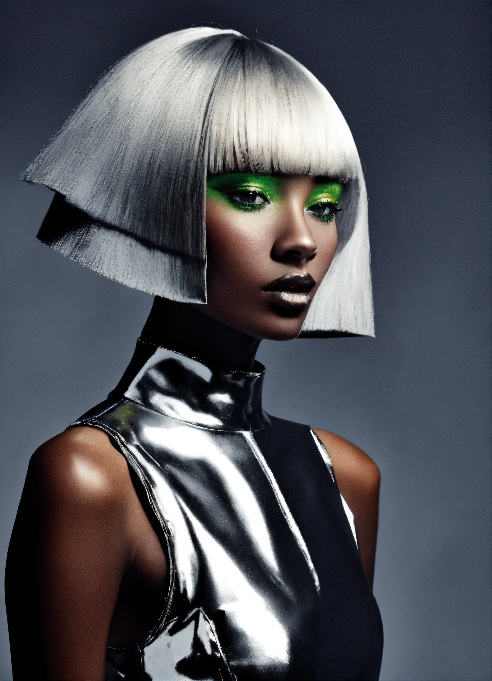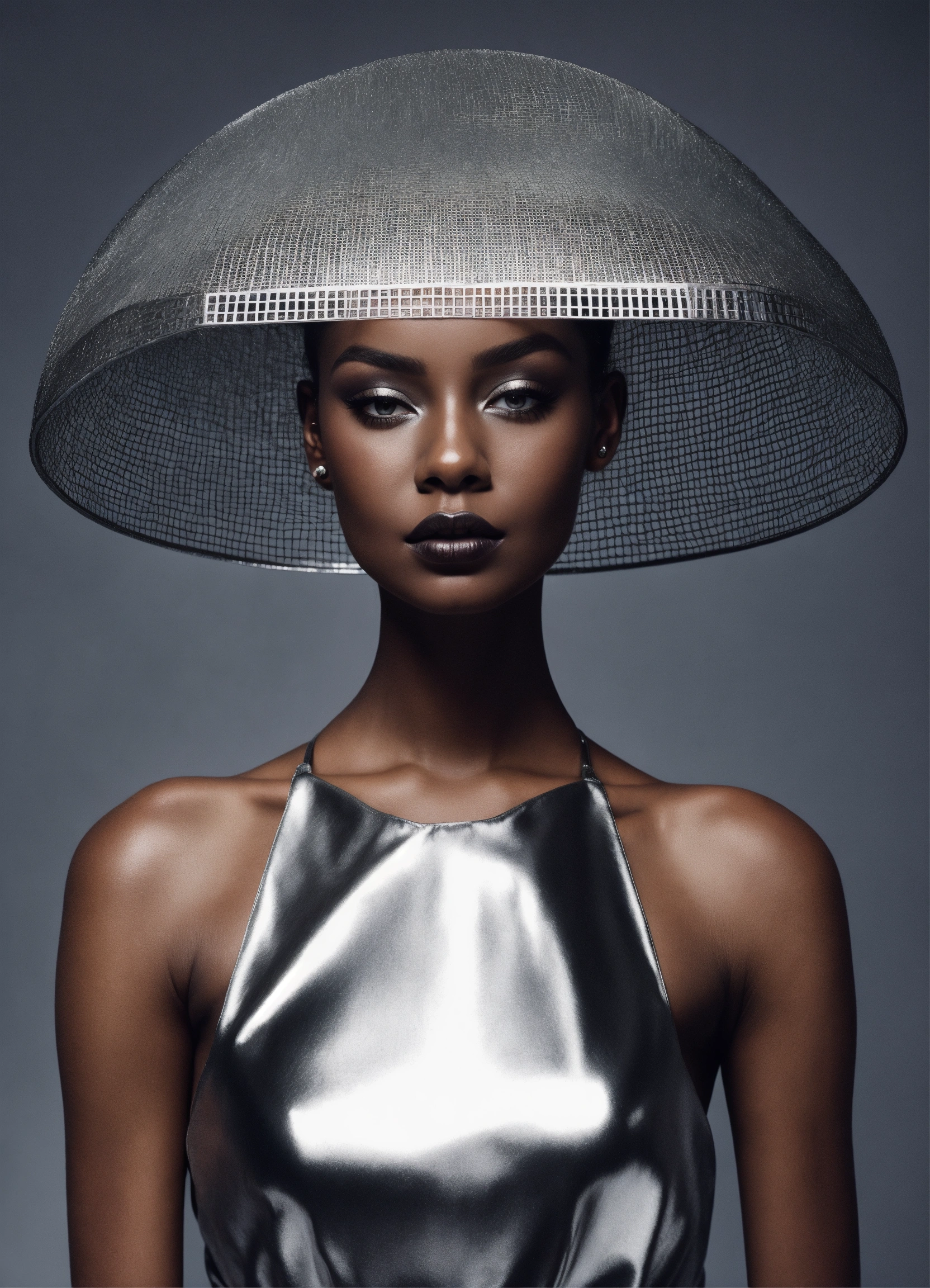 Avante garde high fashion beauty editorial, carmel complexion size 9 black woman dress in silver by flora borsi, style by flora borsi, bold, bright coolers, conceptual bob style hair, ((flora borsi))