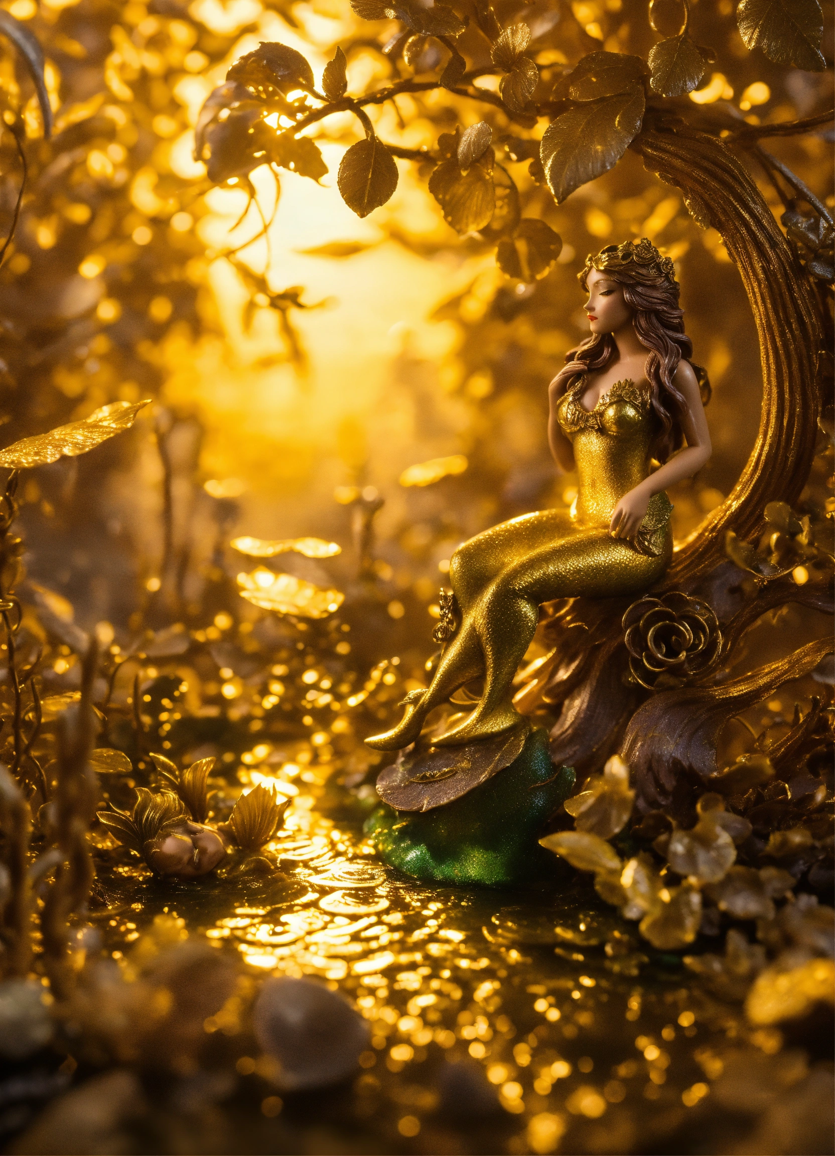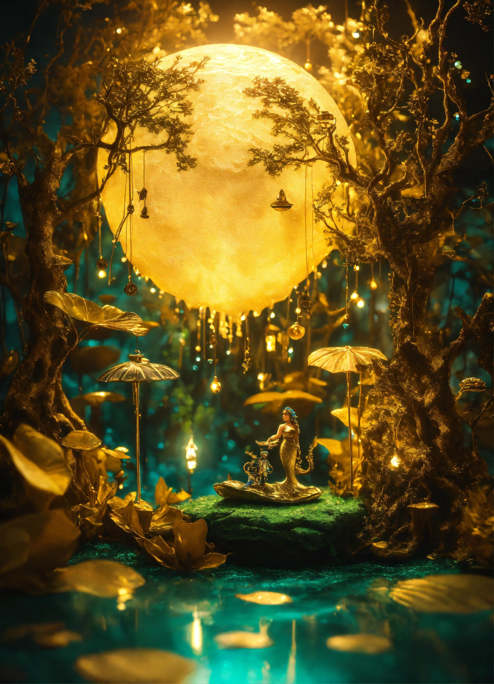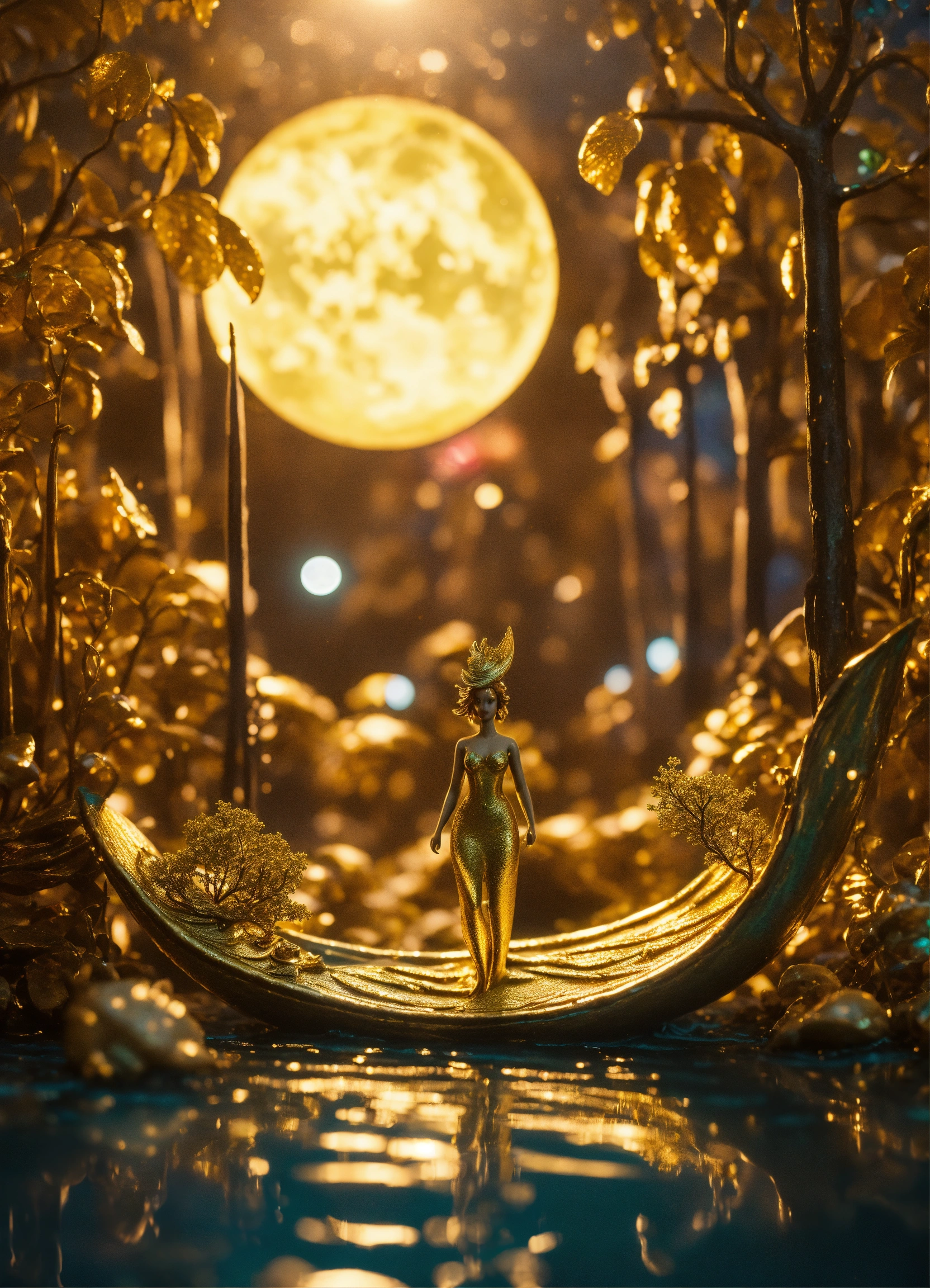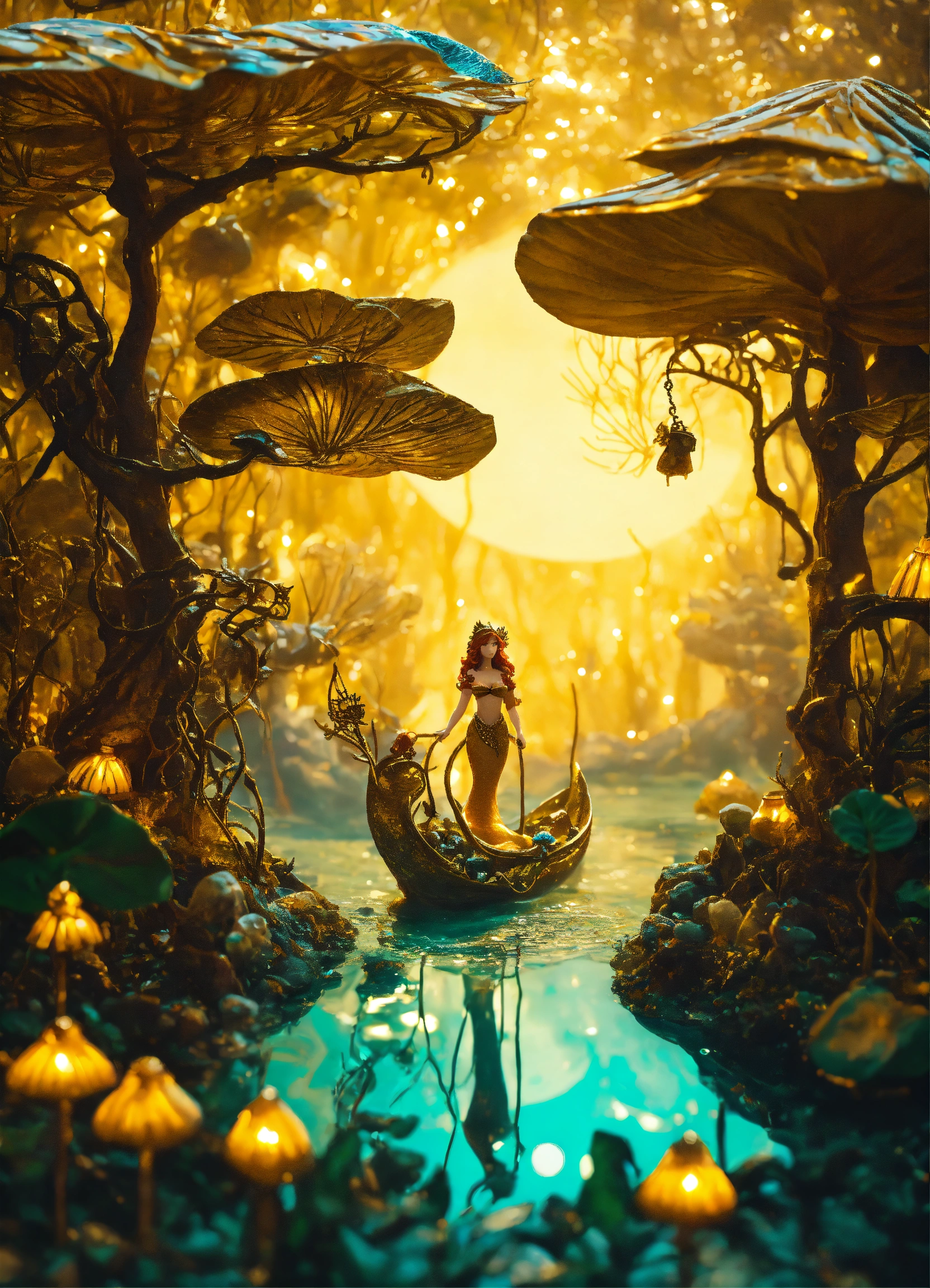 An mystical grove made of liquid gold, a mermaid sailing on a leaf, claymation figures, steampunk inspired, rich and detailed, glowing moonlight, mystical grove.