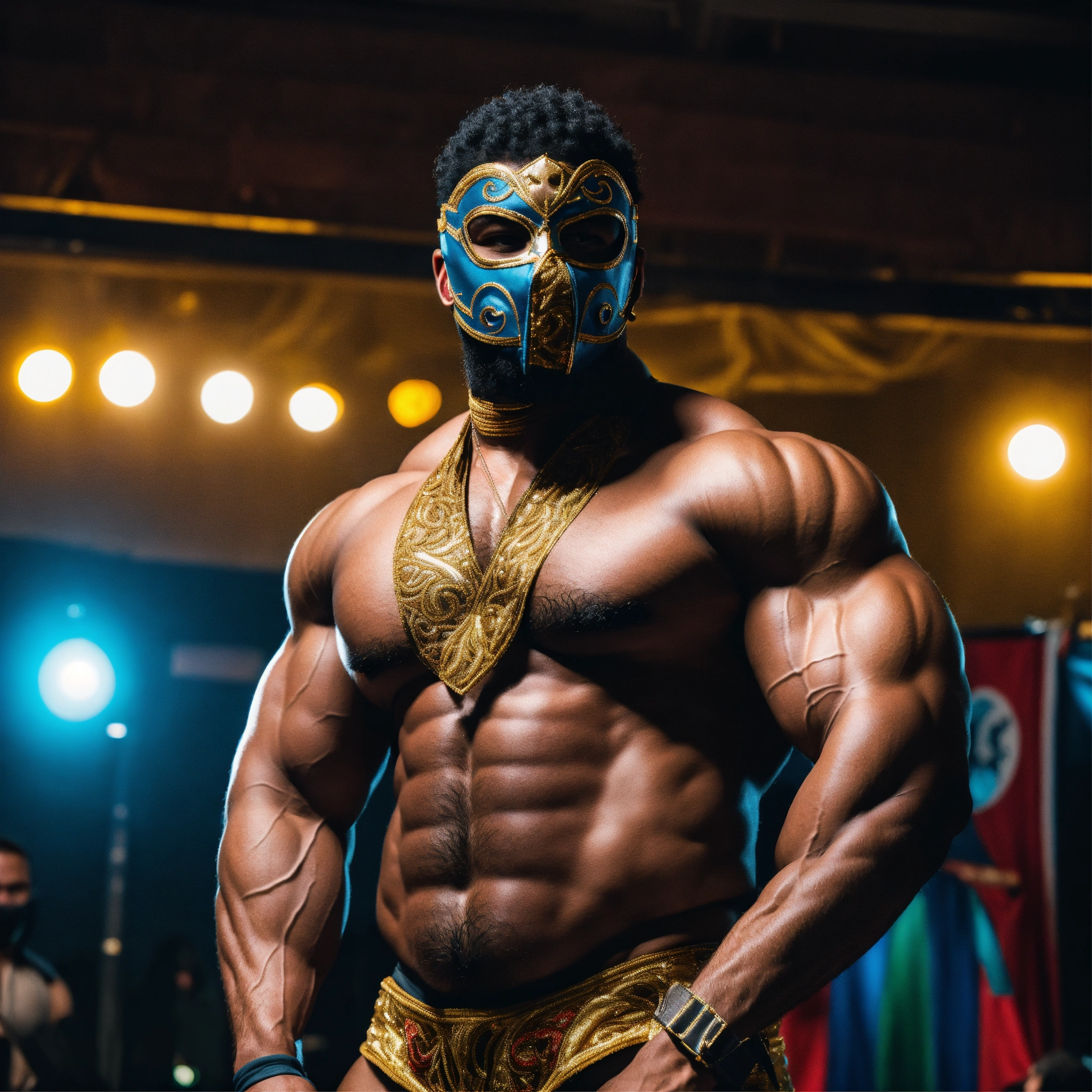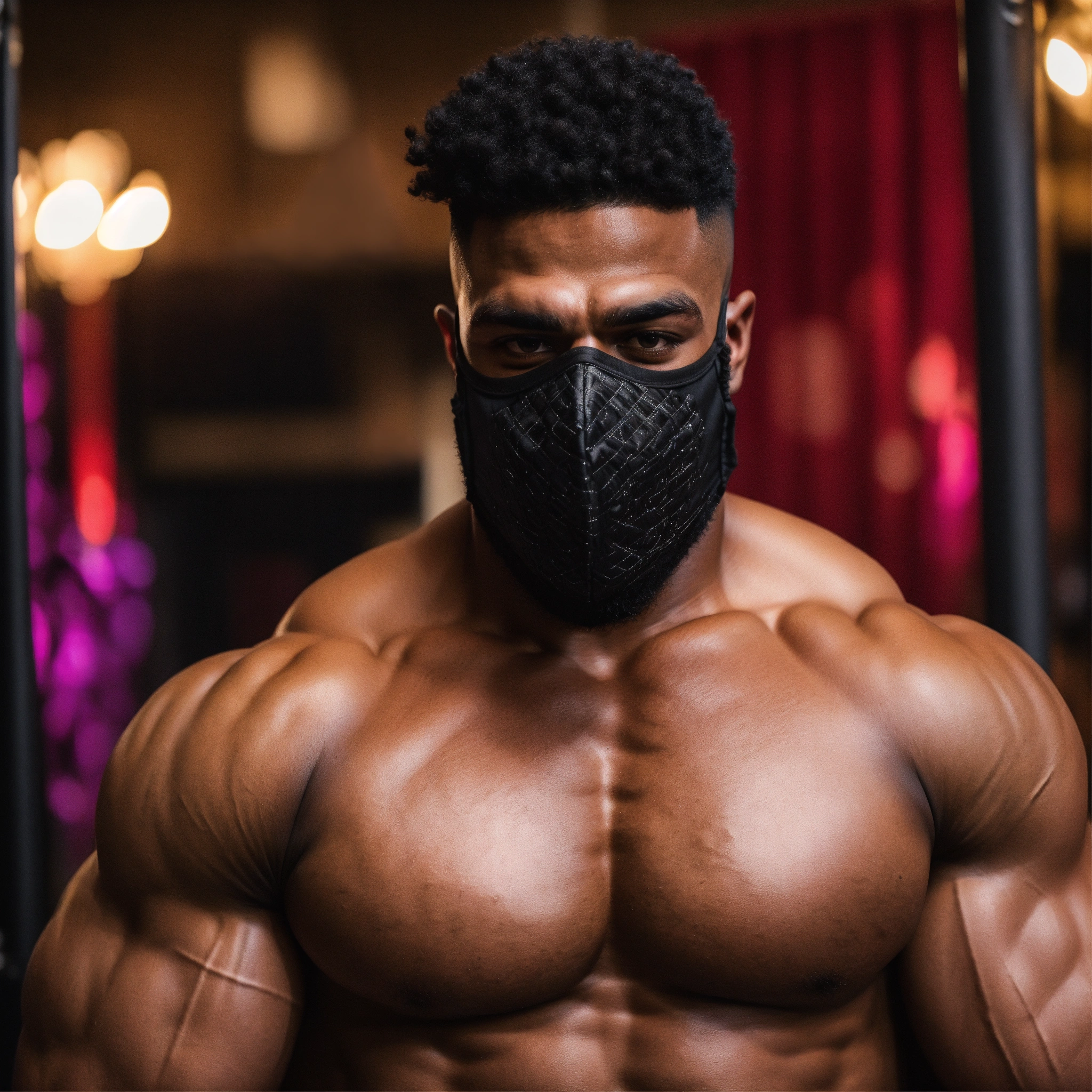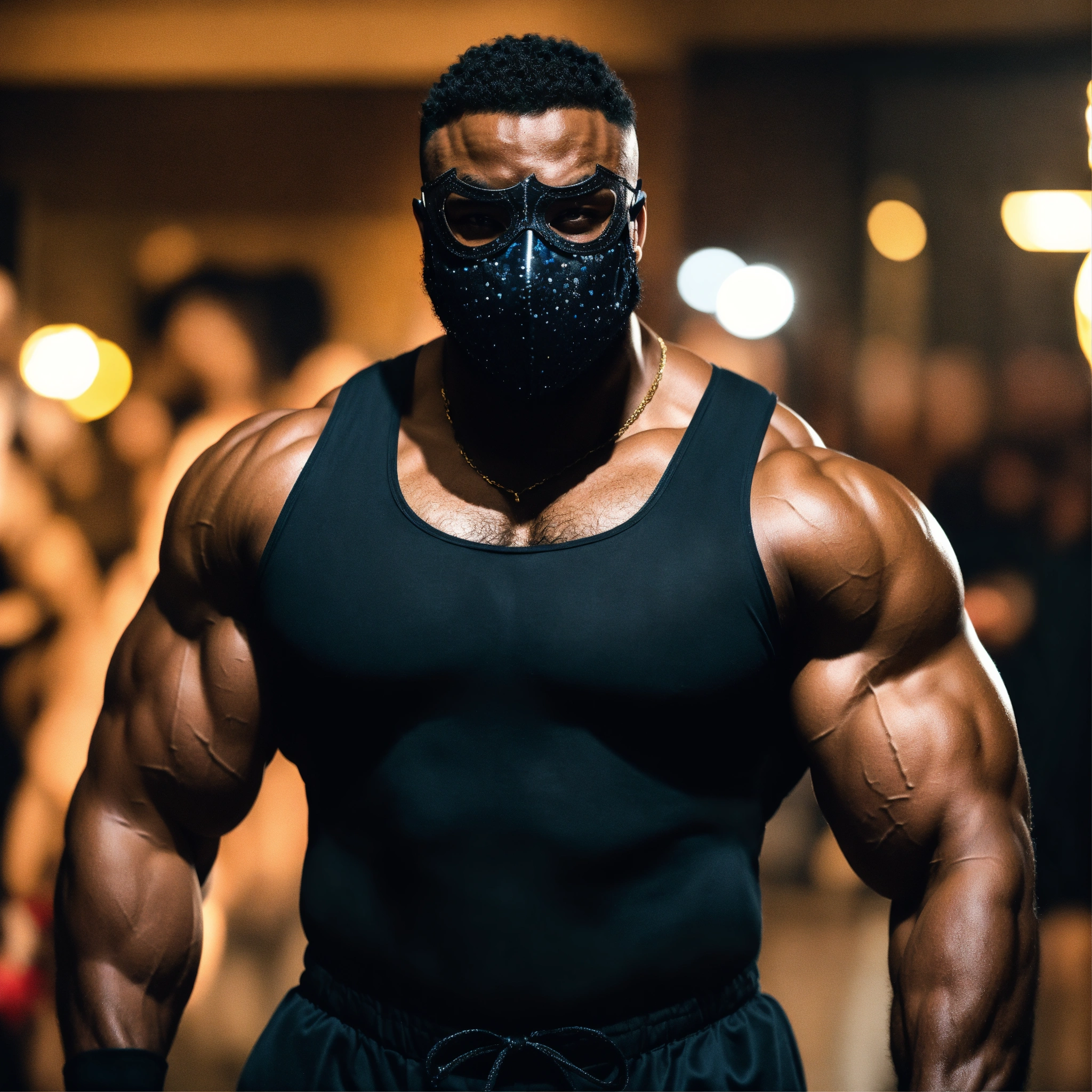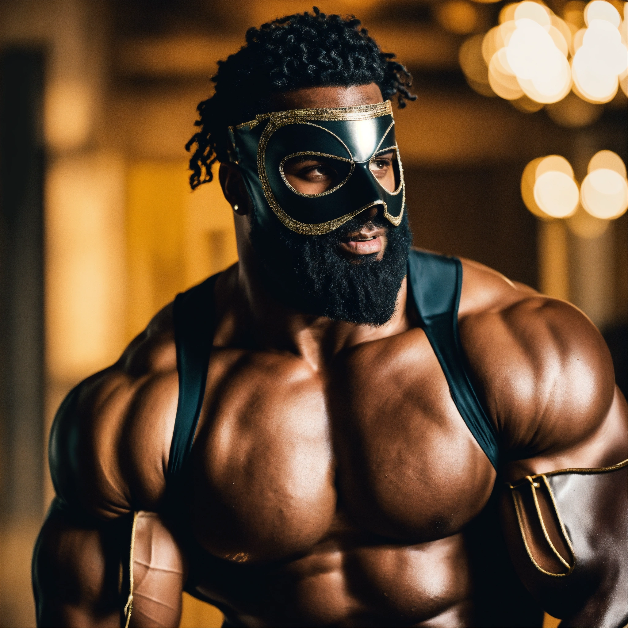 30-year-old hairy black arab man with big muscles, big bodybuilder, body like a wrestler, wearing a mask at a masquerade ball