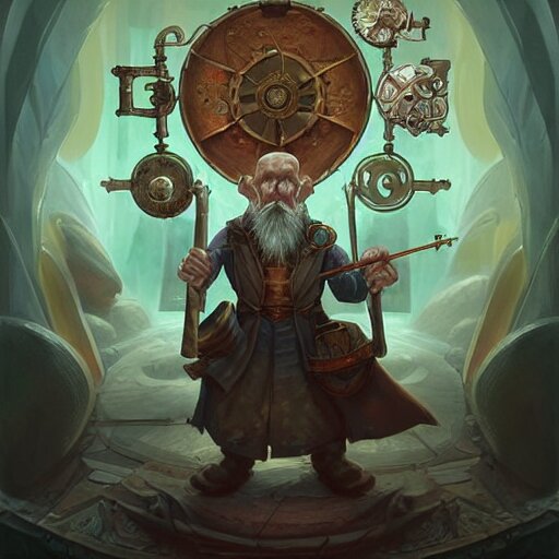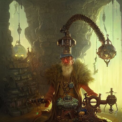 An old wise wizard operating a random pointlessly elaborate intricate contraption pneumatic machine, dnd character art portrait, matte fantasy painting, deviantart artstation, by jason felix by steve argyle by tyler jacobson by peter mohrbacher, cinematic lighting