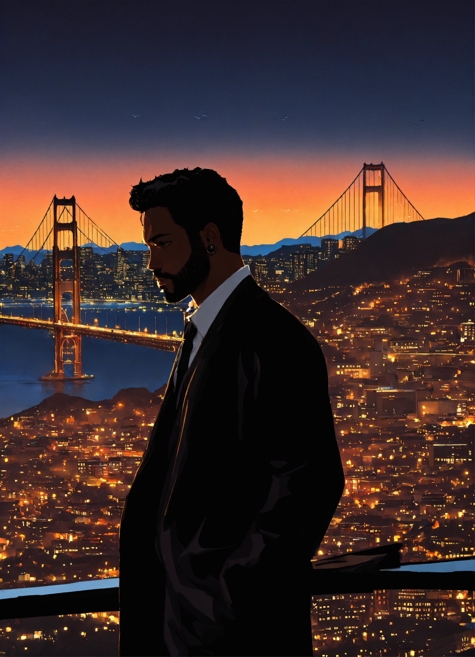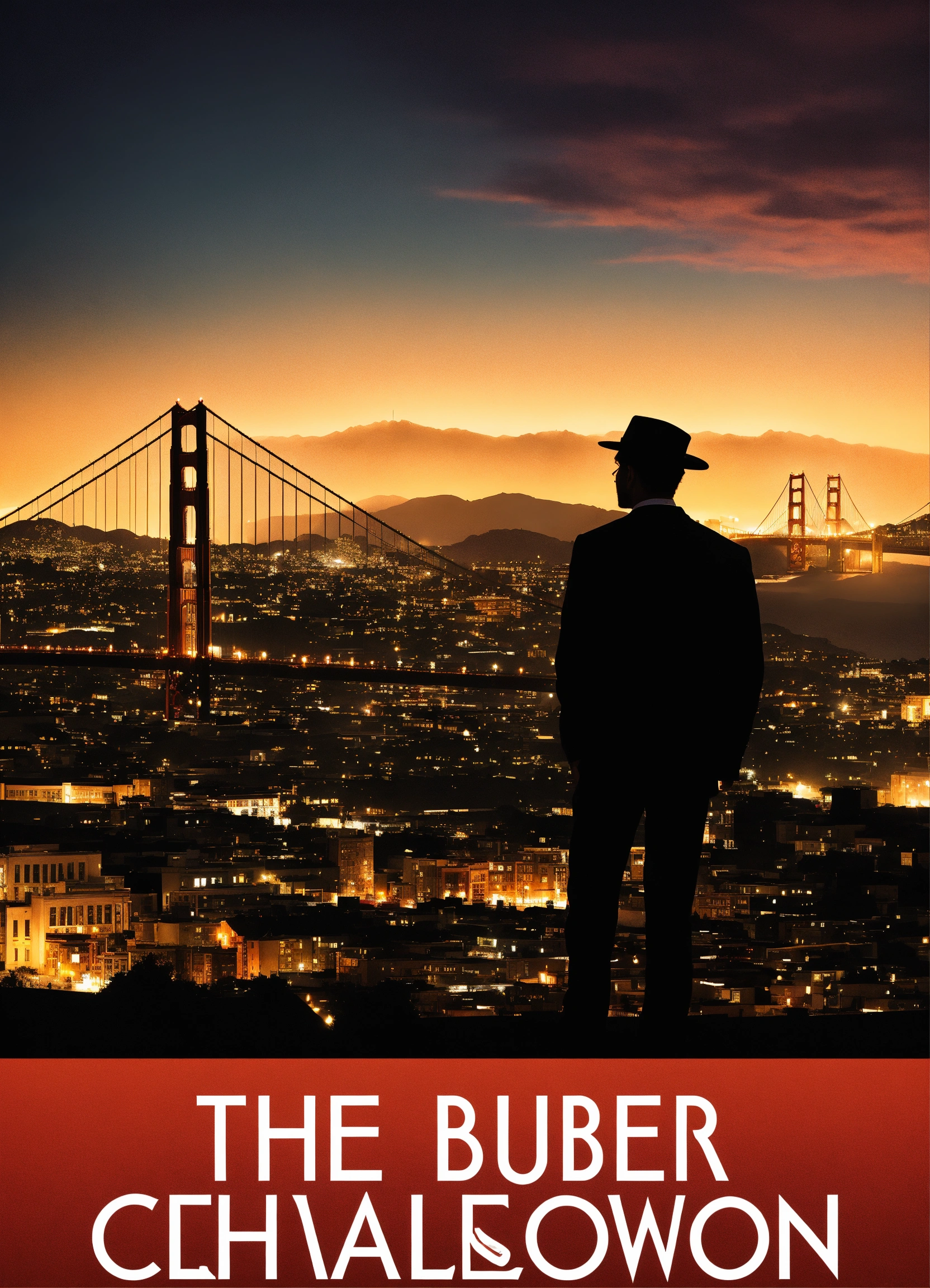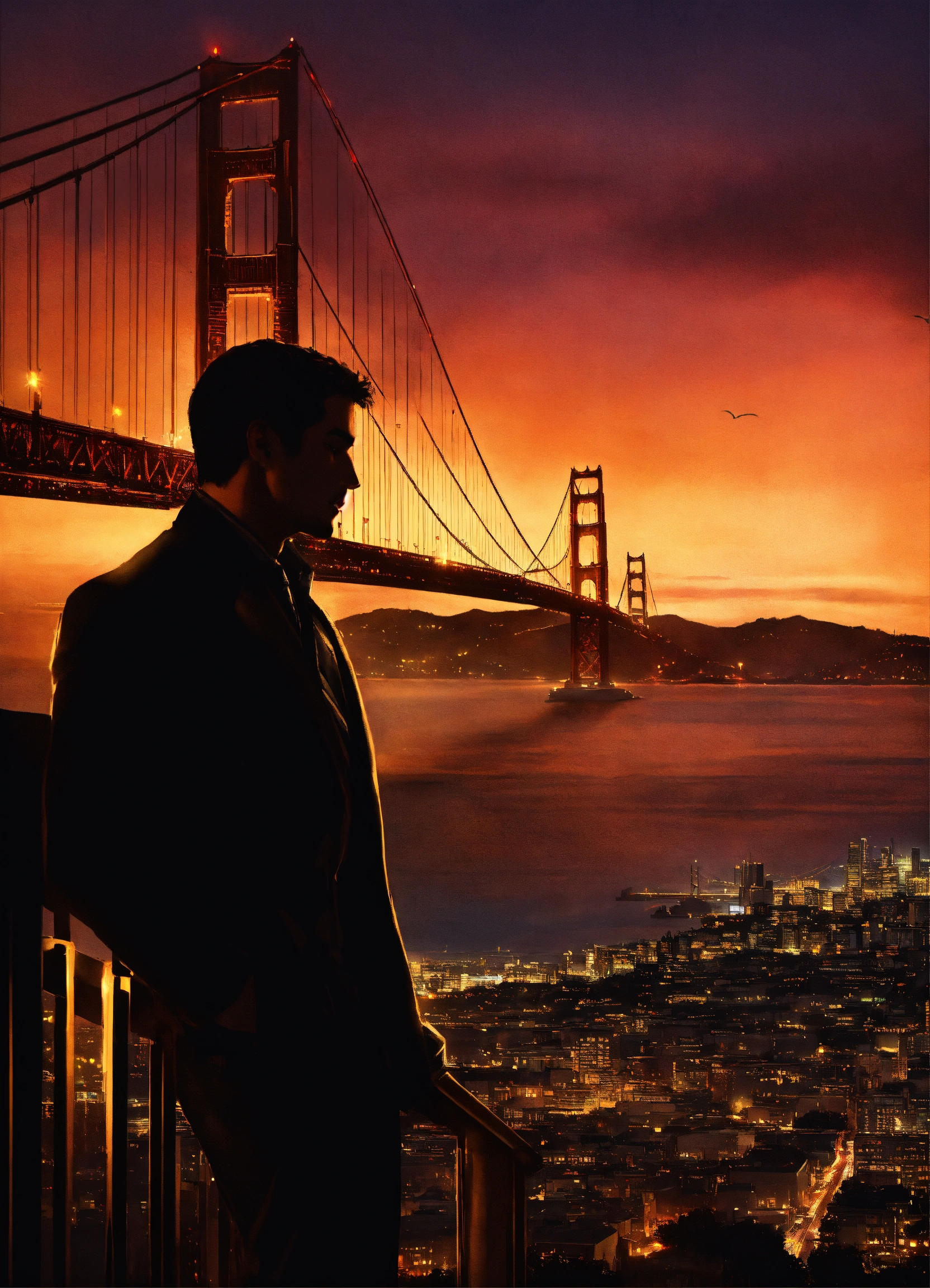 Create a captivating cover design that conveys the theme, city, nightlife, crime, and thriller silhouette of a man side view overlooking the city with golden gate bridge in the background, inspired by the book of mark dawson "the chameleon (charlie cooper thrillers book 2)", photoreal, photorealistic, with lighting and shadows effect, city lights at night, super detailed city, extremely detailed