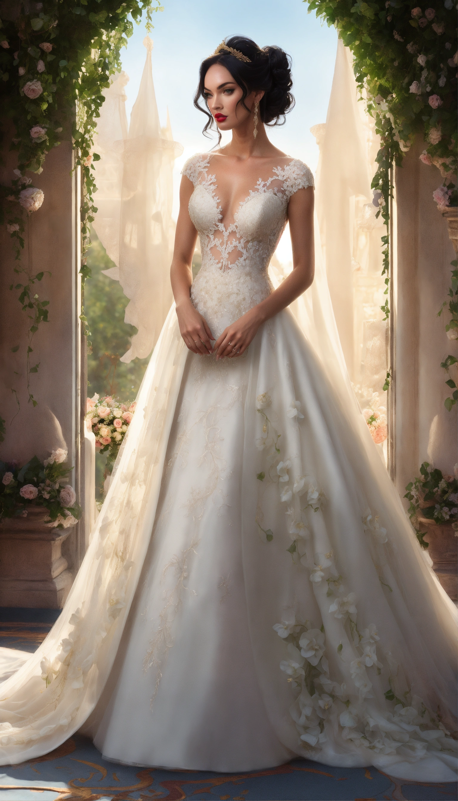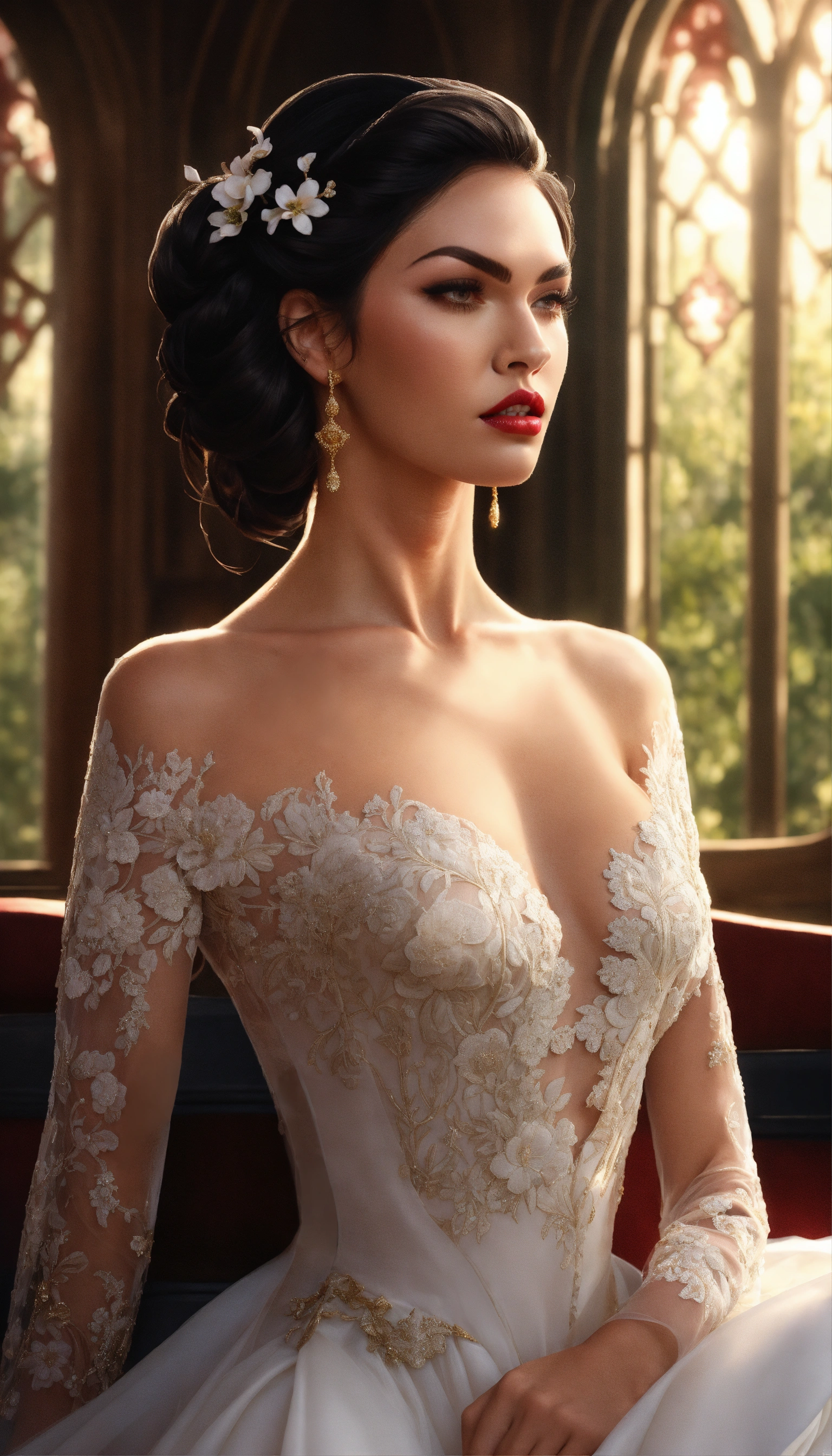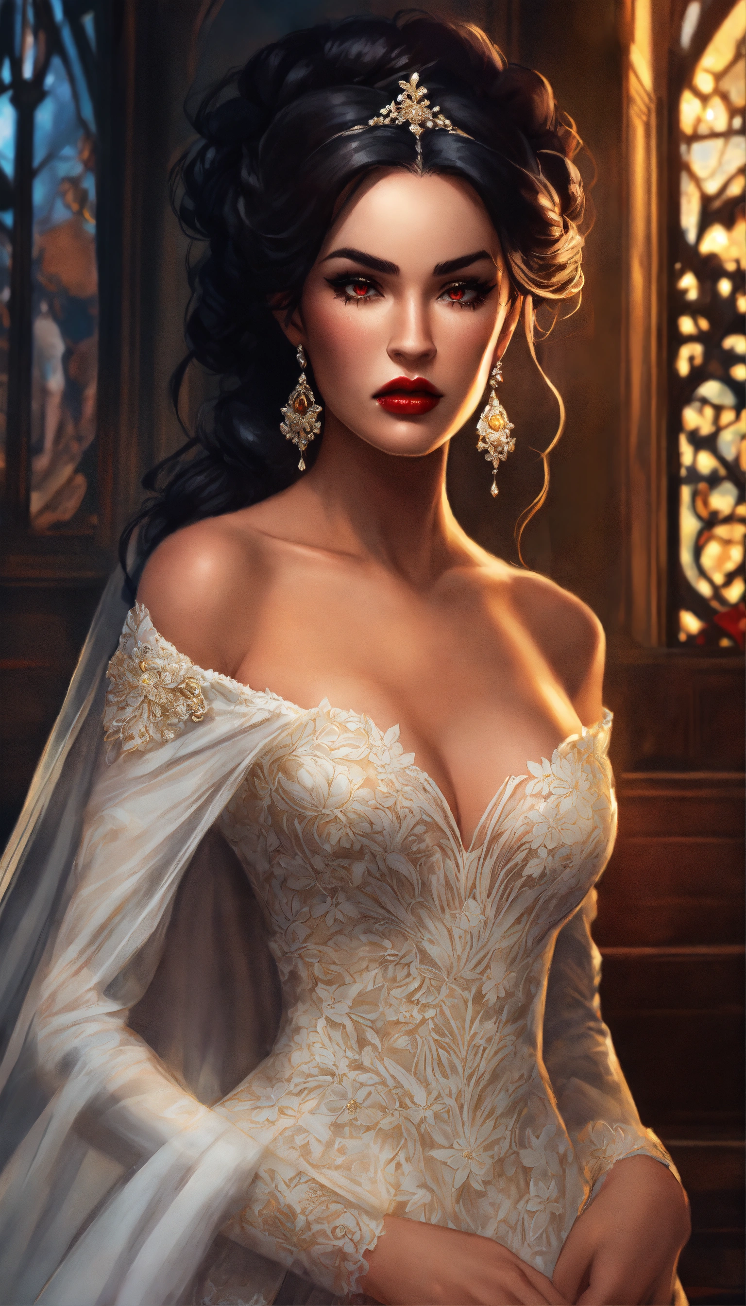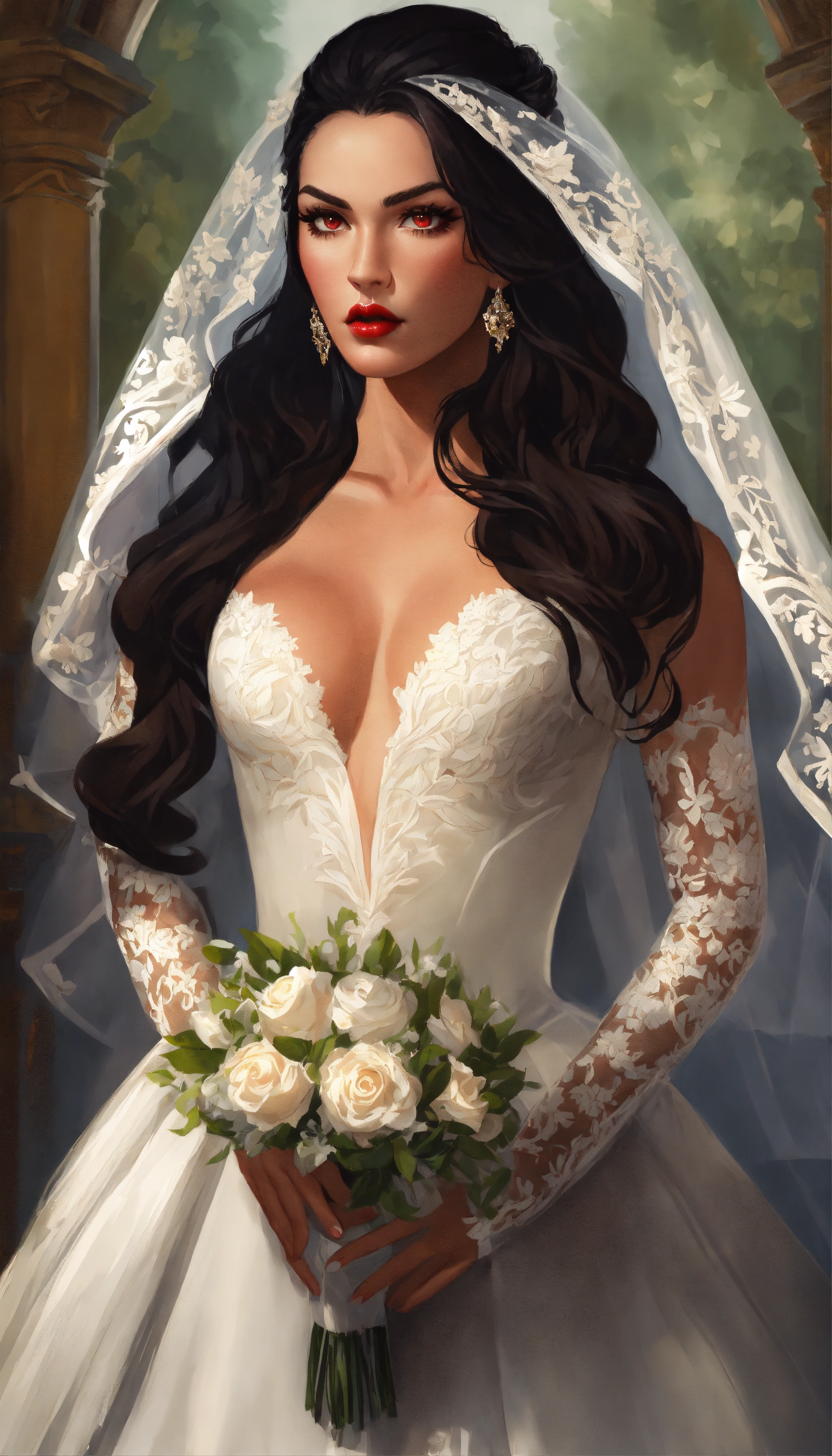 Concept art of ravenna, megan fox, glowing red eyes, curled voluminous flowing black hair in a formal wedding updo, hair in a bun, updo, bun, curled black hair tied up in a wedding bun, beautiful, tan skin, realistic, sabine rich, artgerm, j scott campbell, artgerm, perfect body, detailed, intricate, round face, slim nose, long black eyelashes, red lips, sharp jawline, perfect detailed face, realistic, floor length white veil, full body view, evil dark sorceress, gloomy grey castle background, gloomy dark flowers forest castle, white floor length fitted full skirts a-line bridal gown, low cut plunging neckline, gold high heels, voluminous curled long hair, white train veil, a-line bridal gown, very long ivory long veil and hair tied up, ivory fitted bridal gown, big voluminous long train full skirt gown, forest, yennefer, zuhair murad, zuhair murad bridal a-line gown, ivory patterned textured silk shimmer fabric embroidered dress, train wedding dress, full body view, lace long sleeves