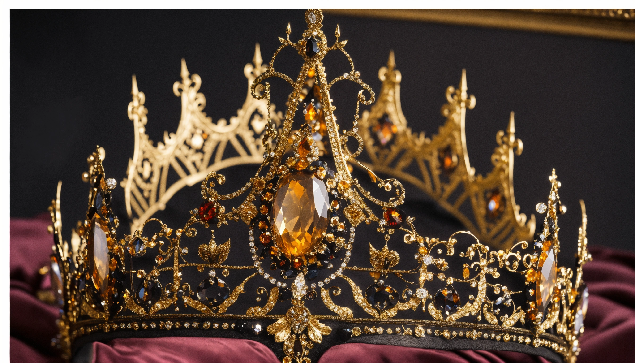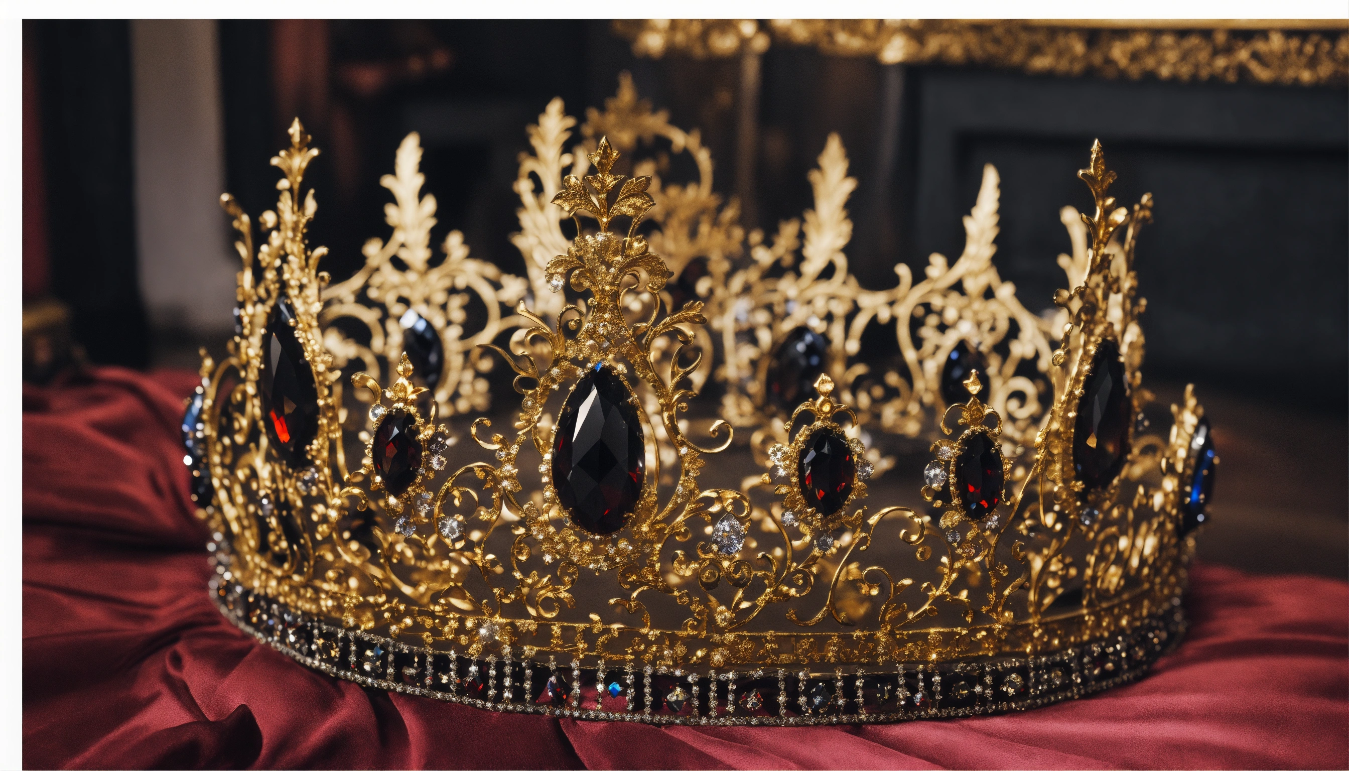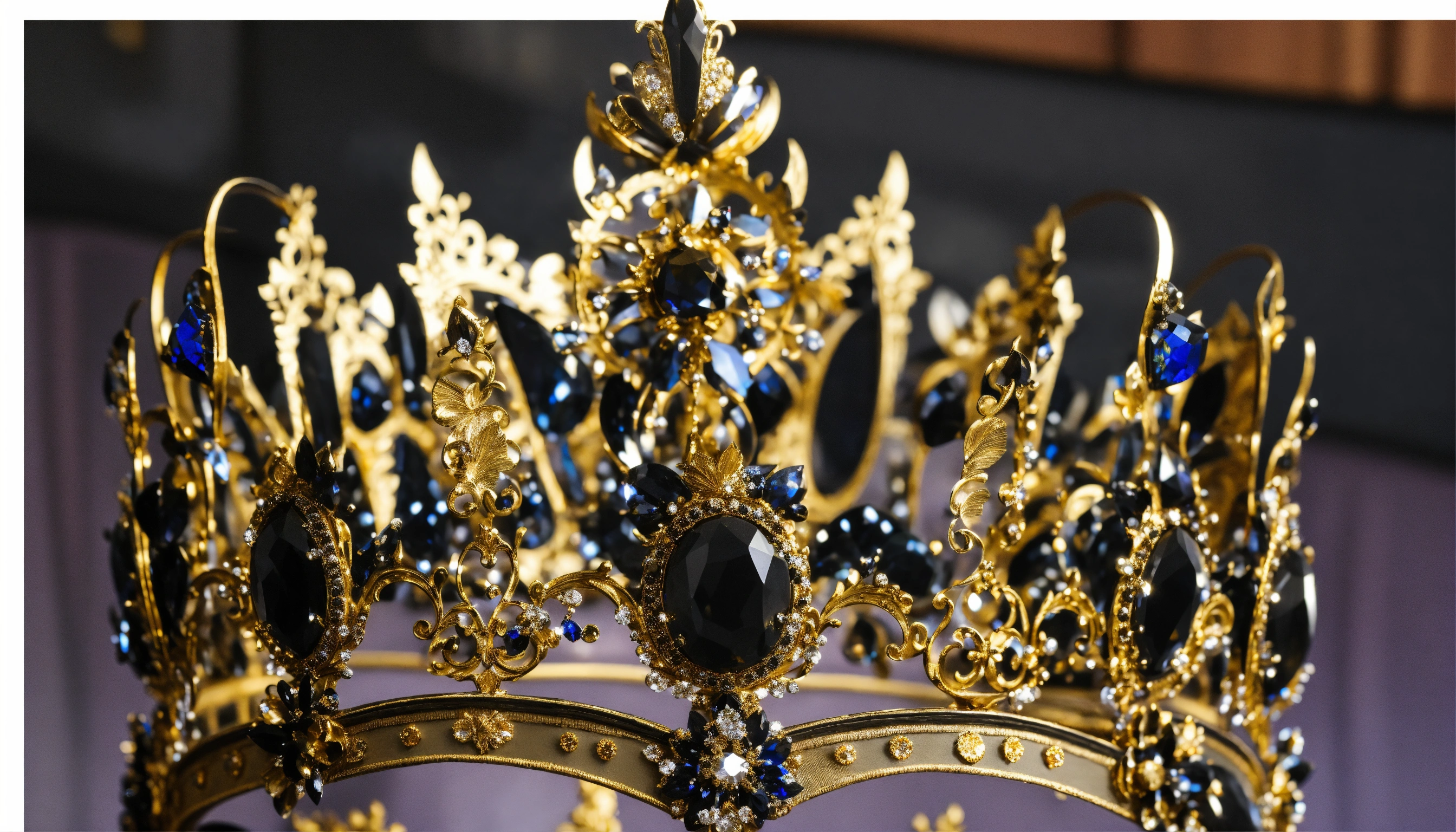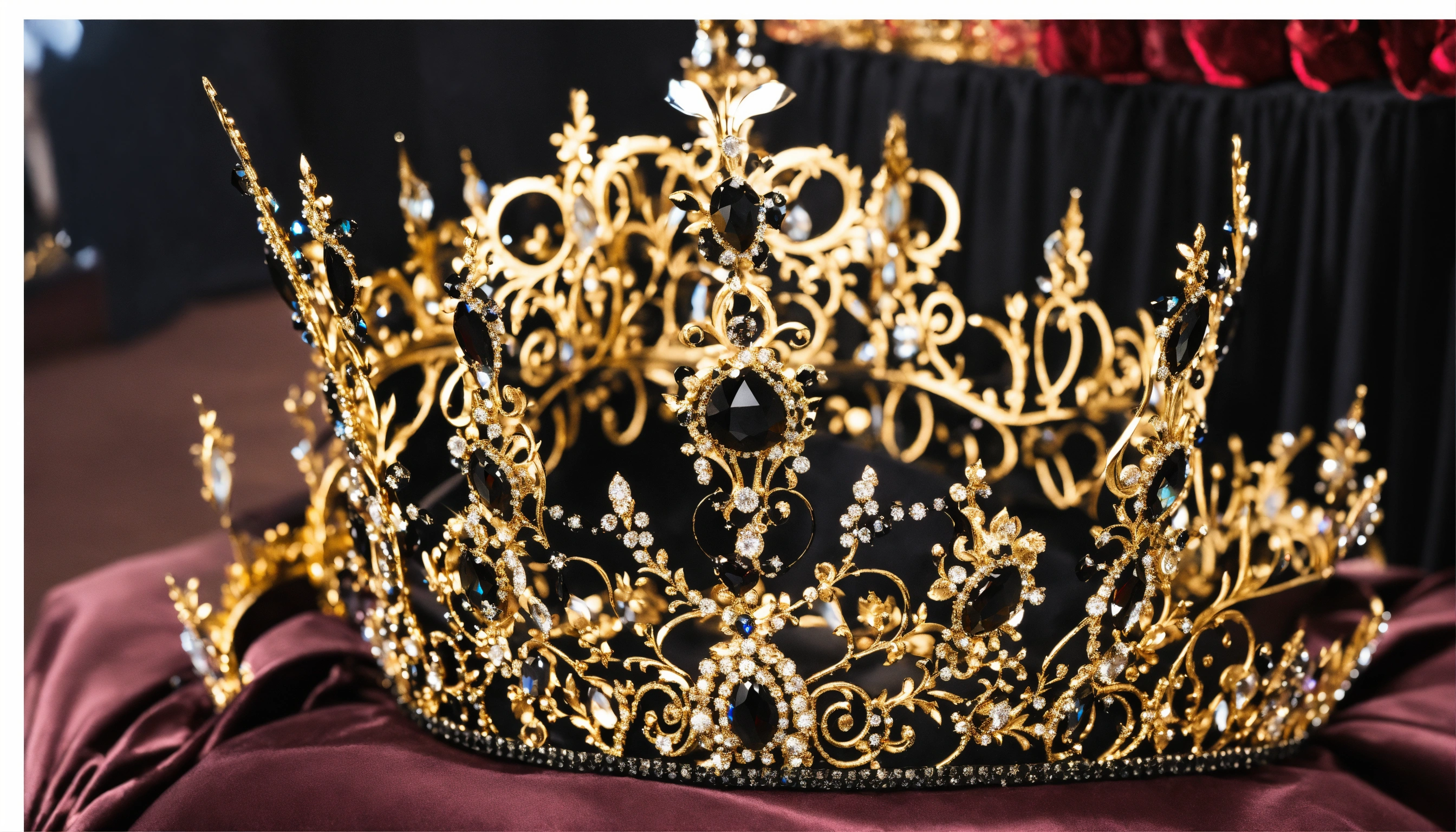 Extra tall over the top black and gold midevil victorian queen crown with wide arch adorned with crystals. long high peaks. perfectly fanned headpiece, for logo, 8k, hd