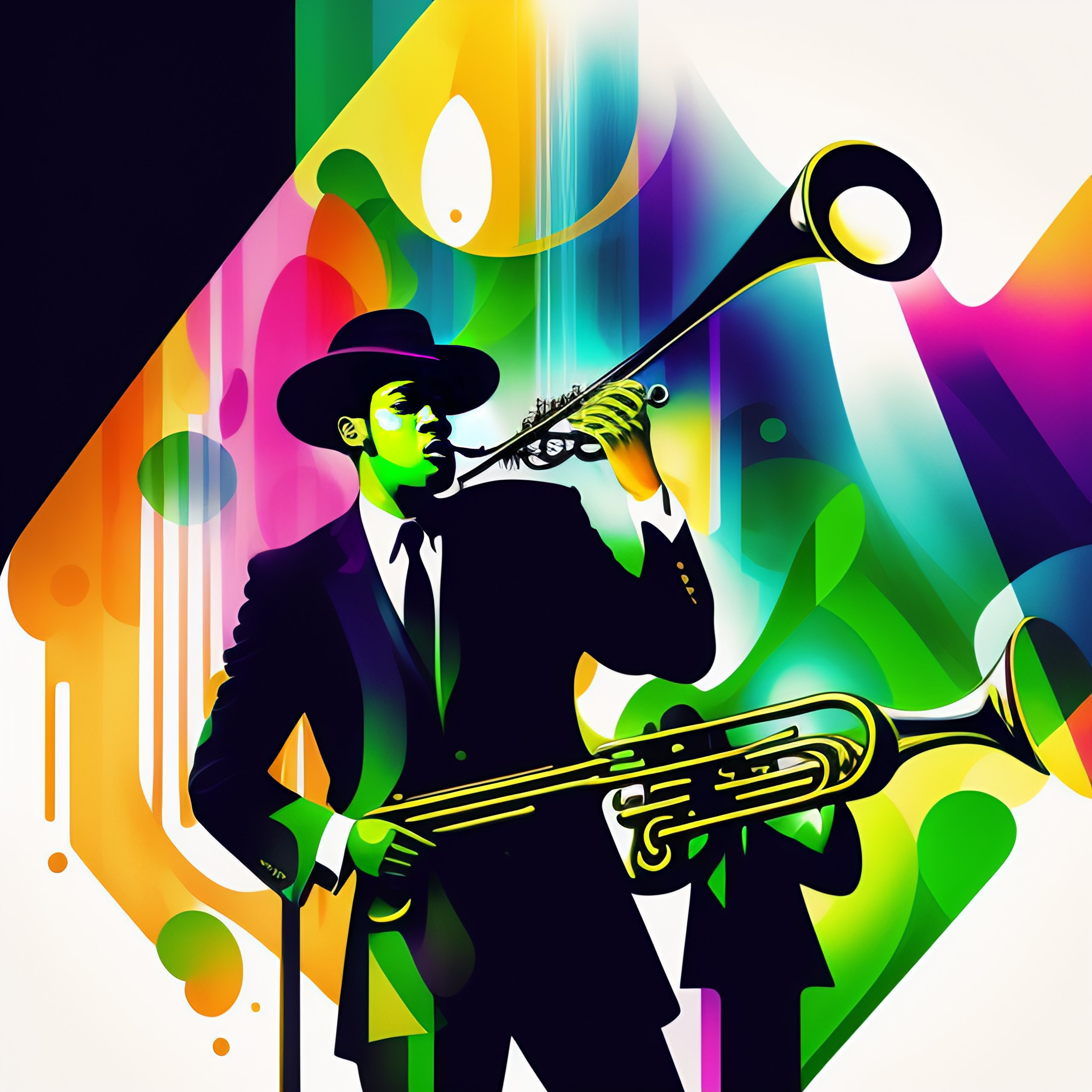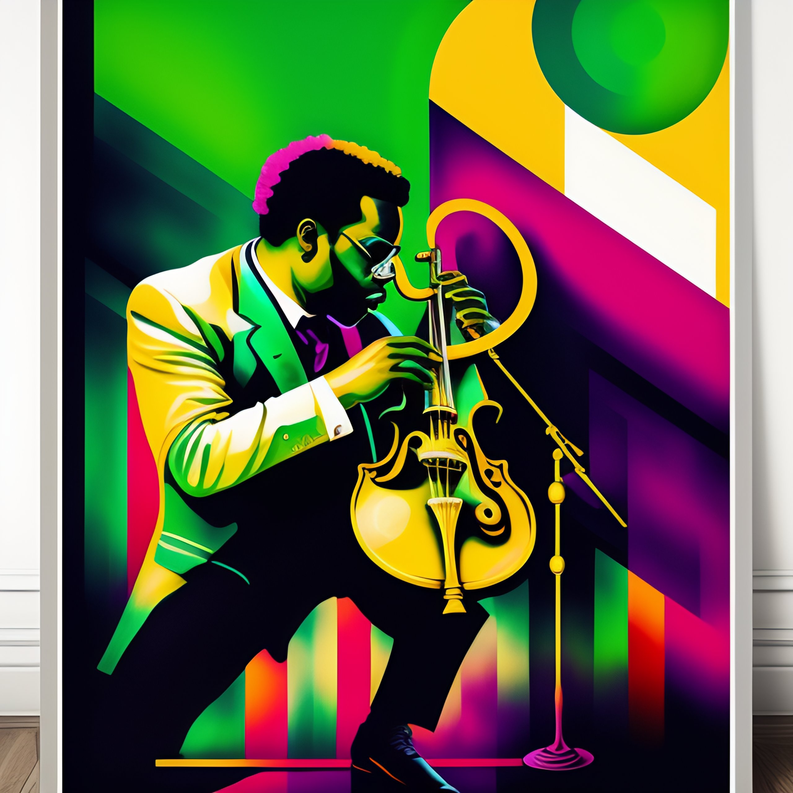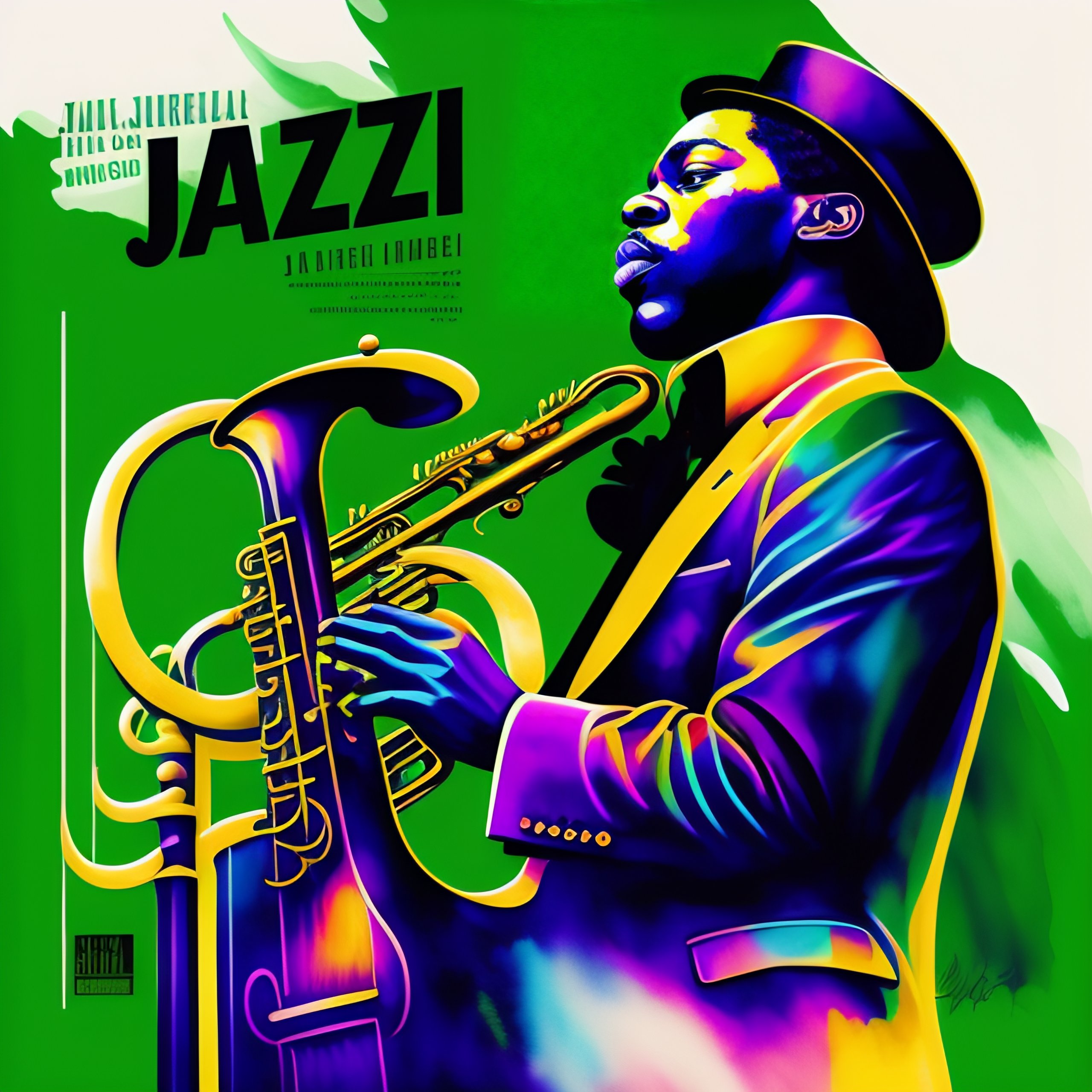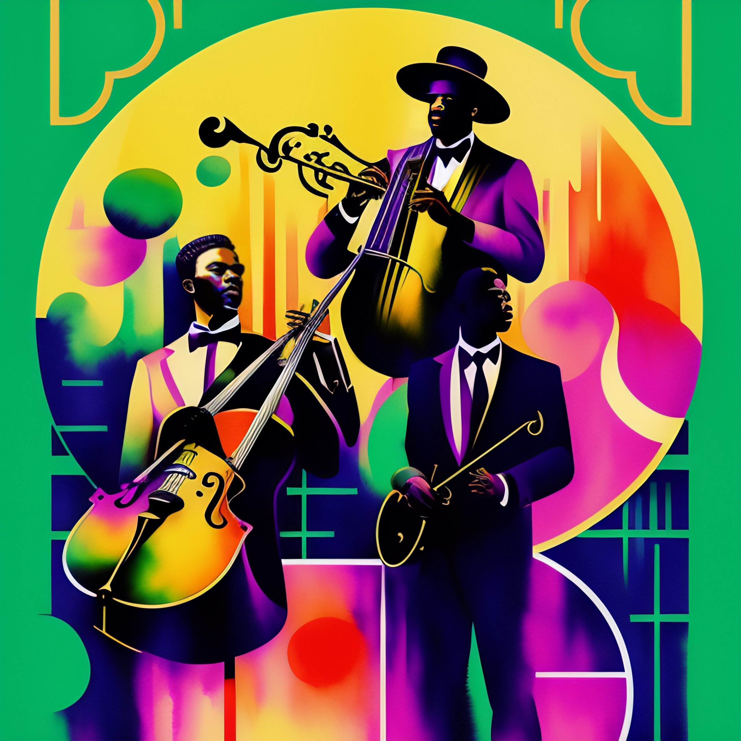 Jazz poster with a jazz band on a club stage in a performing expressive pose, drummer, saxophonist, trumpeter, double bassist and drummer, stylish watercolor, designer, green, asymmetrical, geometric shapes, graffiti, street art