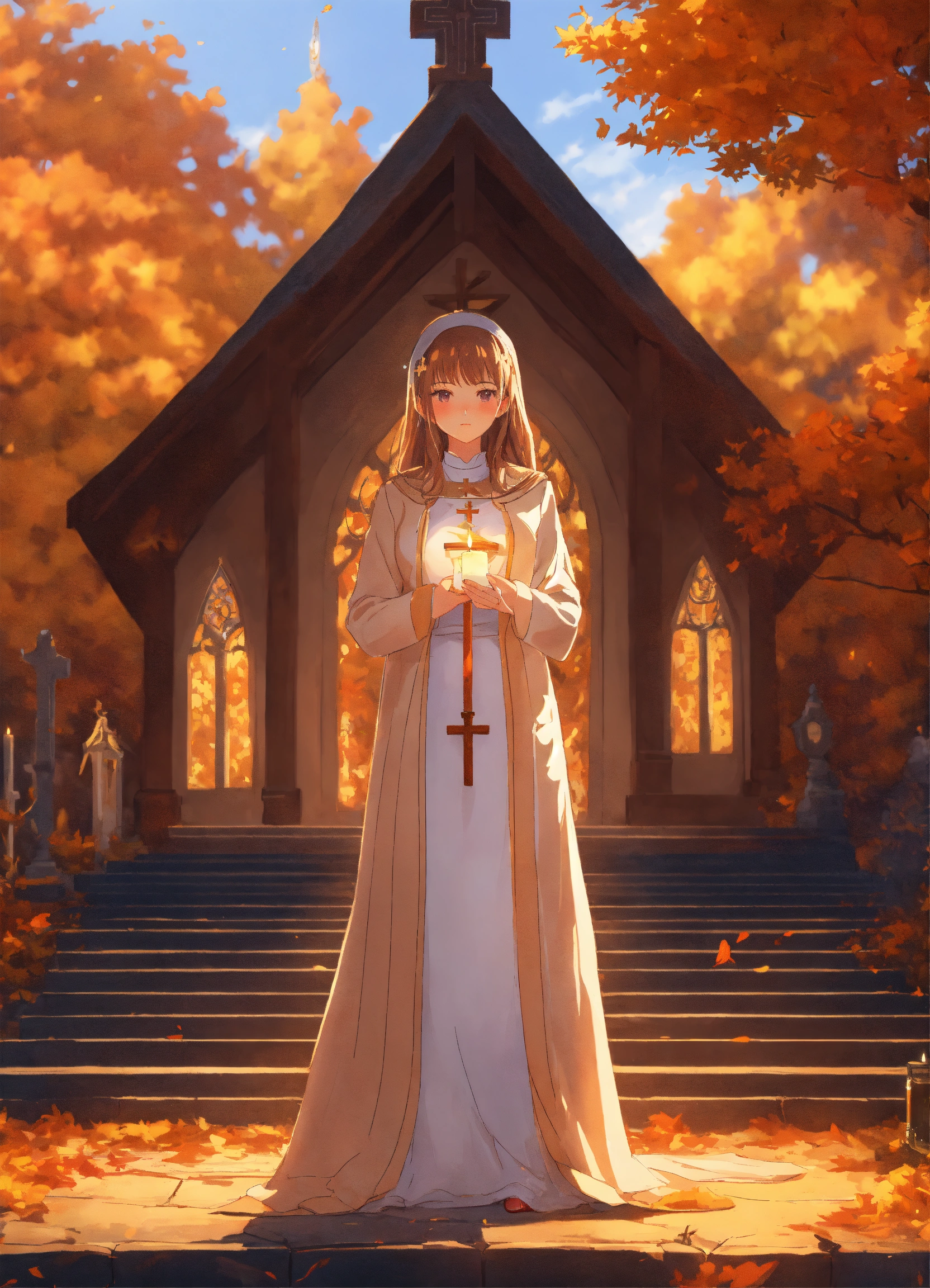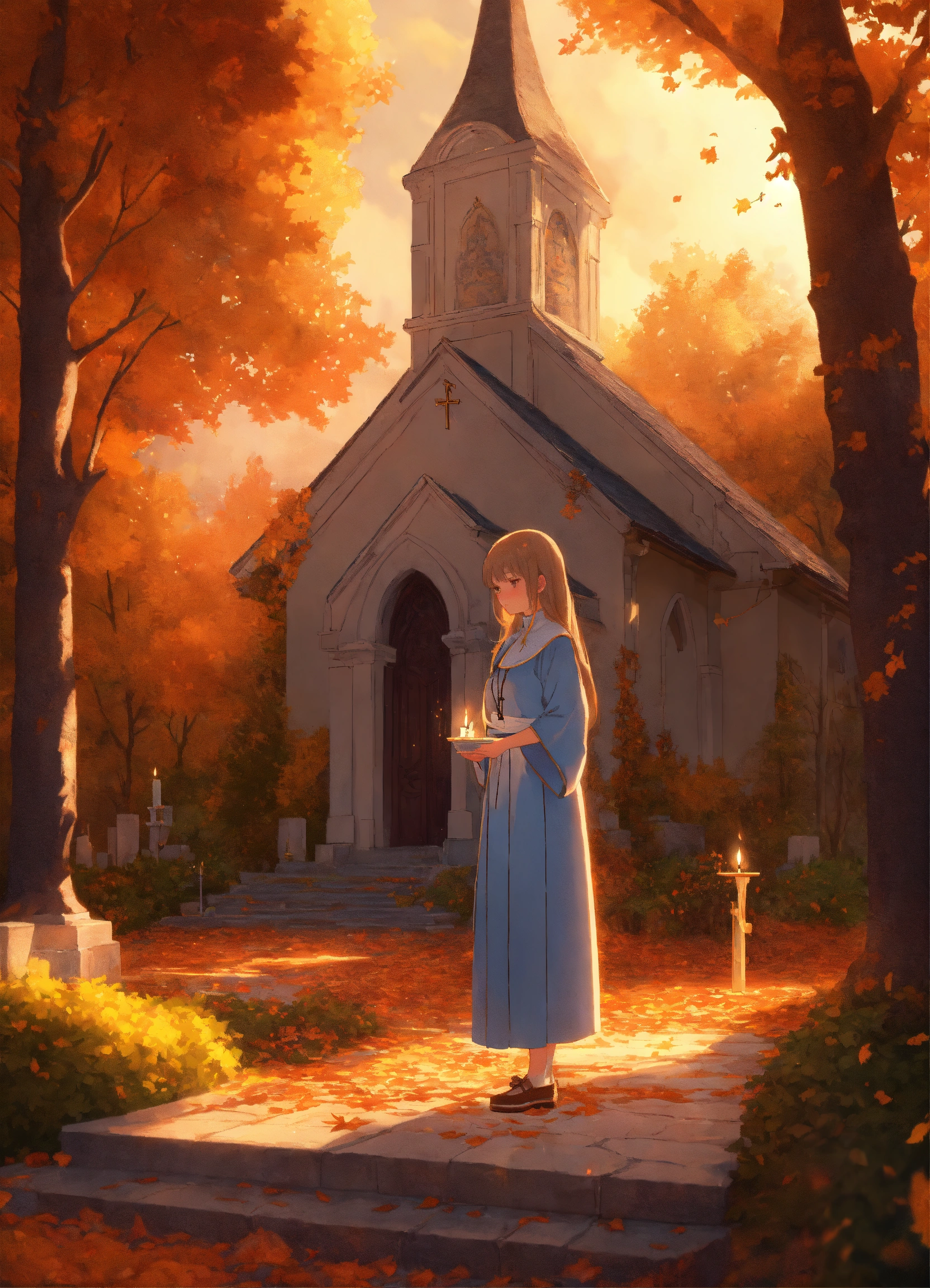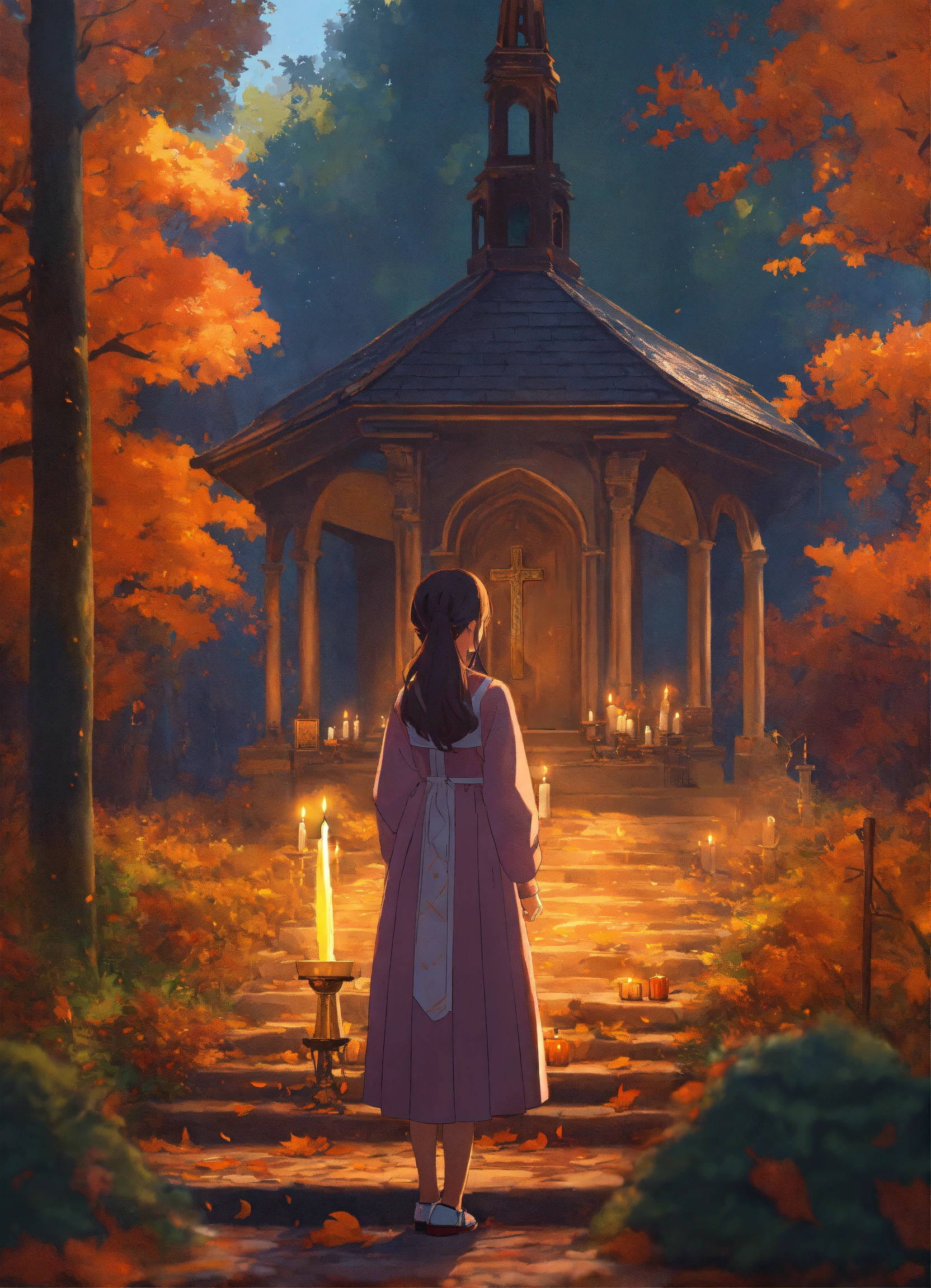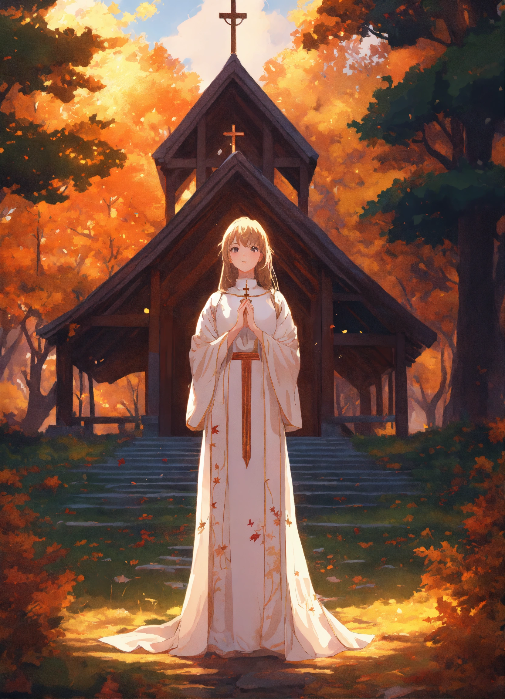 Anime art of a girl standing in an autumn forest near a christian shrine, incense rising from a candle, dusk, beautiful girl, dress, young girl, praying, detailed scene, stunning details, trending on artstation, outside a catholic church, sunny, ray-traced environment, vintage 90's anime artwork.