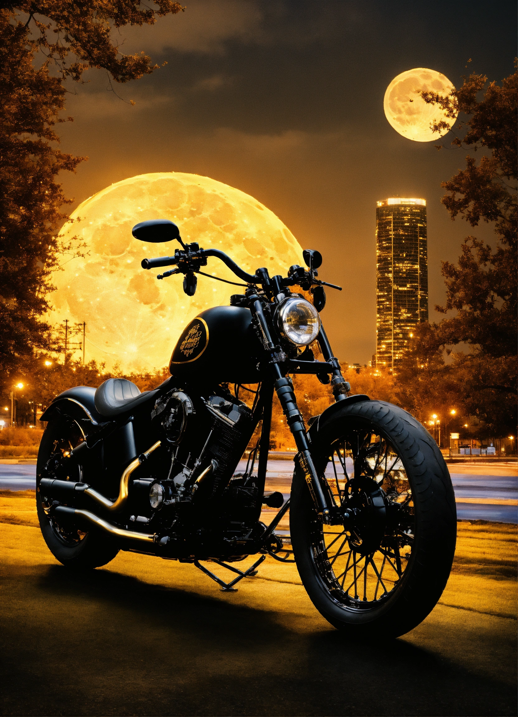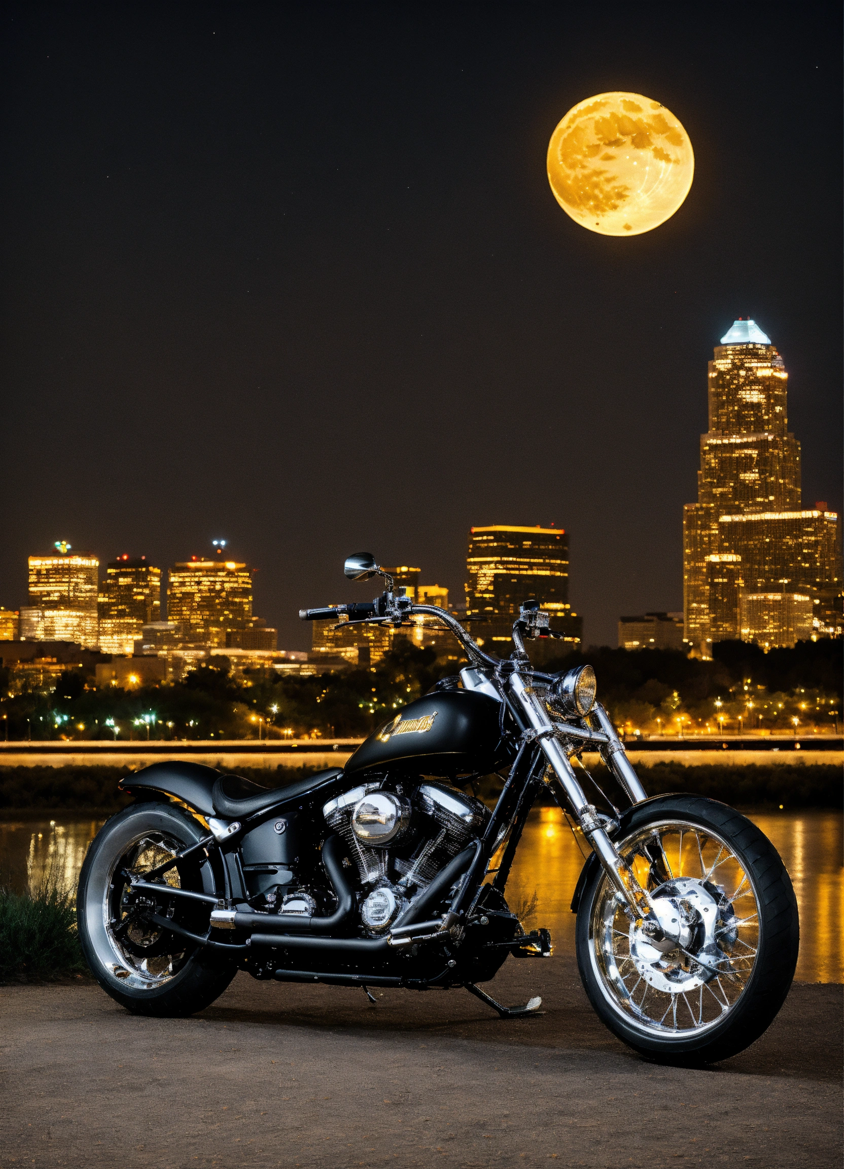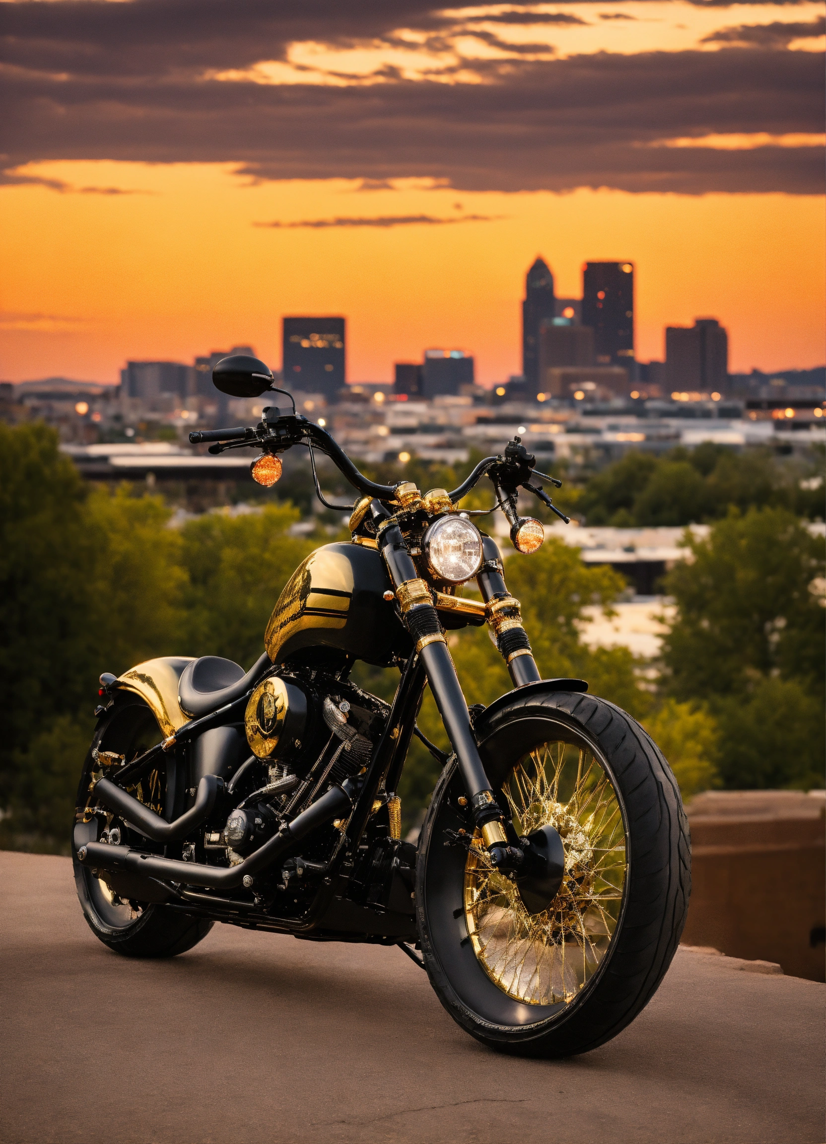 2023 arlington nuss choppers black and gold with downtown background and golden moonlight landscape