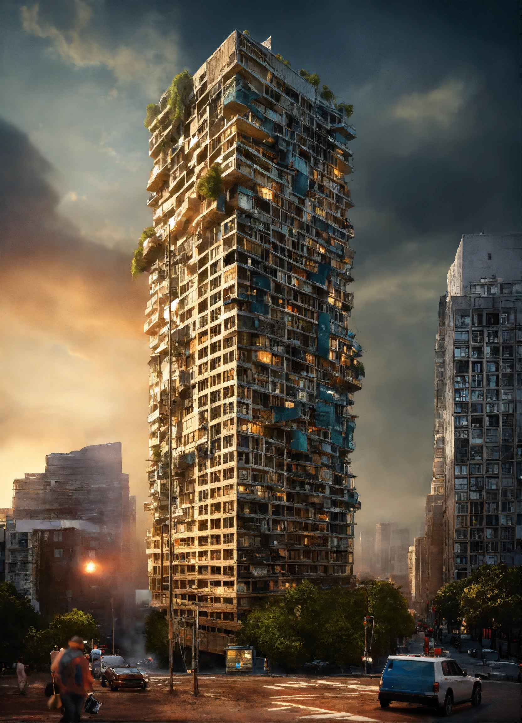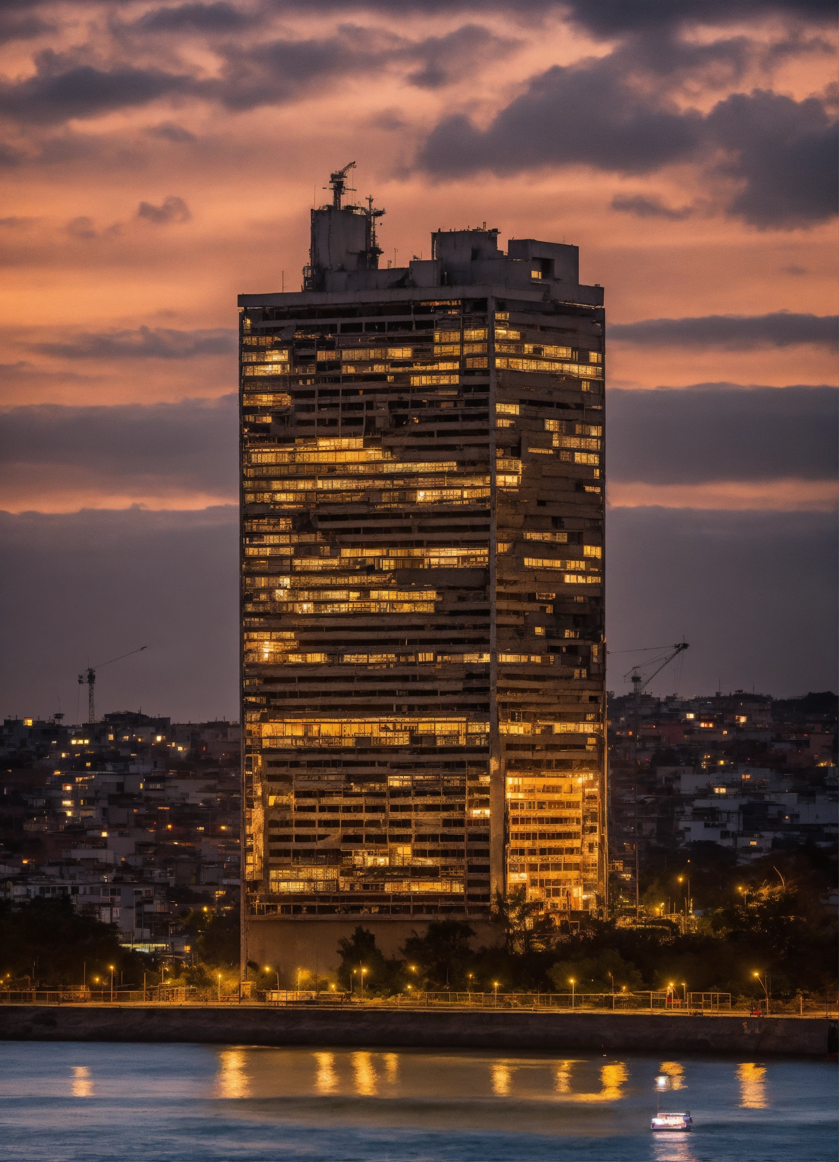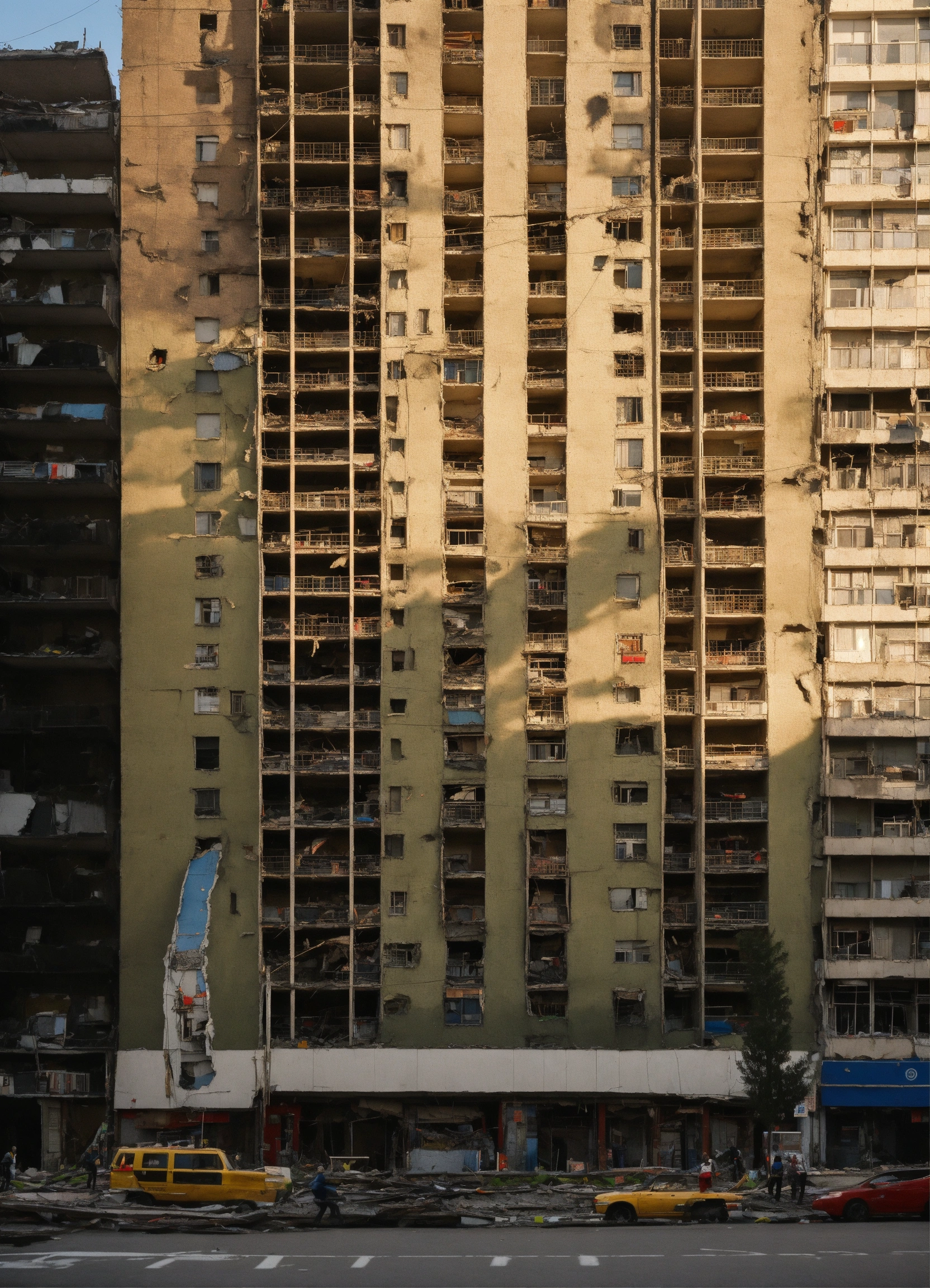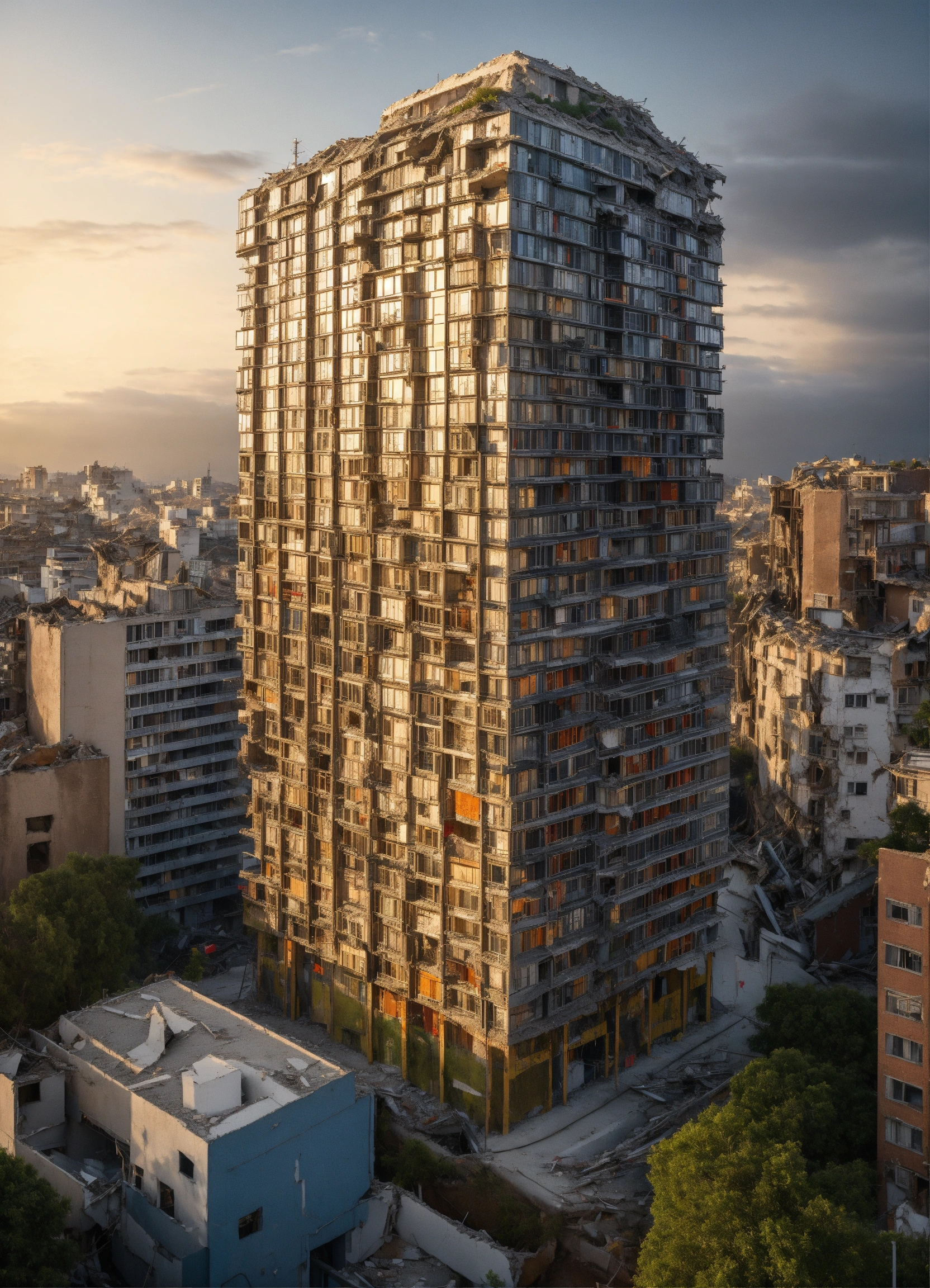 Un edificio de 20 pisos, moviendose por causa de un sismo, sin destruirse, sin gente corriendo, solo sensación de movimiento, fotorealista