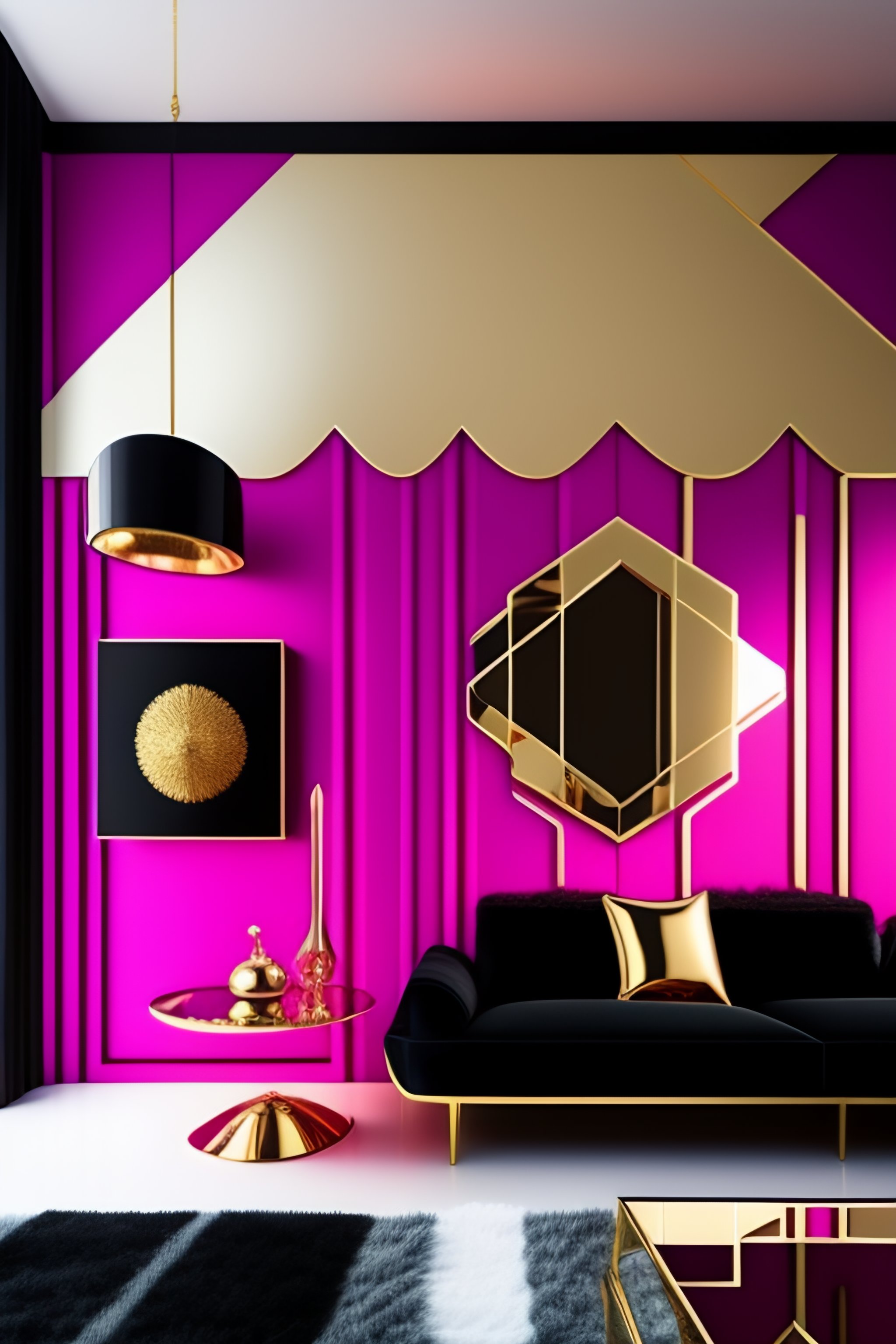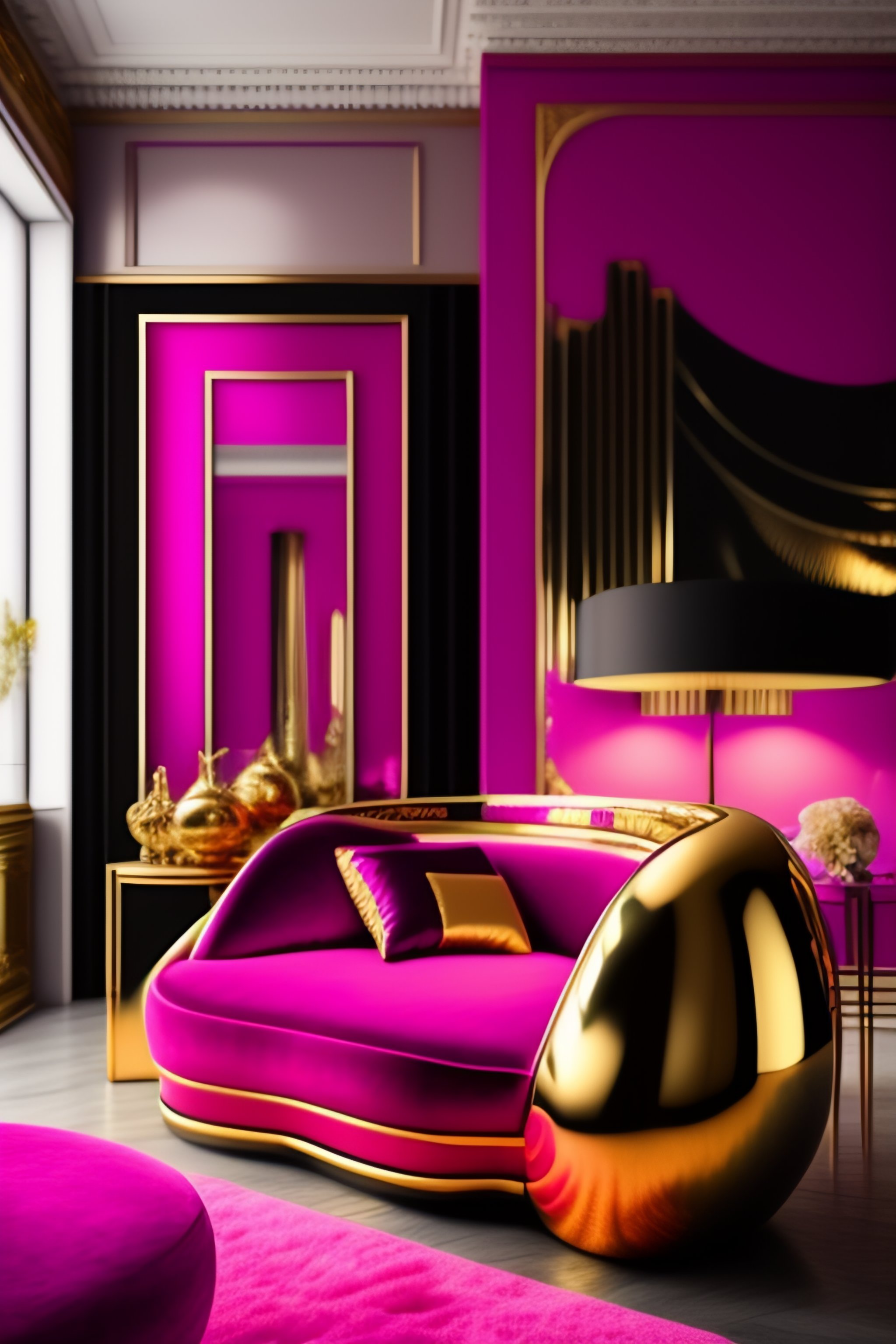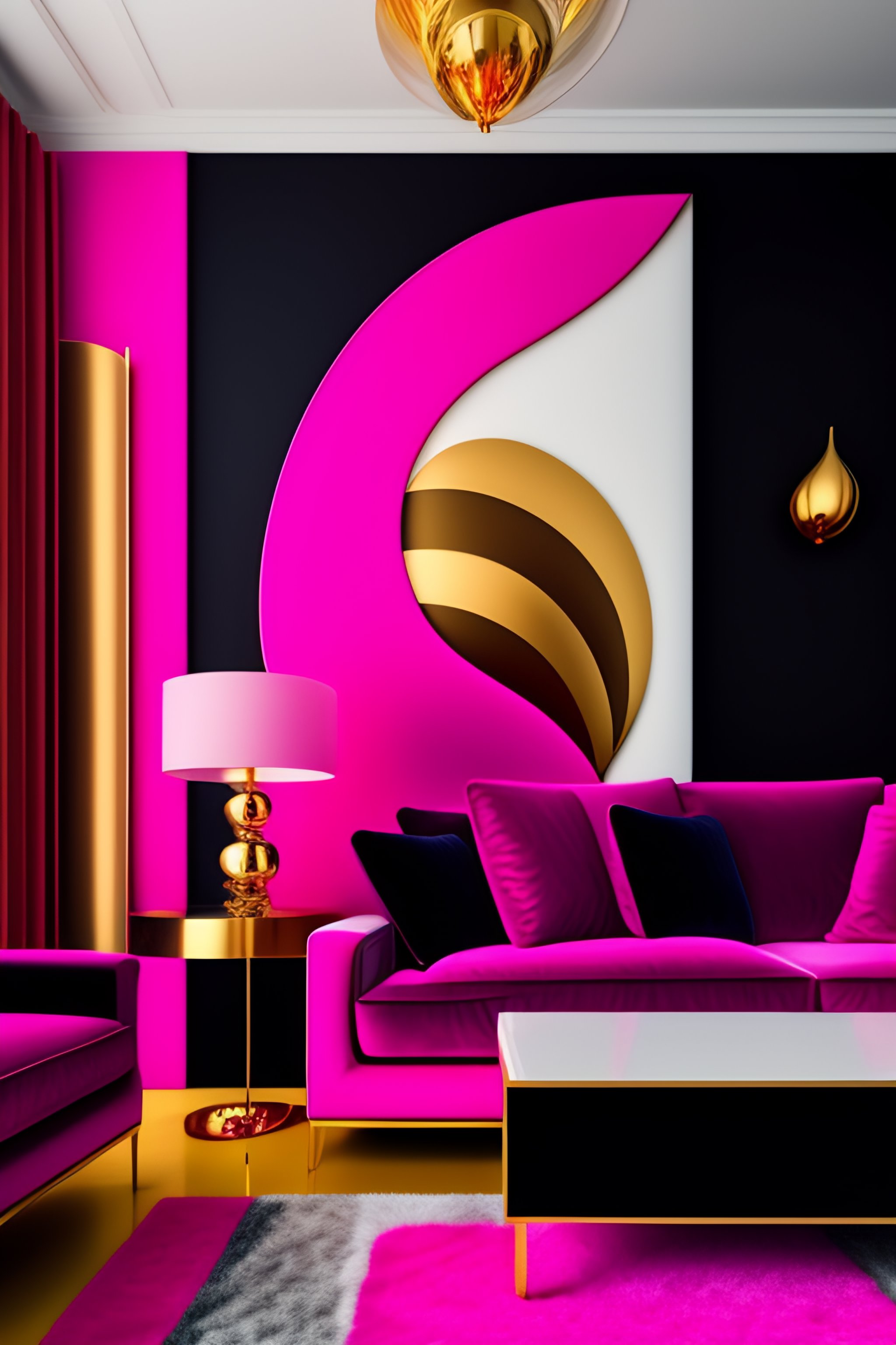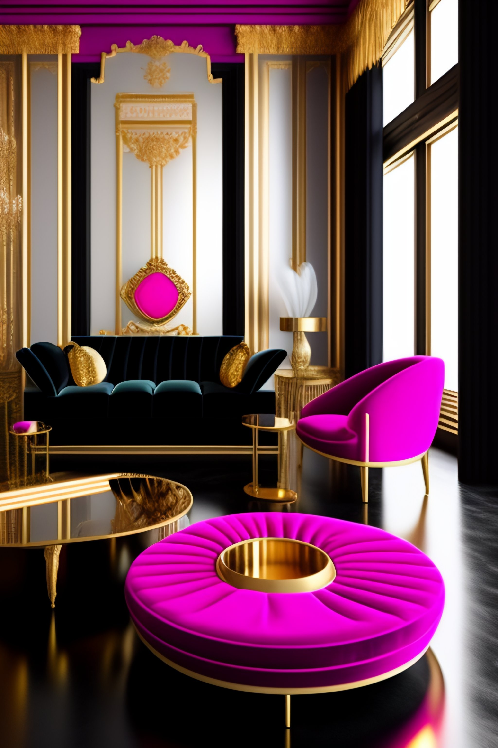 A home decor set based on the brand schiaparelli, shocking pink, black ans gold and surrealism, classic, living room, partisan white