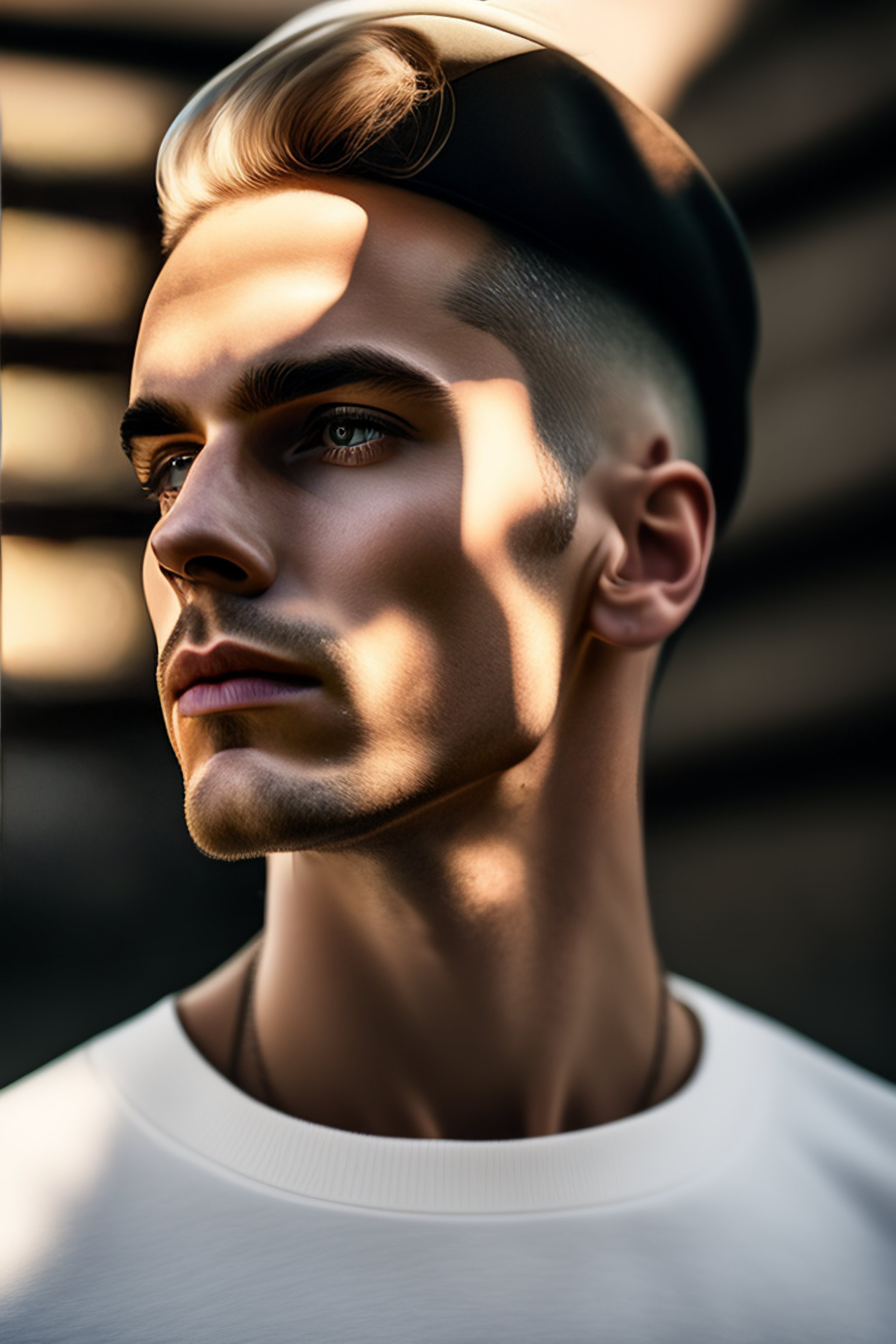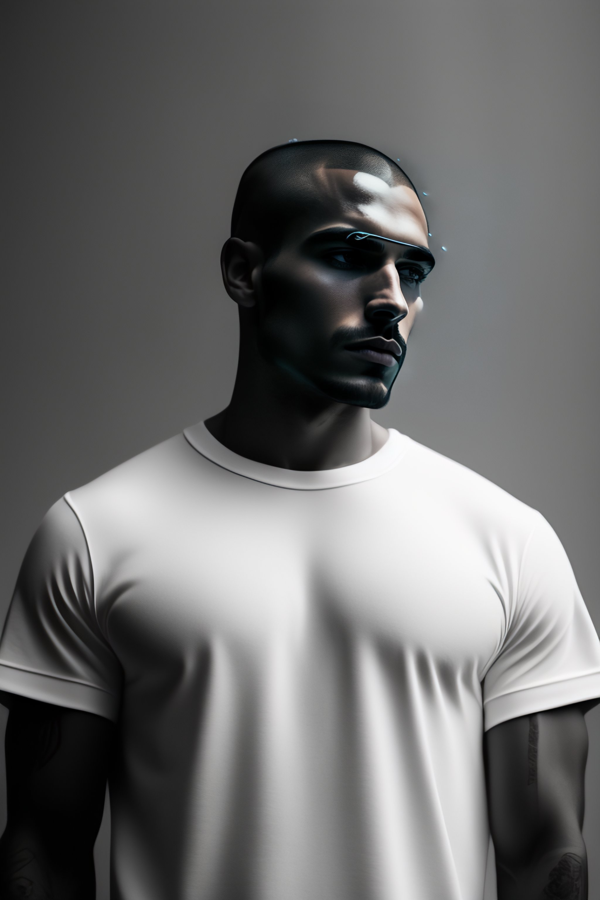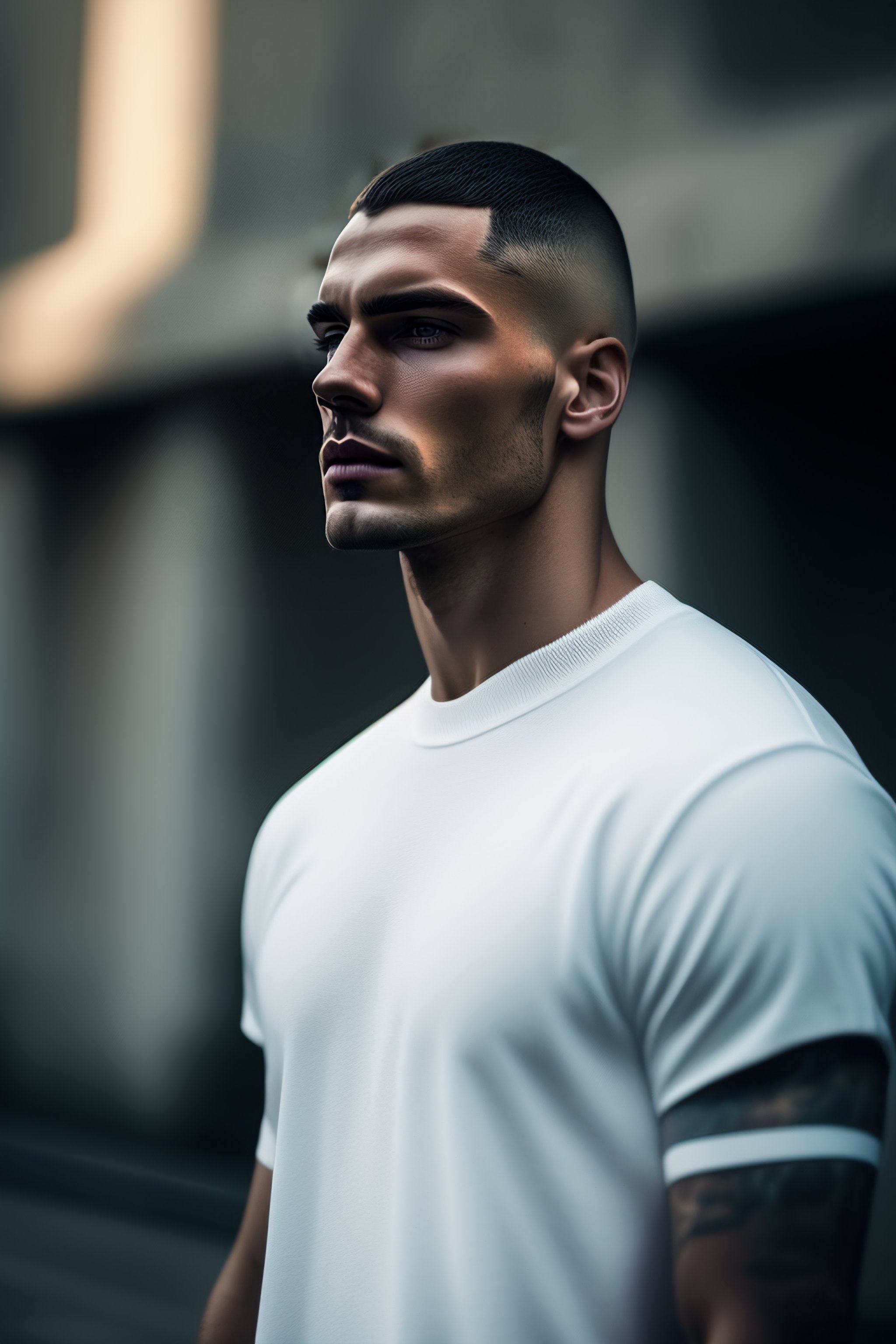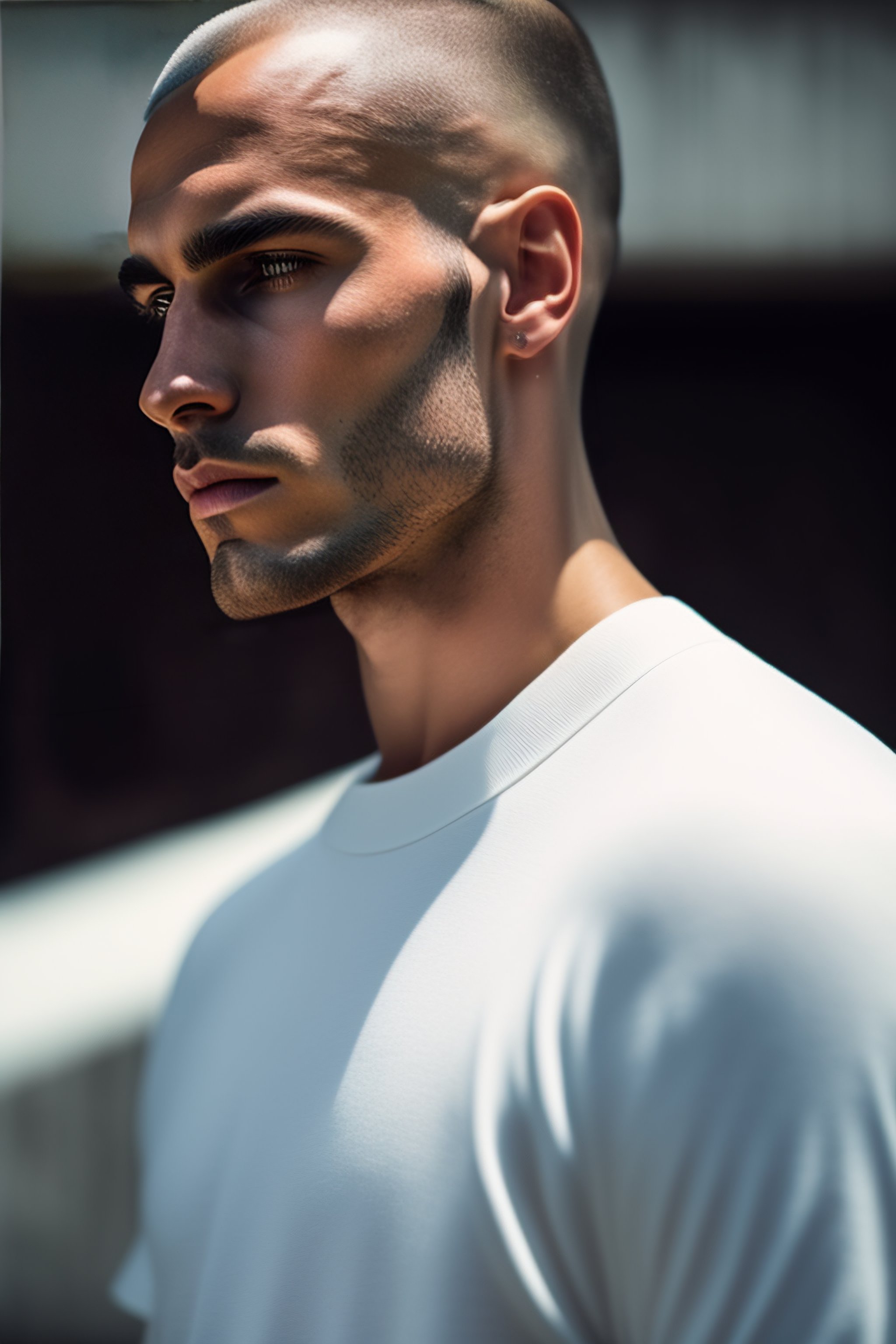 A 30-year-old skinhead, without a beard and mustache, looks through the collar of a white t-shirt, ethereal dreamy foggy, photoshoot by alessio albi, editorial fashion magazine photoshoot, fashion poses, in front of brutalist building architecture. kinfolk magazine. film grain.