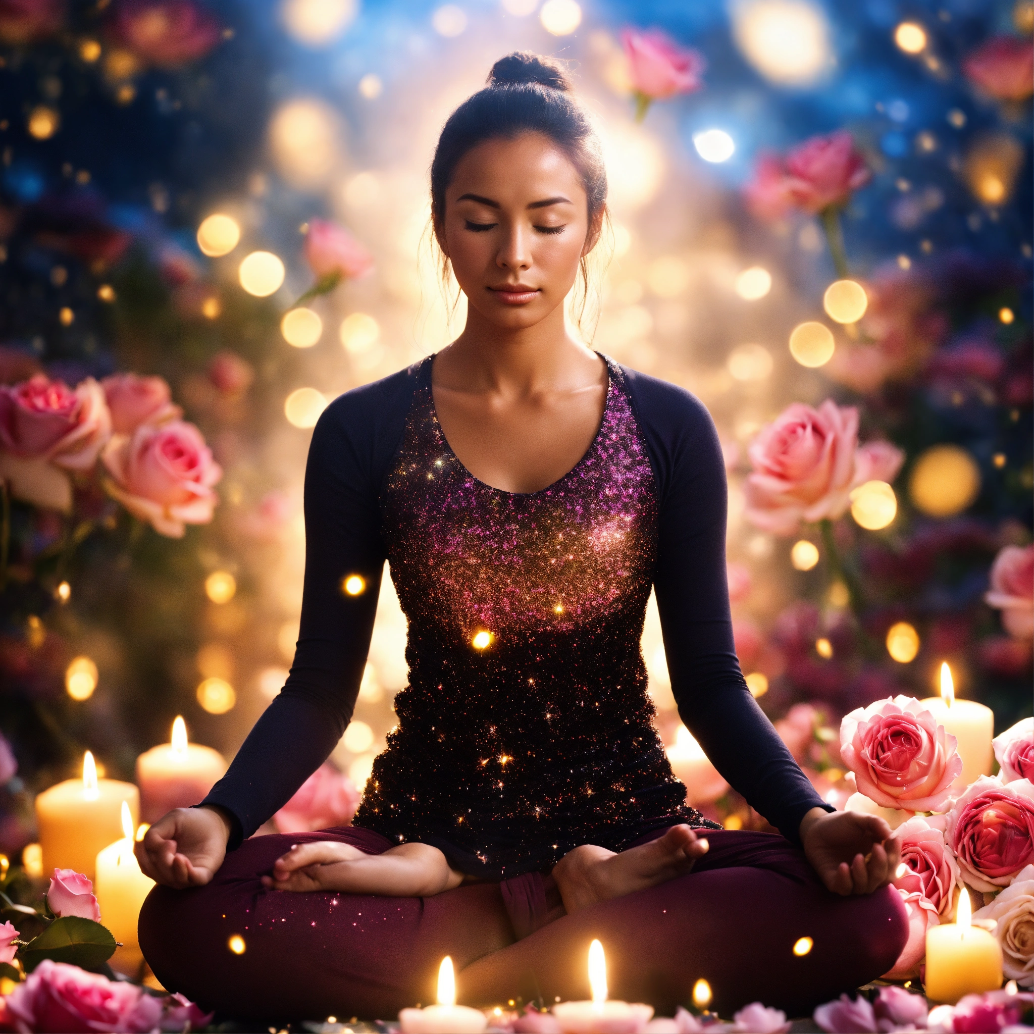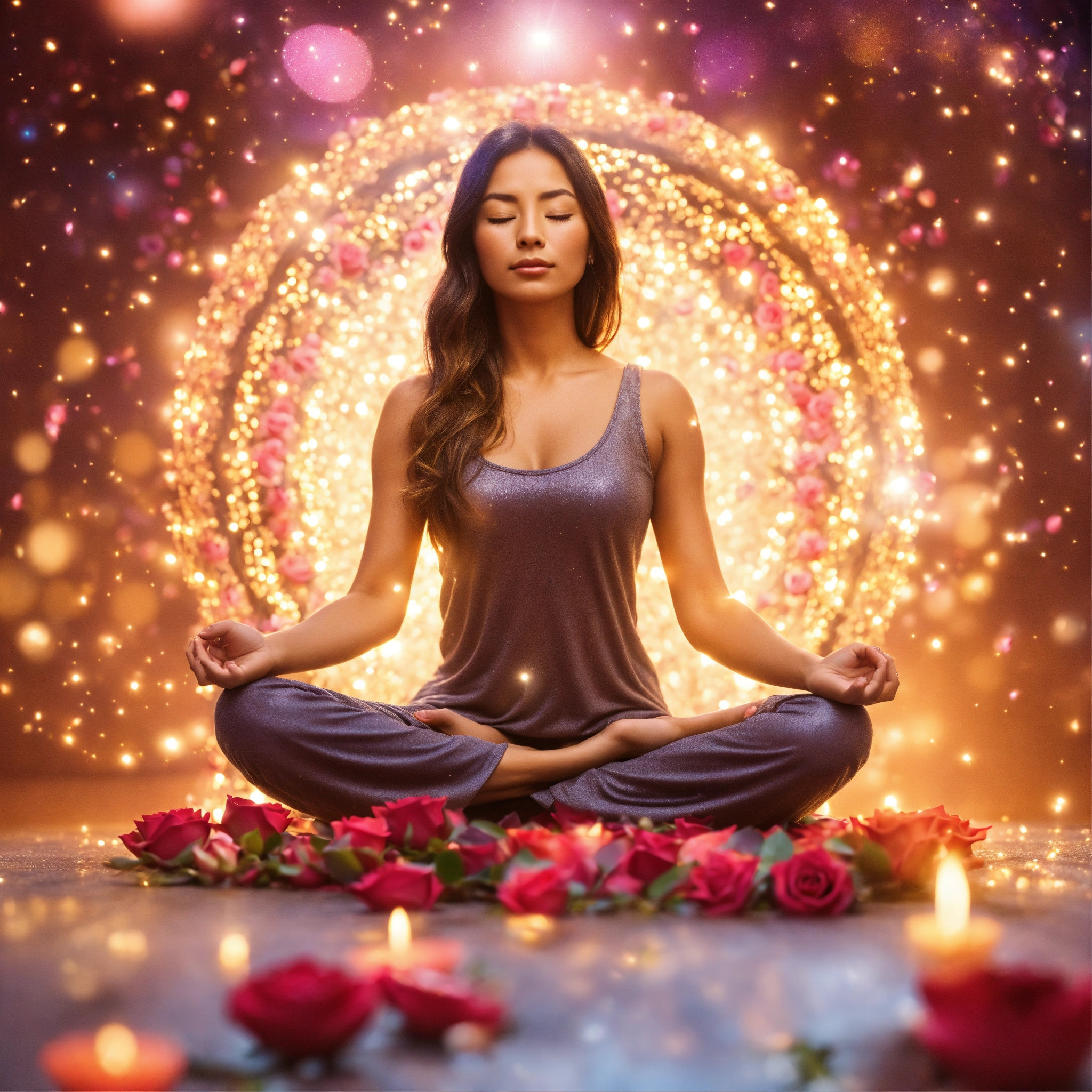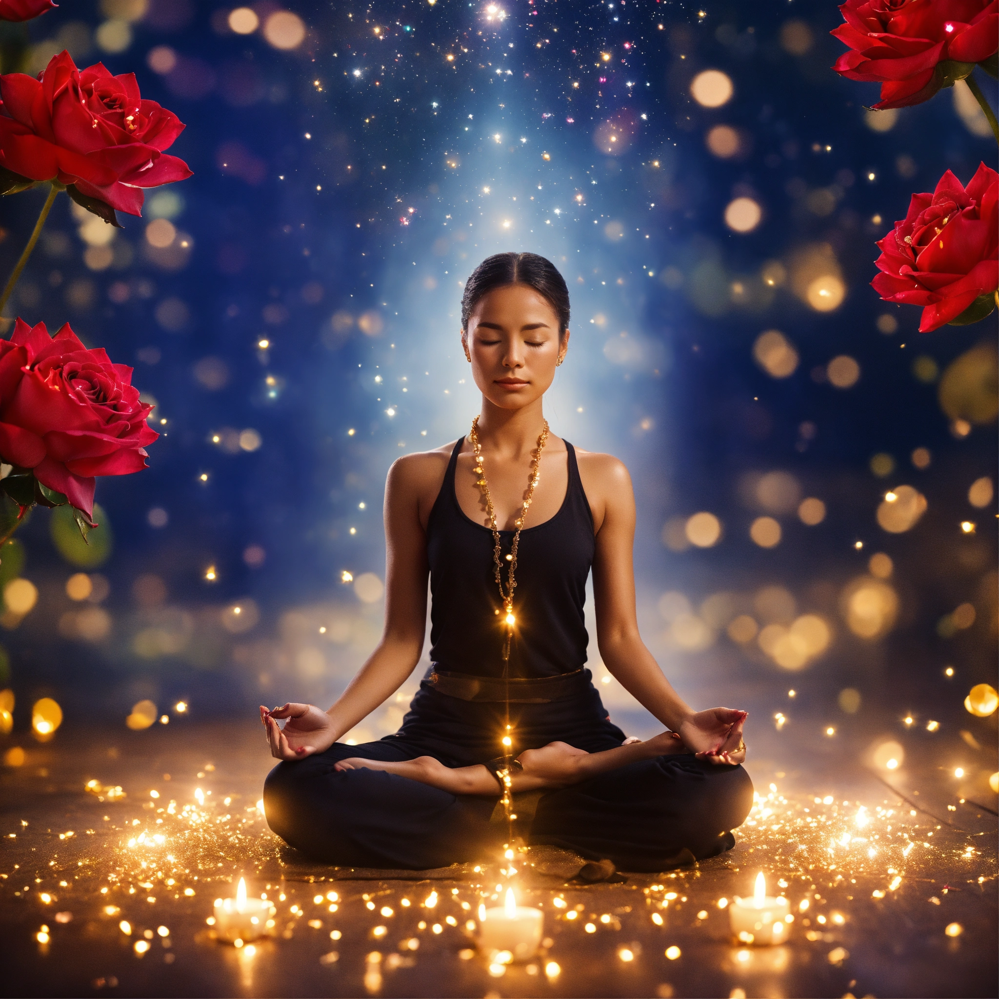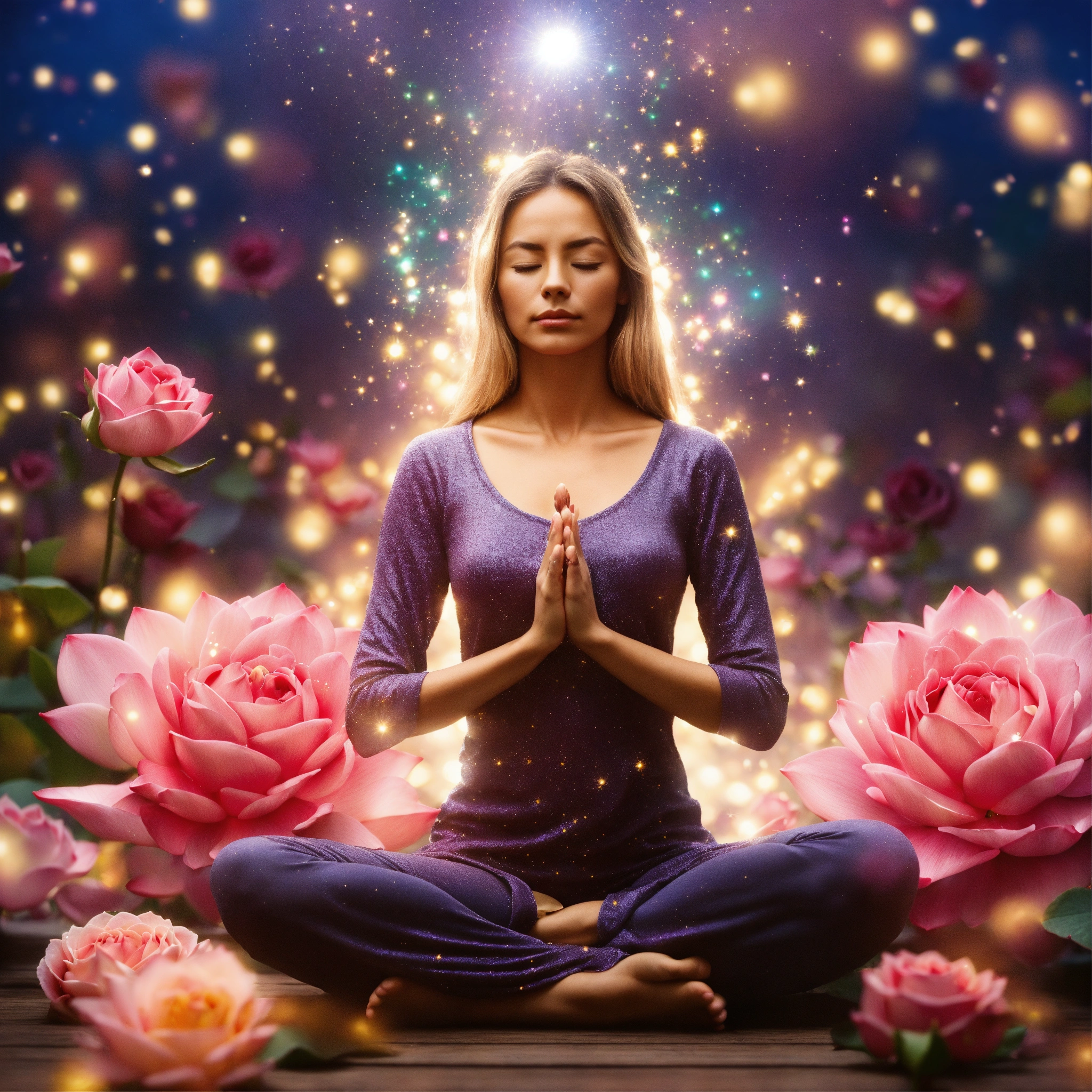 A beautiful person seated in lotus position with the eyes closed in meditation, lots of light sparkles and roses in the background