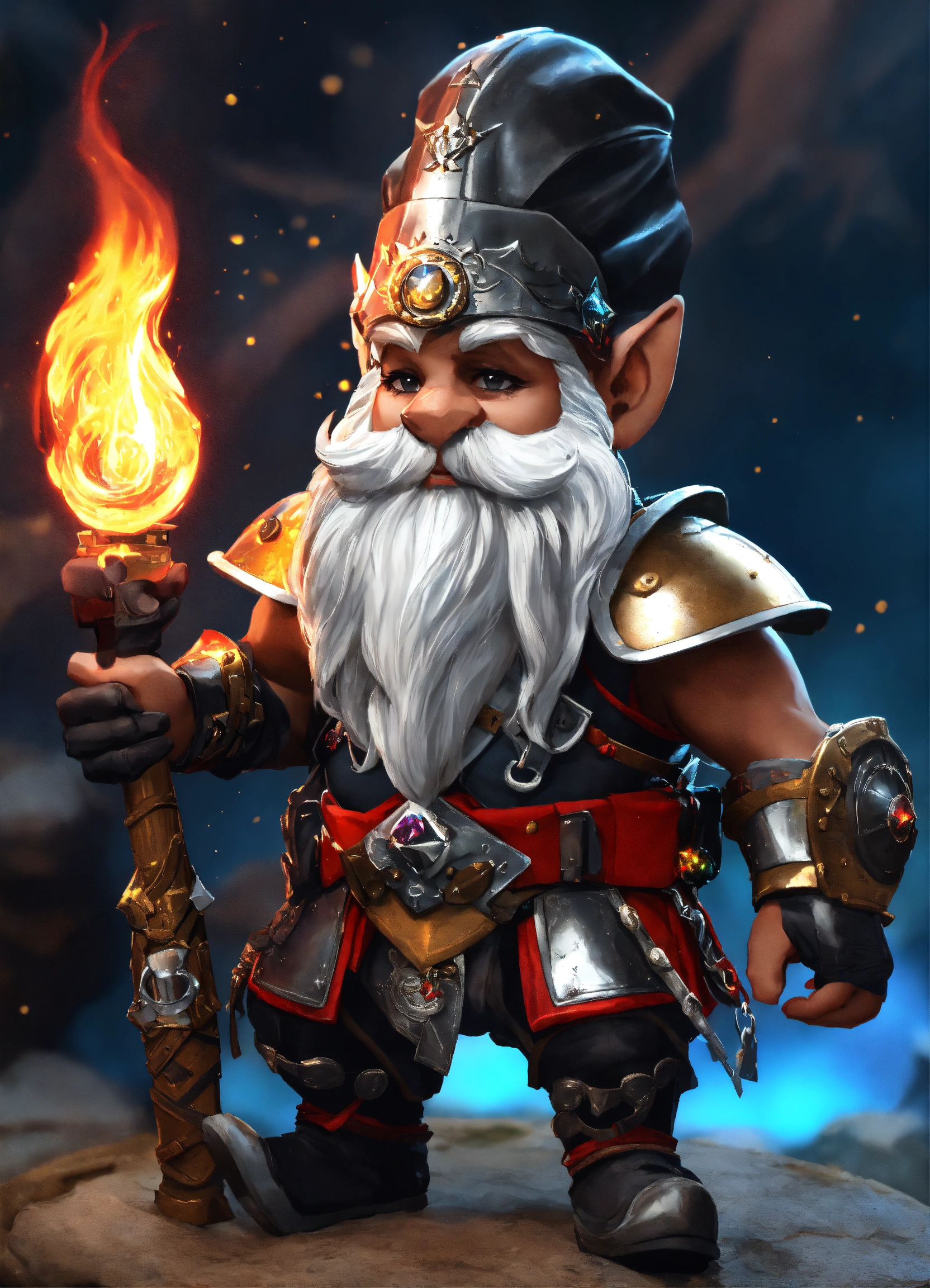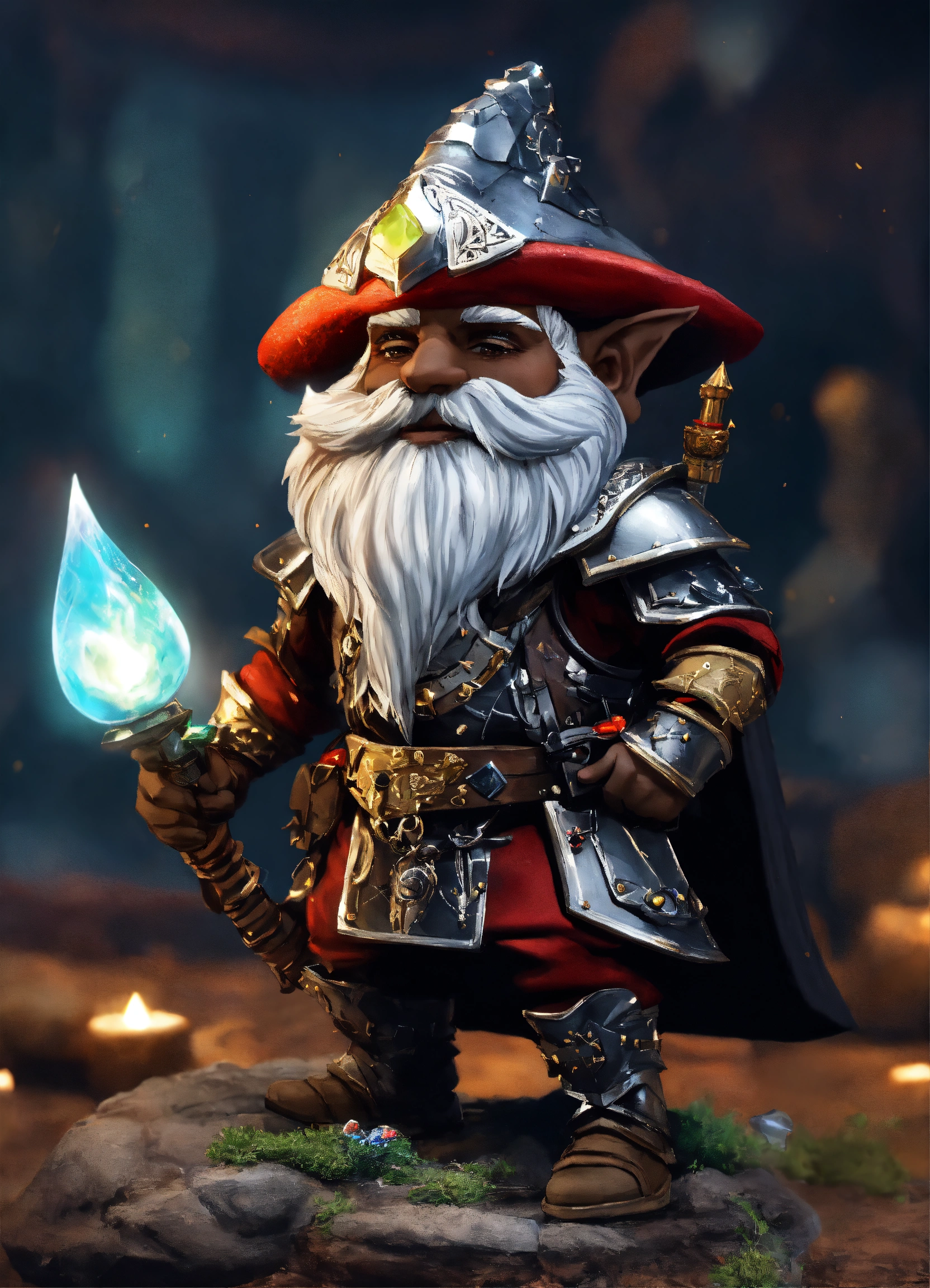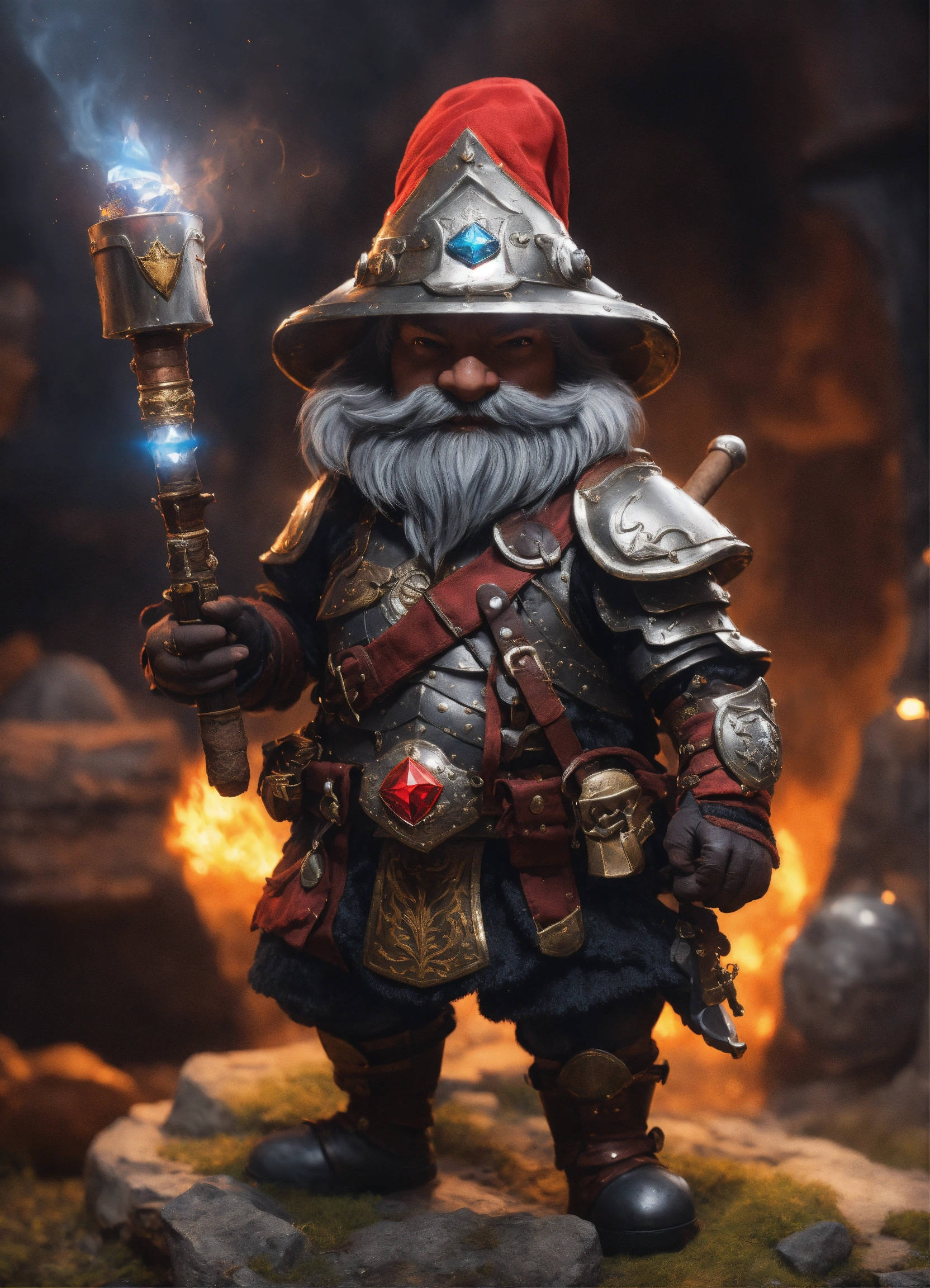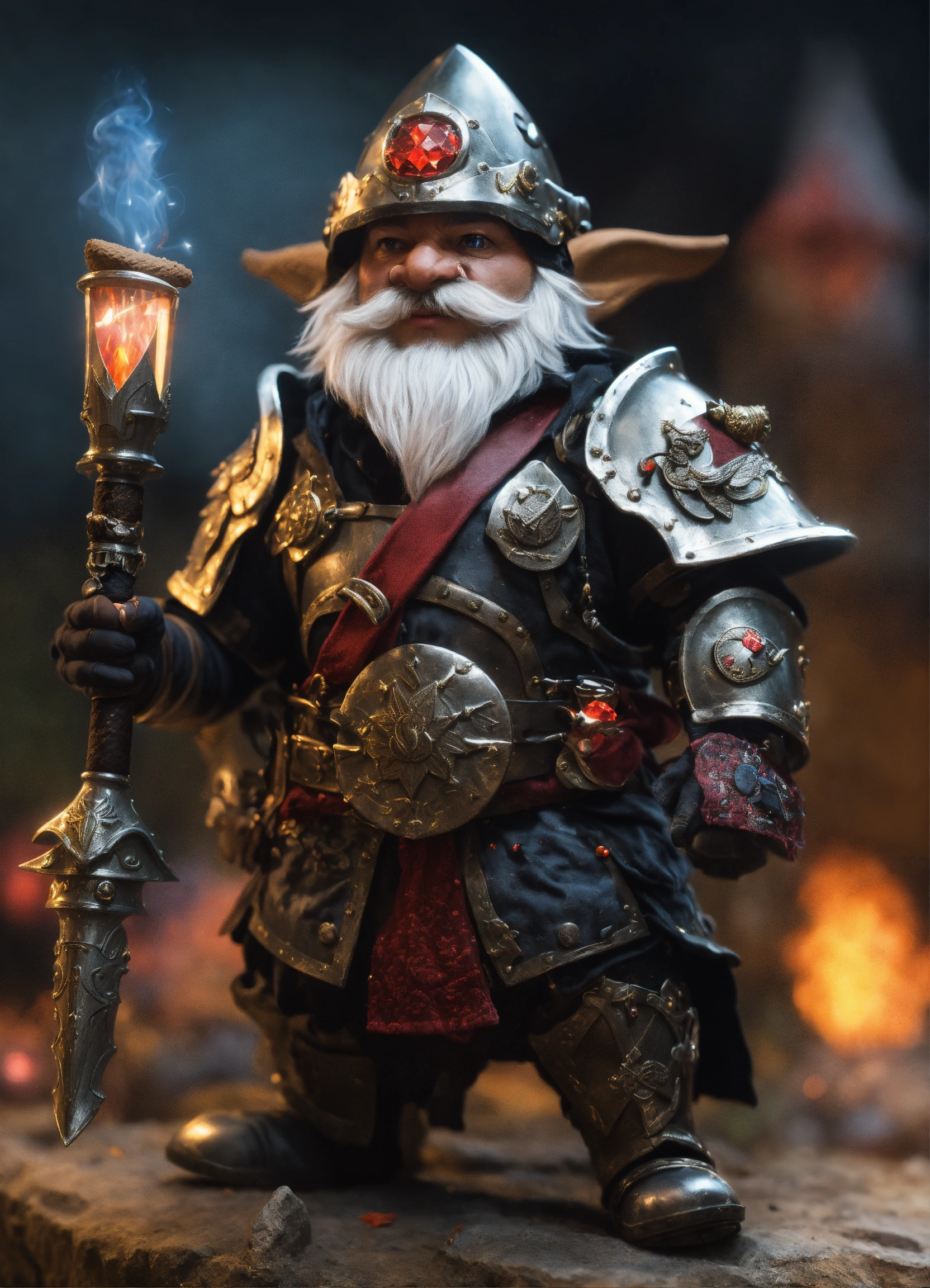 Armorer artificer rock gnome with black skin, on a heavy dark magical homemade armor, magic pulsing through the armor, wearing black medieval visor on a helmet, combat breastplate, holding a cigar, silver gloves with gems, hint of red