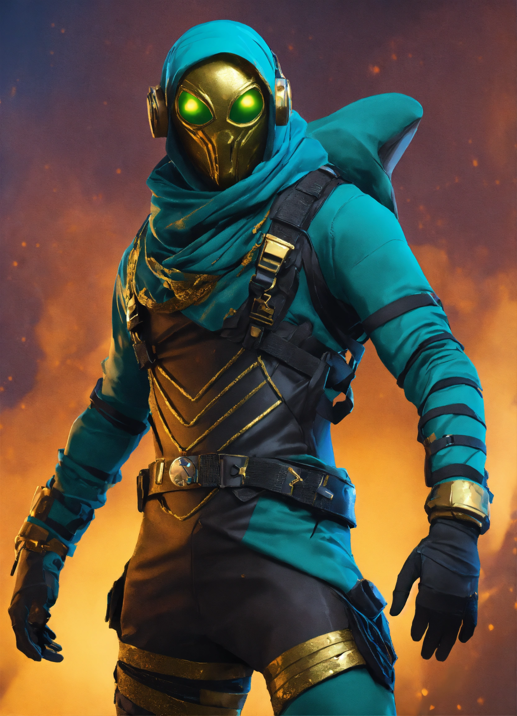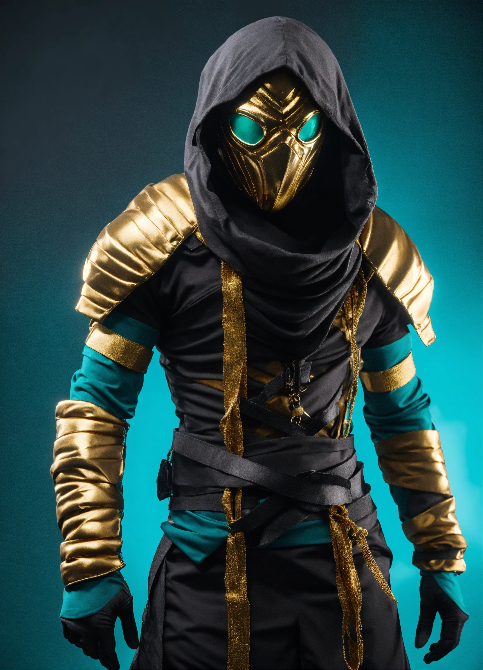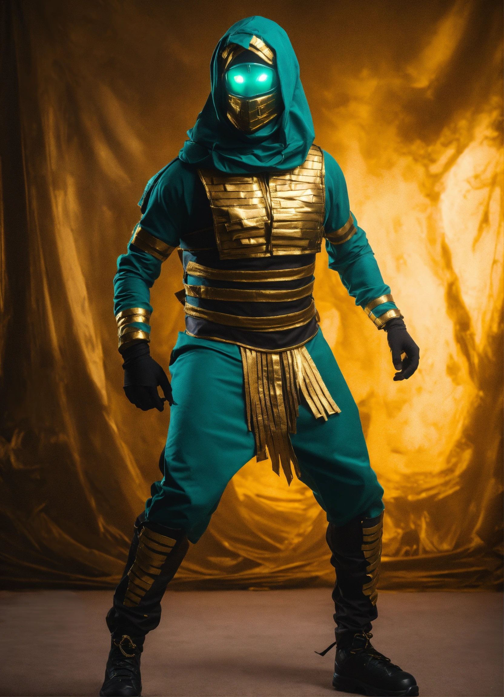 Black is a color associated with mystery and depth a photograph alien race mumie costume full face mask decoreted with gold and dark teal covered in bandages for a male character, fortnite style, halloween costume, walking pose full body wide shot, simple backdrop