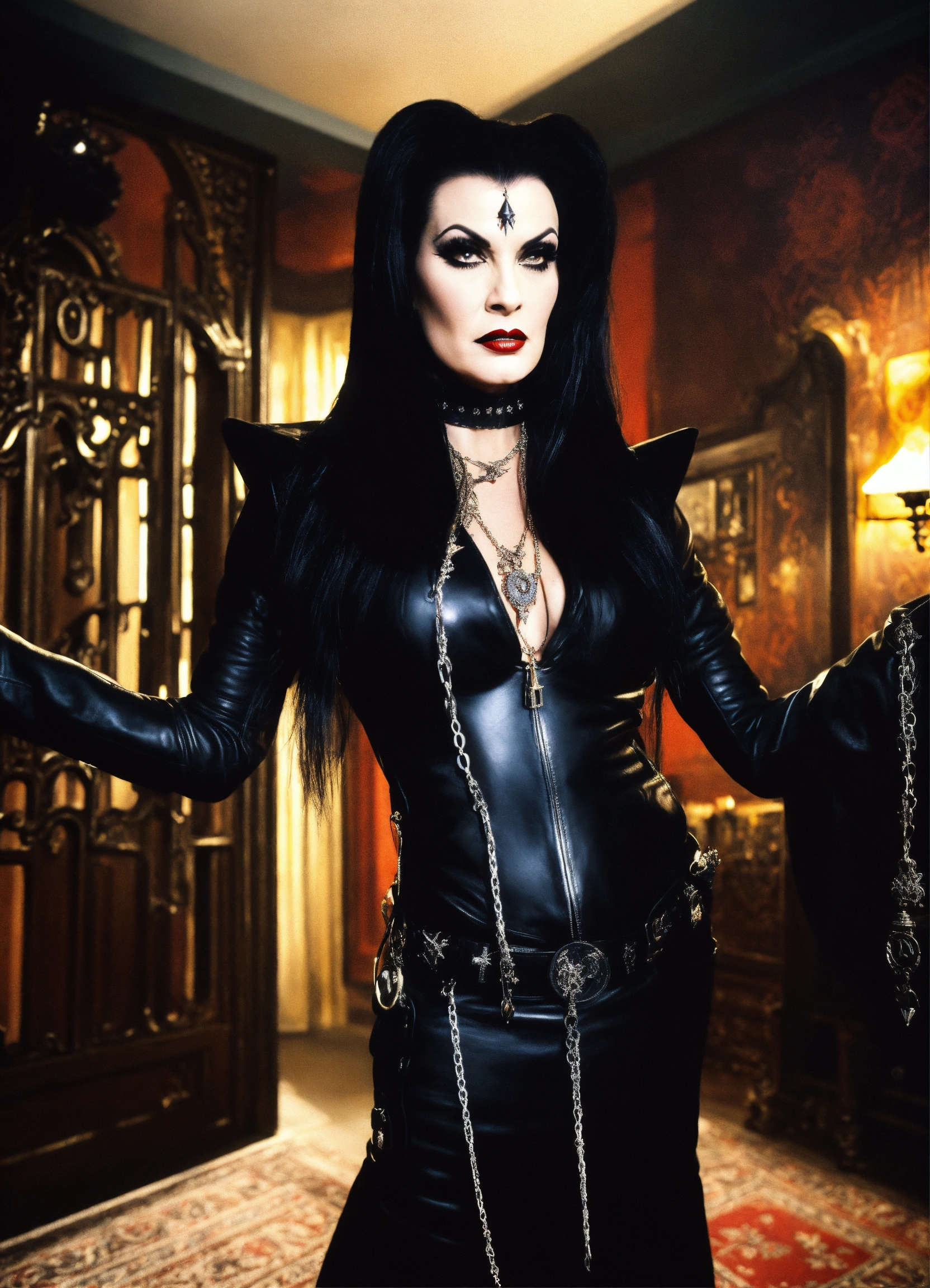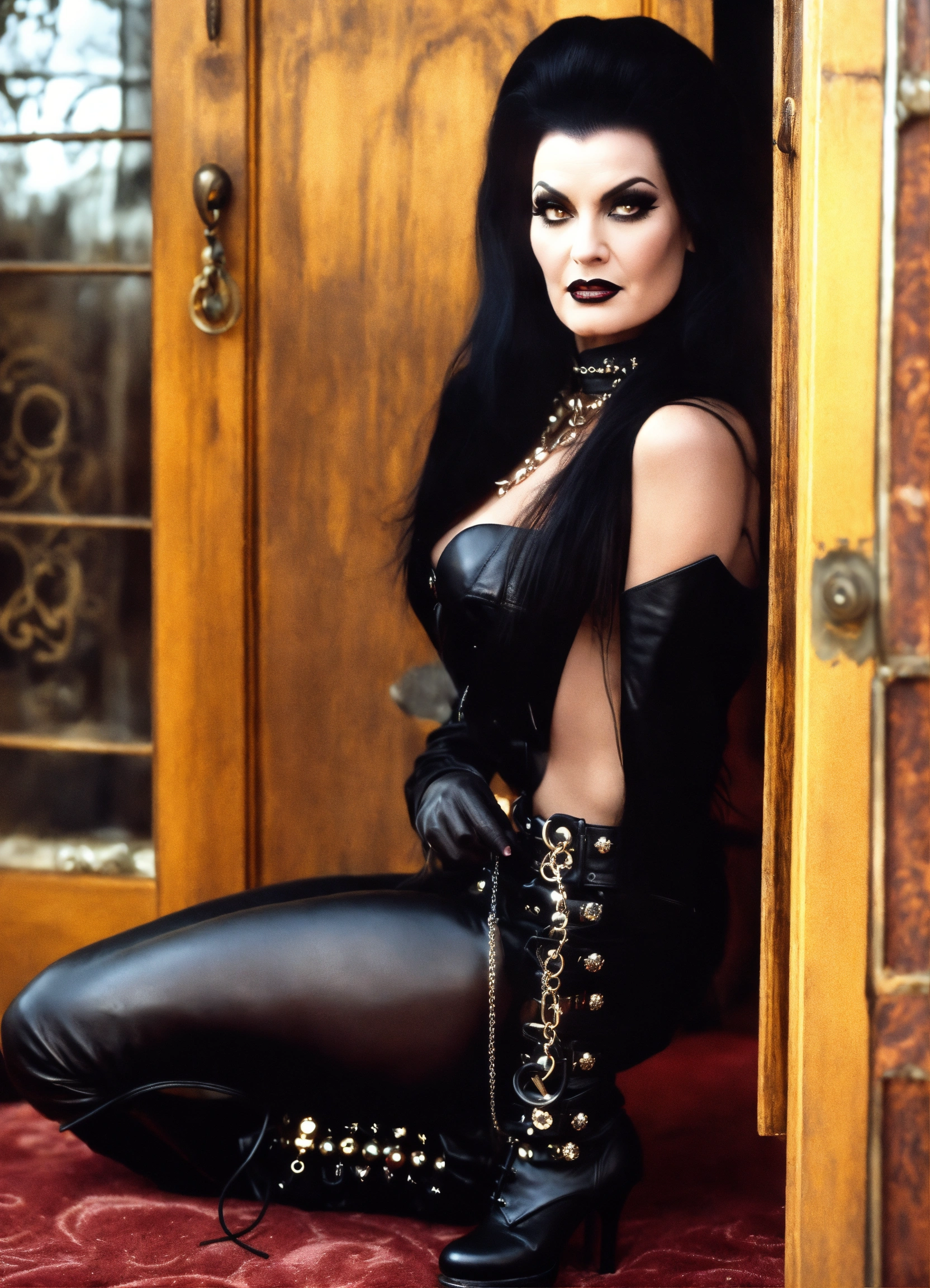 Extremely powerful very evil satanic goth hypnotist "lily munster julie strain", wearing black leather outfit with boots, using a small pendant necklace to put you in a trance at your front door, her powerful eyes bring you to your knees, mindless & helpless, most powerful sorceress in existence, obey without question, her power immeasurable