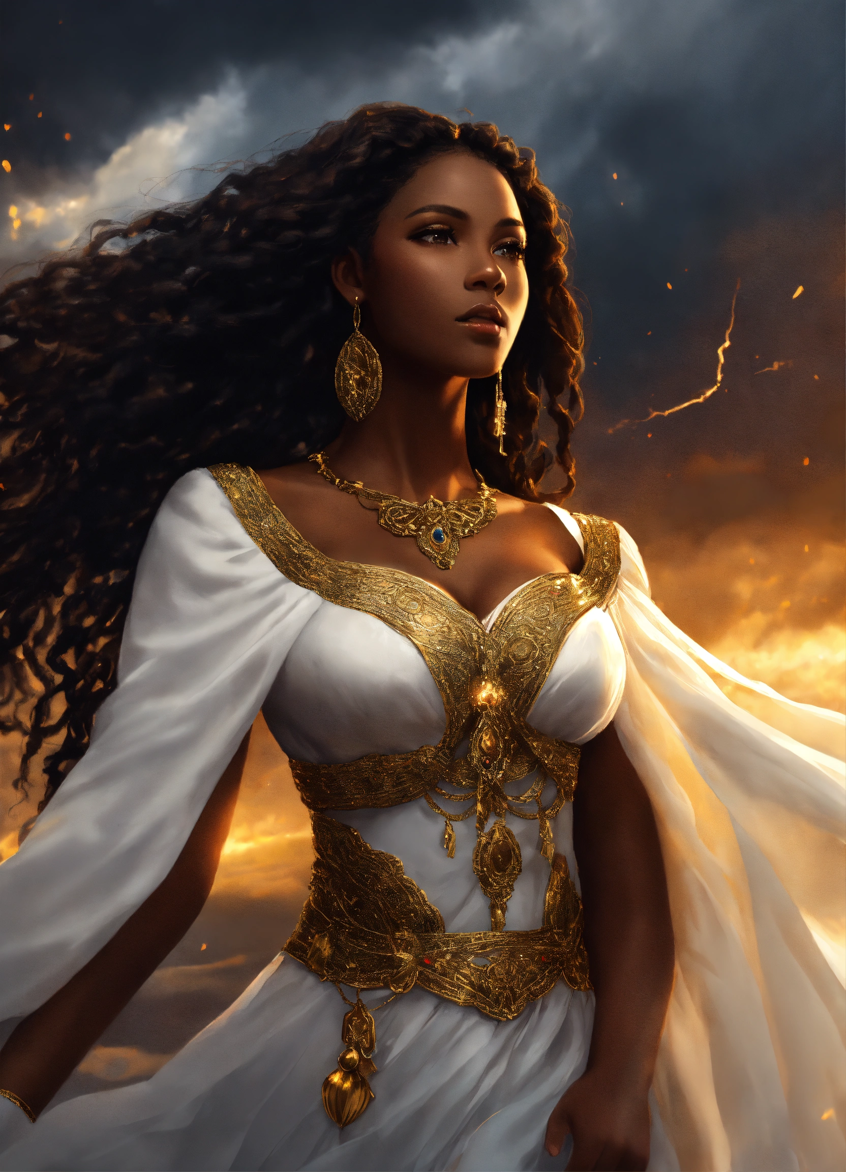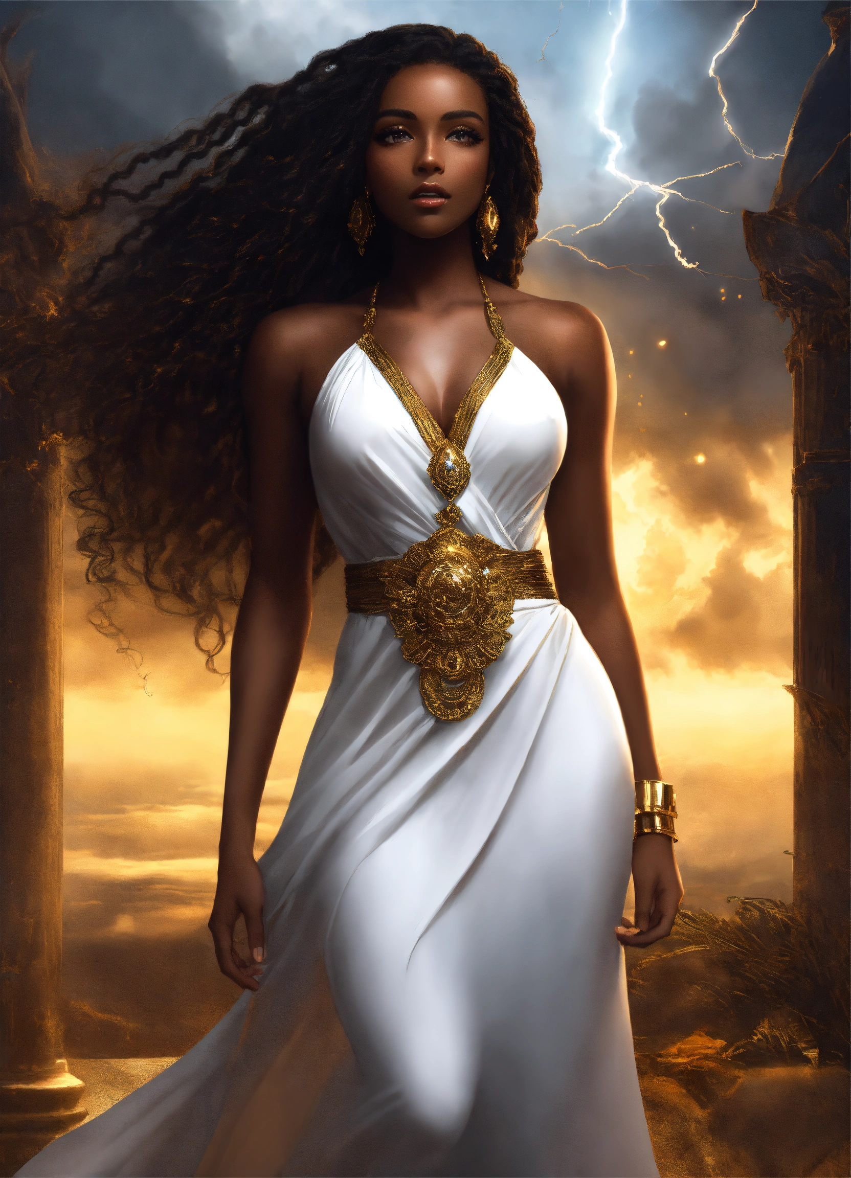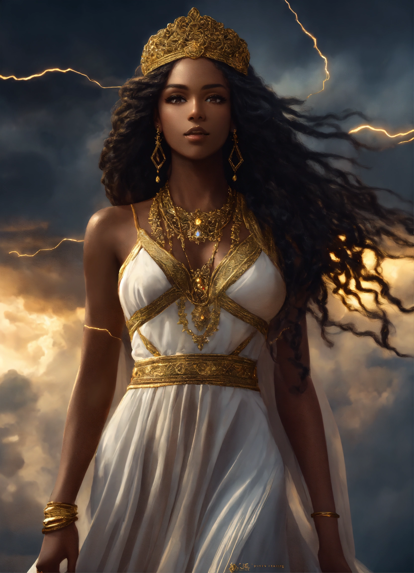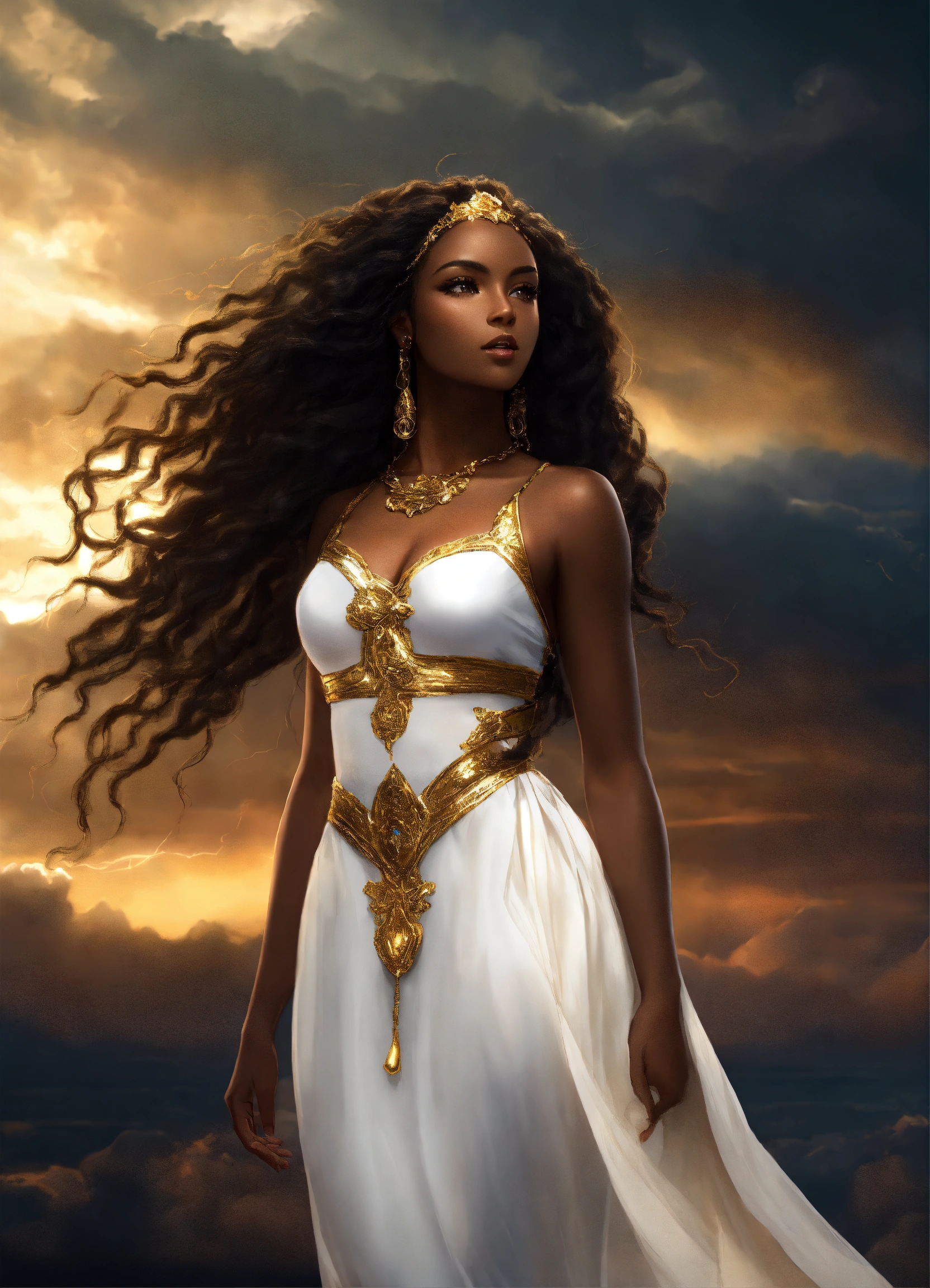 Full body gorgeous dark skin beautiful black goddess woman beautiful gorgeous goddess with gorgeous dark brown skin. beautiful perfect face, shapely hour-glass figure long flowing braided hair, fully clothed in a flowing white dress and gold accessories, she's floating in the sky with gold lightning and dark clouds behind him, high detail, realistic photo, high detail, digital painting, cinematic, stunning, hyper-realistic, sharp focus, high resolution 8k, insanely detailed