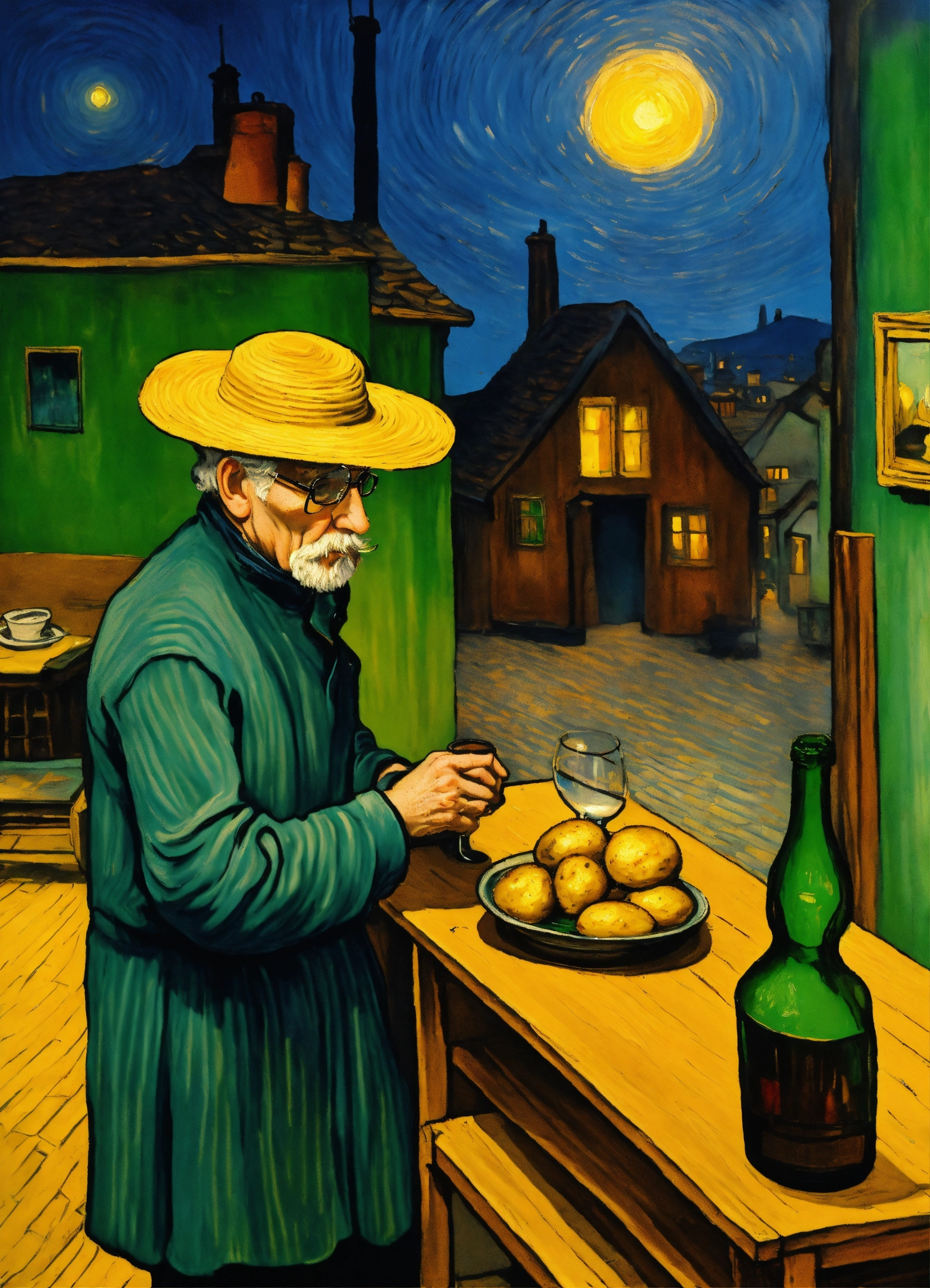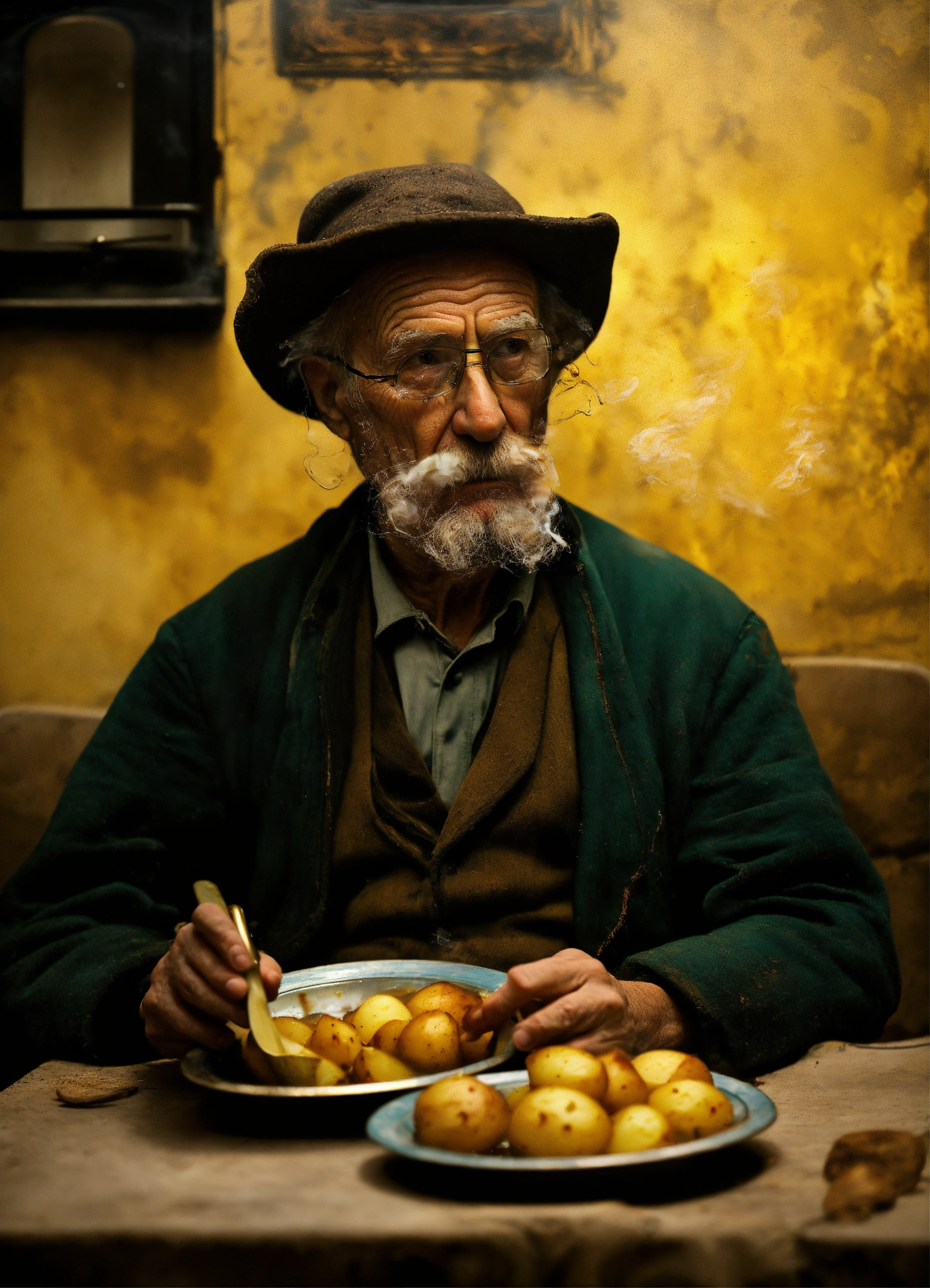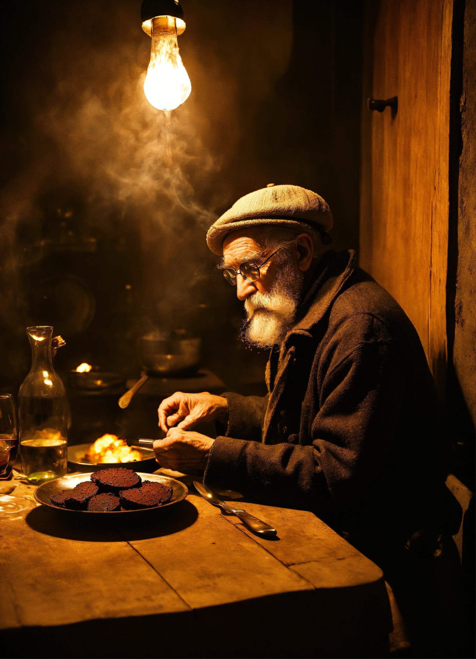 Poor environment, dirty walls, blackened by smoke, lighting like "van gogh's potato eaters" on a table a bottle of wine, a glass, a plate of steaming soup, a wrinkled old man, glasses, calloused hands, hat, look sad, a stove on.