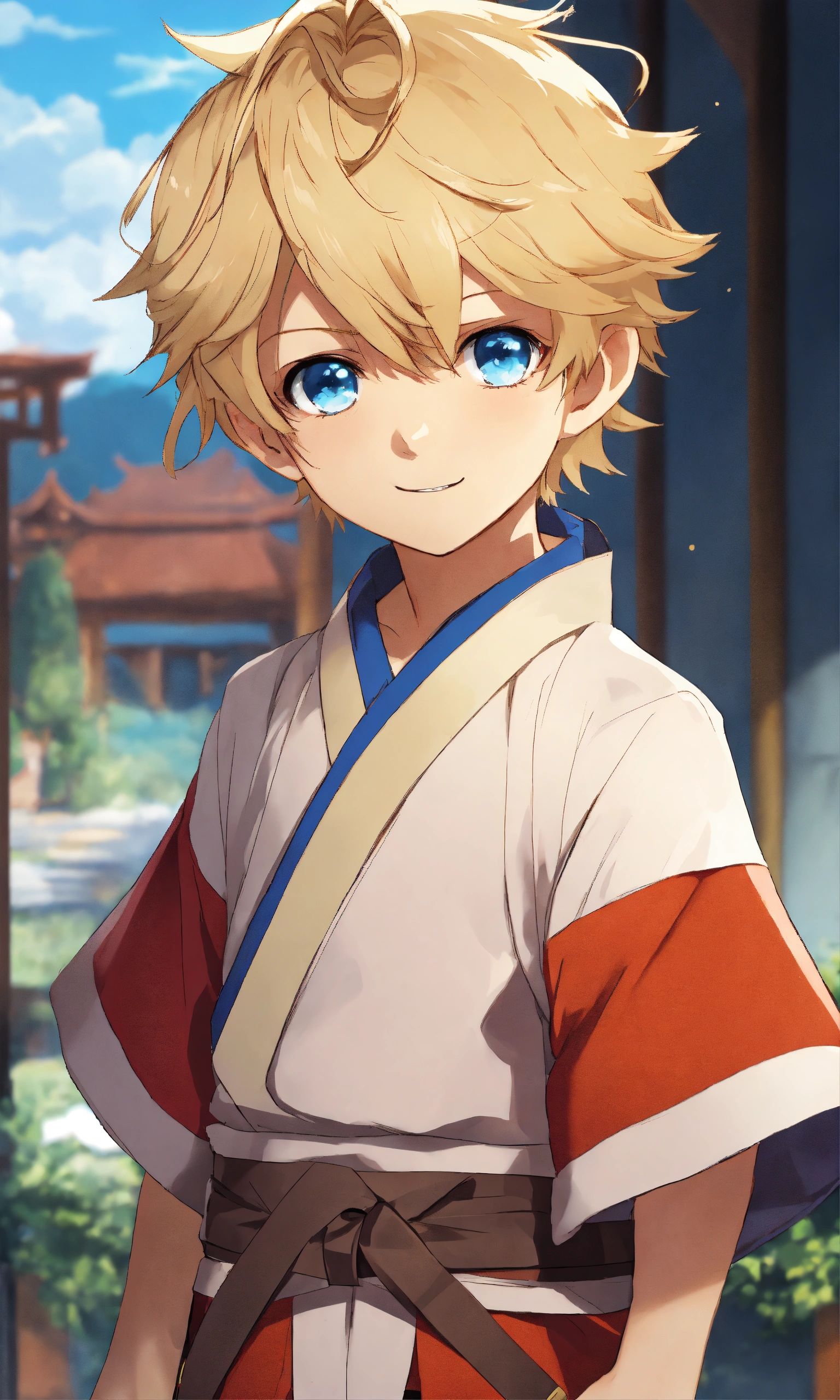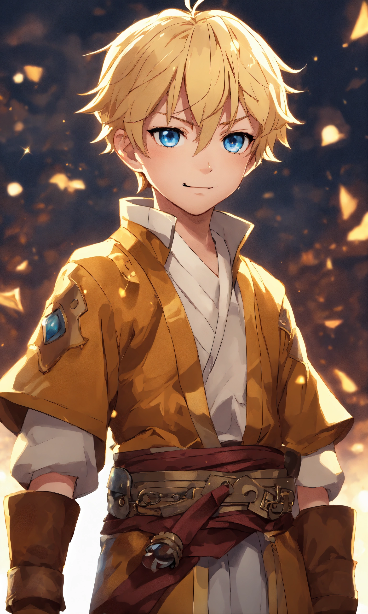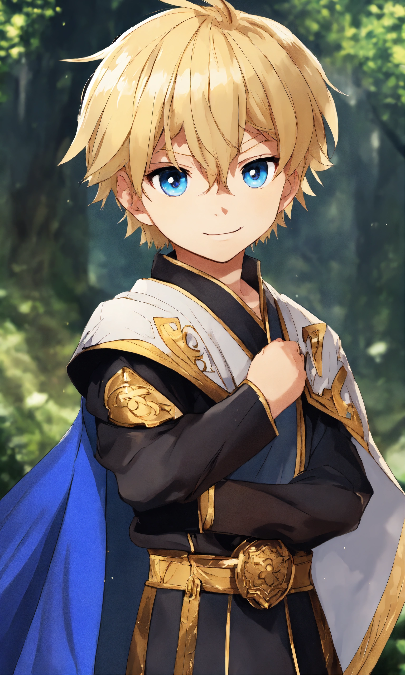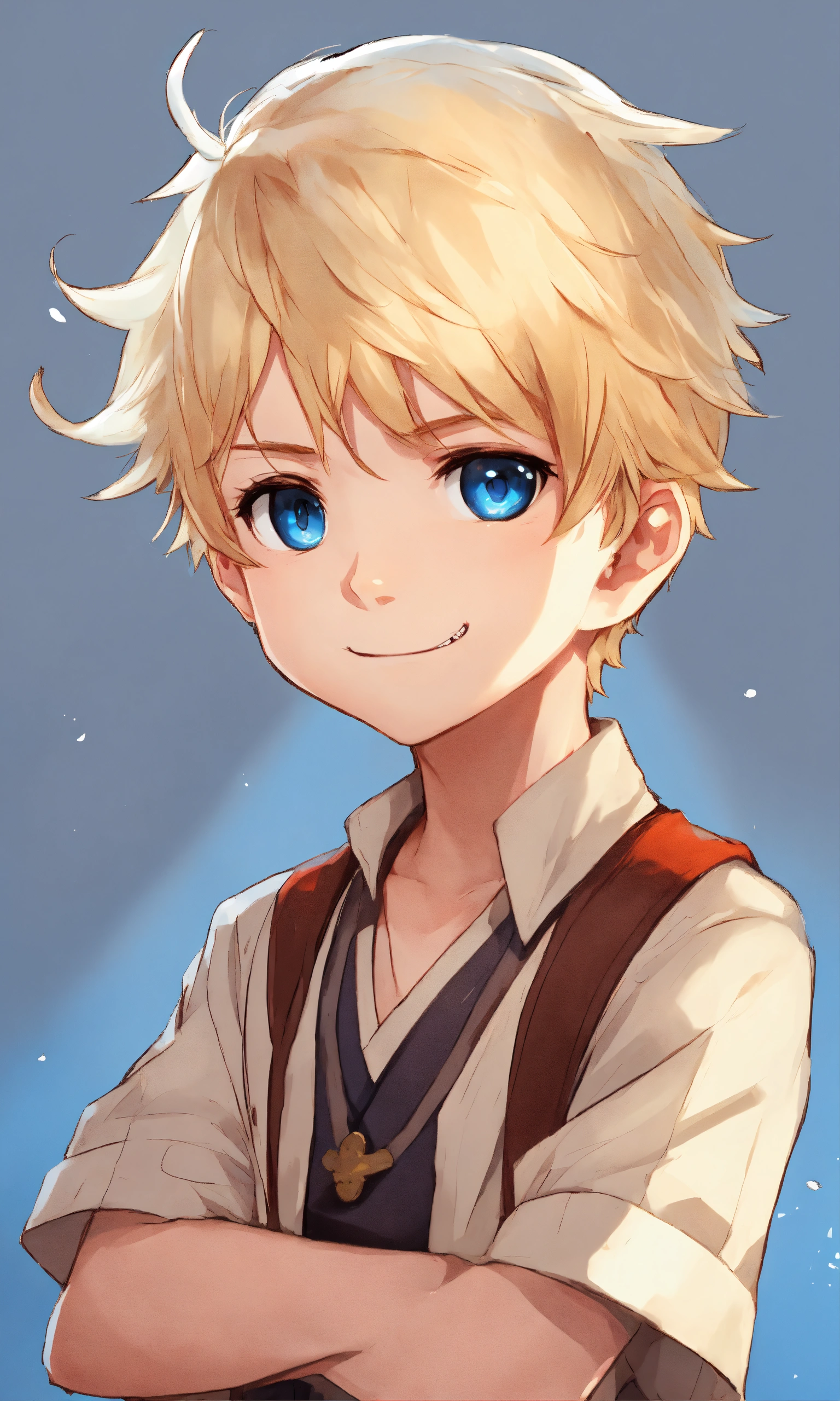 Anime, character art, little blonde boy, high fantasy, brat, blue eyes, obnoxious, arrogant, 6-year-old boy, smirk, looking at viewer, best quality, young boy, wide shot, full body image, adorable, annoying, bratty, wicked, raised eyebrow, grin, proud, precocious, short, tunic, cute, short hair