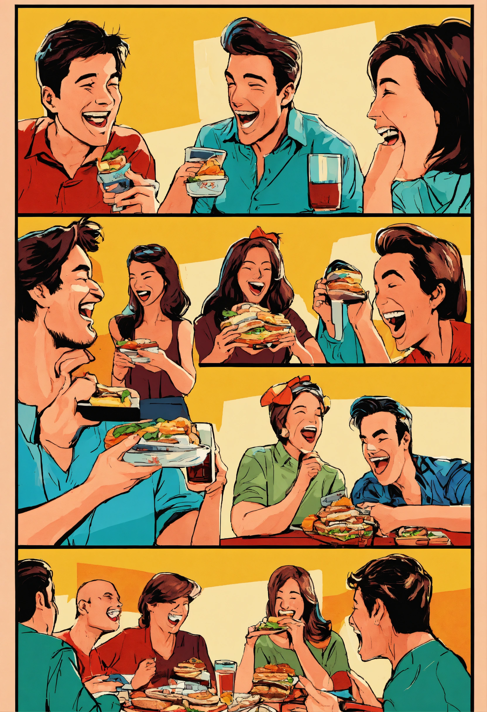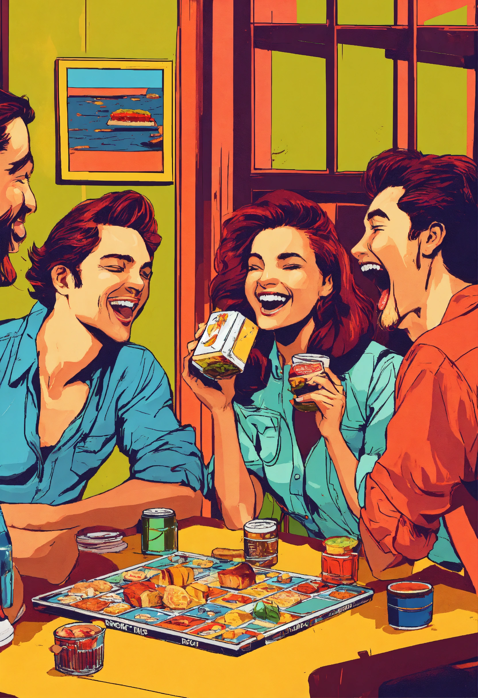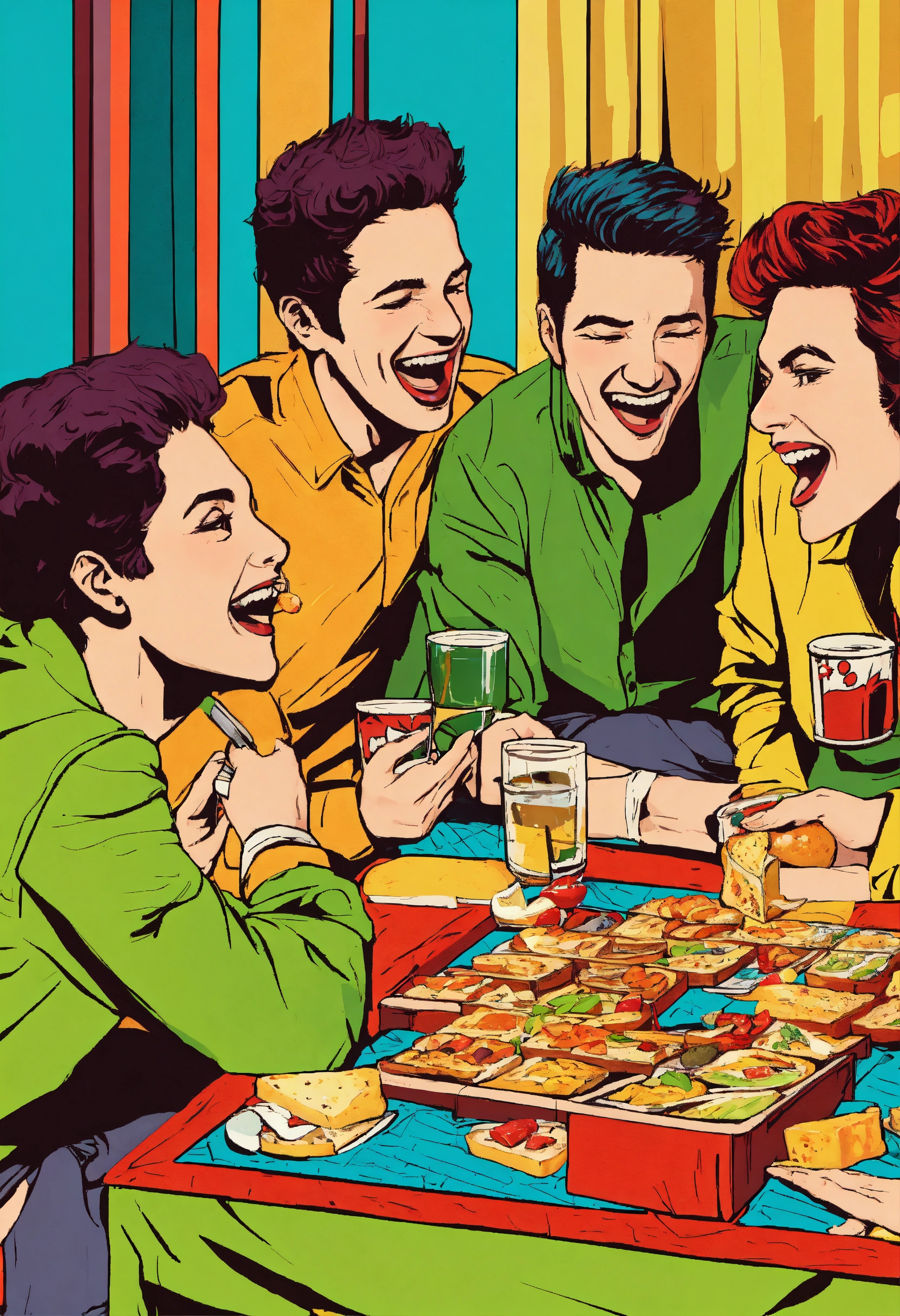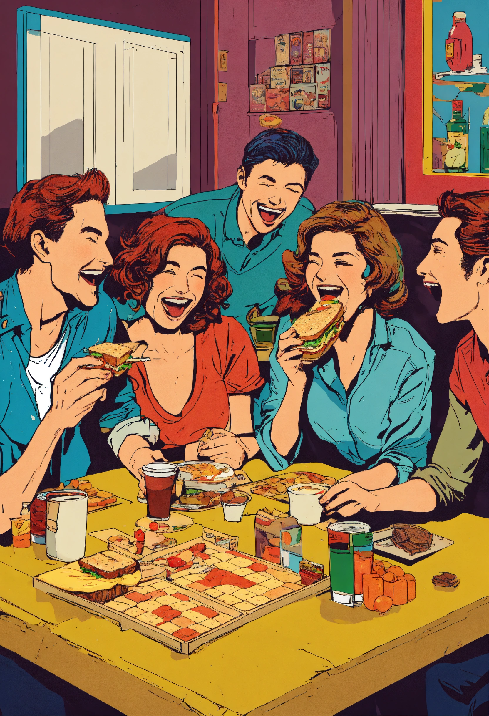 Several friends playing board game laughing drinking eating sandwich without glasses pop art