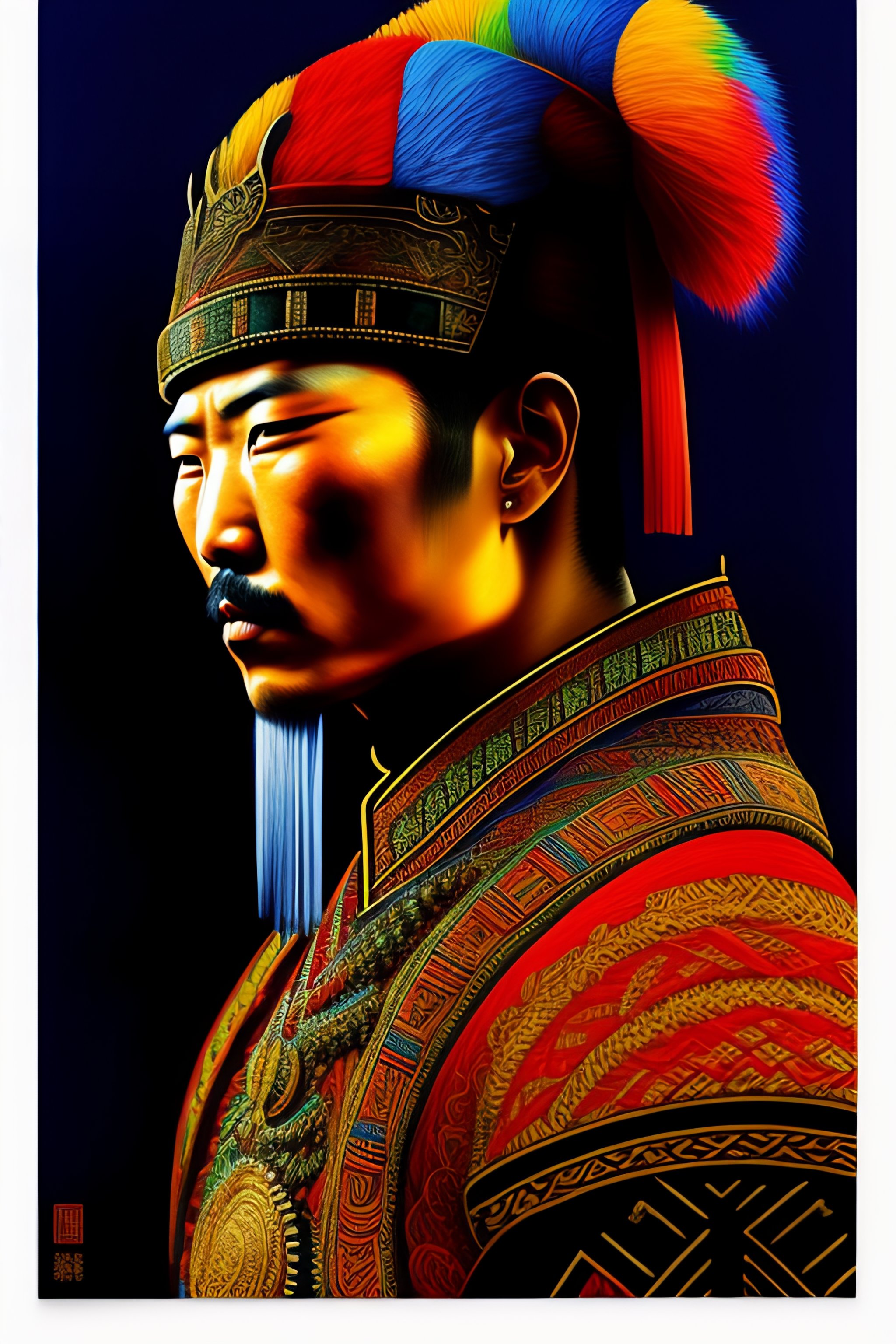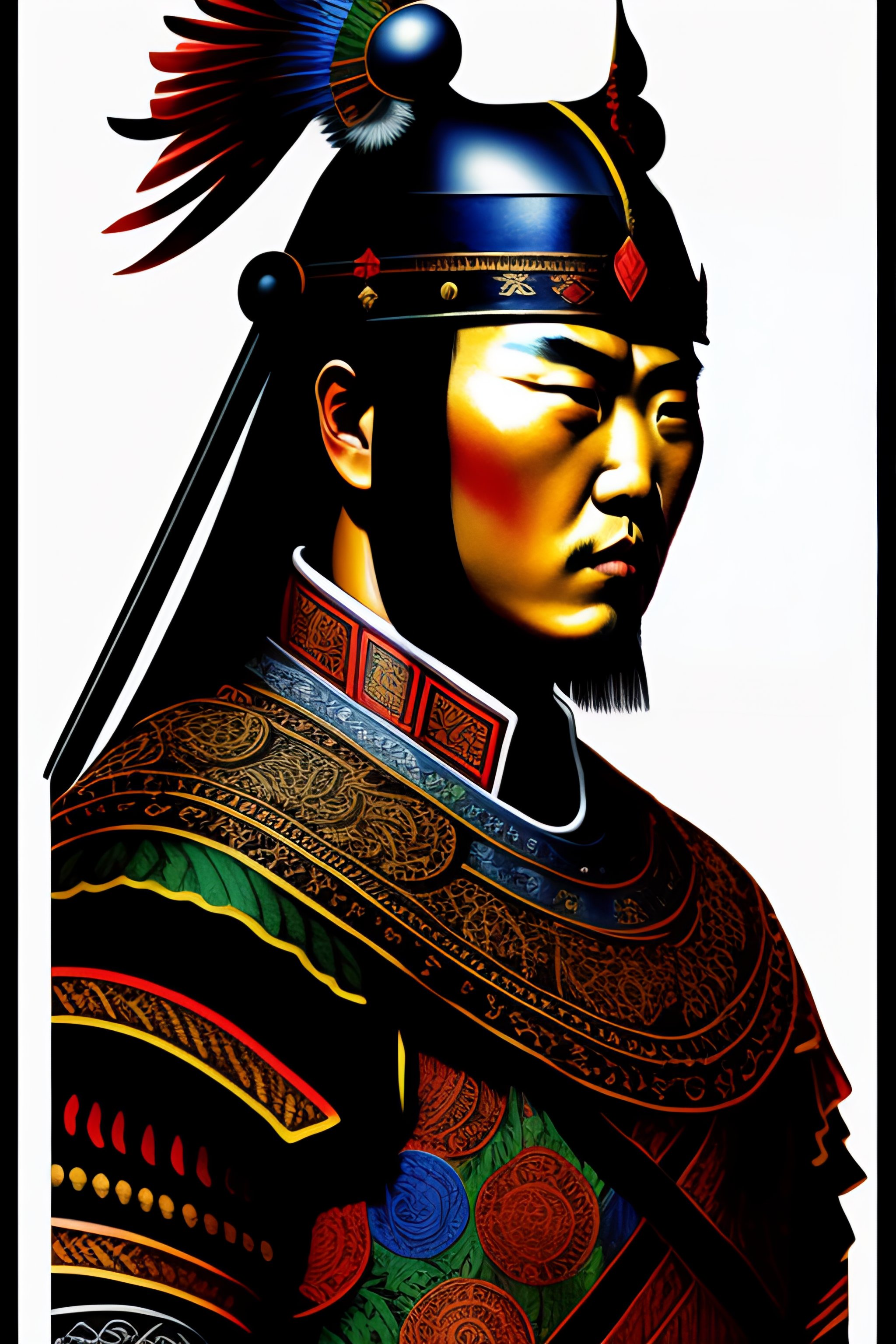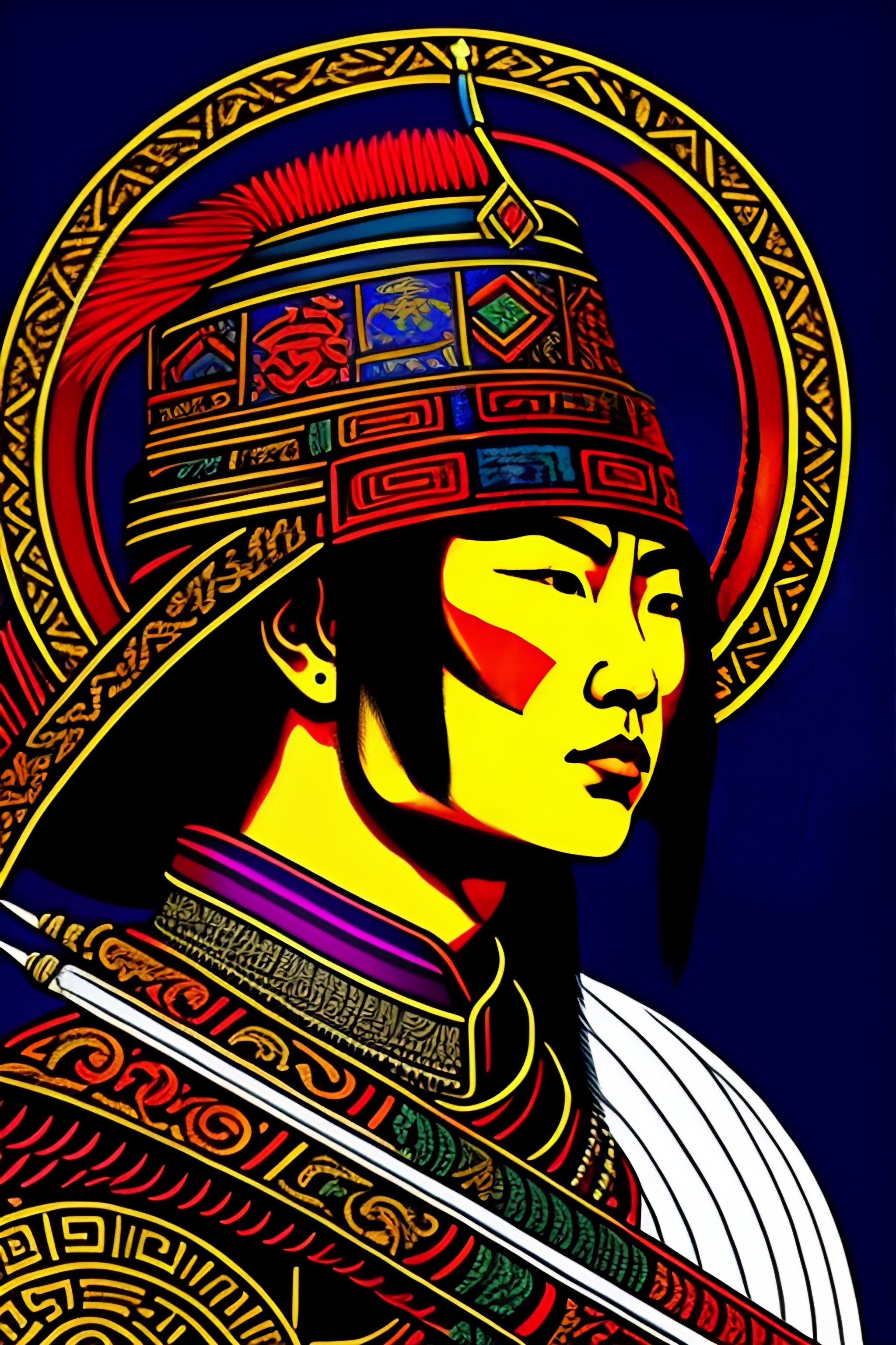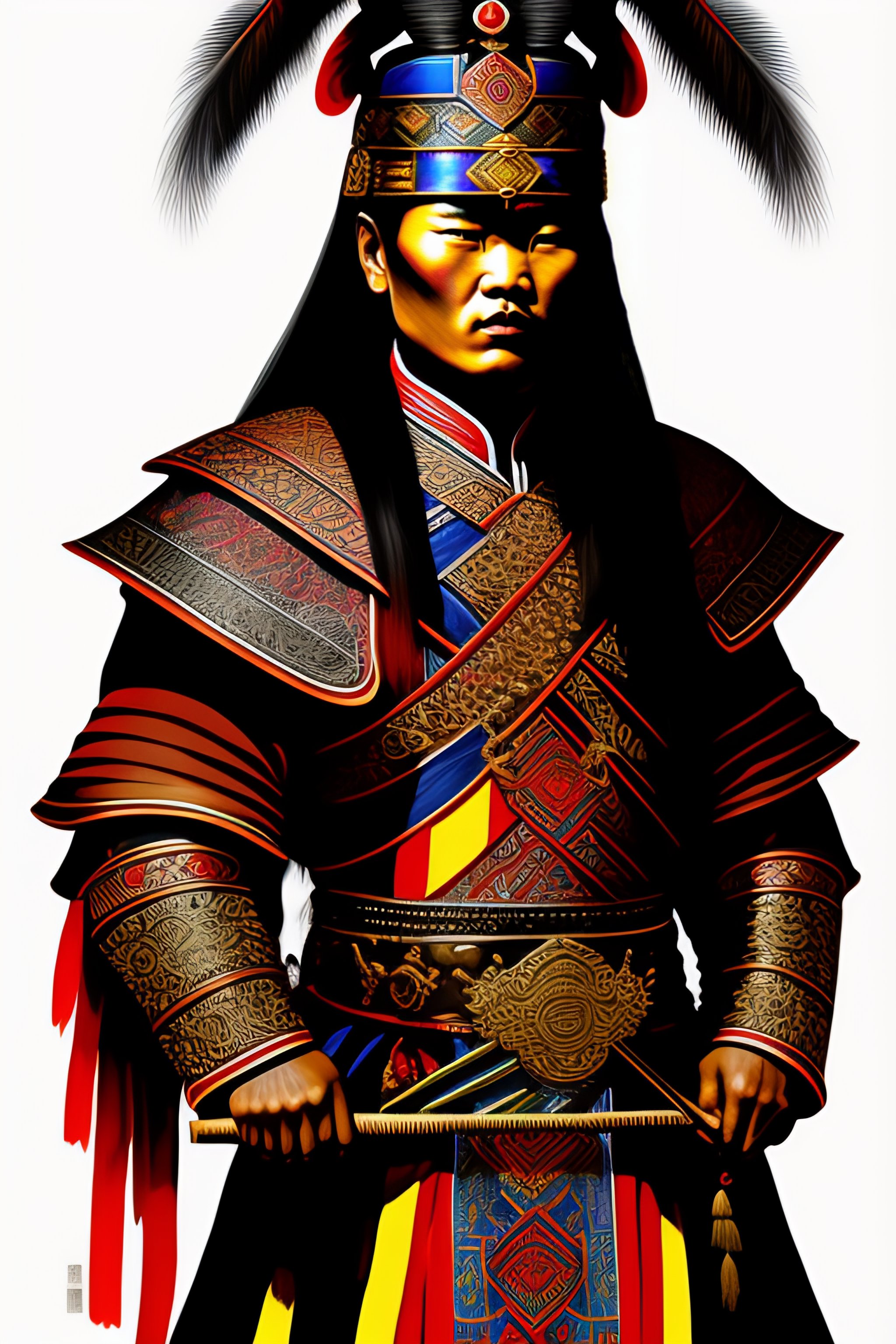 Pen and ink drawing of chinese warrior portrait in aztec symbol style in multi color