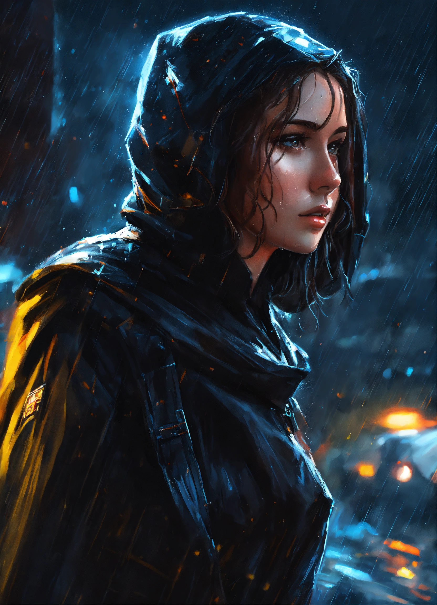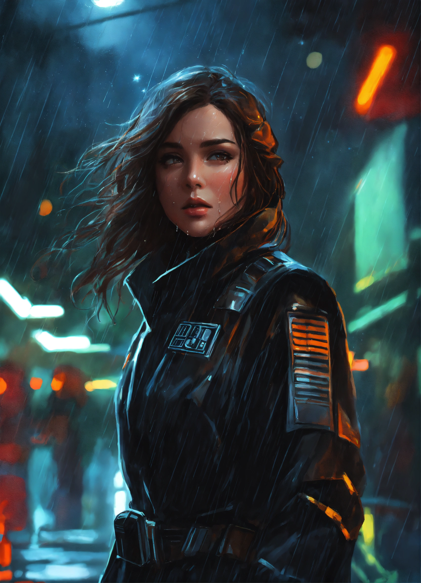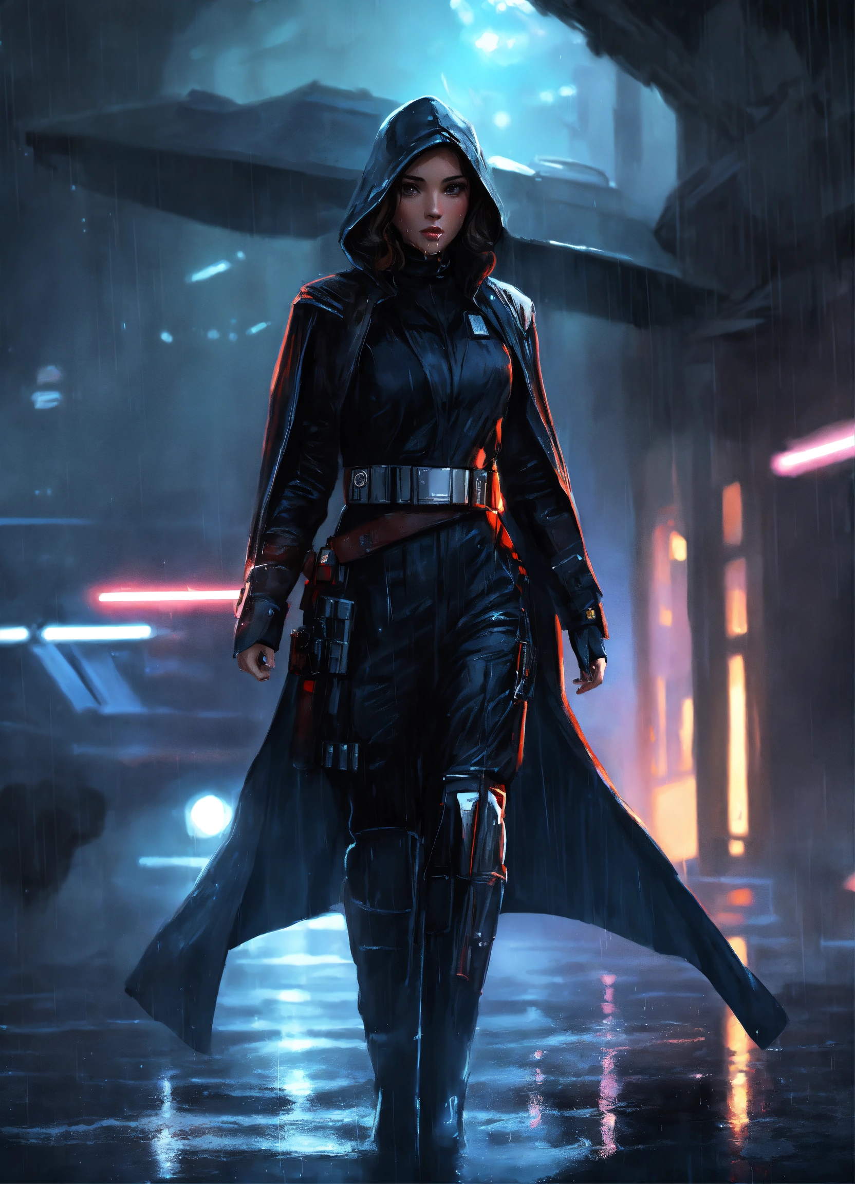 Digital painting of a female star wars imperial with long wet hair in the rain at night, wearing a black flight suit, in an action pose, hiding in the shadows.